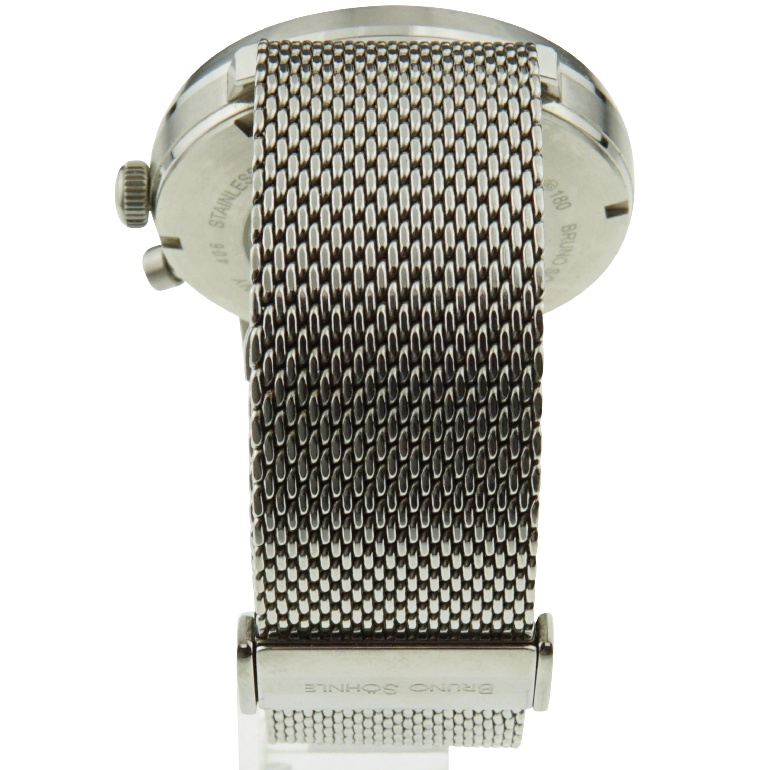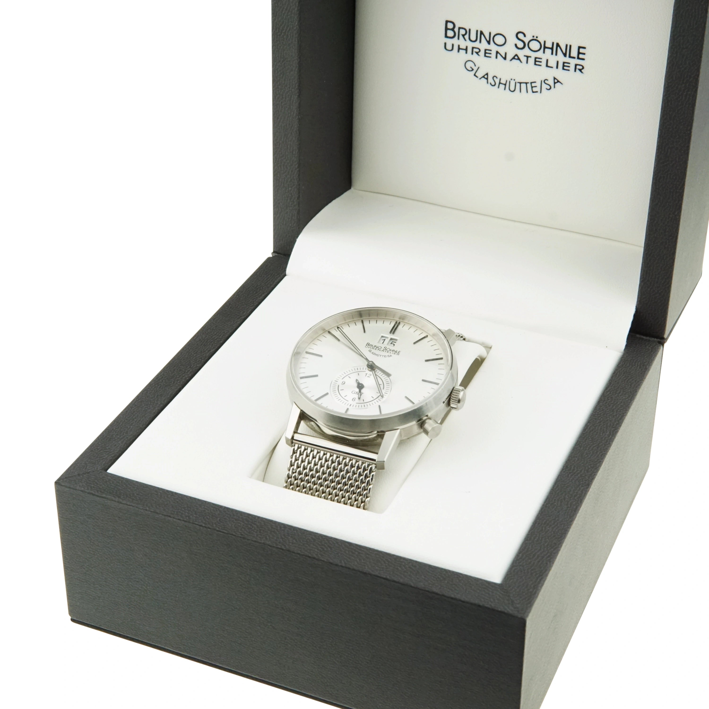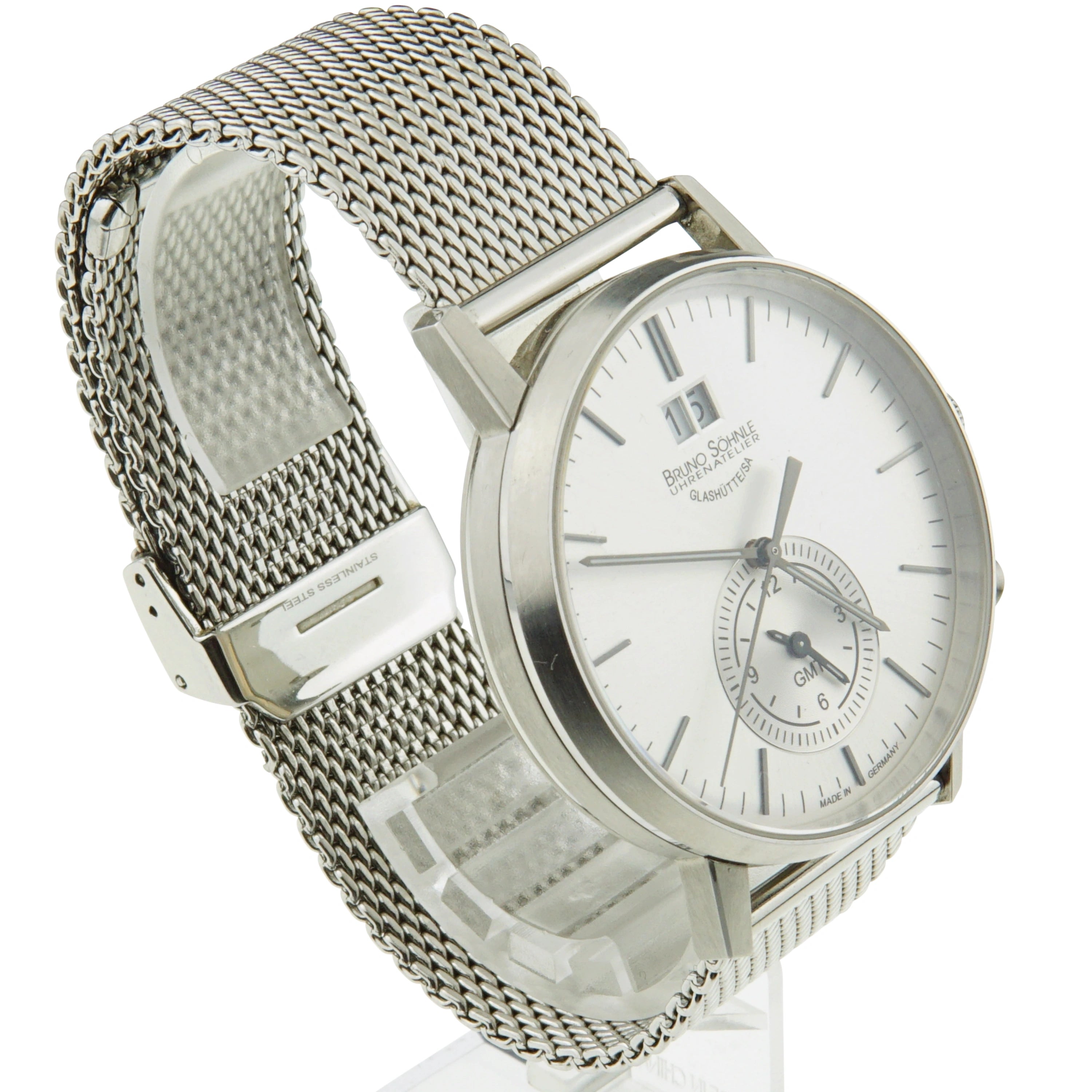 Die Bruno Söhnle Stuttgart GMT vereint präzise Technik mit elegantem Design. Ihr veredeltes Quartzwerk (Basiswerk Ronda 4210.B) sorgt für höchste Zuverlässigkeit, während das 42mm große Edelstahlgehäuse mit einer Wasserdichtigkeit von 10 bar Robustheit und Alltagstauglichkeit bietet. Das innen entspiegelte Saphirglas garantiert beste Ablesbarkeit. Das edle Edelstahl-Meshband mit Faltschließe rundet das zeitlose Erscheinungsbild der Uhr wiederum perfekt ab.