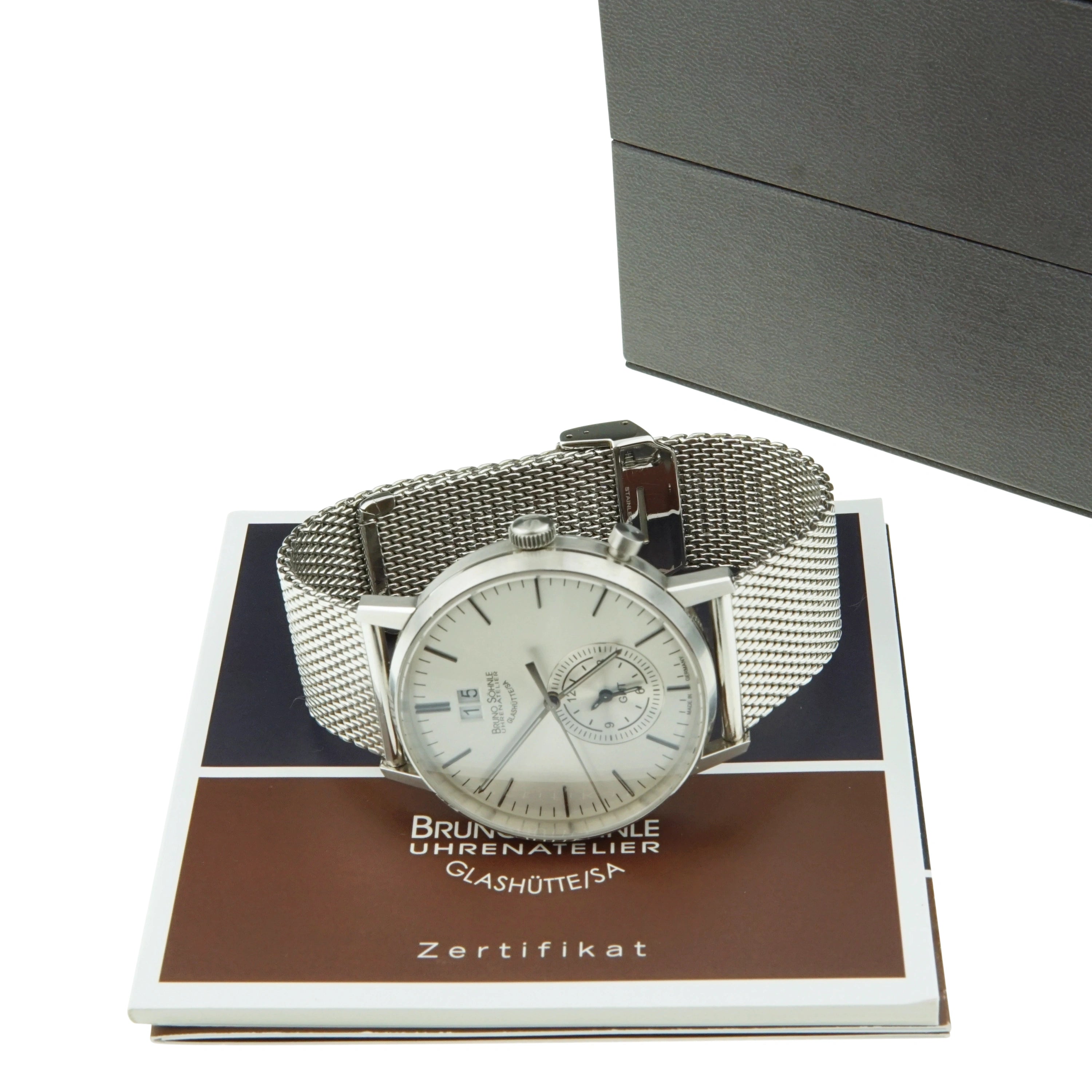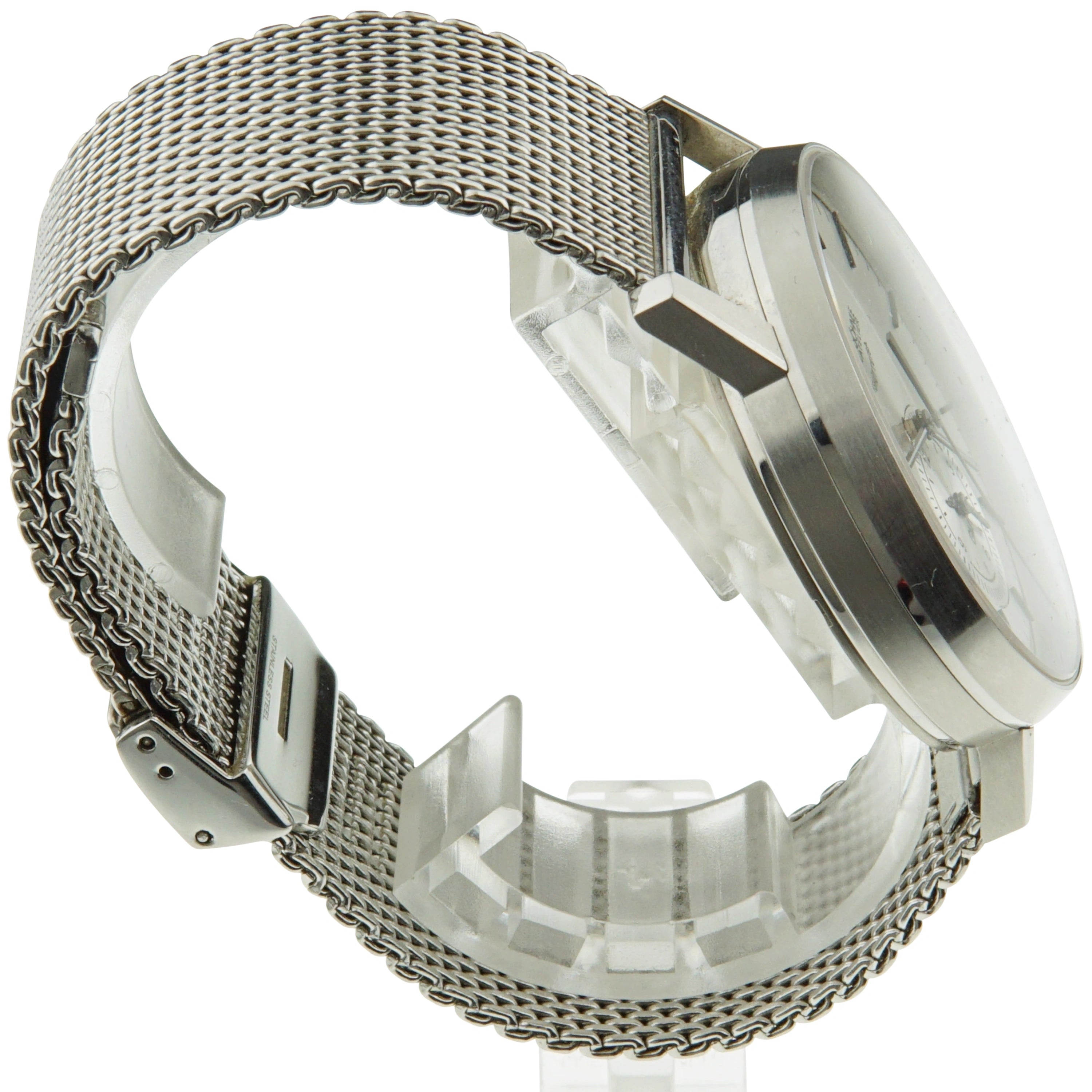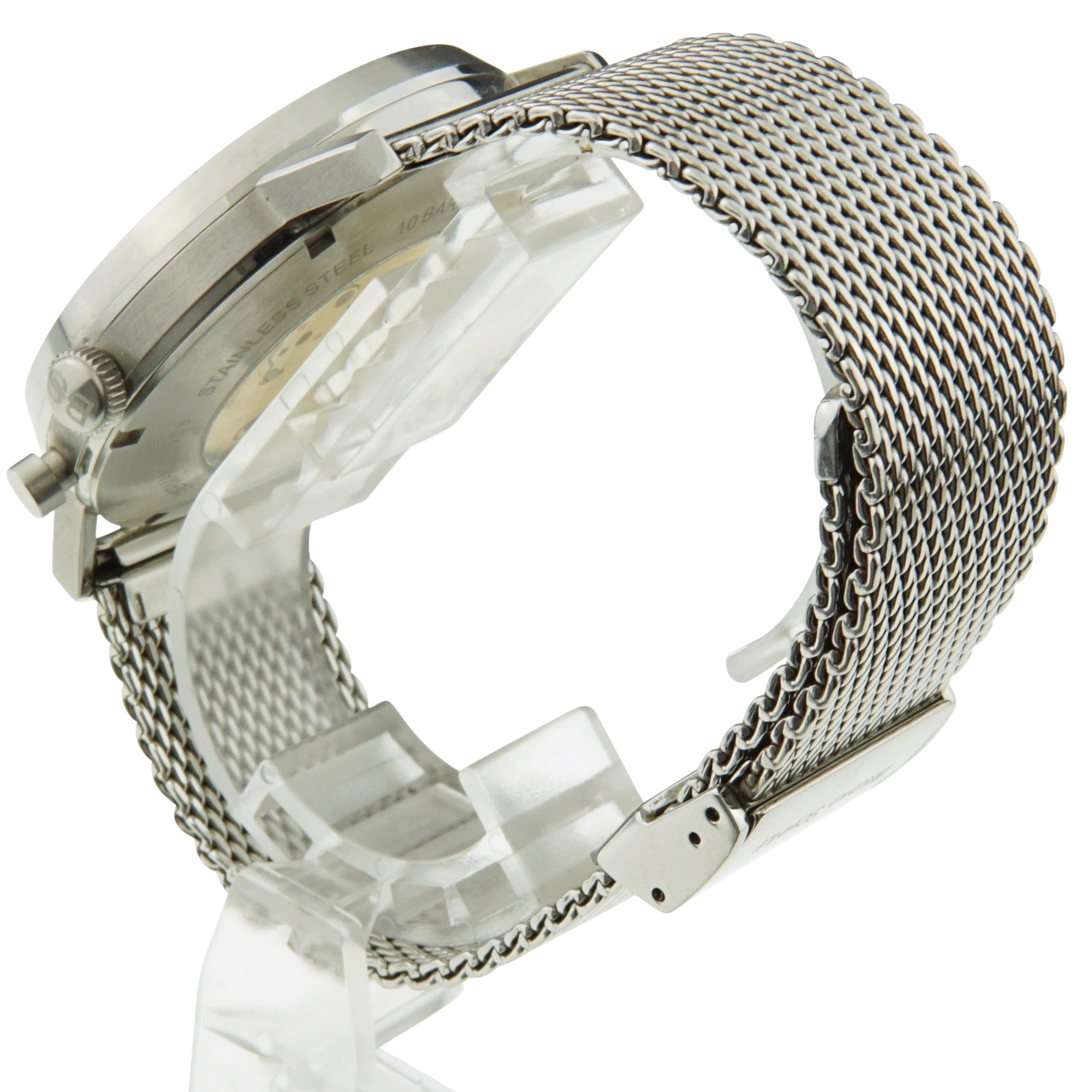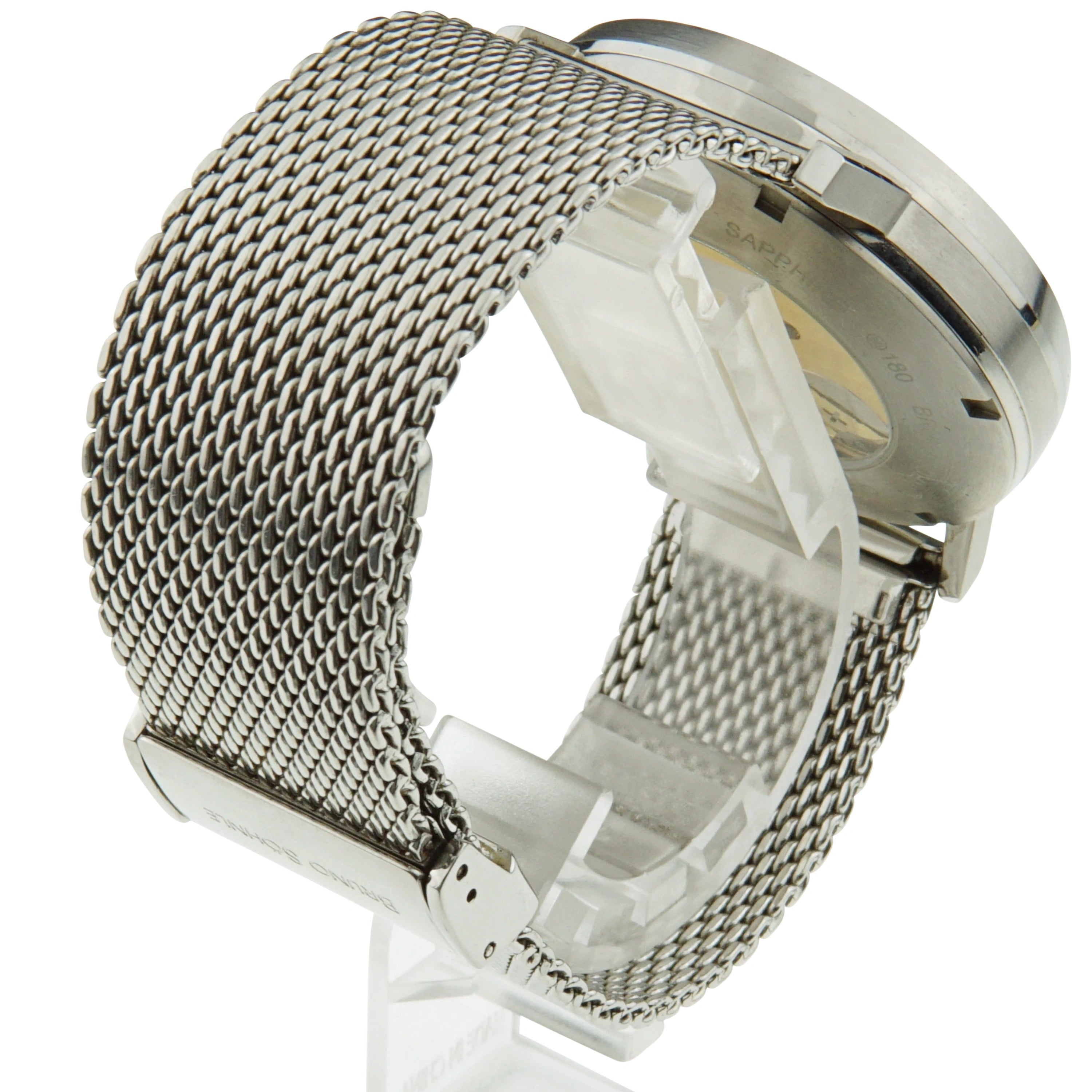 Die Bruno Söhnle Stuttgart GMT vereint präzise Technik mit elegantem Design. Ihr veredeltes Quartzwerk (Basiswerk Ronda 4210.B) sorgt für höchste Zuverlässigkeit, während das 42mm große Edelstahlgehäuse mit einer Wasserdichtigkeit von 10 bar Robustheit und Alltagstauglichkeit bietet. Das innen entspiegelte Saphirglas garantiert beste Ablesbarkeit. Das edle Edelstahl-Meshband mit Faltschließe rundet das zeitlose Erscheinungsbild der Uhr wiederum perfekt ab.