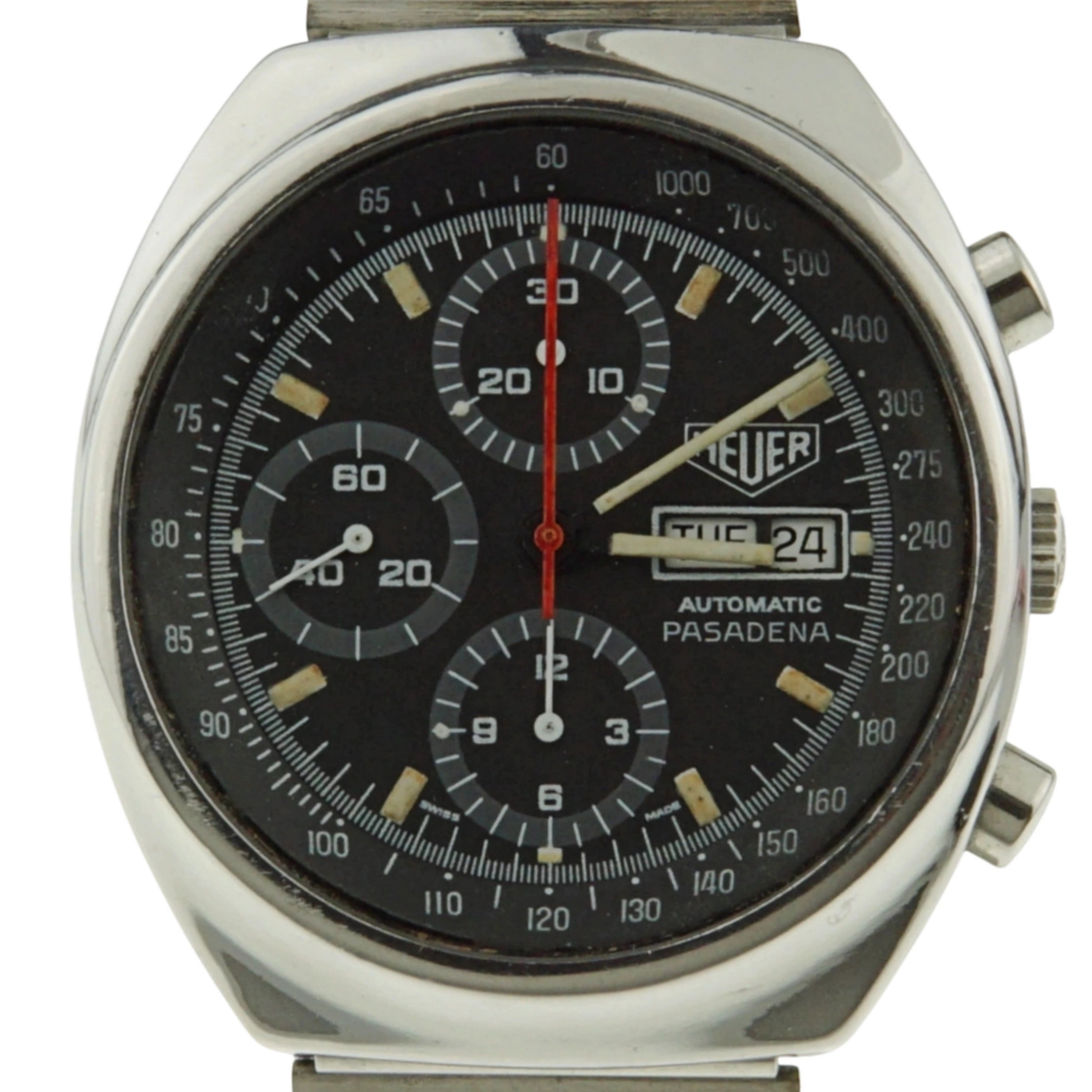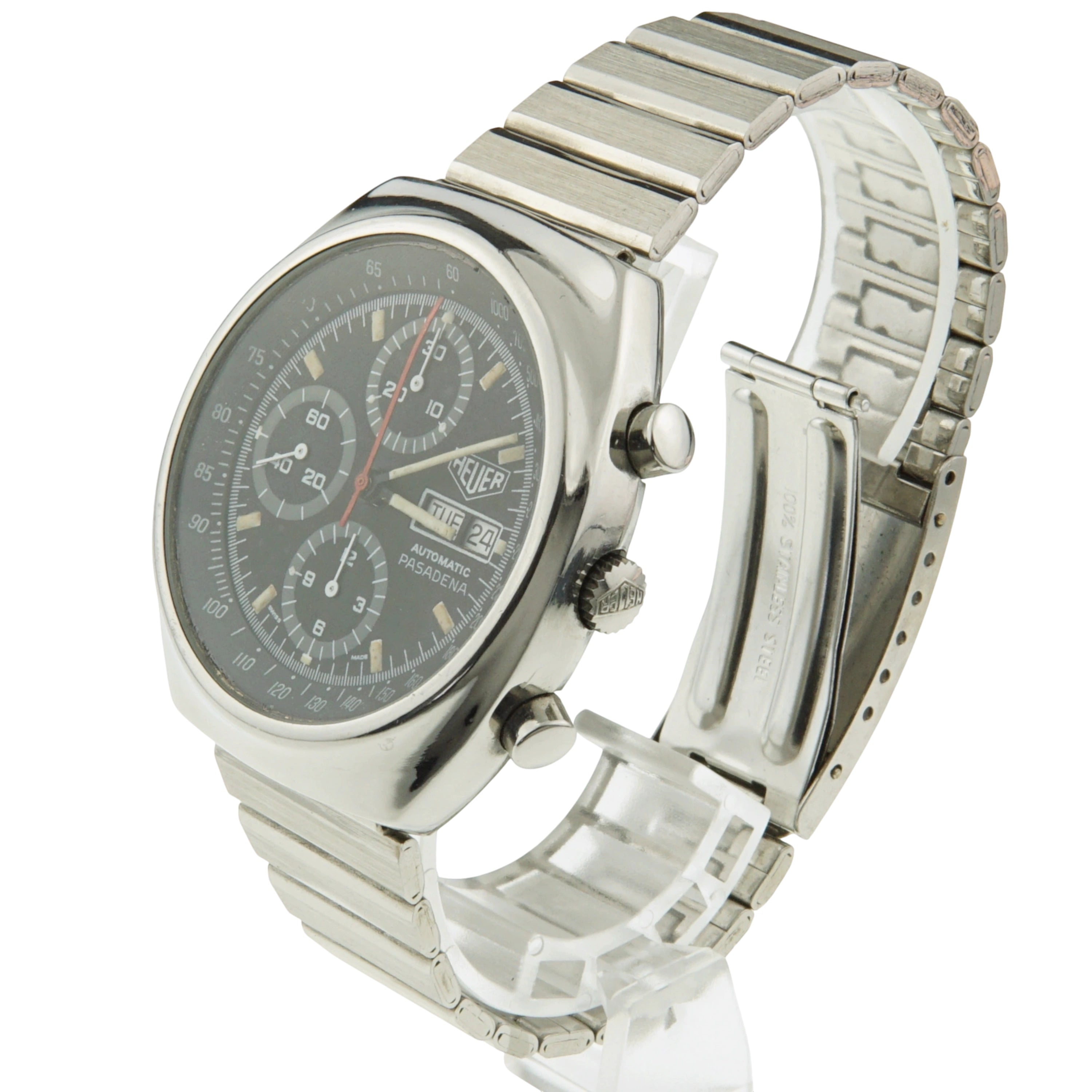 Im Inneren arbeitet ein automatisches Chronographenwerk auf Valjoux-Basis, das für seine Zuverlässigkeit und Robustheit bekannt ist. Damit vereint die Pasadena nicht nur zeittypische Technik, sondern auch die charakteristische Heuer-DNA, die sie bis heute zu einem begehrten Sammlerstück macht.