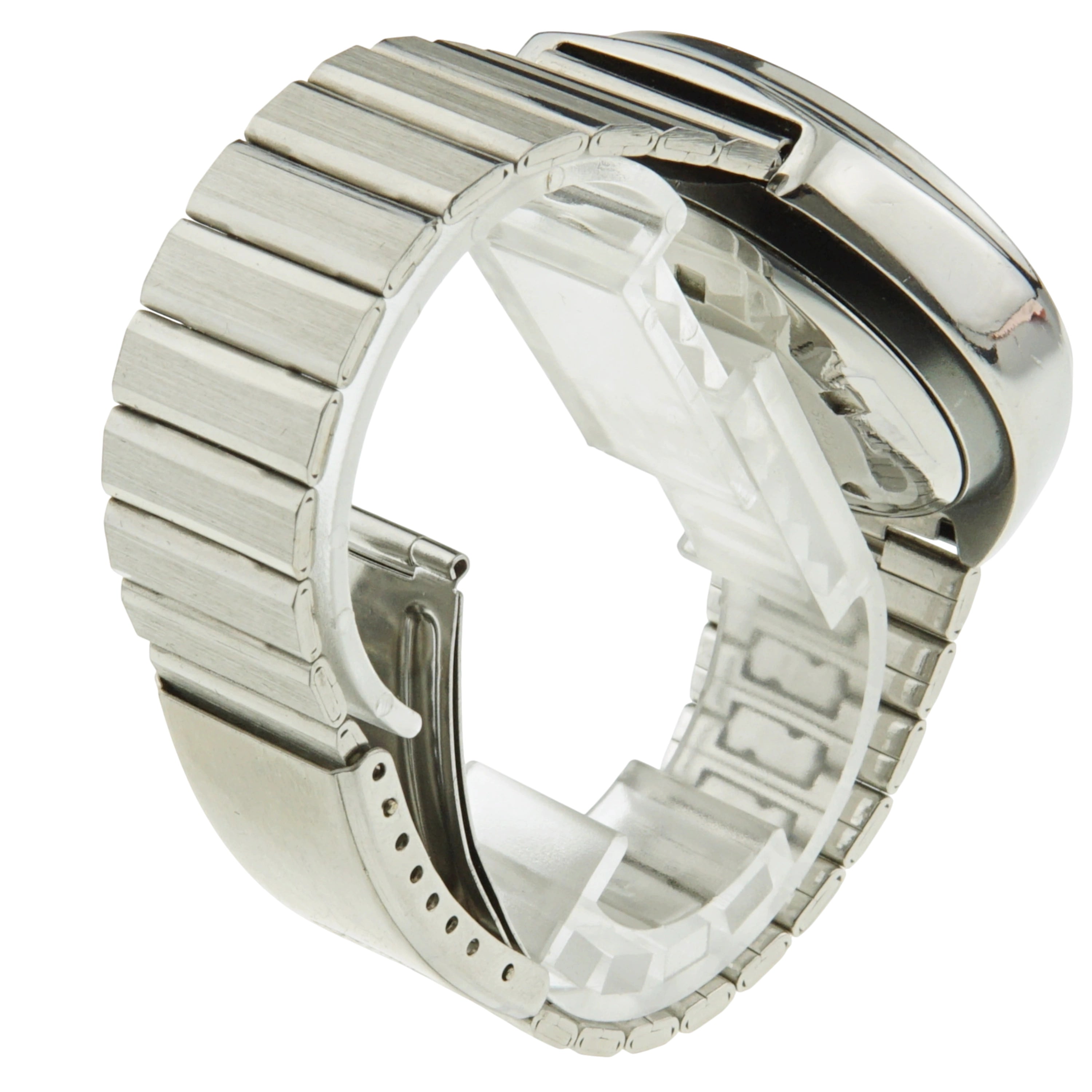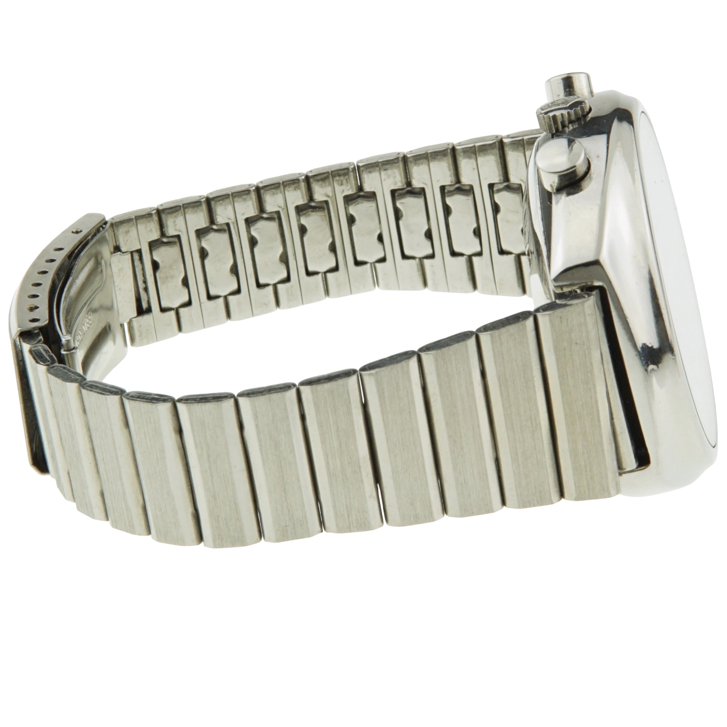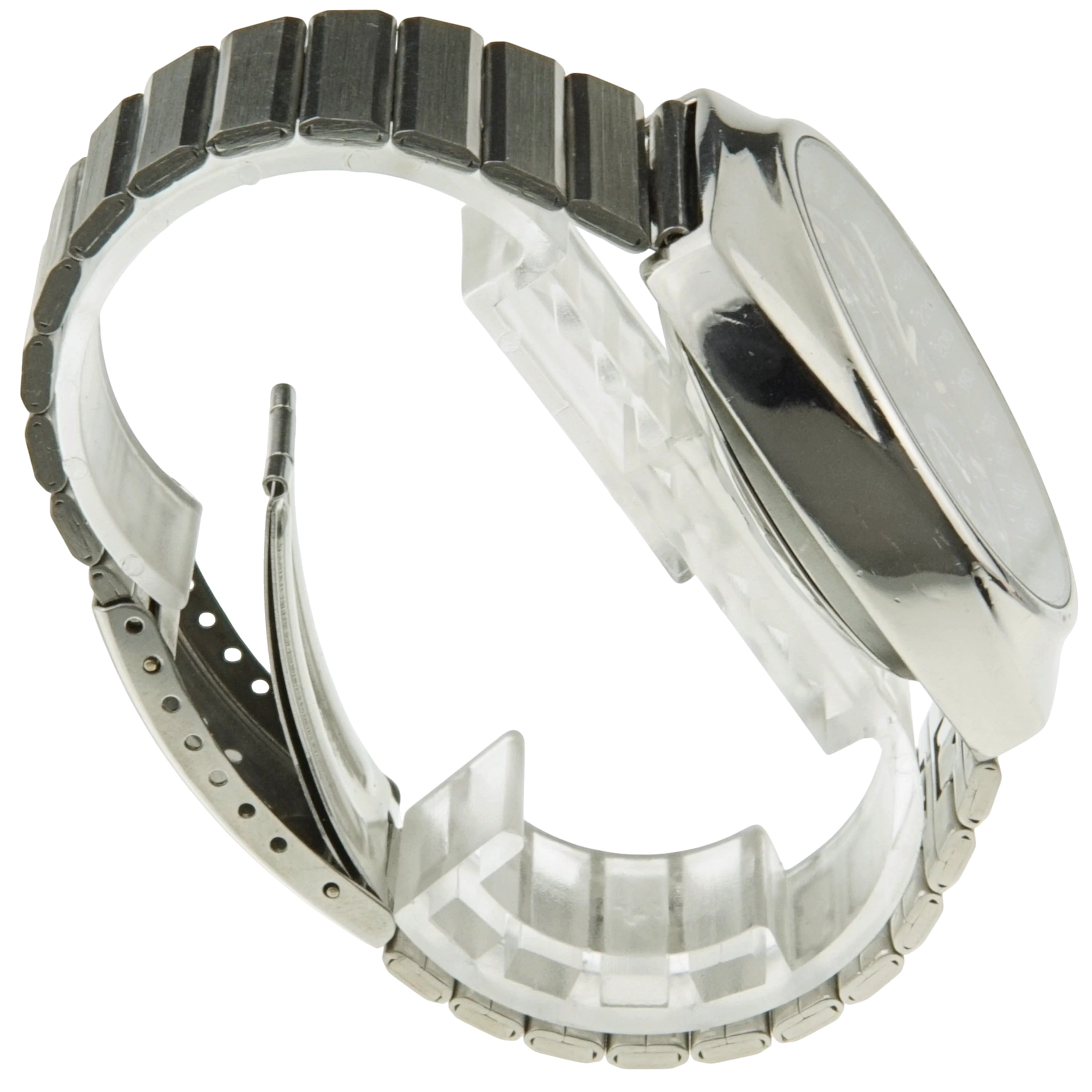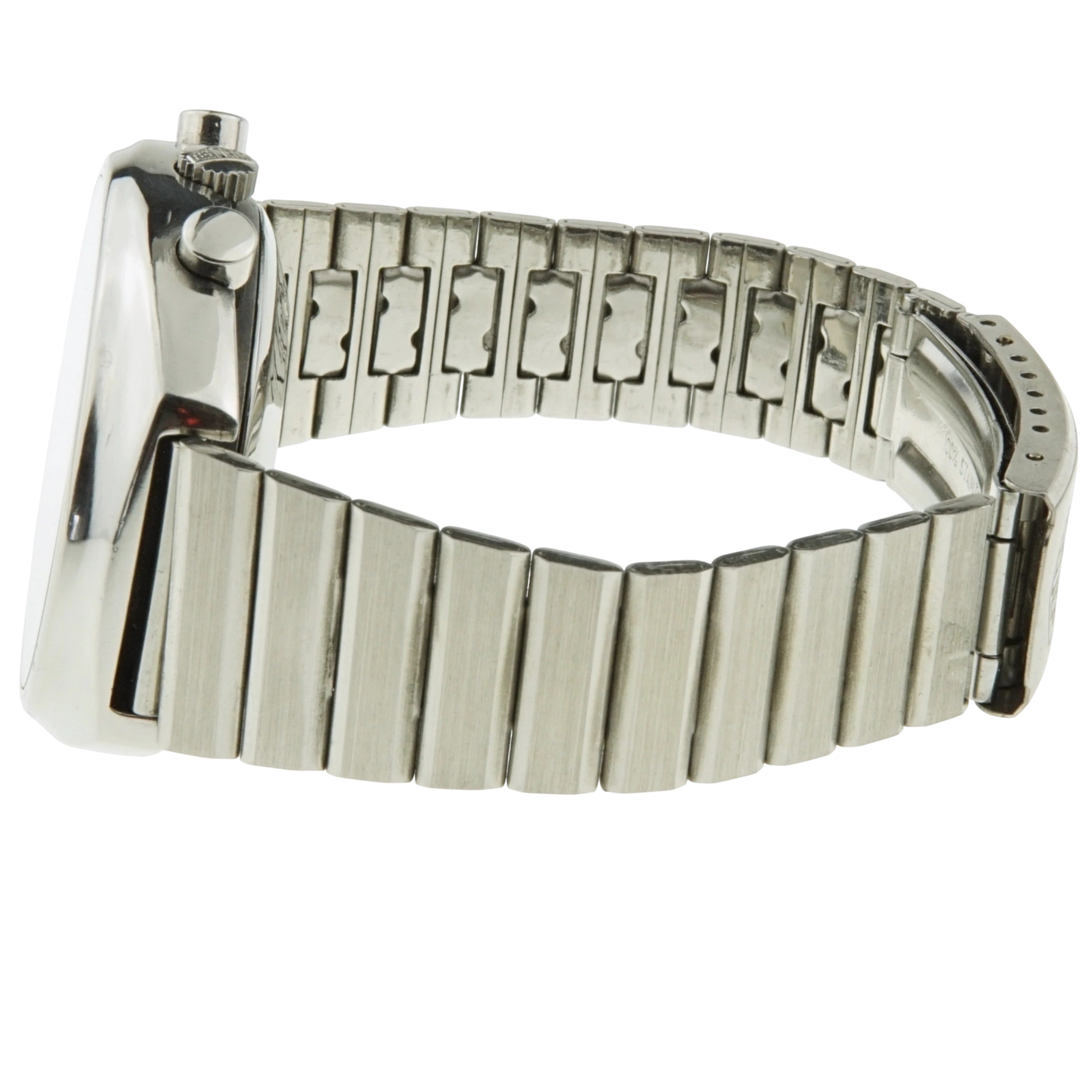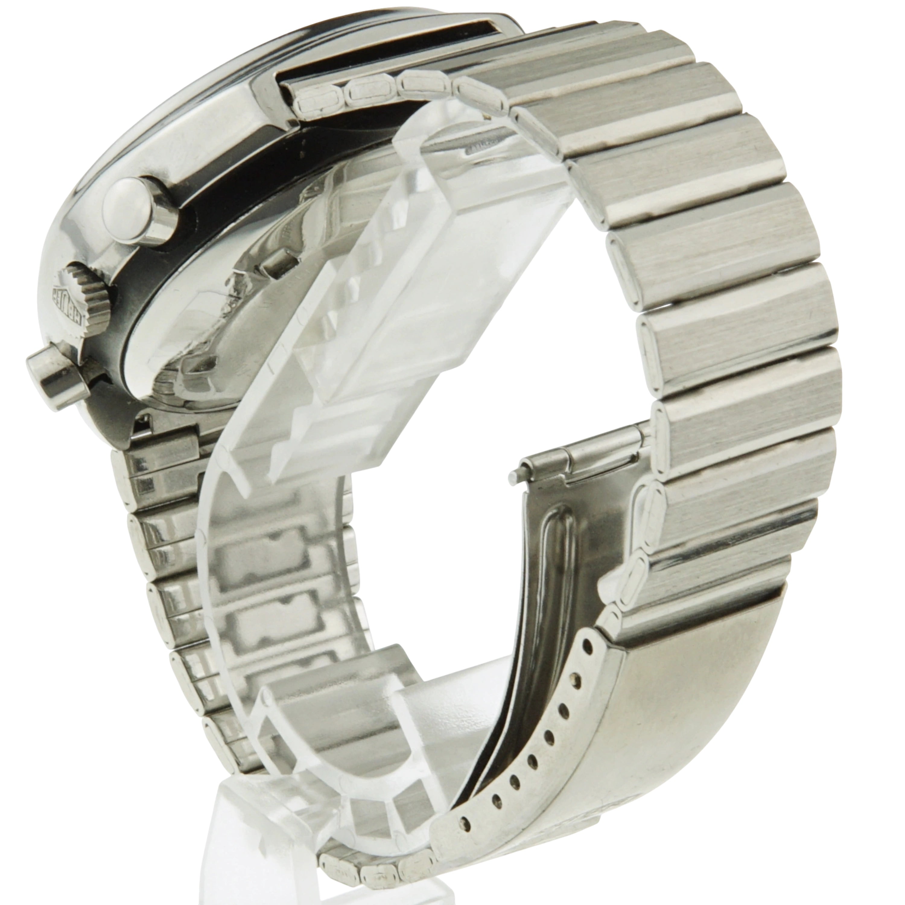 Das 41mm Edelstahlgehäuse der Pasadena war ursprünglich schwarz PVD-beschichtet; diese Beschichtung wurde jedoch vollständig entfernt, sodass die Uhr nun die Optik der seltenen Edelstahlvariante erhält. Der Verzicht auf klassische Bandanstöße unterstreicht den monolithischen Charakter des Designs – ein markantes Stilmerkmal der späten 1970er Jahre.
