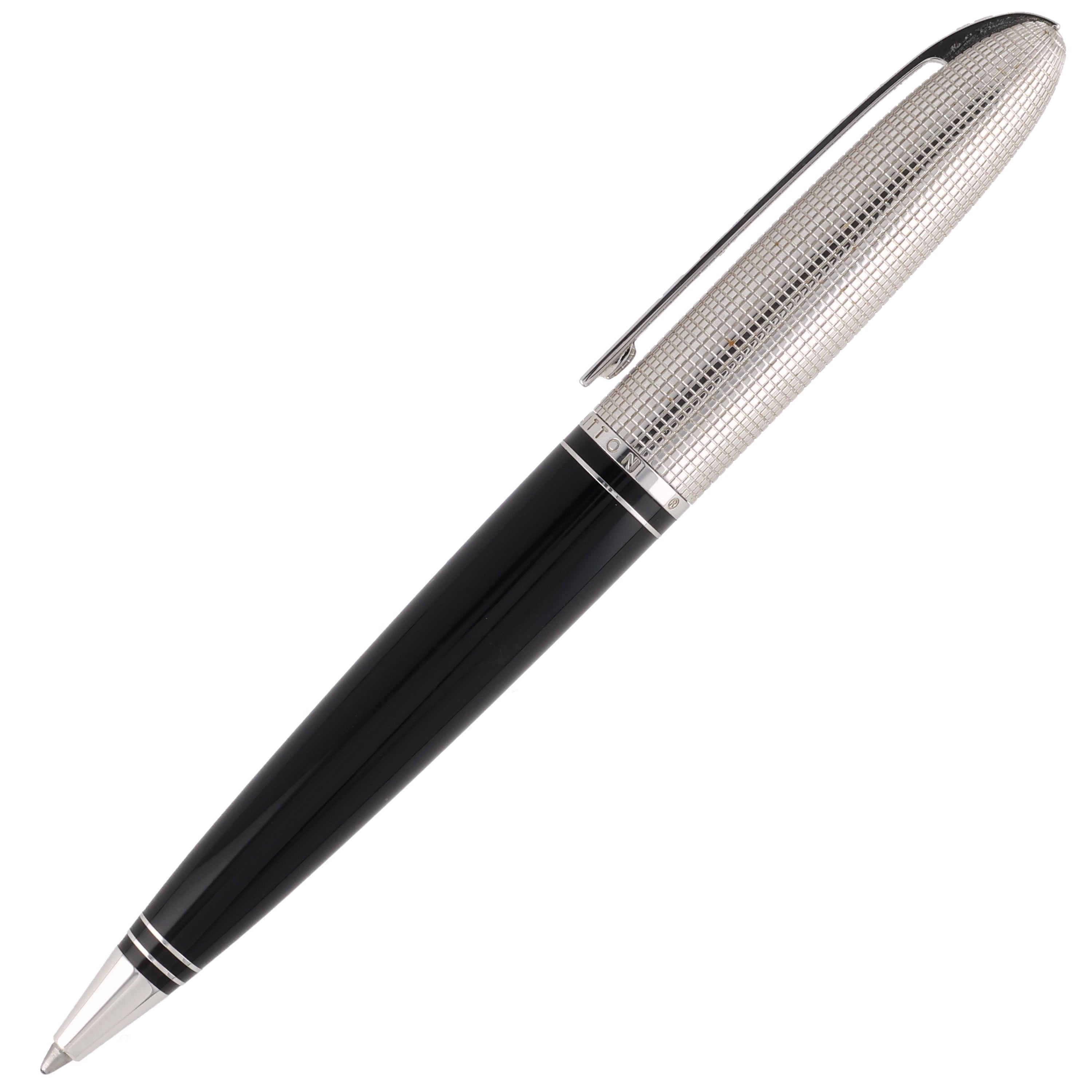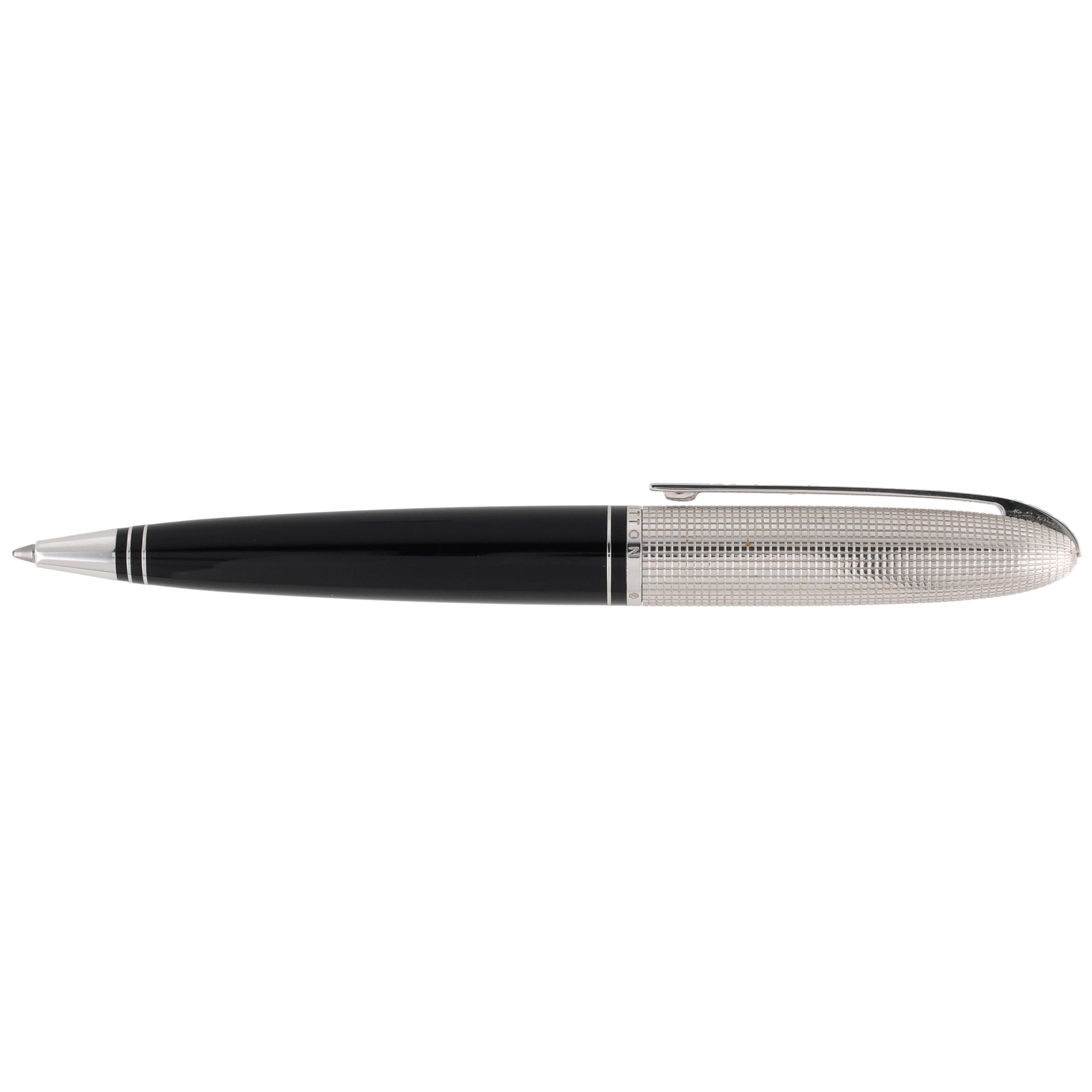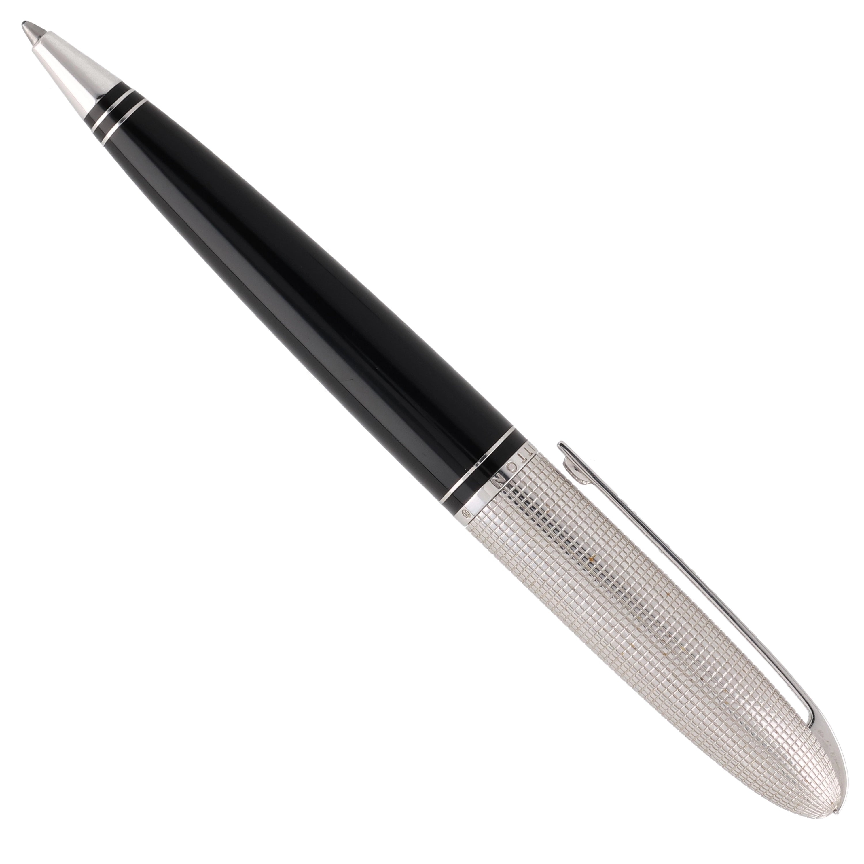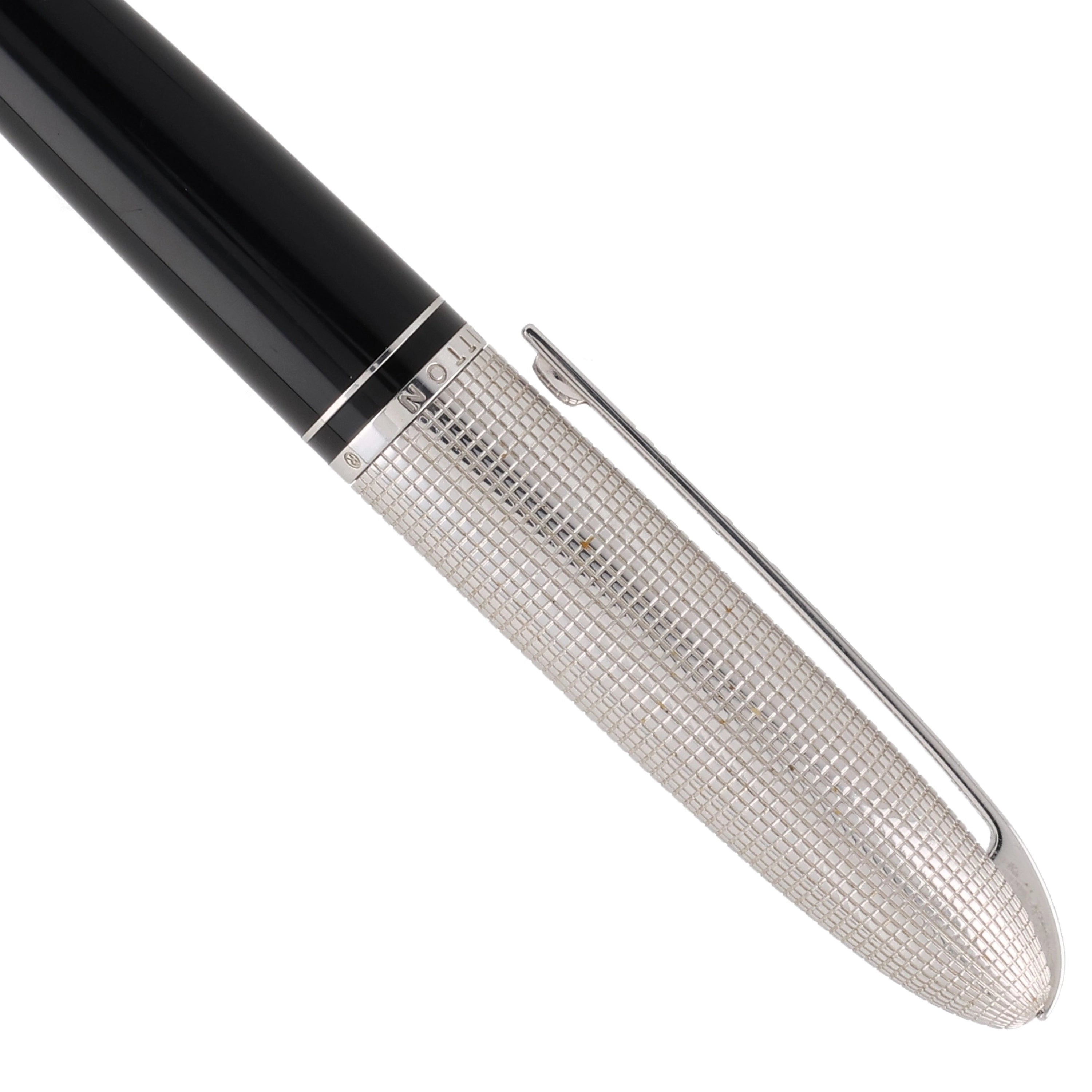 Der Louis Vuitton Doc Laq Kugelschreiber in Schwarz und Silber kombiniert minimalistisches Design mit luxuriöser Verarbeitung. Das Gehäuse aus schwarzem Lackharz wird durch eine silberfarbene, geriffelte Metallkappe ergänzt, die dem Stift eine elegante Textur verleiht. Dieser Kugelschreiber ist sowohl funktional als auch stilvoll und eignet sich hervorragend für den täglichen Gebrauch oder als besonderes Geschenk.