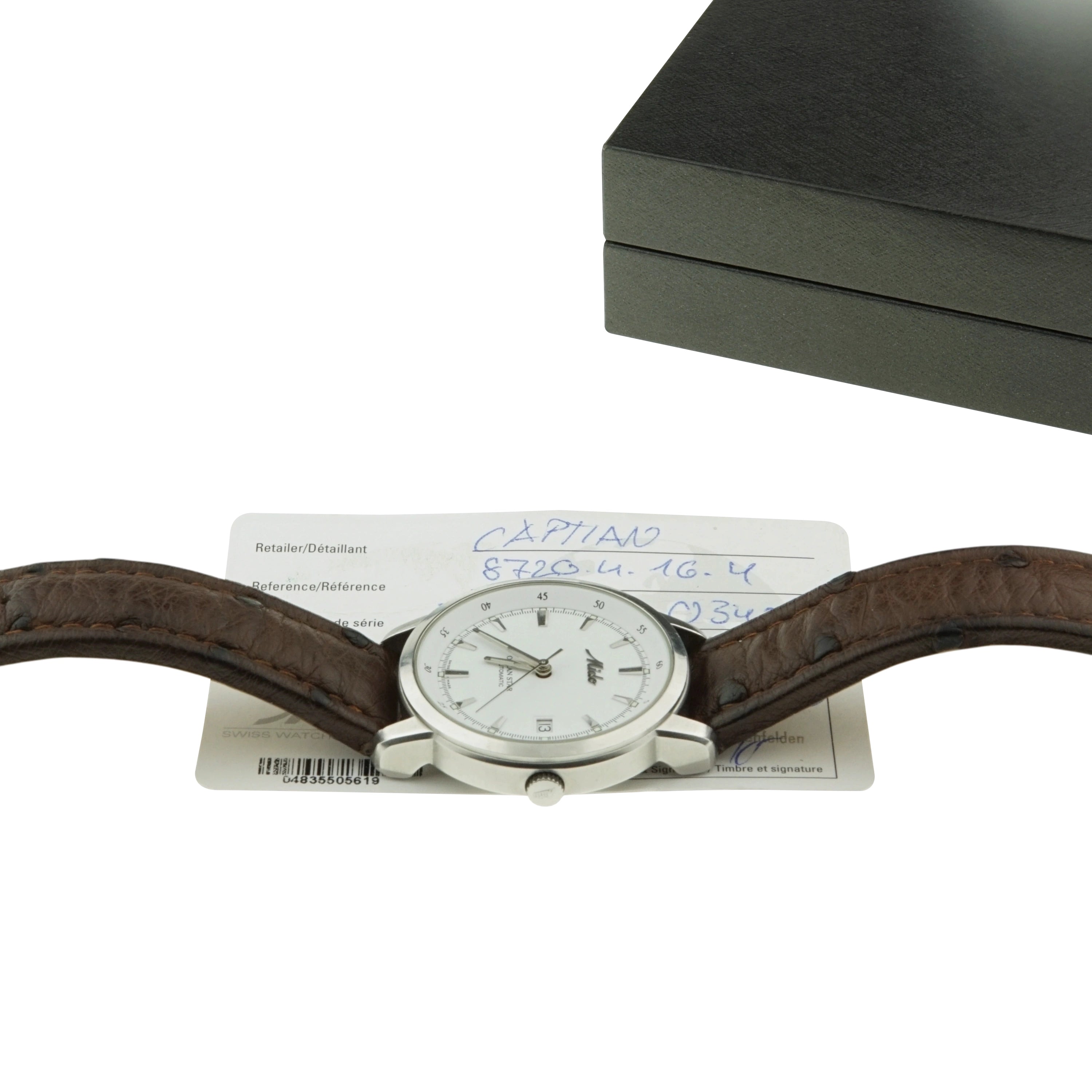 Das weiße Zifferblatt mit applizierten Indizes verleiht der Uhr eine edle Note trotz ihres maritimen Charakters. So präsentiert sich die Ocean Star Referenz 8720 als solider und stilvoller Vertreter der Mido-Taucheruhren – robust, vielseitig und mit einem Hauch nautischer Tradition.