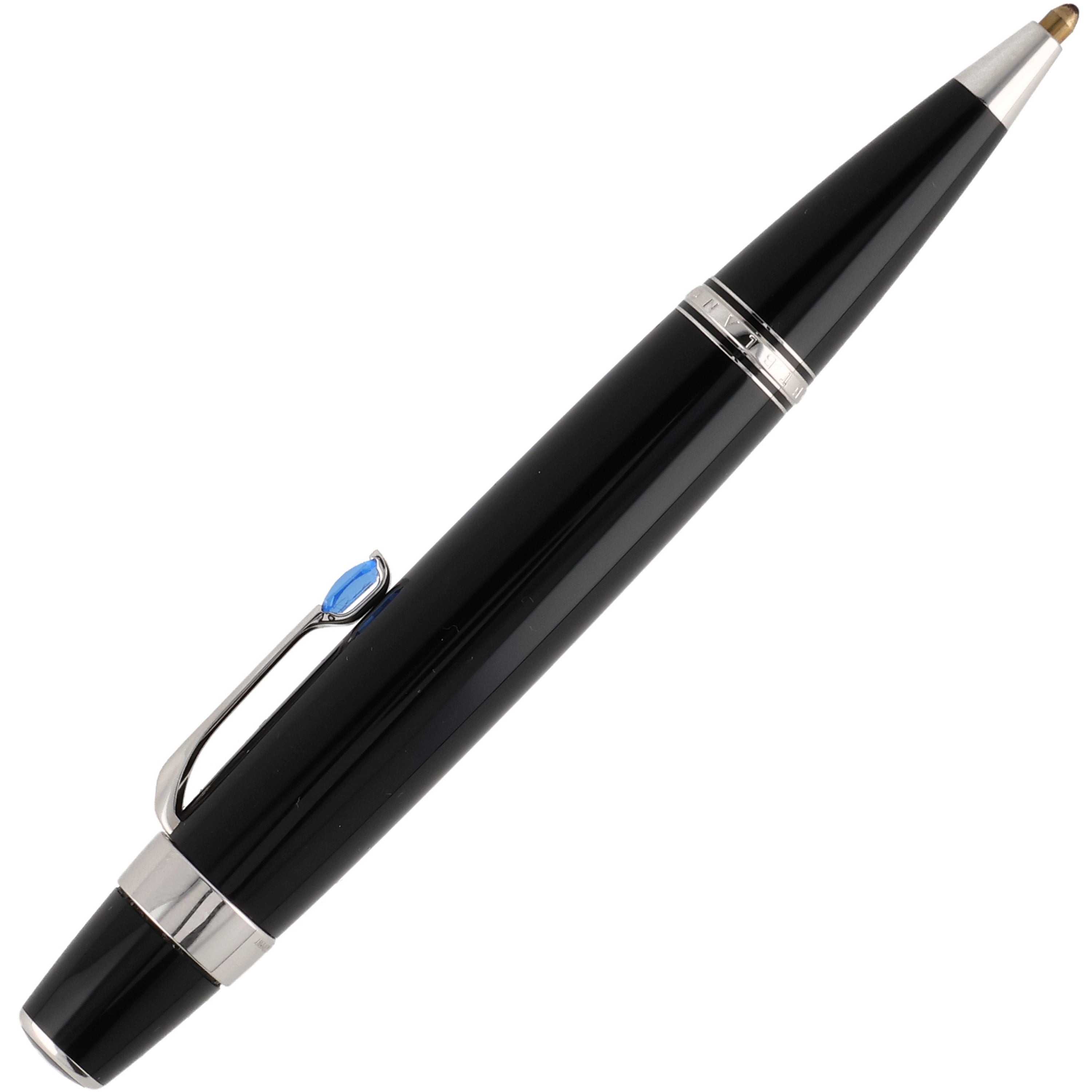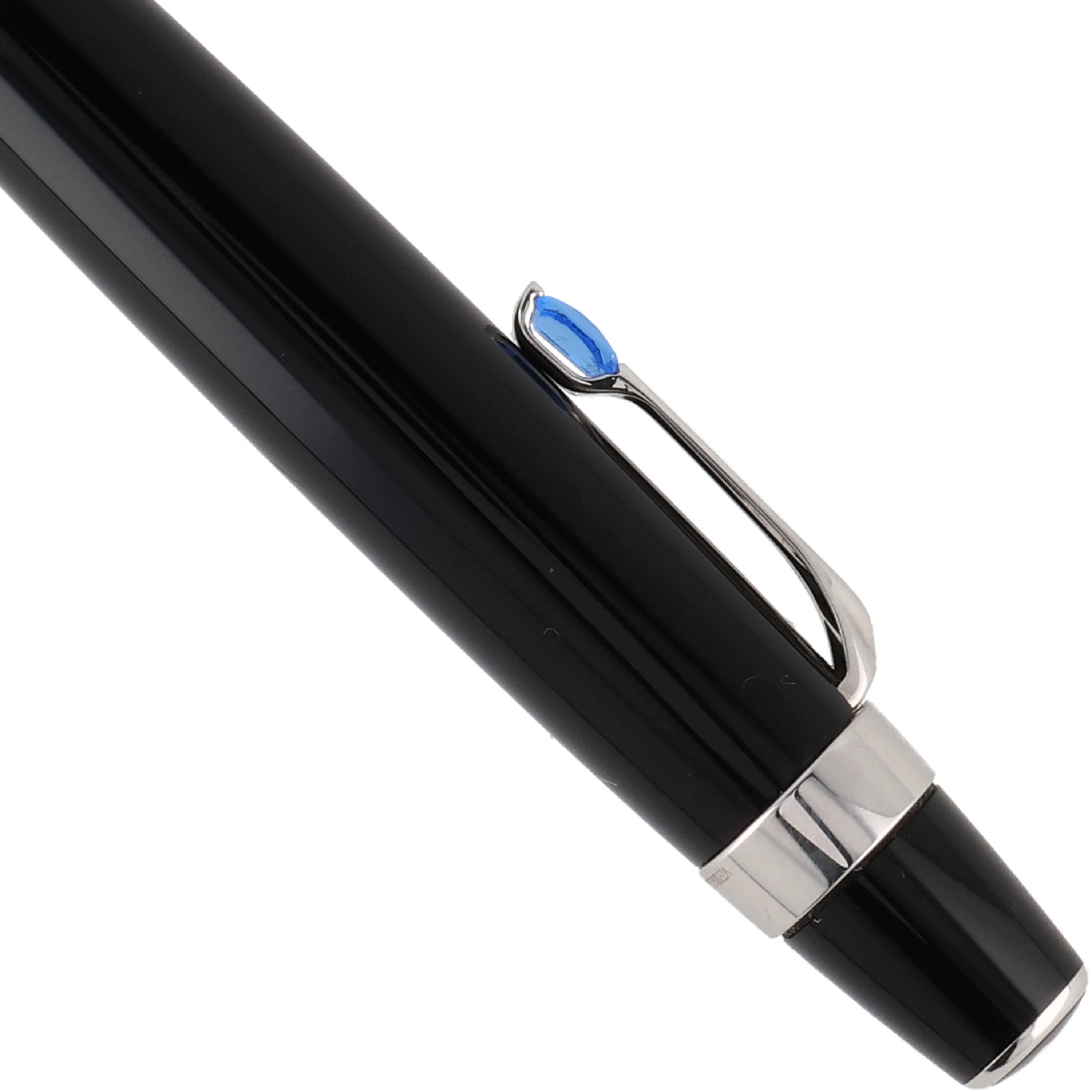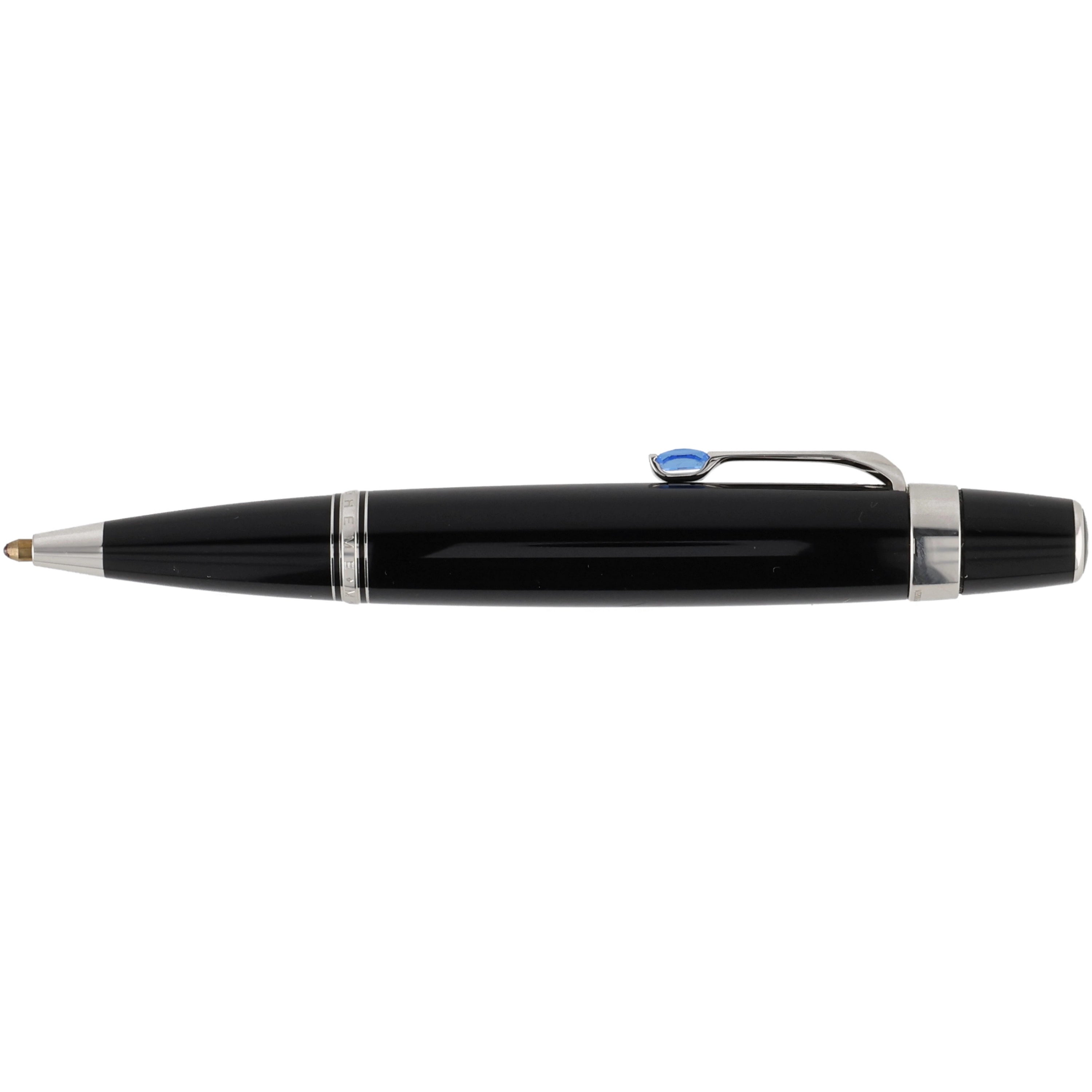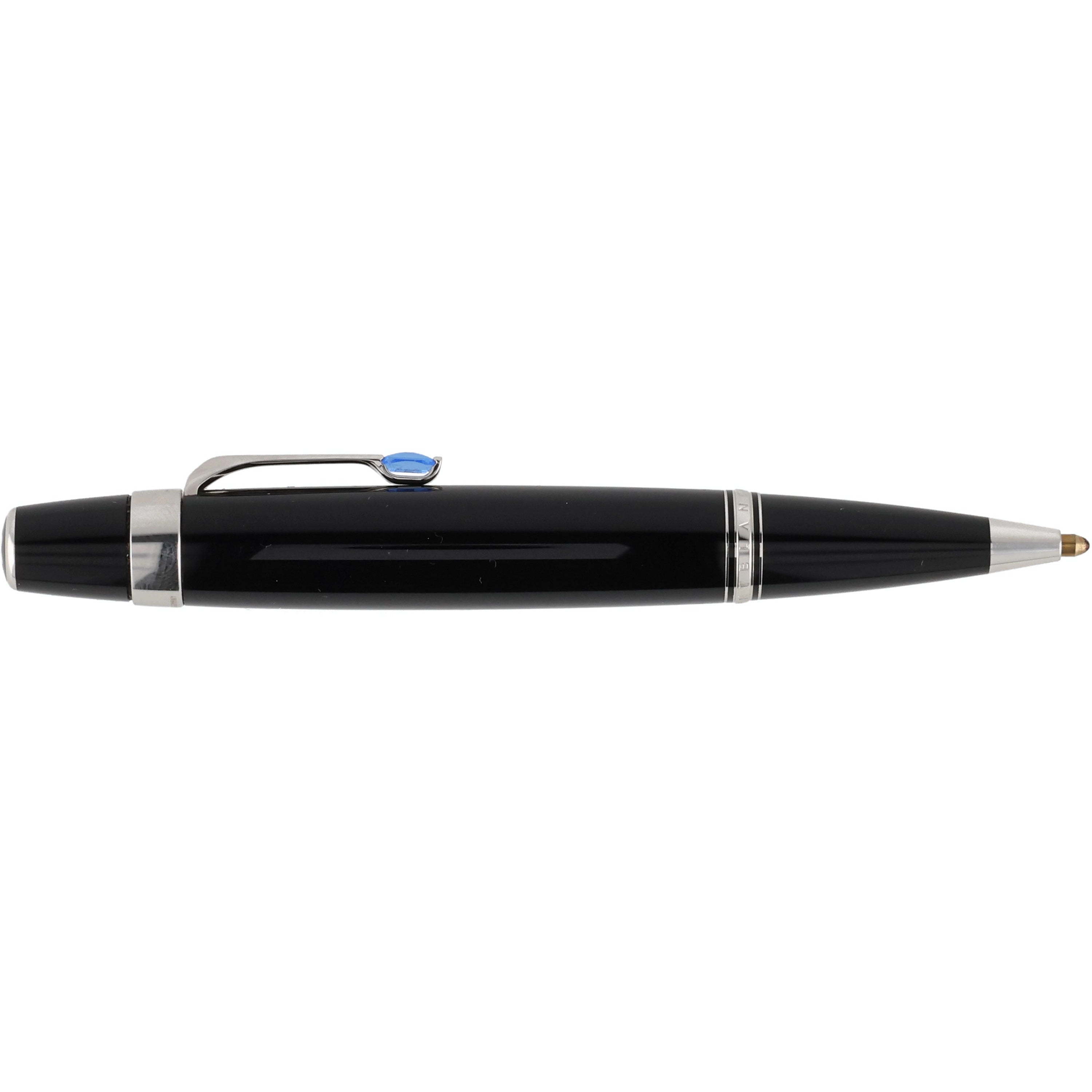 Das Schreibgerät ist aus schwarzem Edelharz gefertigt. Die platinierten Details, wie der mit einem synthetischen, saphirfarbenem Edelstein besetzte Clip und die Beschläge, verleihen dem Schreibwerkzeug eine zusätzliche exklusive und luxuriöse Note. Sie vollenden das elegante Design und betonen dessen hochwertigen Charakter.