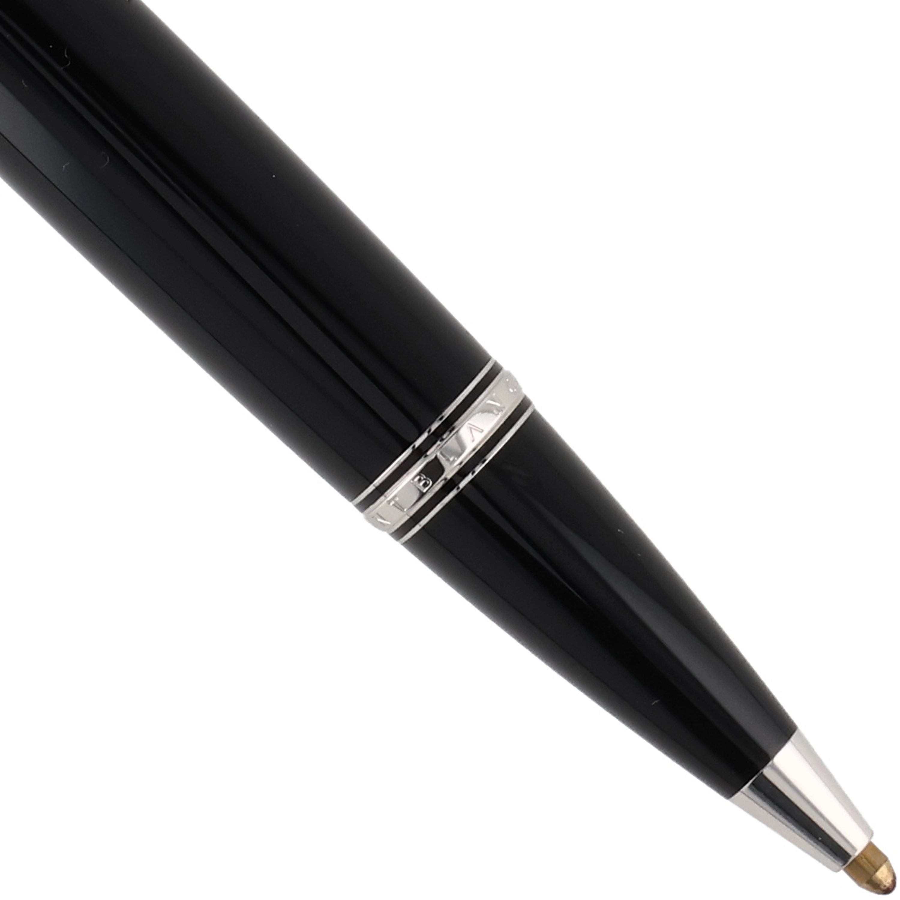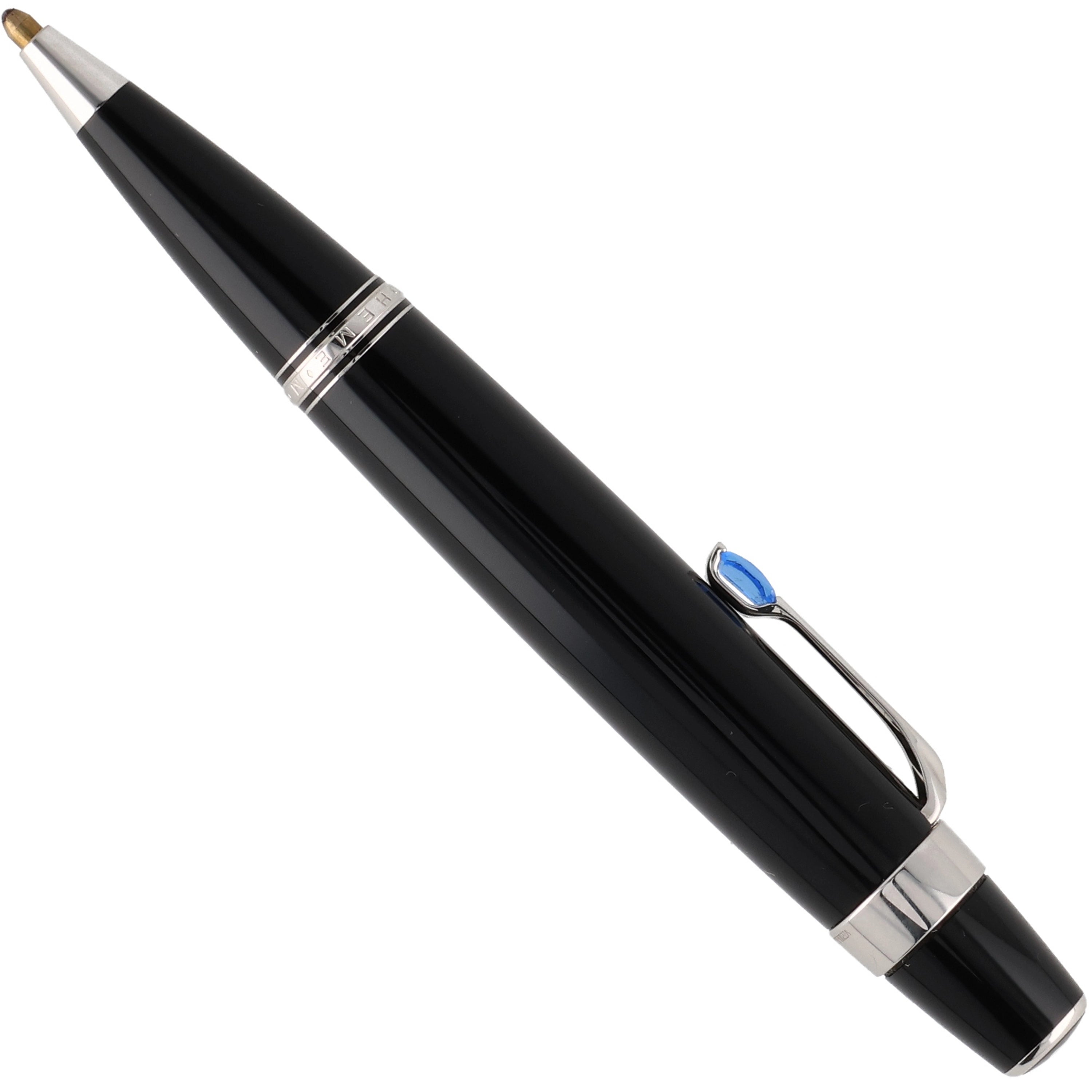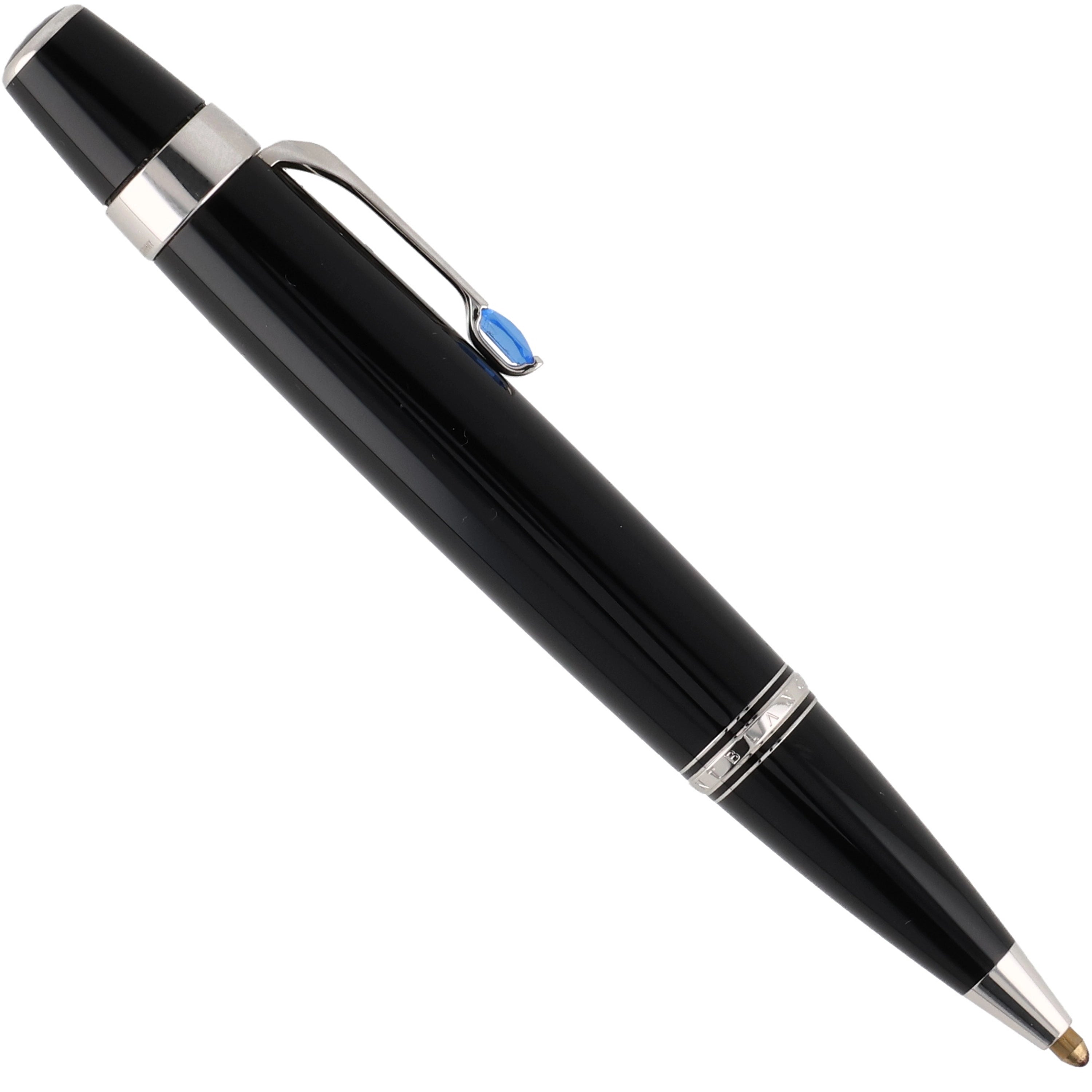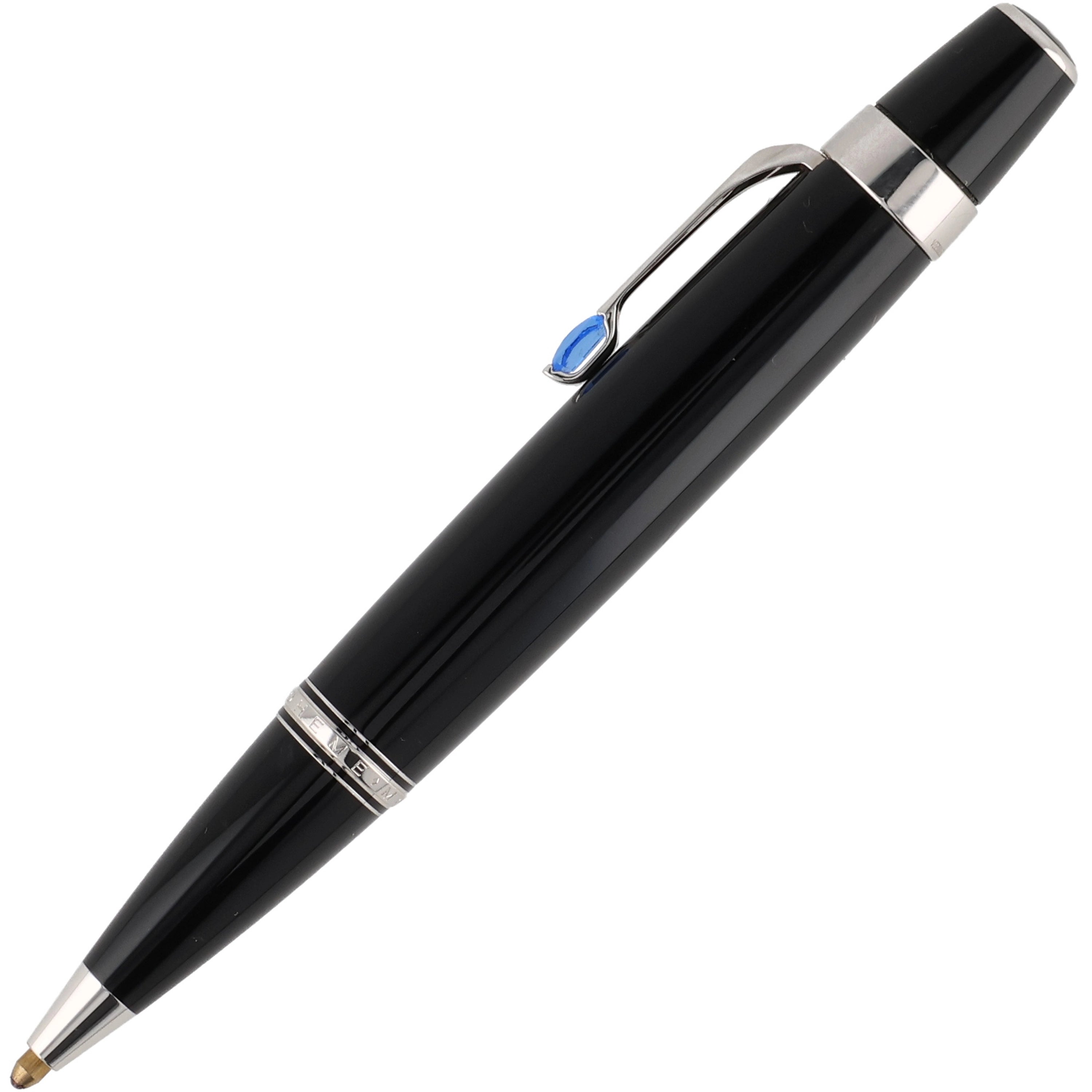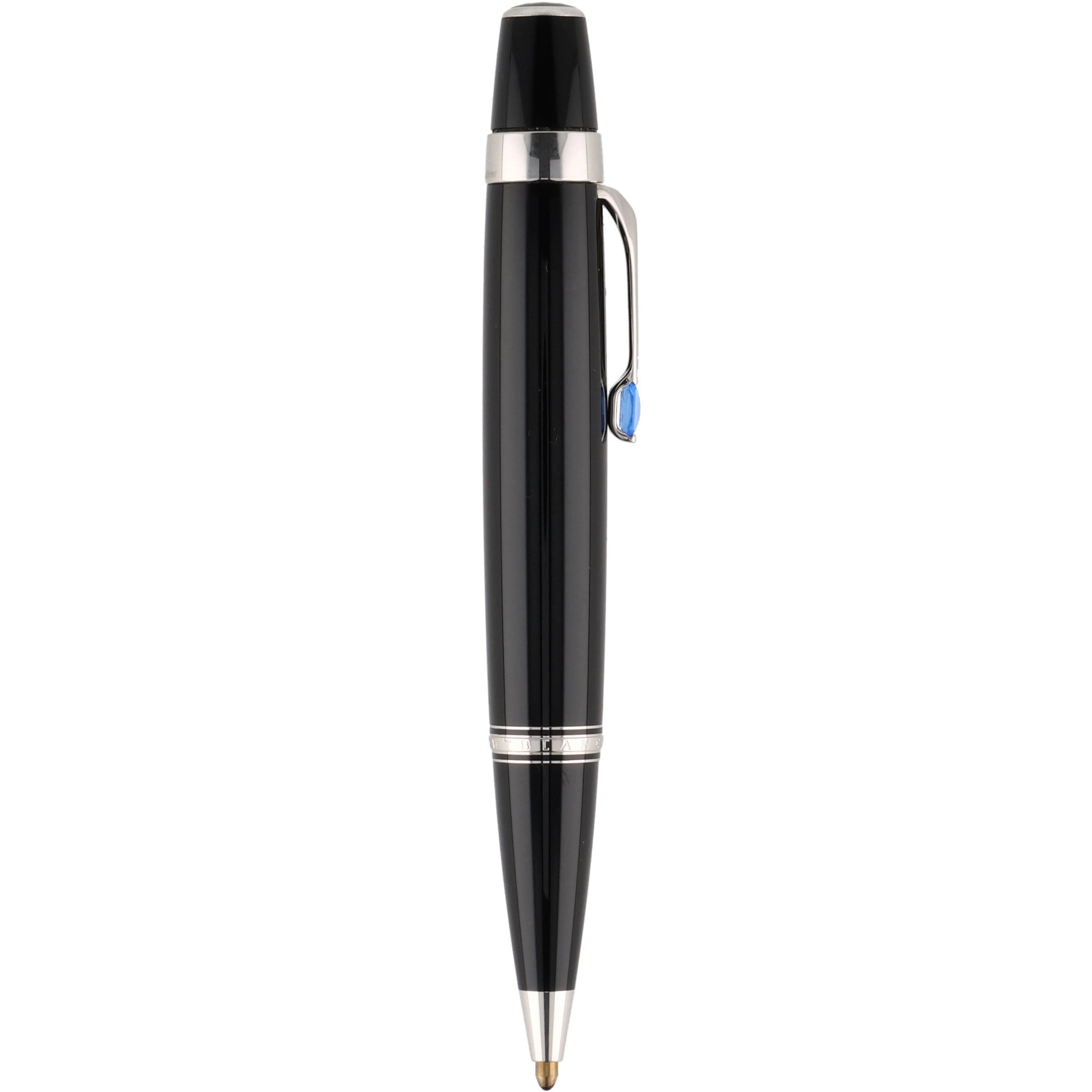 Das Schreibgerät ist aus schwarzem Edelharz gefertigt. Die platinierten Details, wie der mit einem synthetischen, saphirfarbenem Edelstein besetzte Clip und die Beschläge, verleihen dem Schreibwerkzeug eine zusätzliche exklusive und luxuriöse Note. Sie vollenden das elegante Design und betonen dessen hochwertigen Charakter.