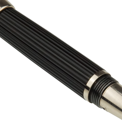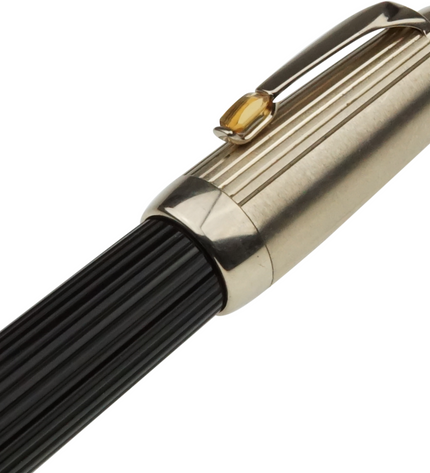 Das Schreibgerät besticht durch seine satiniert vergoldete Kappe aus hochwertigem Stainless Steel. Der aus Edelharz gefertigte Korpus wurde mit einem fein gearbeiteten Linienmuster versehen, das sowohl optisch als auch haptisch ein besonderes Erlebnis bietet. Rosevergoldete Details, darunter der Clip, der mit einem synthetischen Citrin besetzt ist, setzen luxuriöse Akzente und runden das Design harmonisch ab.