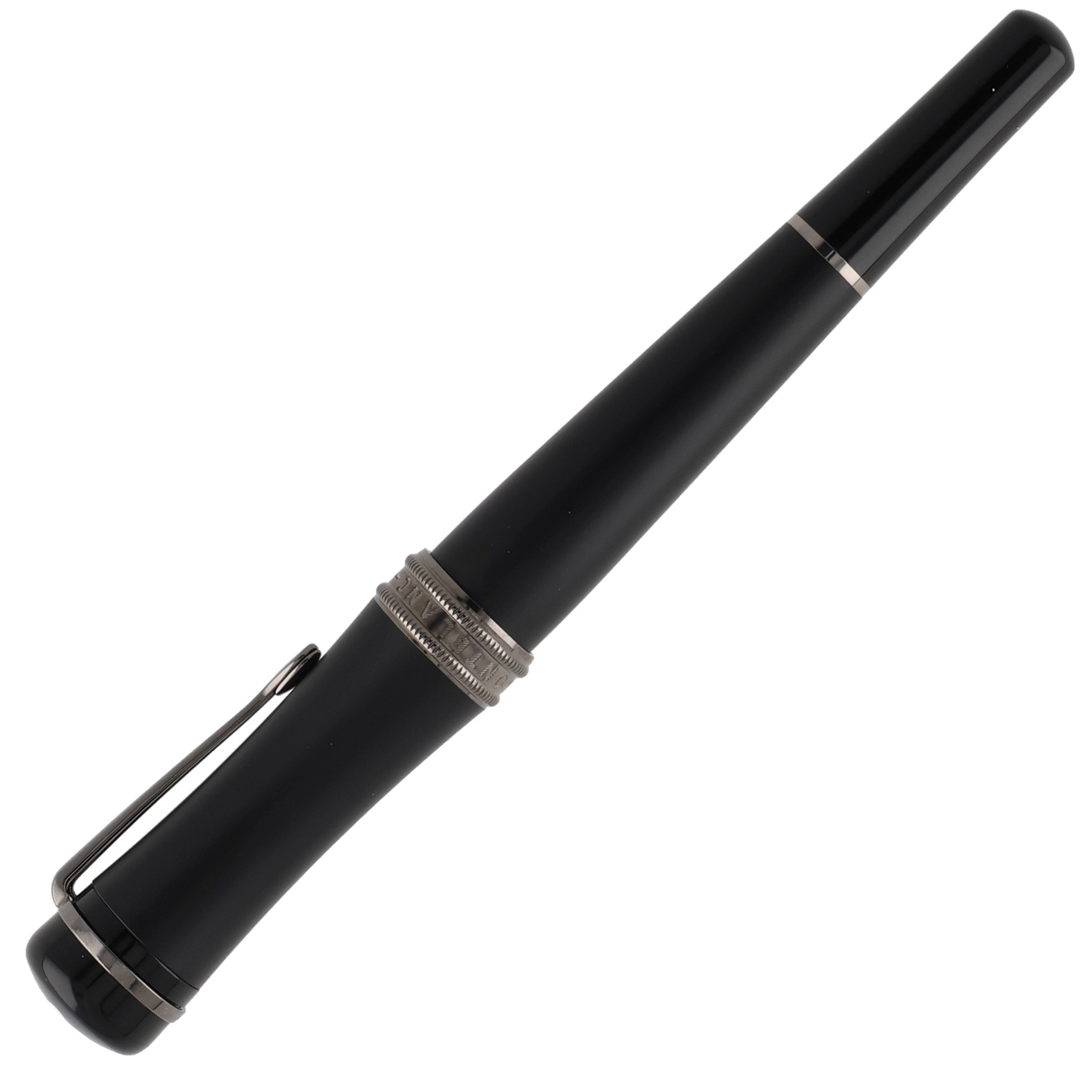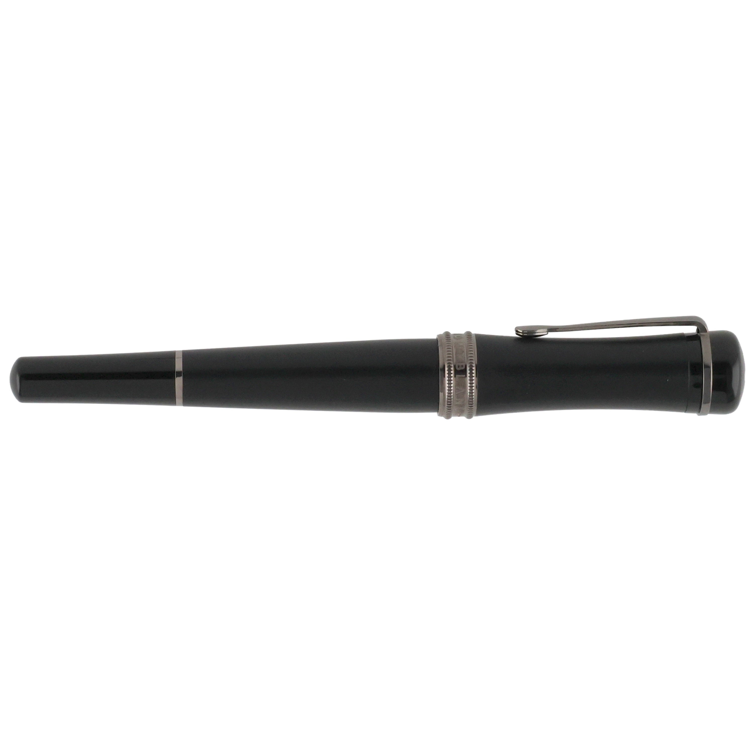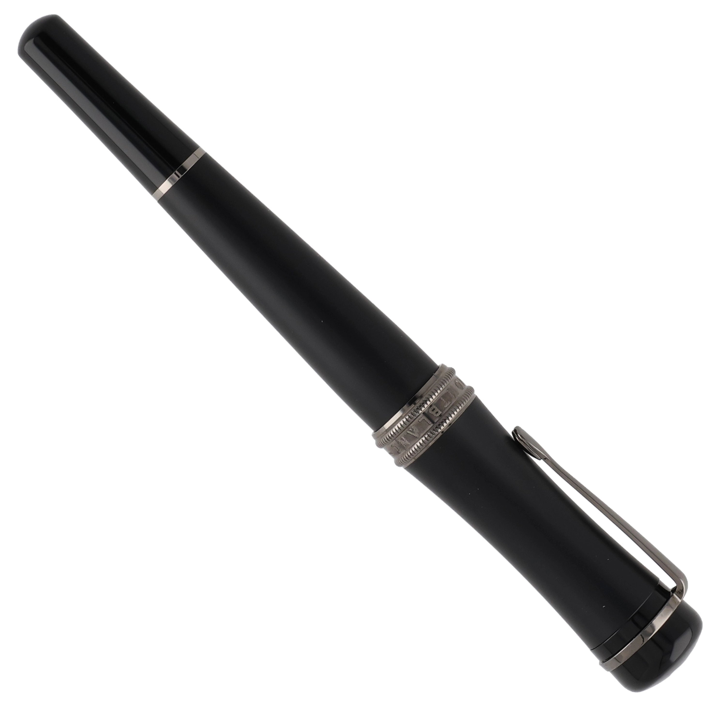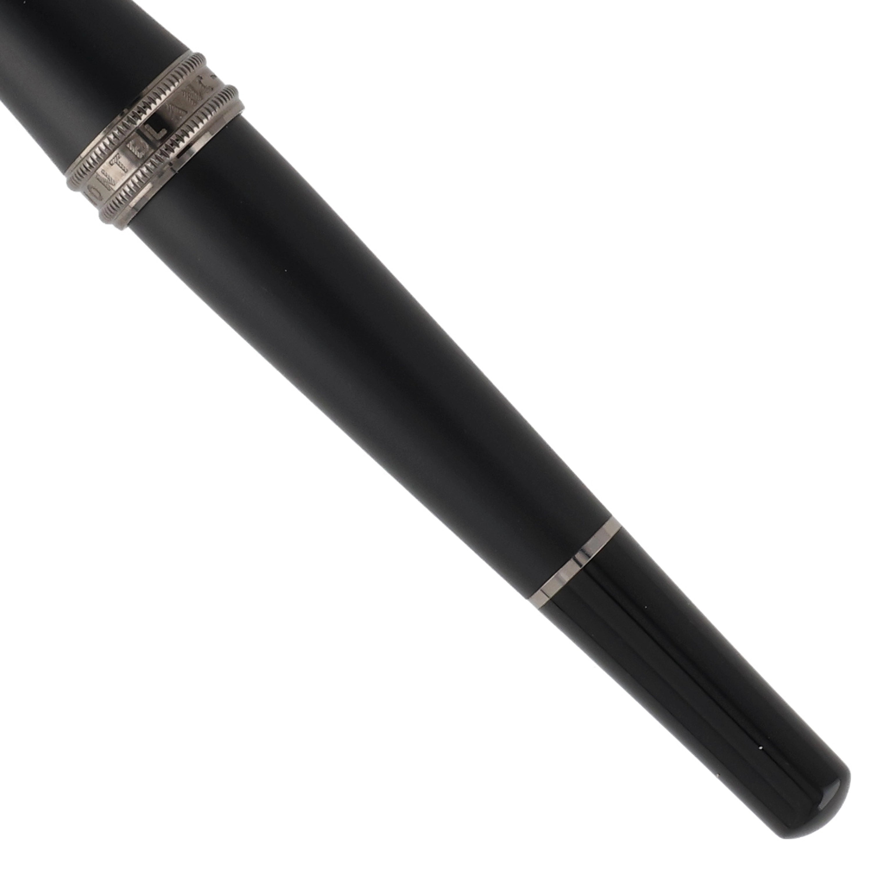 Dieses Schreibgerät überzeugt durch ein modernes und zugleich zeitlos elegantes Design aus hochwertigem schwarzem Edelharz. Kappe und Korpus sind an den Enden in hochglänzendem Edelharz ausgeführt, während der Mittelteil in mattem Schwarz gehalten ist und so einen spannenden Kontrast zwischen Glanz und Struktur schafft. Die rhodinierten Details – insbesondere Clip und Griffstück – unterstreichen die dynamische Linienführung und vollenden das harmonische Gesamtbild stimmig.