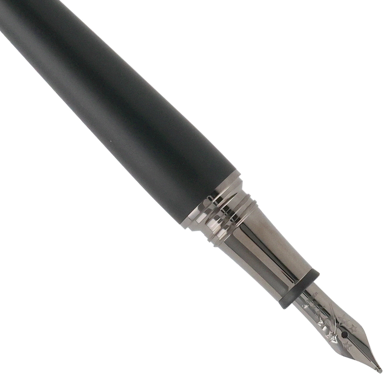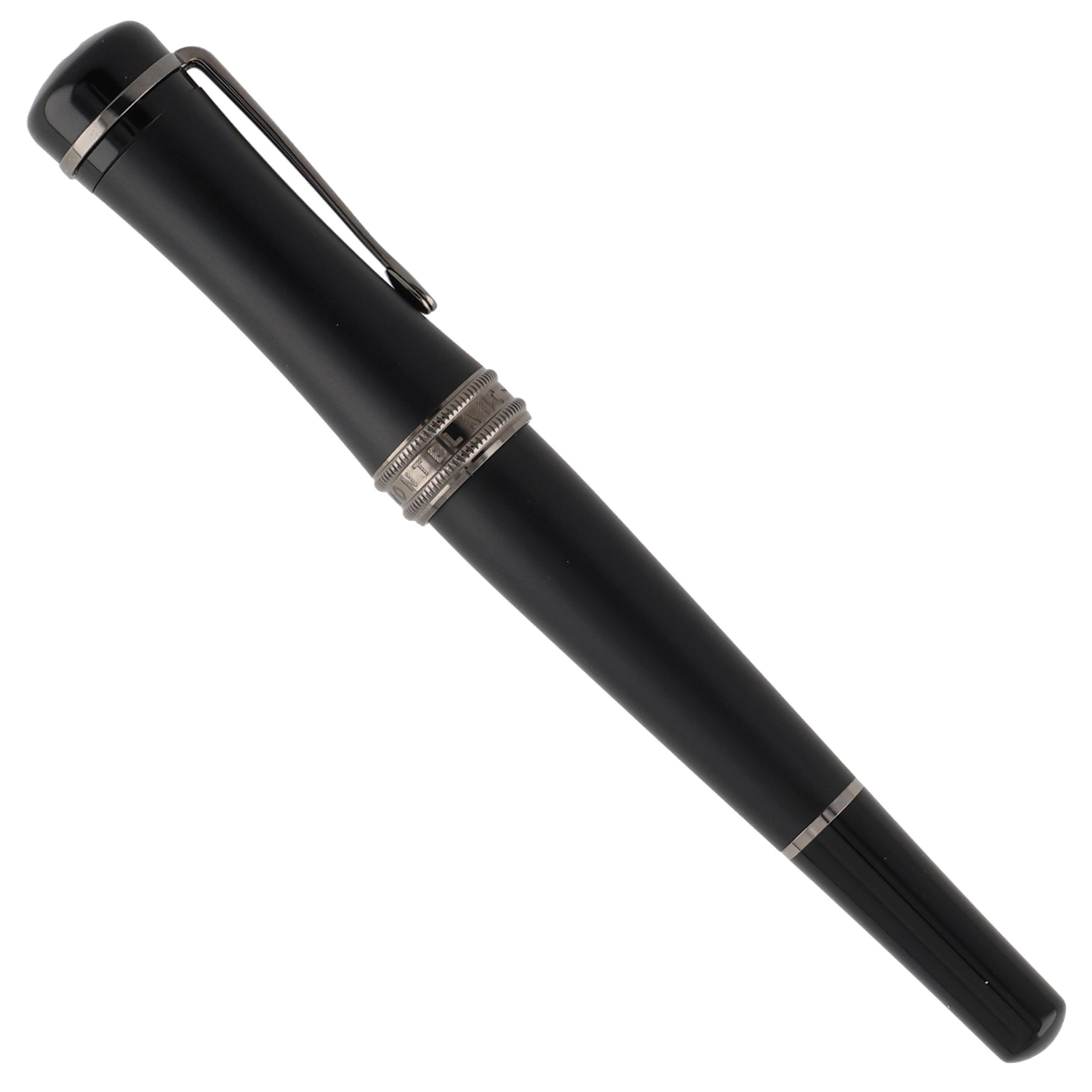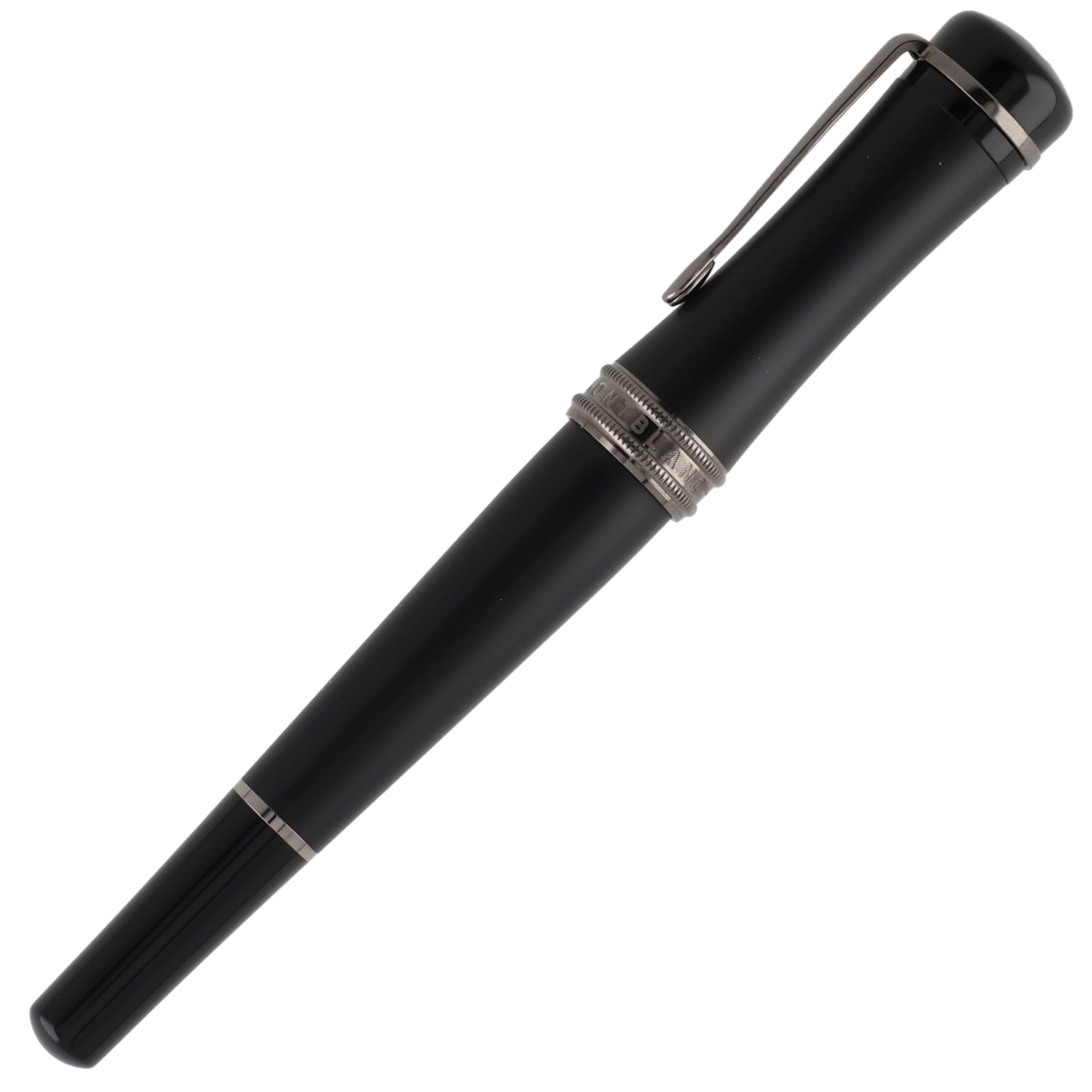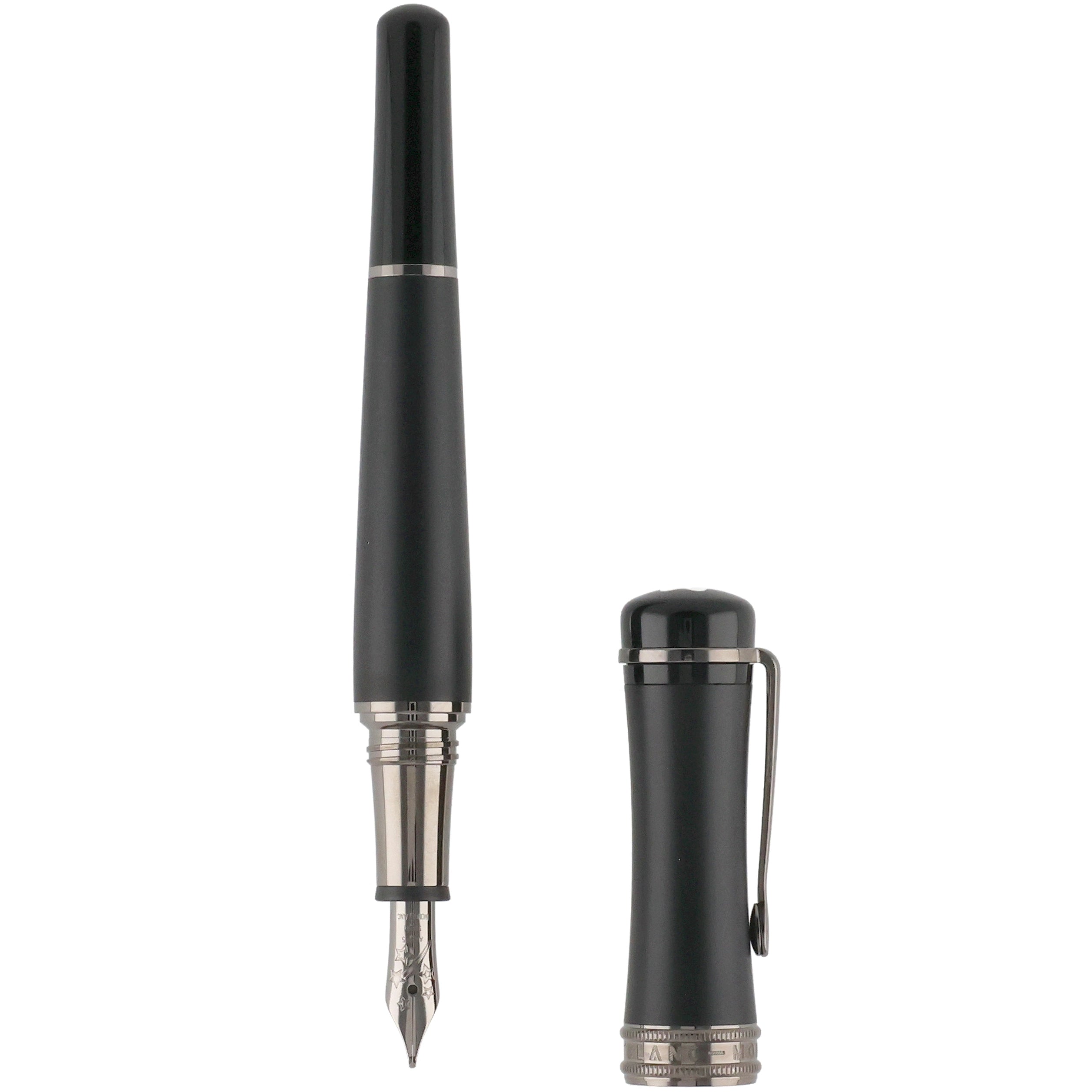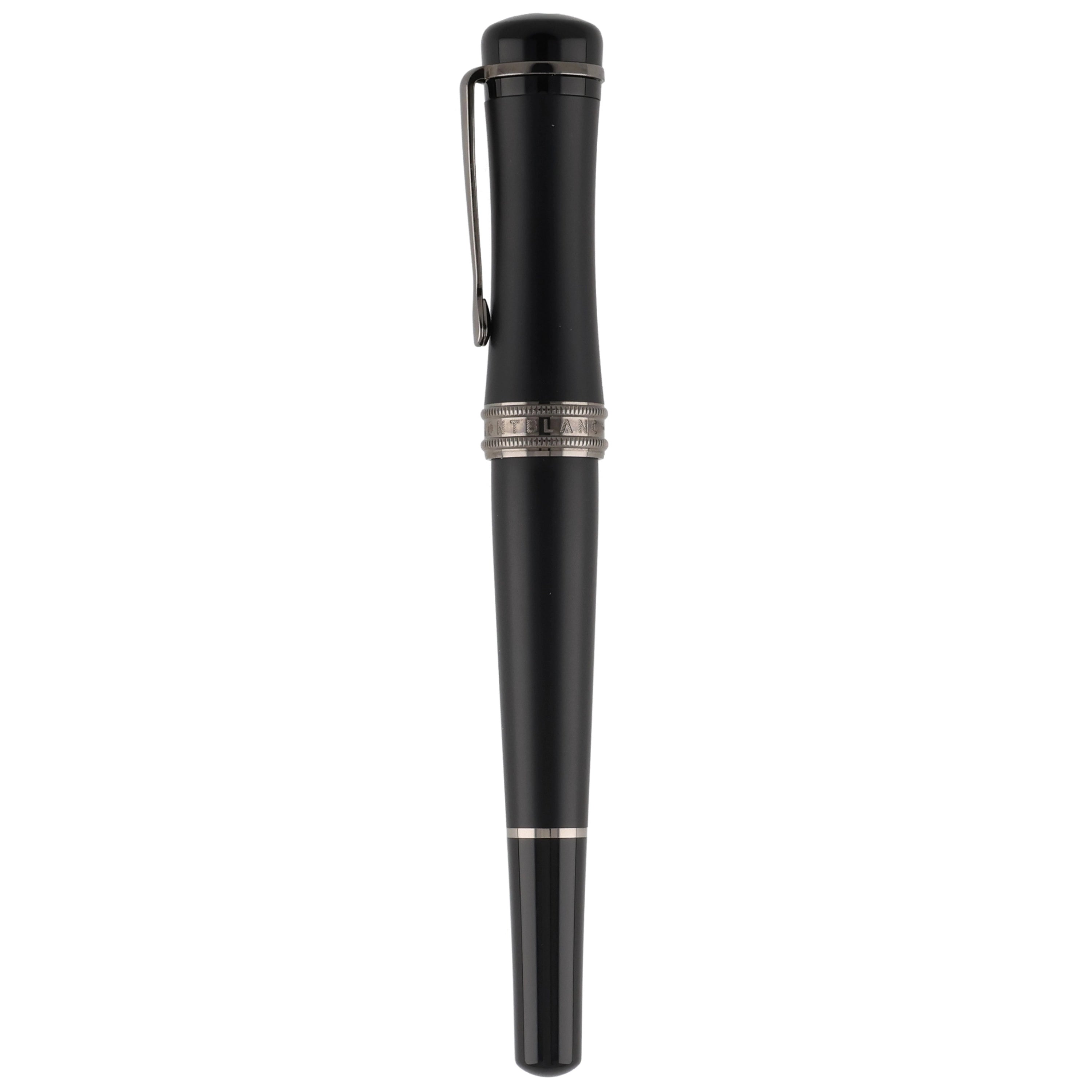 Dieses Schreibgerät überzeugt durch ein modernes und zugleich zeitlos elegantes Design aus hochwertigem schwarzem Edelharz. Kappe und Korpus sind an den Enden in hochglänzendem Edelharz ausgeführt, während der Mittelteil in mattem Schwarz gehalten ist und so einen spannenden Kontrast zwischen Glanz und Struktur schafft. Die rhodinierten Details – insbesondere Clip und Griffstück – unterstreichen die dynamische Linienführung und vollenden das harmonische Gesamtbild stimmig.