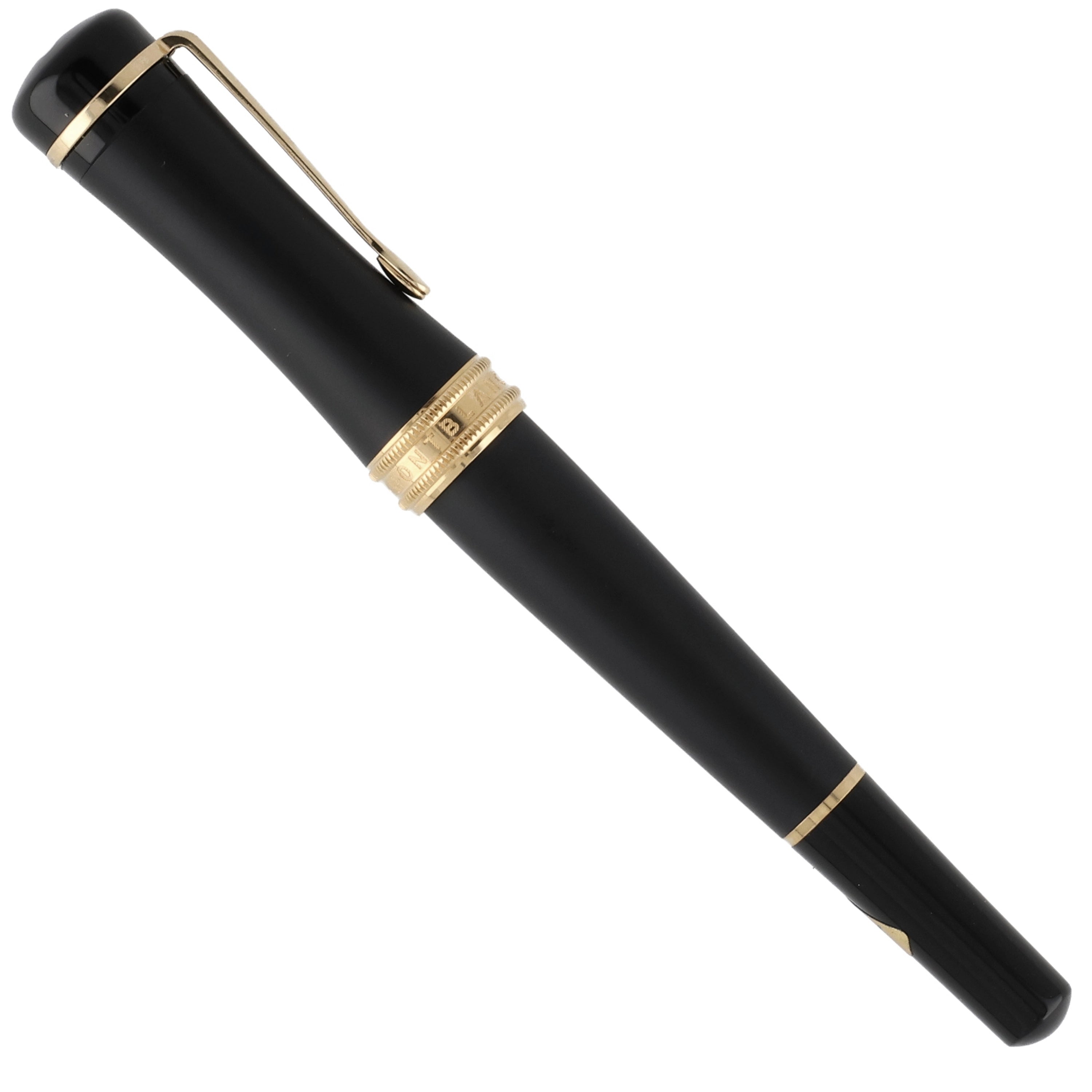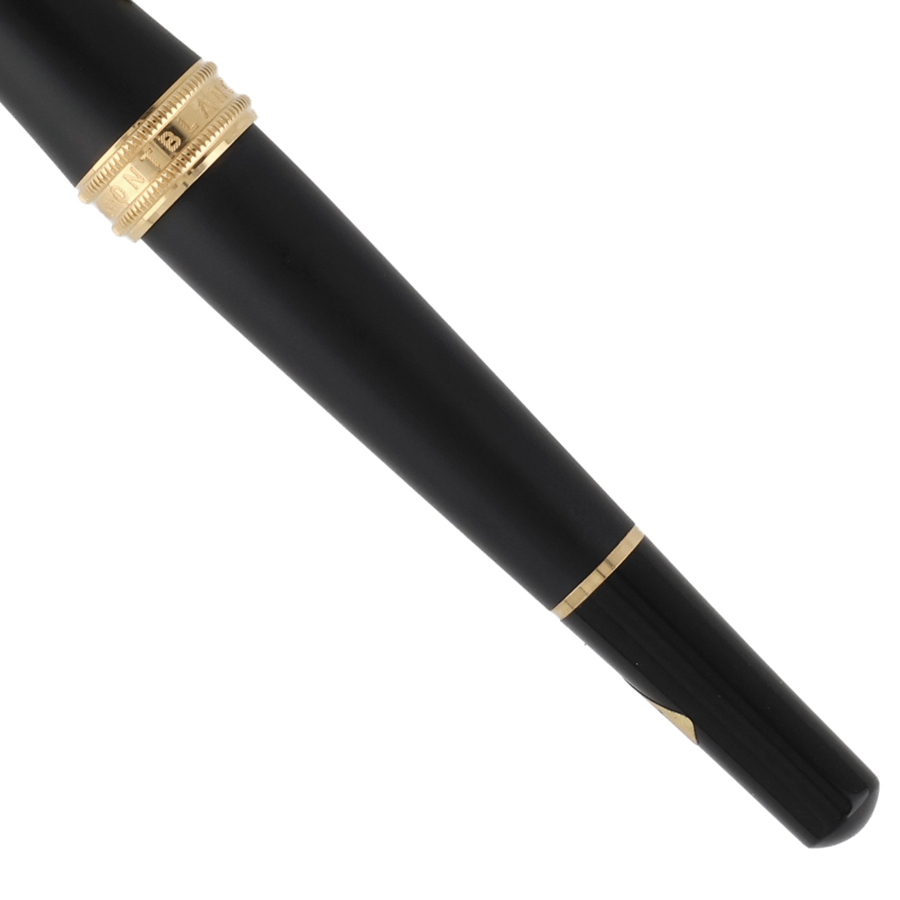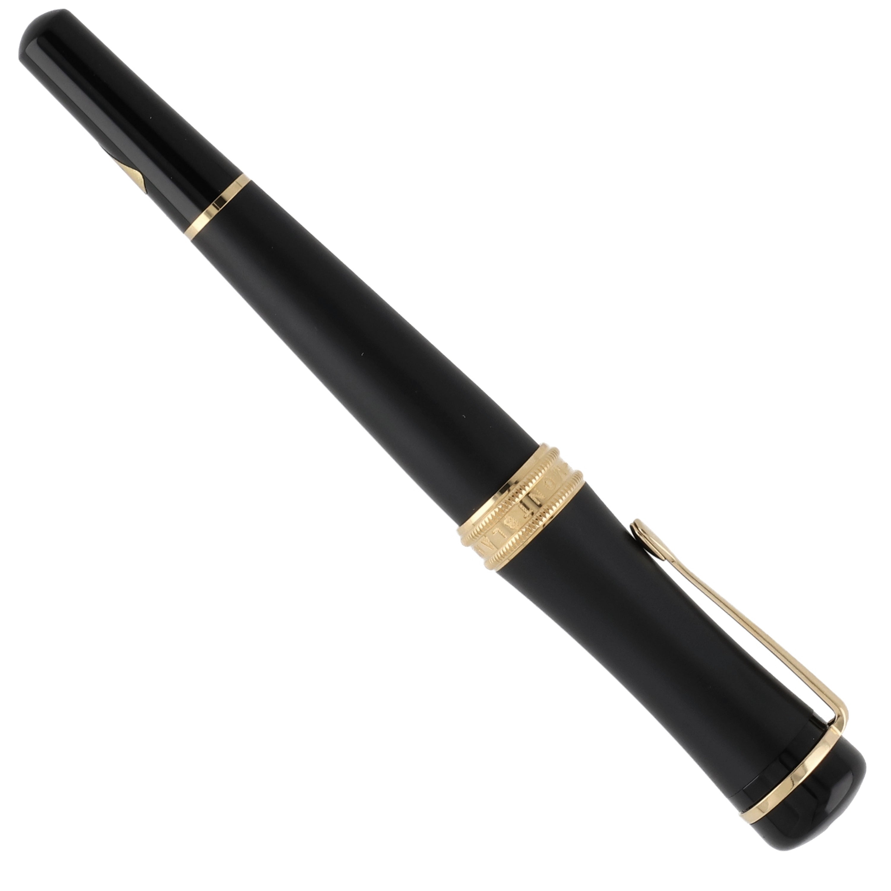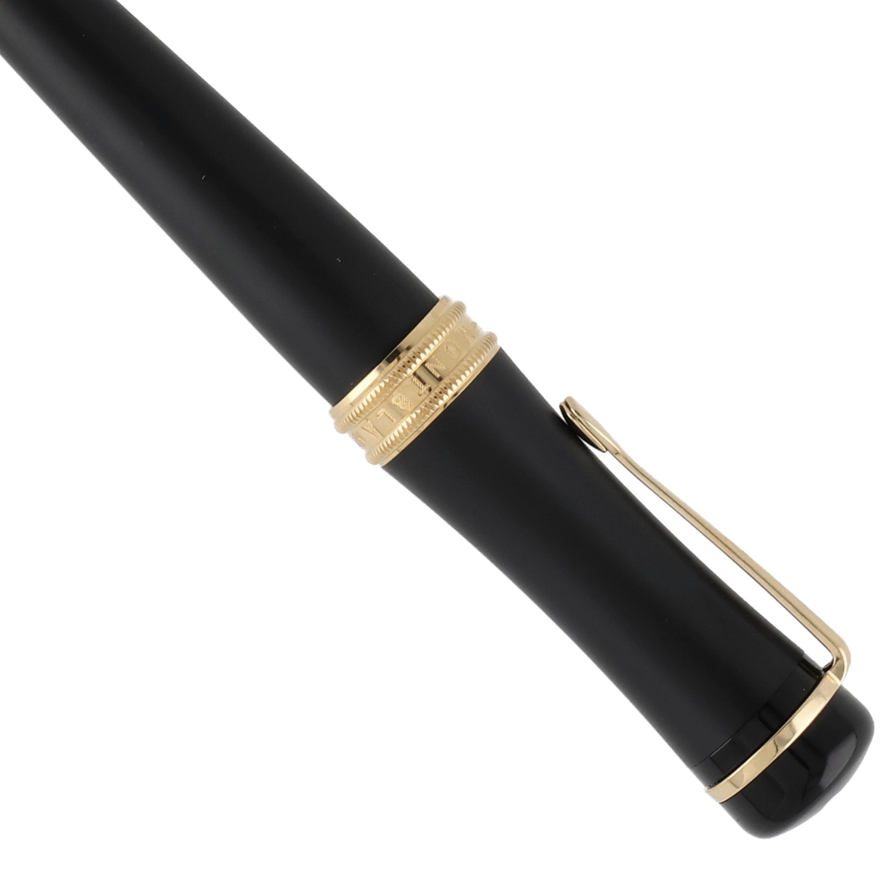 Dieses Schreibgerät überzeugt durch ein modernes und zugleich zeitlos elegantes Design aus hochwertigem schwarzem Edelharz. Kappe und Korpus sind an den Enden in hochglänzendem Edelharz ausgeführt, während der Mittelteil in mattem Schwarz gehalten ist und so einen spannenden Kontrast zwischen Glanz und Struktur schafft Vergoldete Details – wie der Clip und das Griffstück – verleihen dem Schreibgerät eine edle Note und vollenden das Gesamtbild.