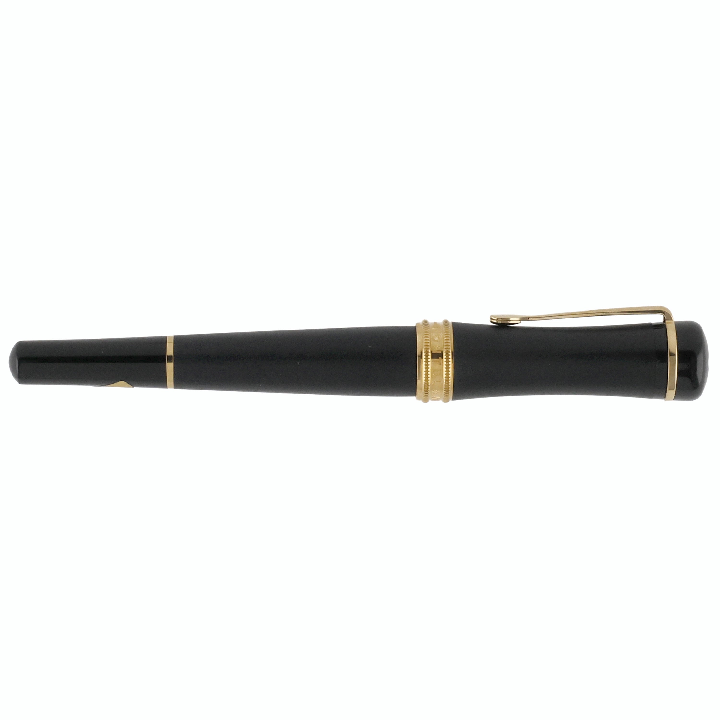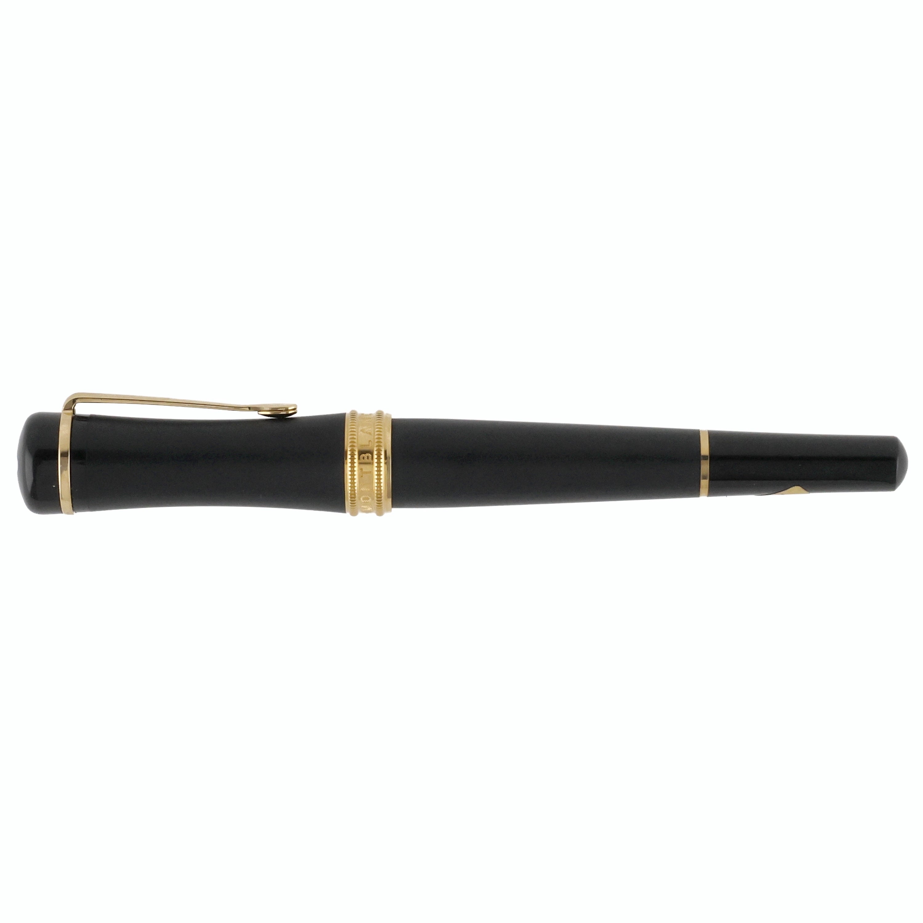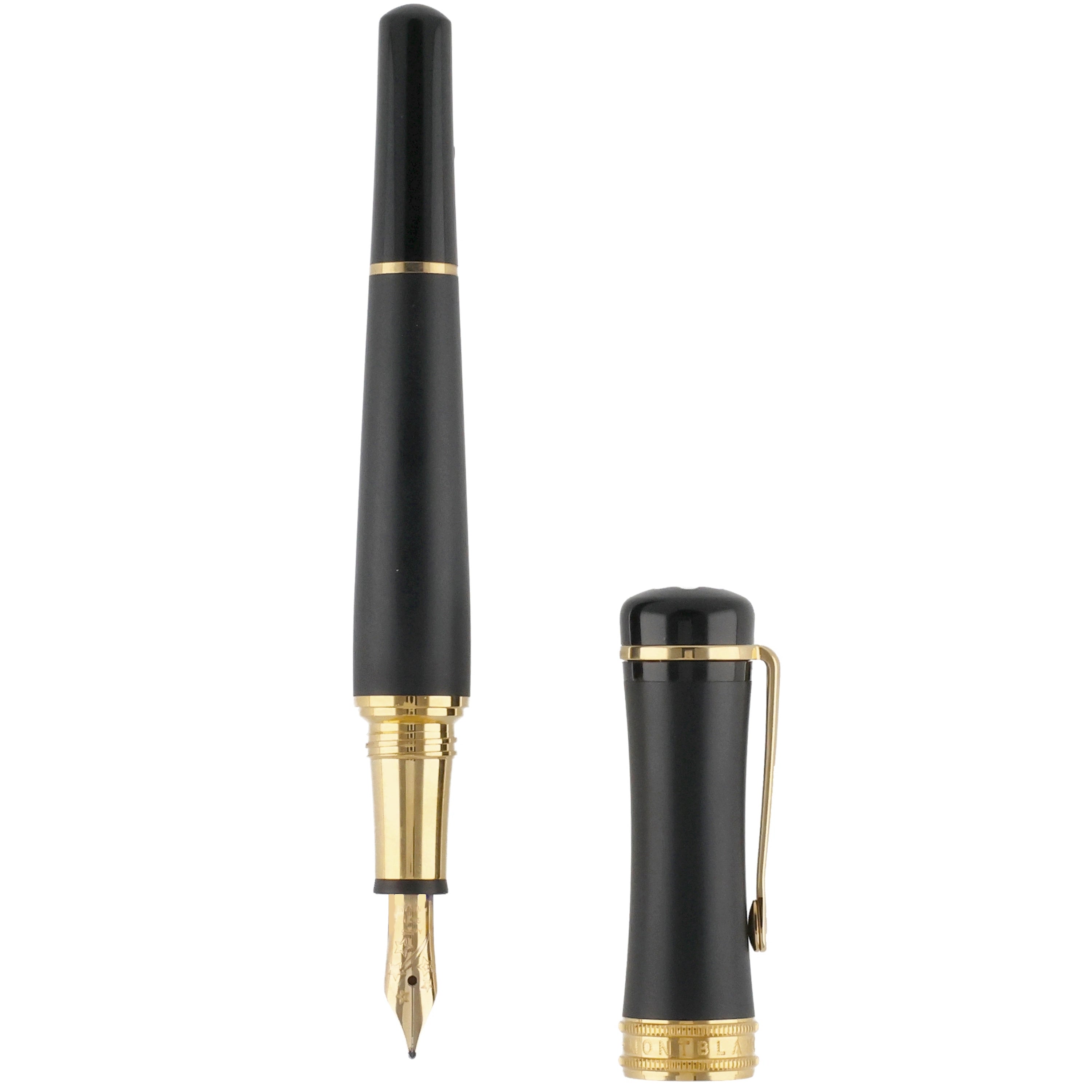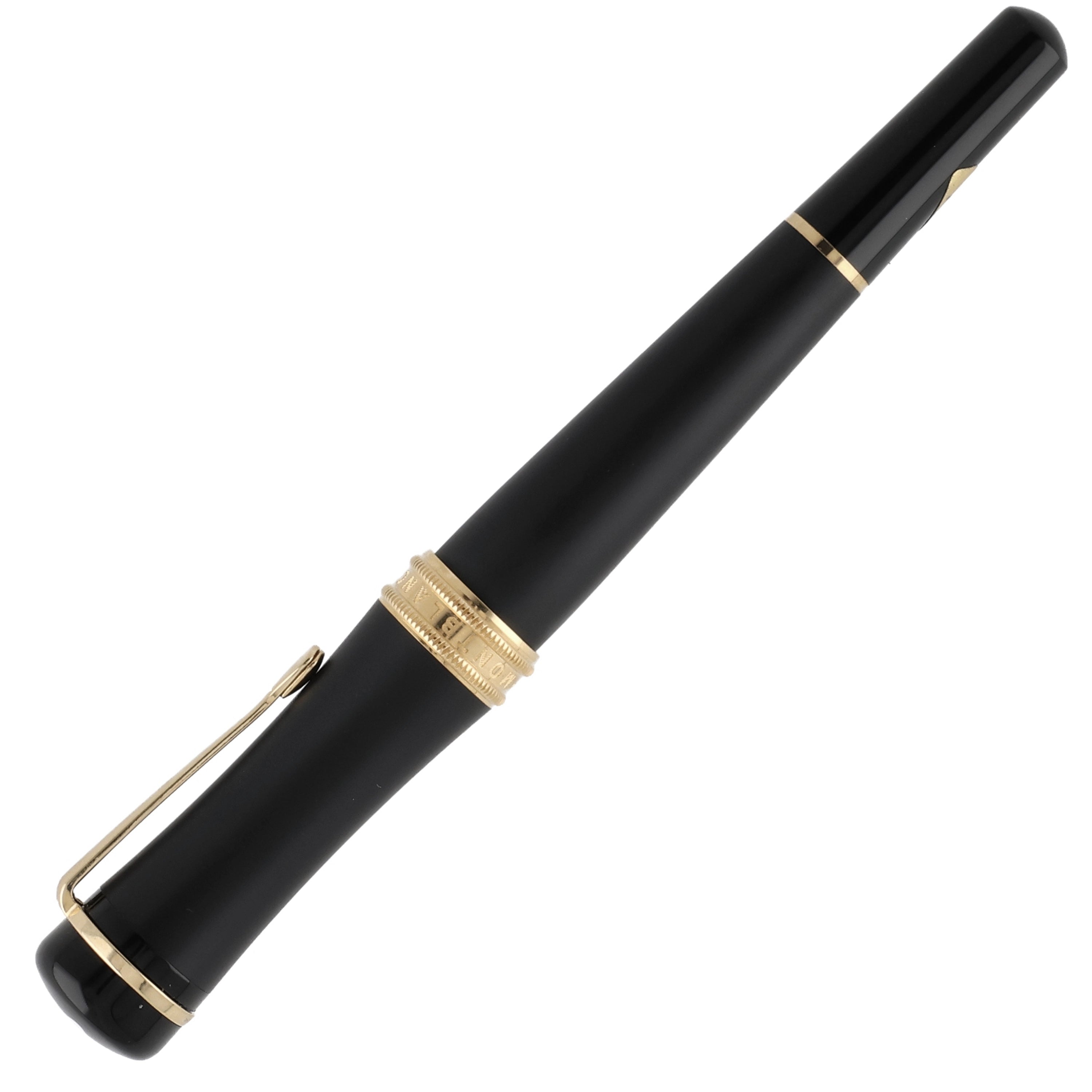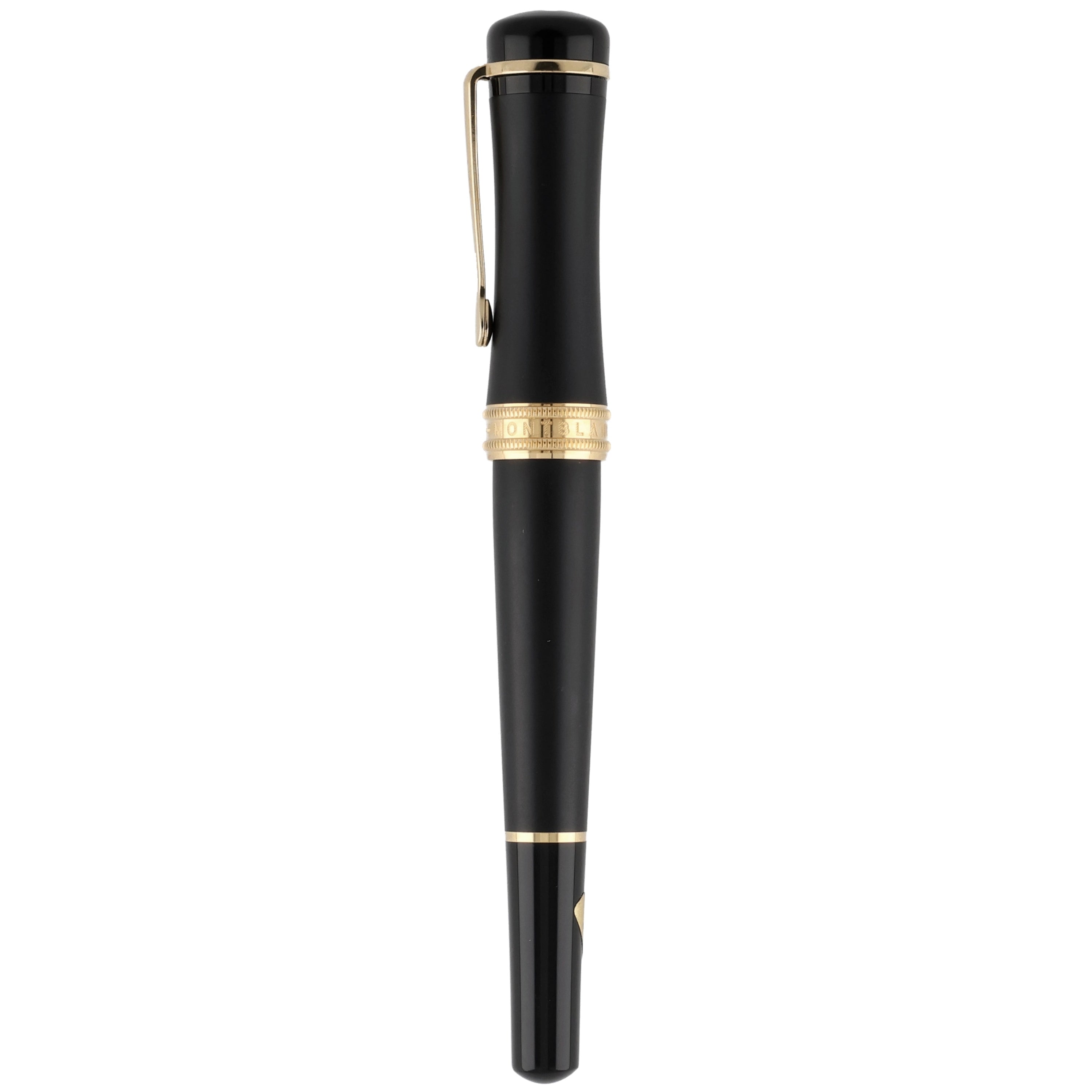 Dieses Schreibgerät überzeugt durch ein modernes und zugleich zeitlos elegantes Design aus hochwertigem schwarzem Edelharz. Kappe und Korpus sind an den Enden in hochglänzendem Edelharz ausgeführt, während der Mittelteil in mattem Schwarz gehalten ist und so einen spannenden Kontrast zwischen Glanz und Struktur schafft Vergoldete Details – wie der Clip und das Griffstück – verleihen dem Schreibgerät eine edle Note und vollenden das Gesamtbild.