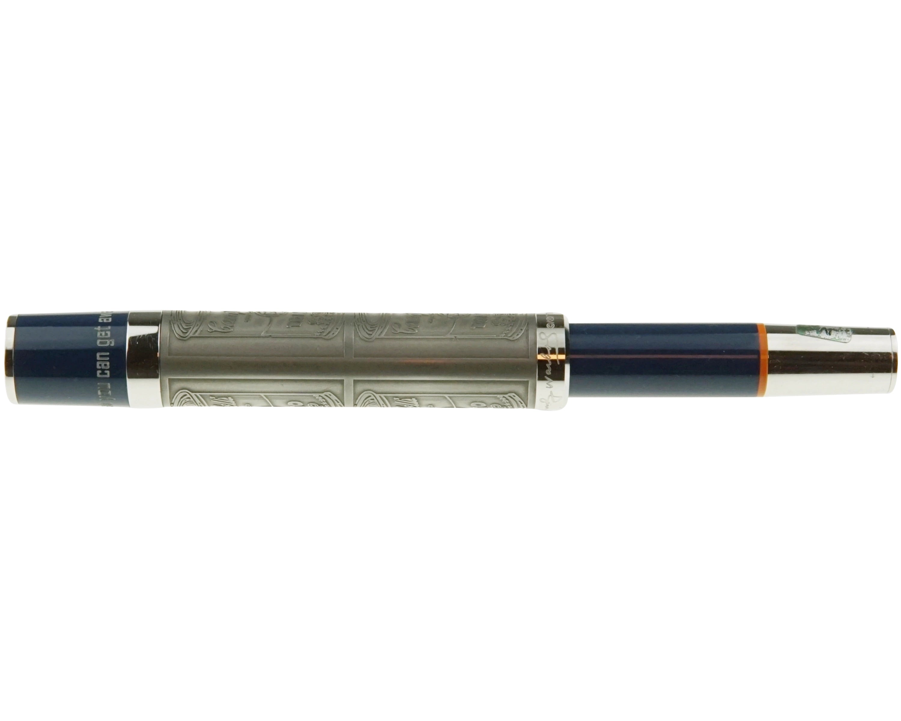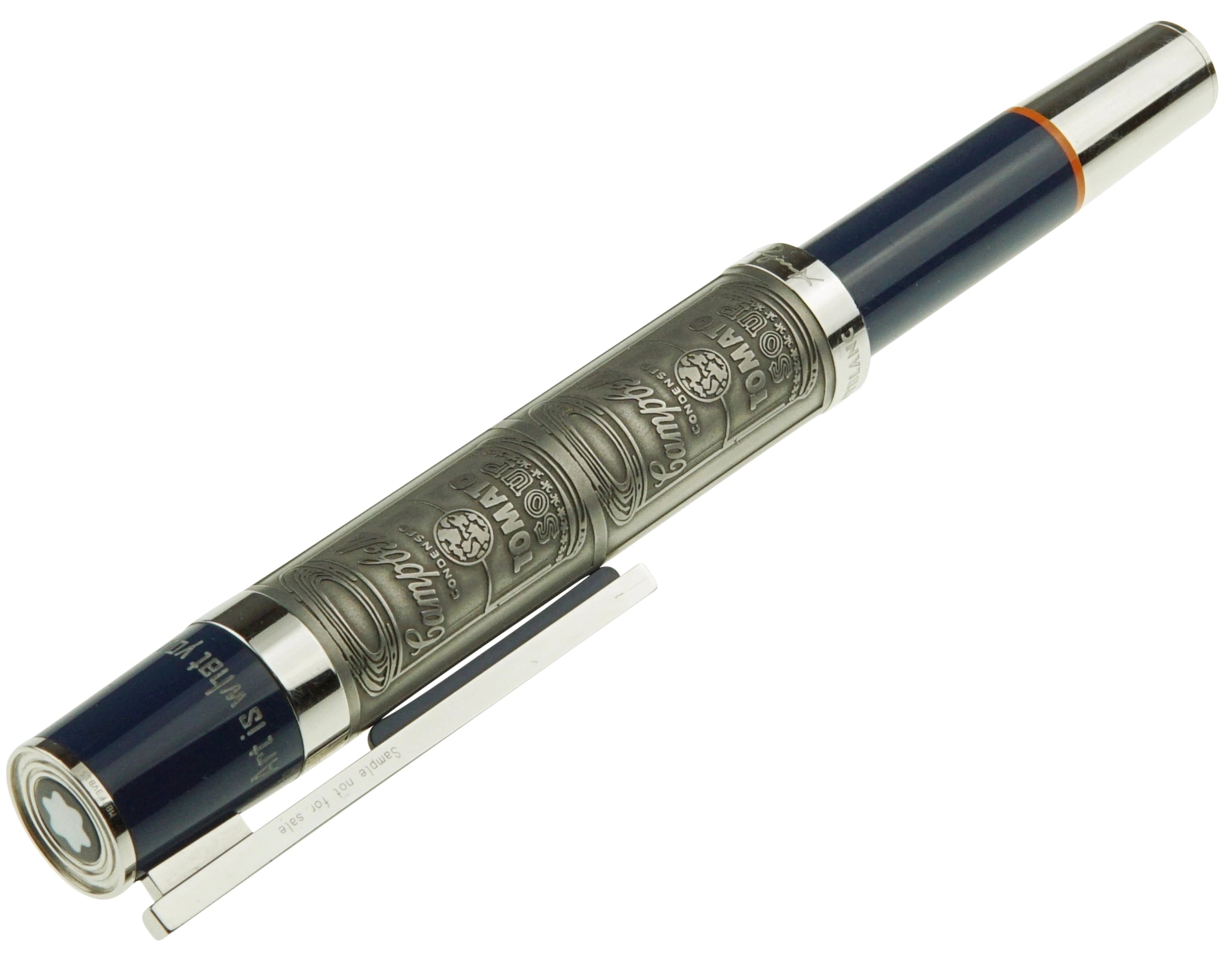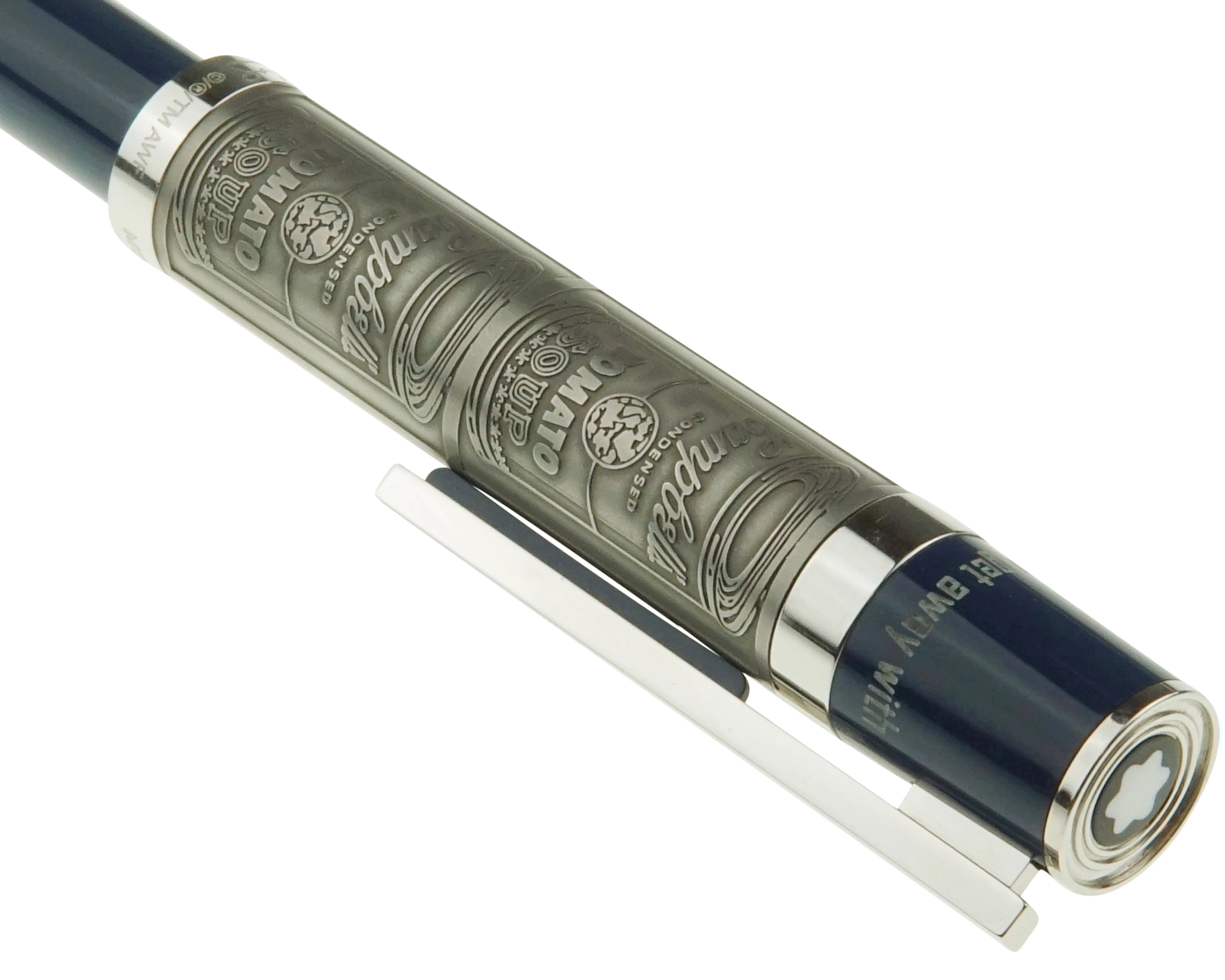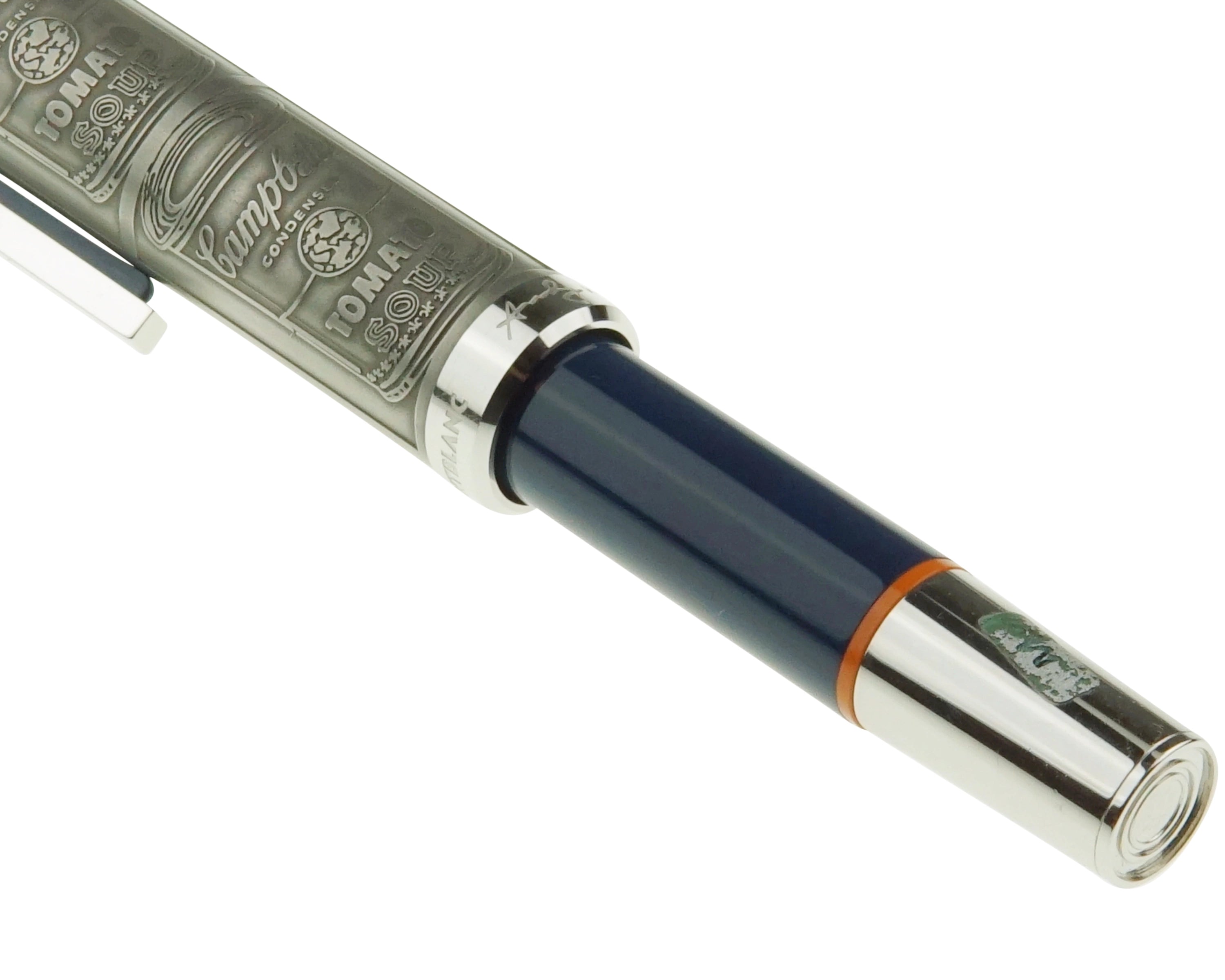 Der Korpus des Schreibgeräts besteht aus tiefblauem Edelharz, akzentuiert durch feine orangefarbene Ringe, die an Warhols ikonische „Campbell’s Soup“-Serie erinnern. Die Kappe aus poliertem Edelstahl ist mit kunstvollen Gravuren der berühmten Suppendosen versehen und verleiht dem Design seine unverkennbare Strahlkraft. Der Clip, inspiriert von Warhols Rakel aus der Siebdrucktechnik, setzt einen subtilen künstlerischen Akzent.