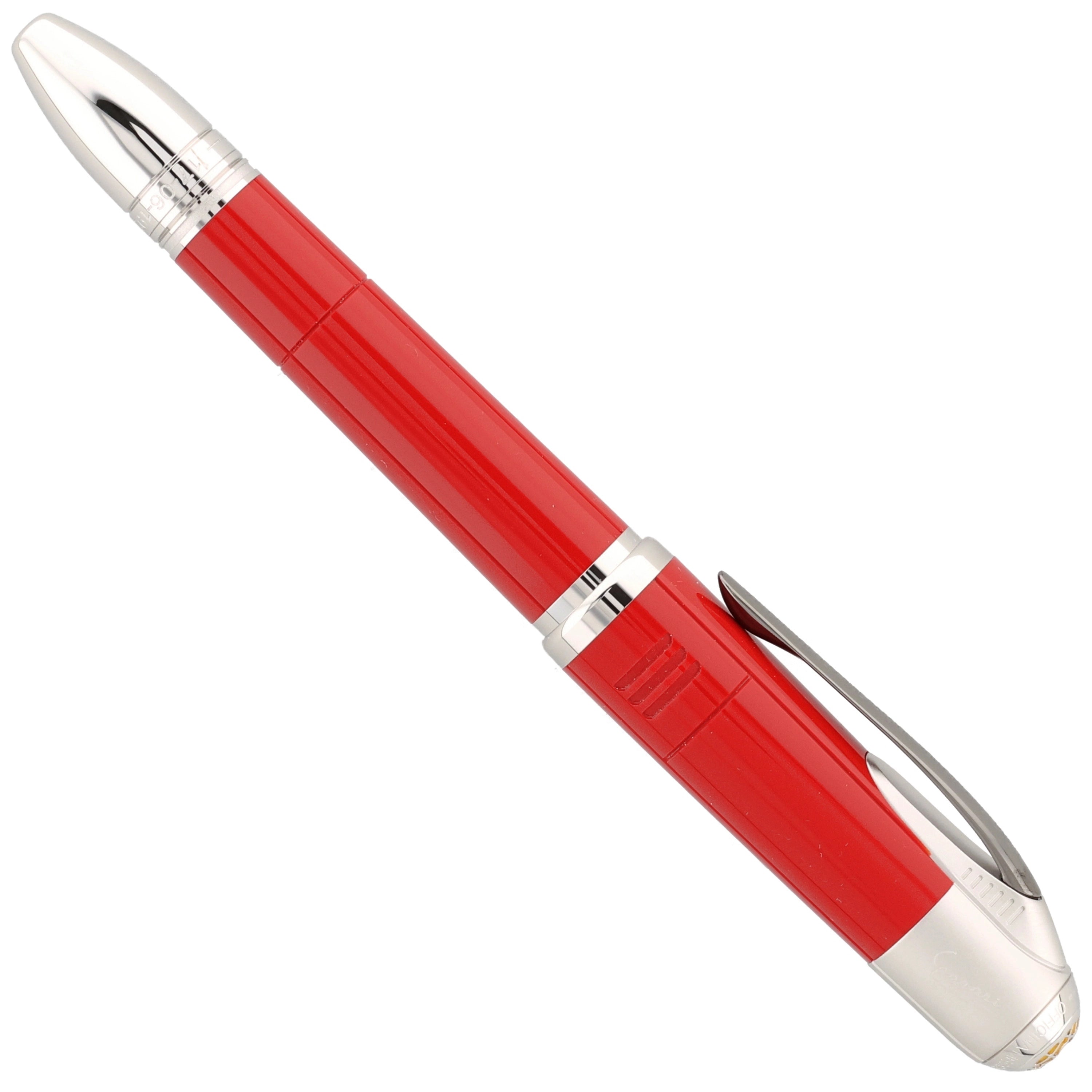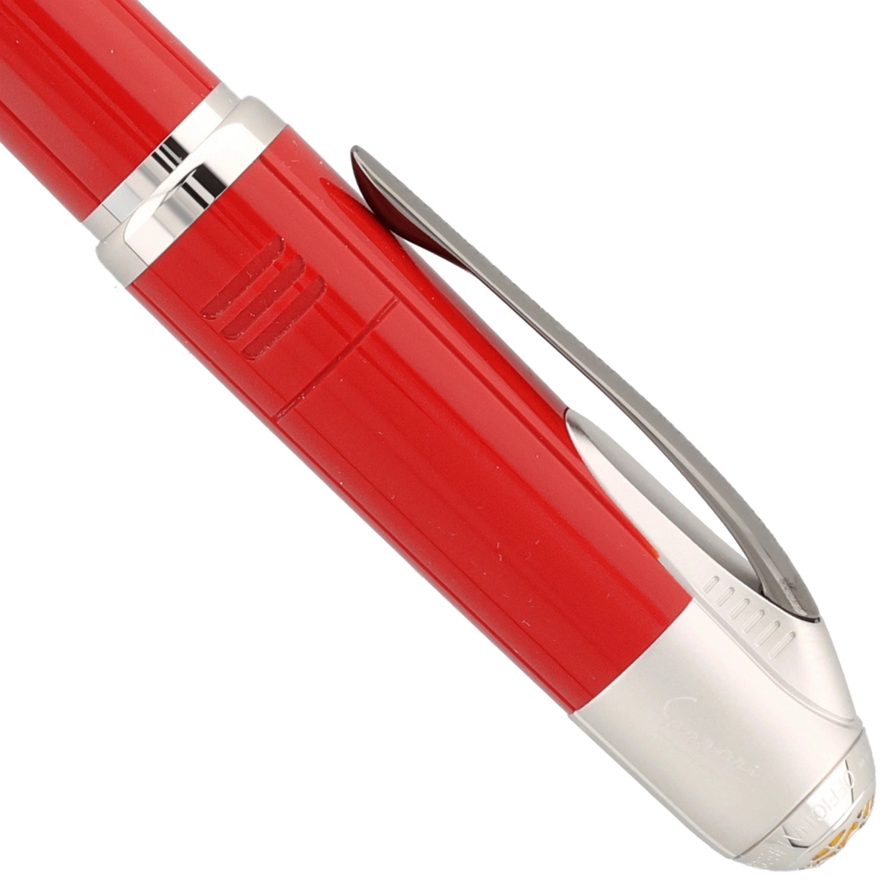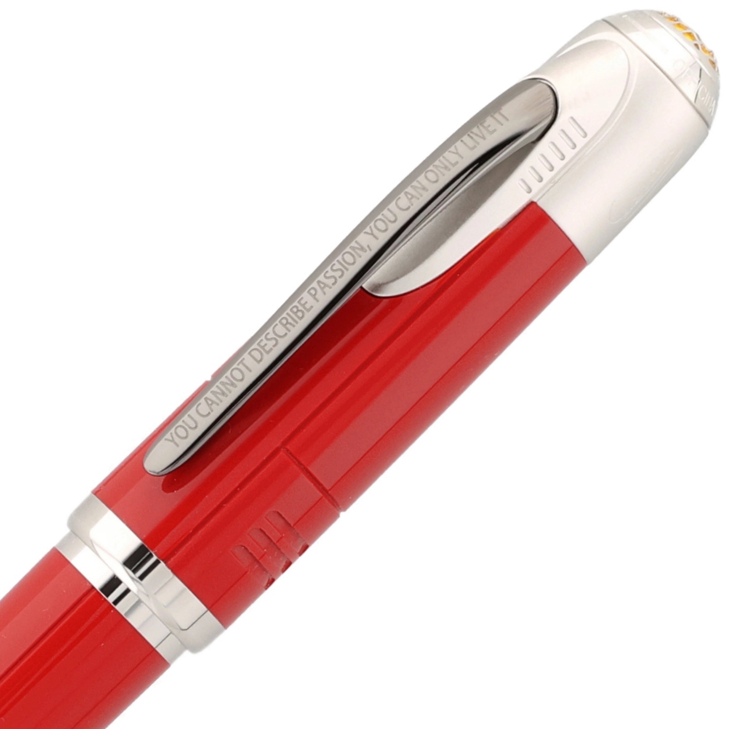 Das Schreibgerät kombiniert tiefrotes Edelharz mit platinbeschichteten Metallteilen zu einem eleganten Design, das klassische Ferrari-Farbatmosphäre ausstrahlt. Dezente, aber markante Details wie der Montblanc‑Stern auf gelbem Hintergrund und das Cavallino‑Rampante‑Emblem setzen ikonische Akzente, die den Motorsport‑Bezug unterstreichen. Die klare, sportlich‑edle Gestaltung verbindet hochwertige Materialien mit einer designstarken Hommage an Enzo Ferrari und seine legendäre Marke.