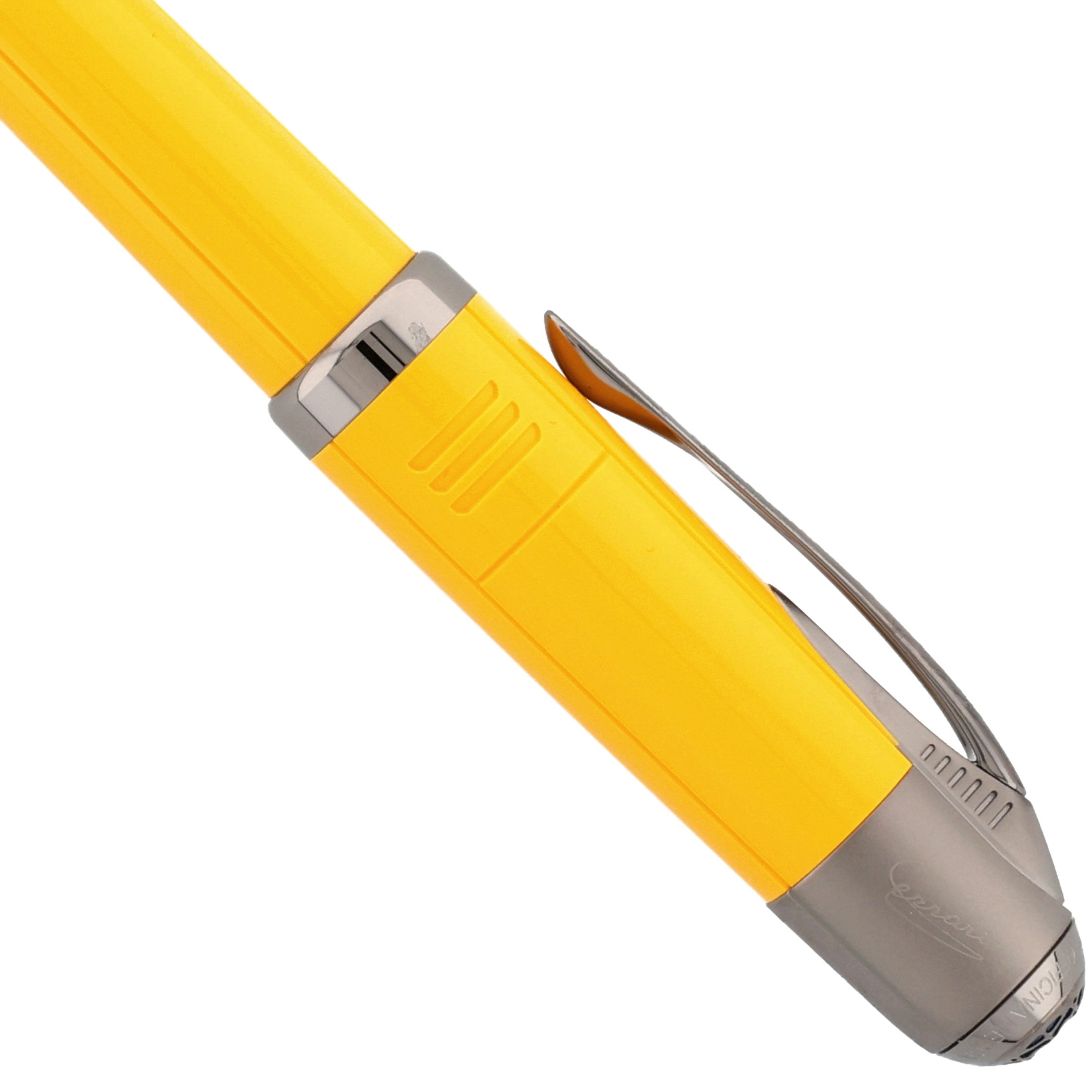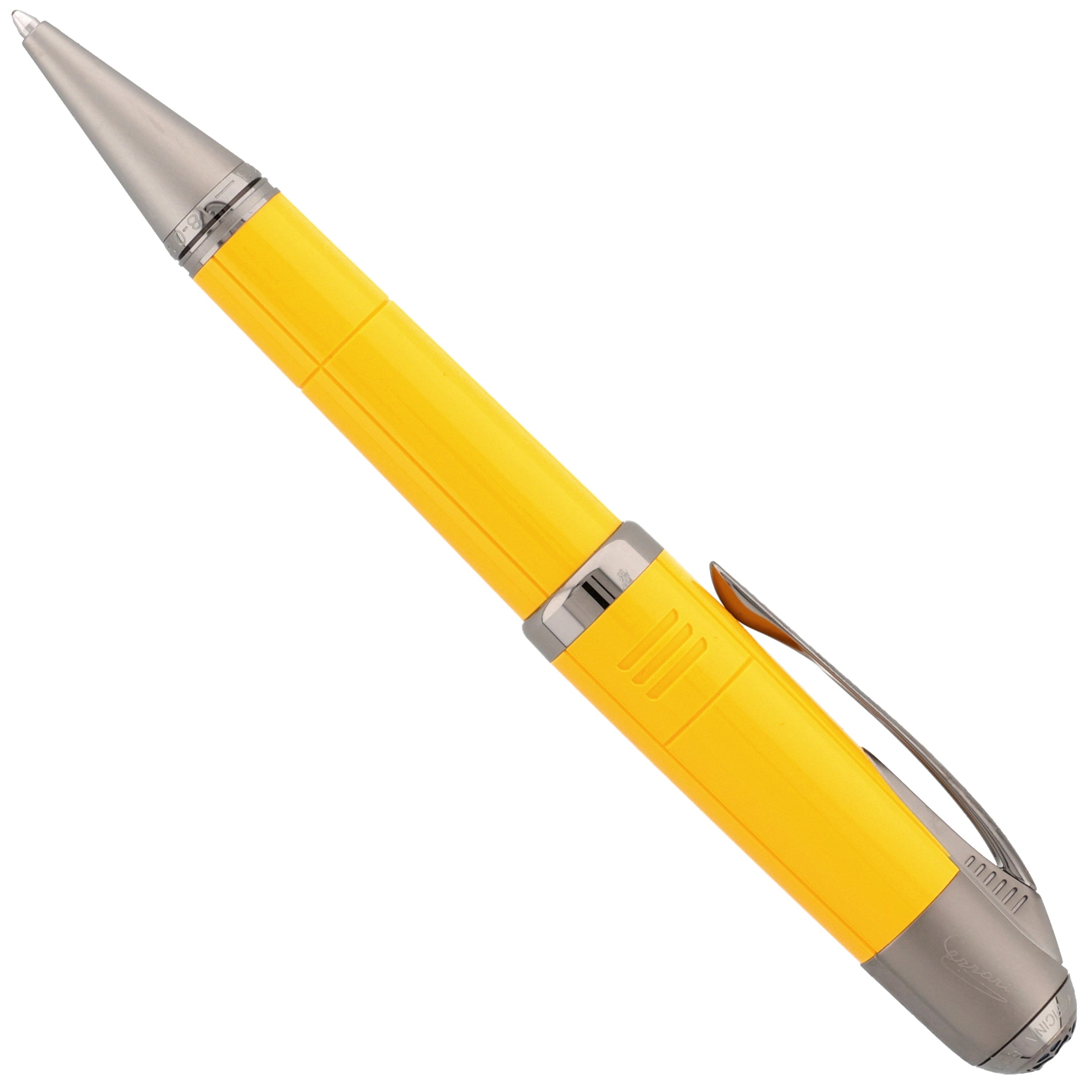 Der Schreiber verfügt über einen lebendig gelben Korpus aus hochwertigem Edelharz, inspiriert von der ikonischen Farbe „Giallo Modena“ aus Enzo Ferraris Heimatstadt und der Ferrari-Legende. Rutheniumbeschichtete Metallakzente und fein gravierte Details auf Korpus und Konus greifen historische Symbole aus Ferraris Leben und Motorsport-Tradition auf, darunter seine Signatur und Daten bedeutender Meilensteine. Das Montblanc-Emblem aus blauem Harz, eingefasst in ein Gittermotiv, sowie der Clip mit eingraviertem Ferrari-Zitat setzen elegante, charakterstarke Akzente.