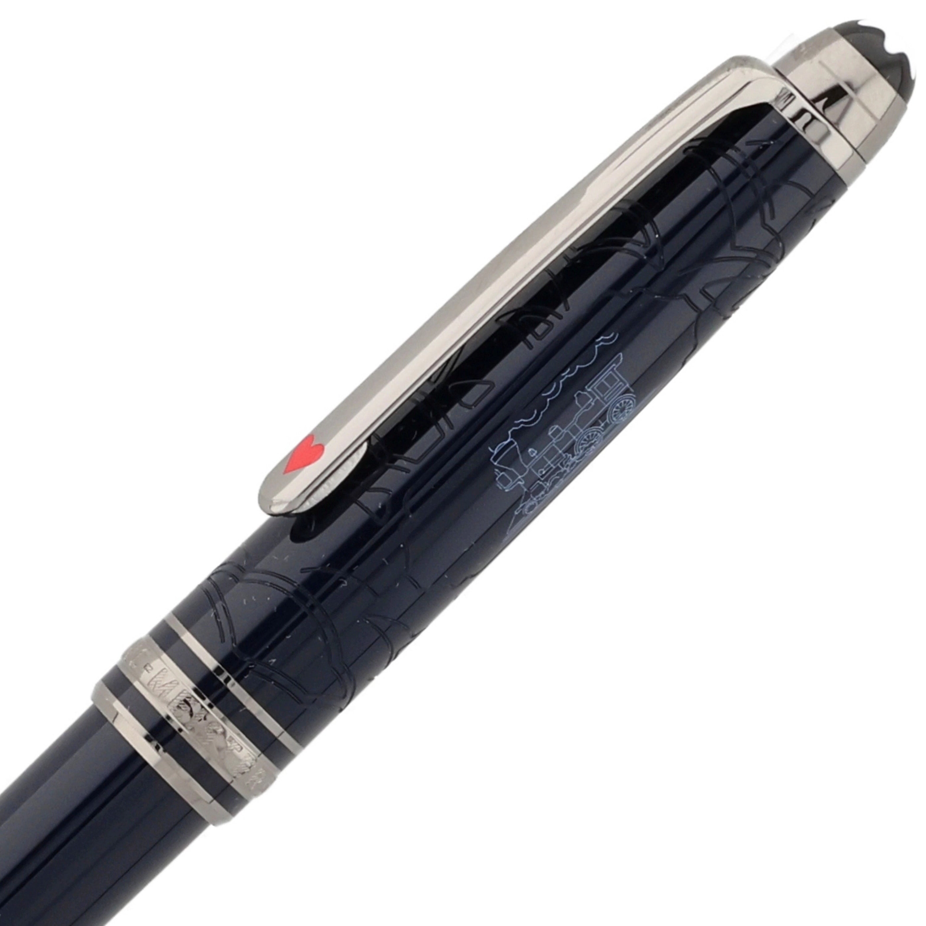 Gefertigt aus dunkelblauem Edelharz und veredelt mit rhodinierten Details, verbindet dieses Schreibgerät zeitlose Eleganz mit literarischer Inspiration. Die Kappe zeigt eine filigrane Gravur eines Zuges – Sinnbild für die letzte Etappe der Reise von Yokohama nach London. Auf dem Konus findet sich ein Sicherheitskettenmuster, das an einen dramatischen Moment während der Fahrt erinnert, während der Clip mit einem rot lackierten Herz die Verbindung zwischen Phileas Fogg und Prinzessin Aouda symbolisiert. Im Kappenkopf ist die Reisedauer verewigt, wodurch das Schreibgerät eine stilvolle Hommage an Jules Vernes Meisterwerk darstellt.