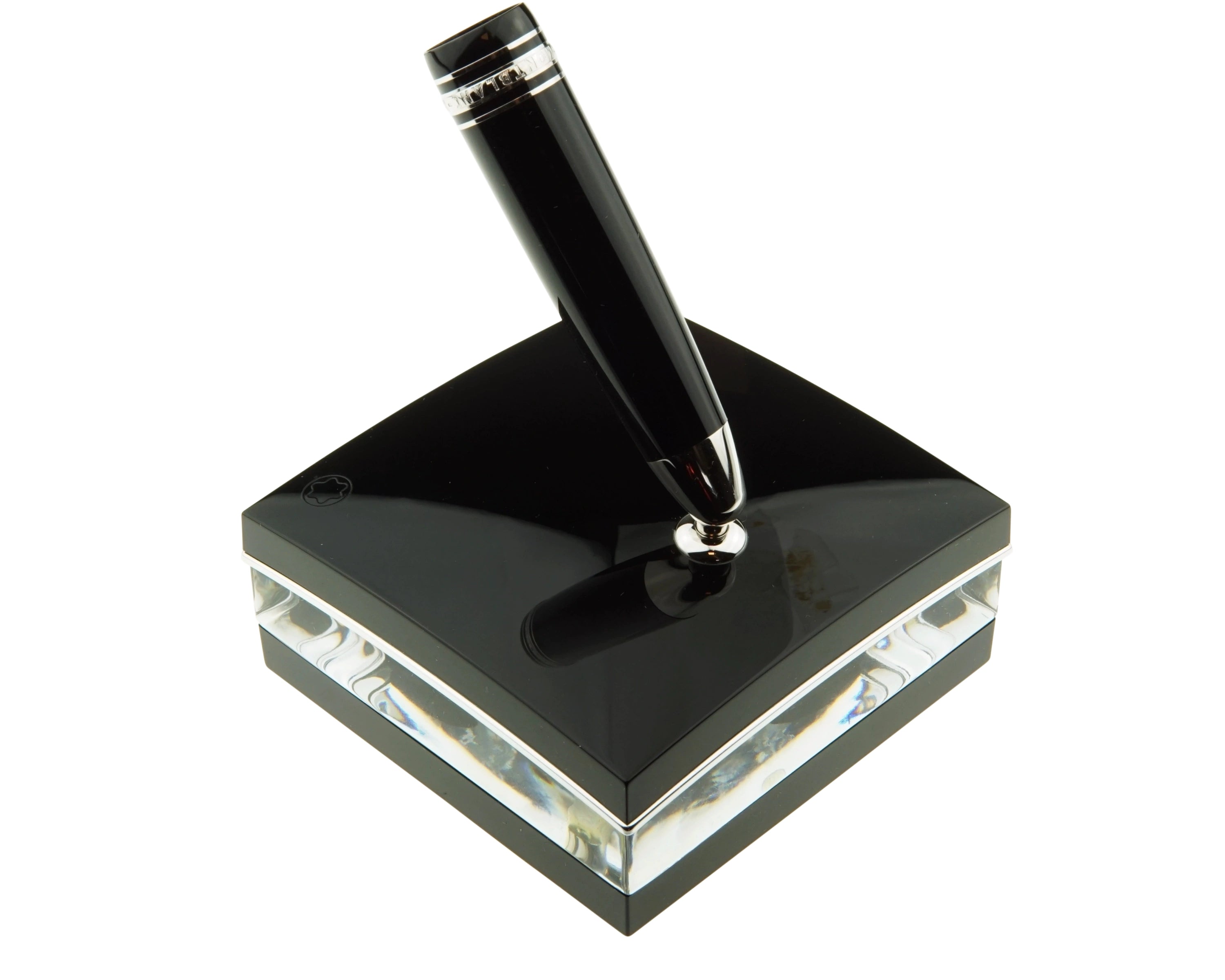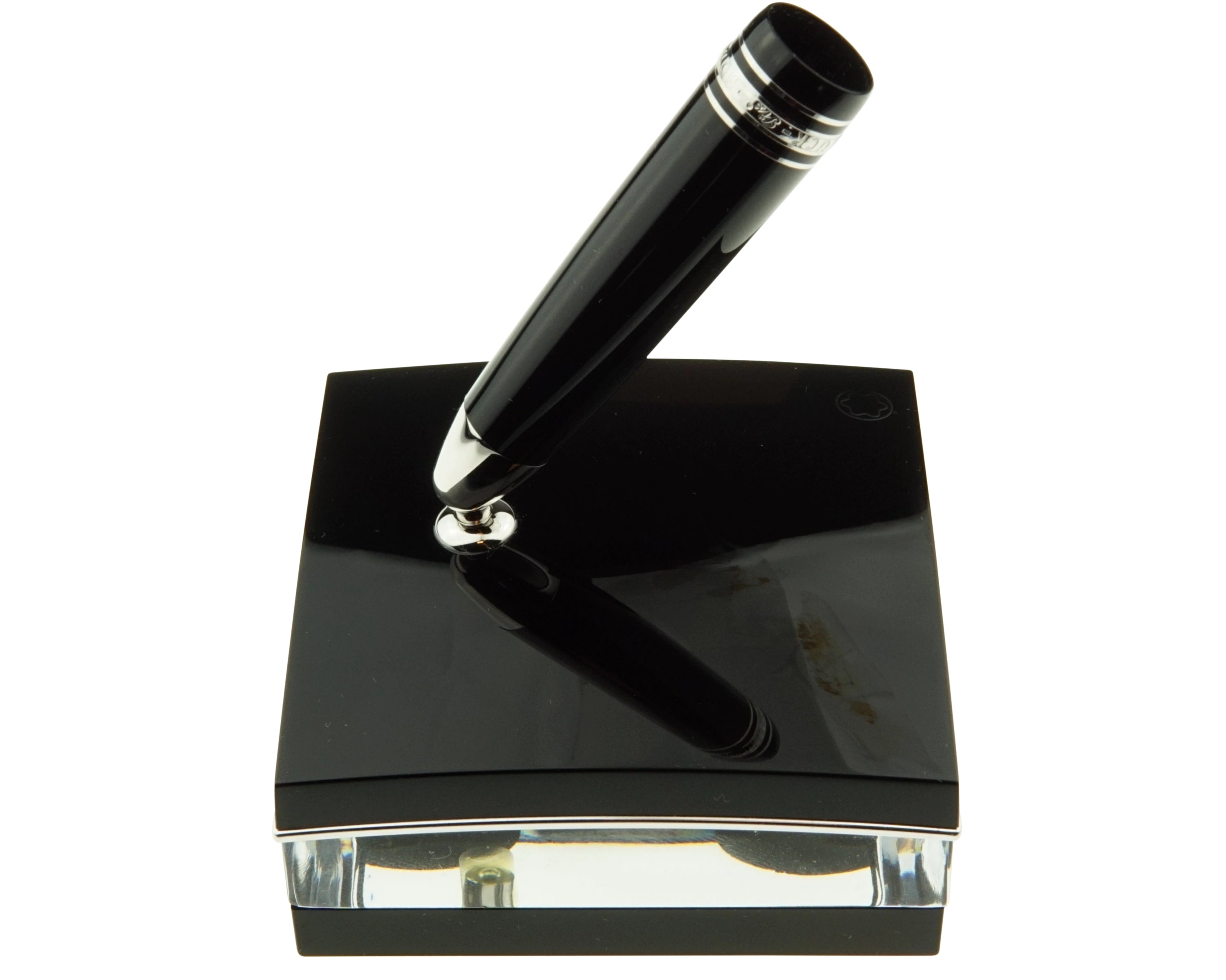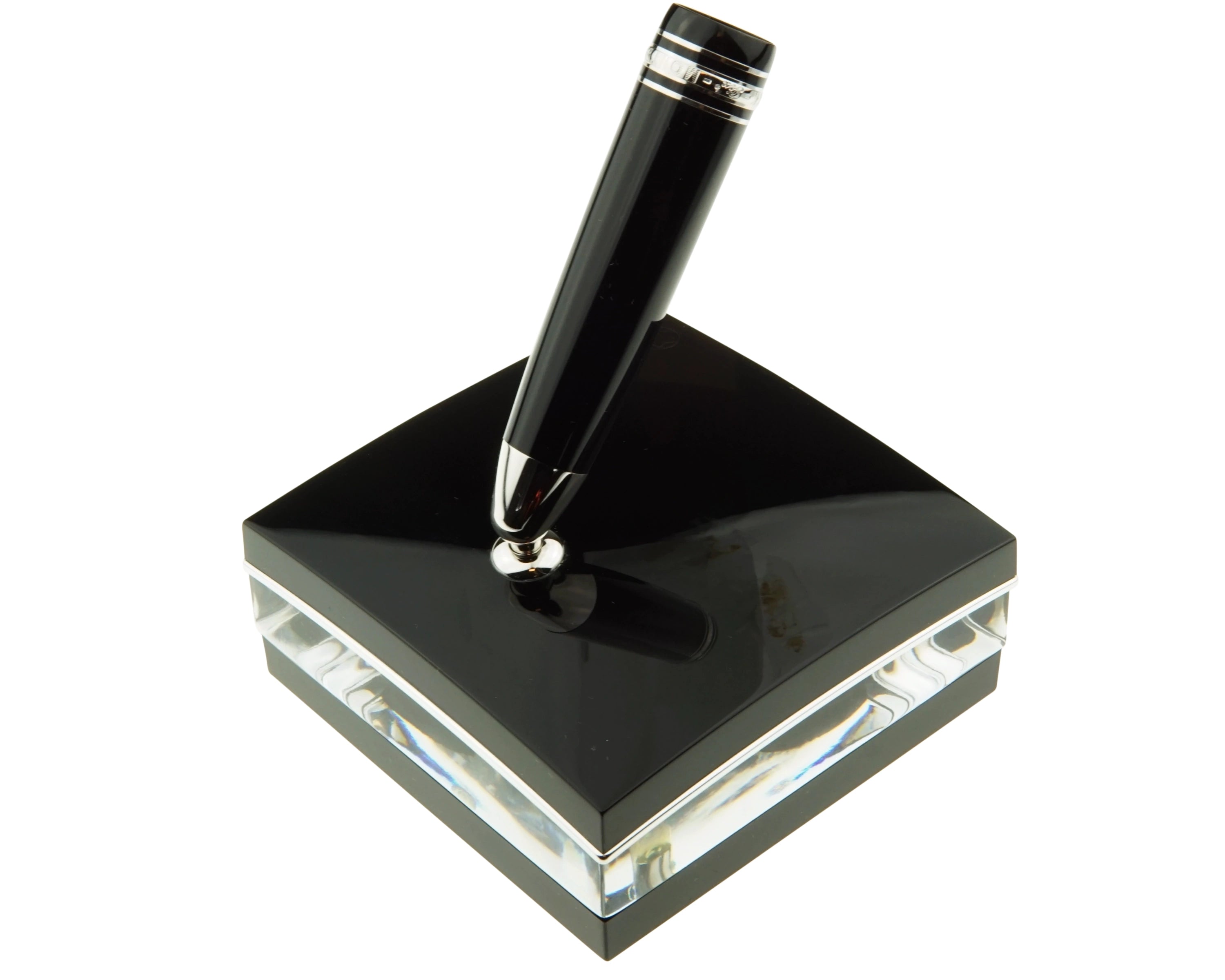 Gefertigt aus tiefschwarzem Edelharz und veredelt mit einem platinbeschichteten Akzent, verbindet dieser Pen Stand klassische Eleganz mit moderner Raffinesse. Das Fundament wird durch ein zentrales Element aus edlem Bleiglas ergänzt, das nicht nur einen tollen optischen Akzent setzt, sondern durch sein Gewicht auch ein spürbares haptisches Highlight bildet.