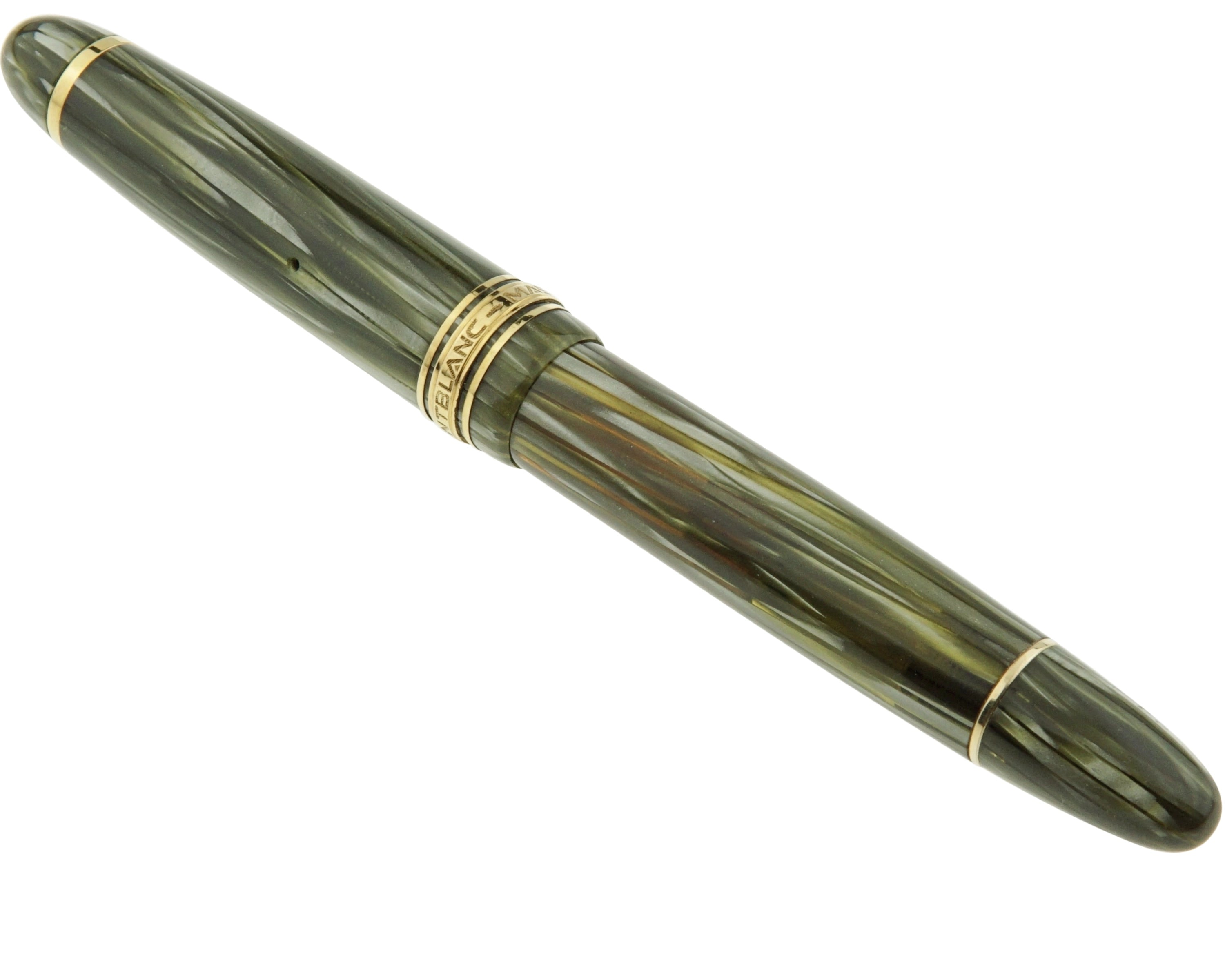 Gefertigt aus hochwertigem Zelluloid und veredelt mit vergoldeten Akzenten, verkörpert dieses Schreibgerät zeitlose Eleganz. Besonders hervorzuheben ist das grün gestreifte Design, das in jener Zeit eine Seltenheit war. Farbige Schreibgeräte waren damals rar, sodass heute nur noch wenige Exemplare existieren. Eine besondere Eigenschaft der Vintage-Modelle im Vergleich zu den heutigen Füllern ist der Kolbenmechanismus mit traditionellem Dichtkorken.