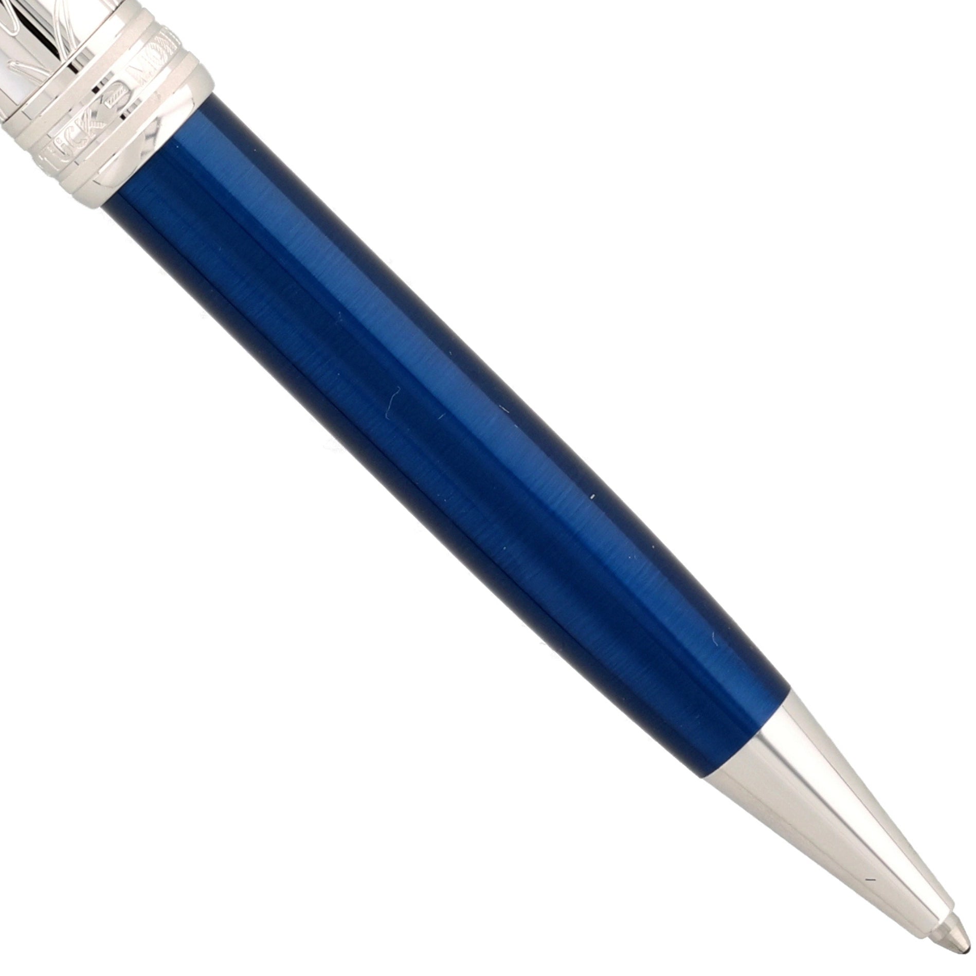 Der Schreiber präsentiert sich mit einem tiefblauen Korpus aus Edelharz, der an den Nachthimmel und die emotionale Tiefe der Geschichte von „Der kleine Prinz“ erinnert – Thema und Inspiration dieser Edition. Die platinierte Kappe ist mit einem fein gravierten Fuchsmotiv versehen, das einen zentralen Charakter der Erzählung aufgreift und dem Schreibgerät eine besondere erzählerische Dimension verleiht. Fein gearbeitete, platinierte Beschläge, inklusive des Clips mit gelb lackiertem Stern, setzen elegante Akzente und schaffen einen harmonischen, zugleich poetischen Gesamteindruck.