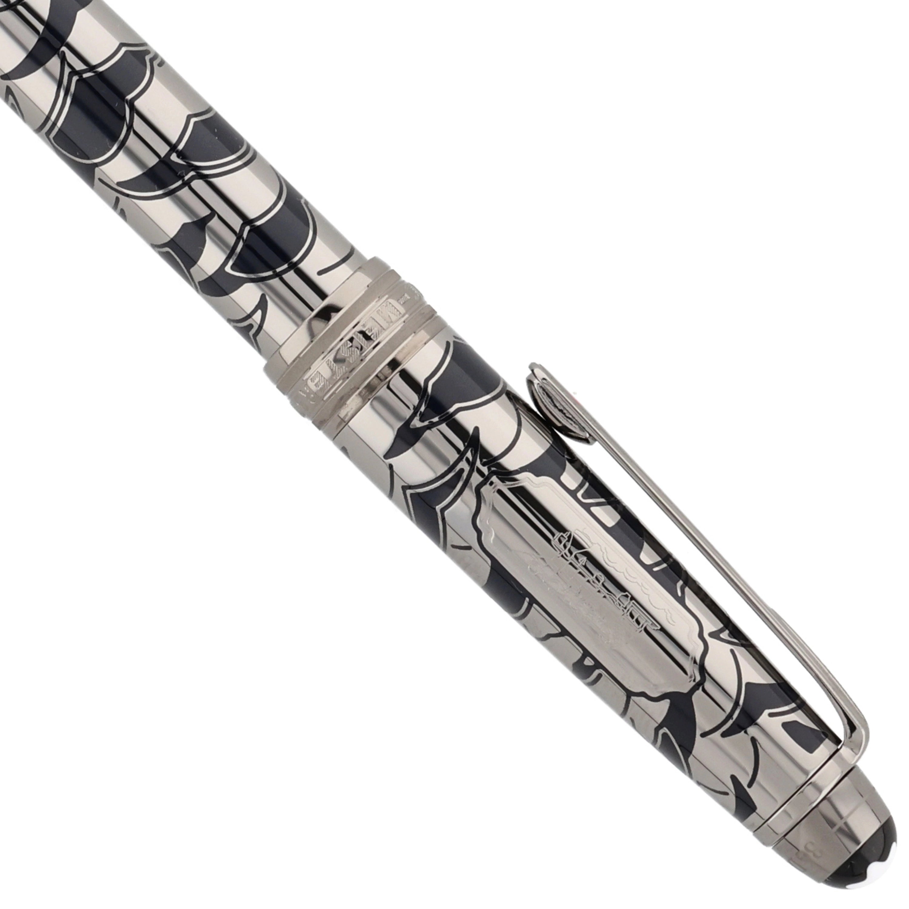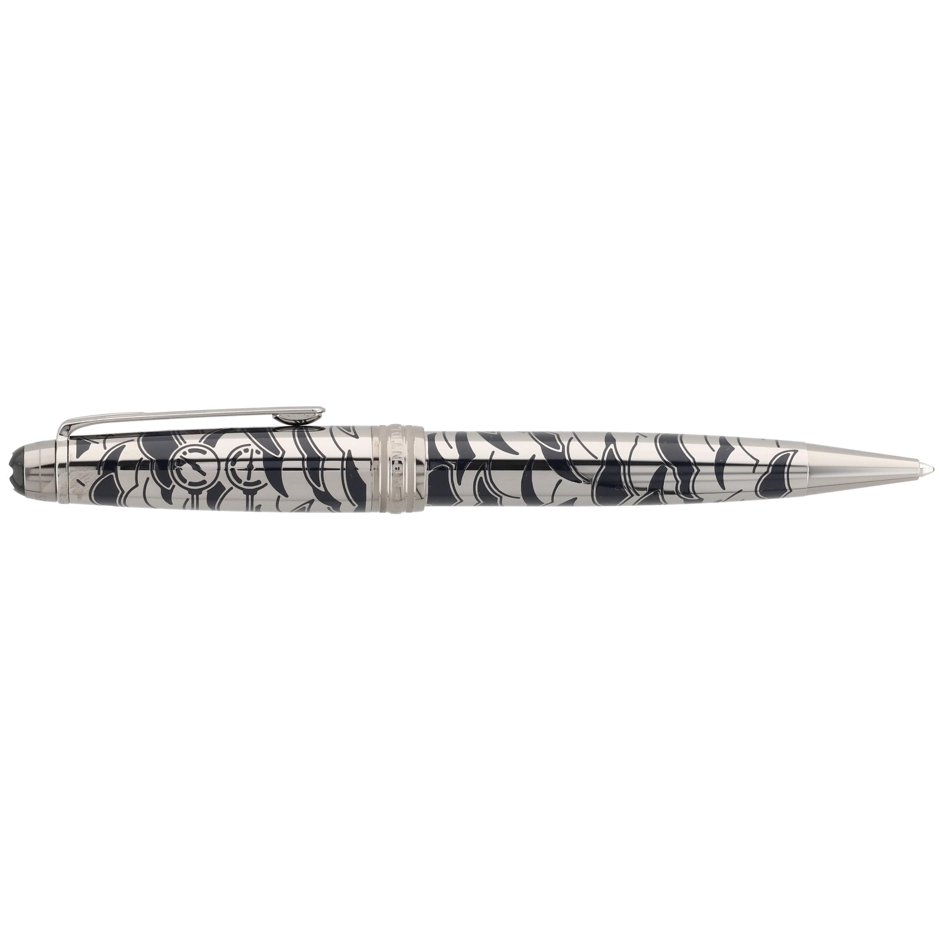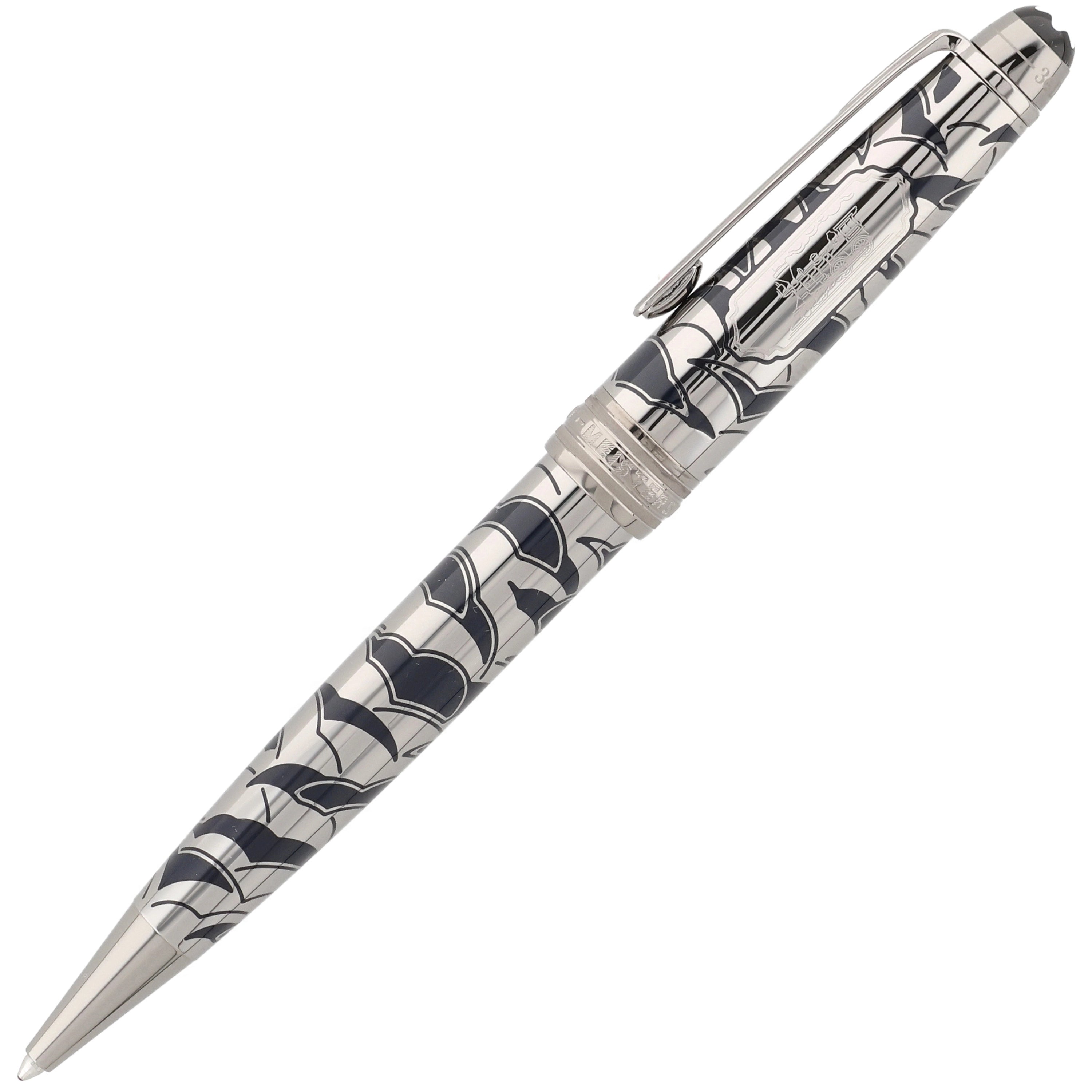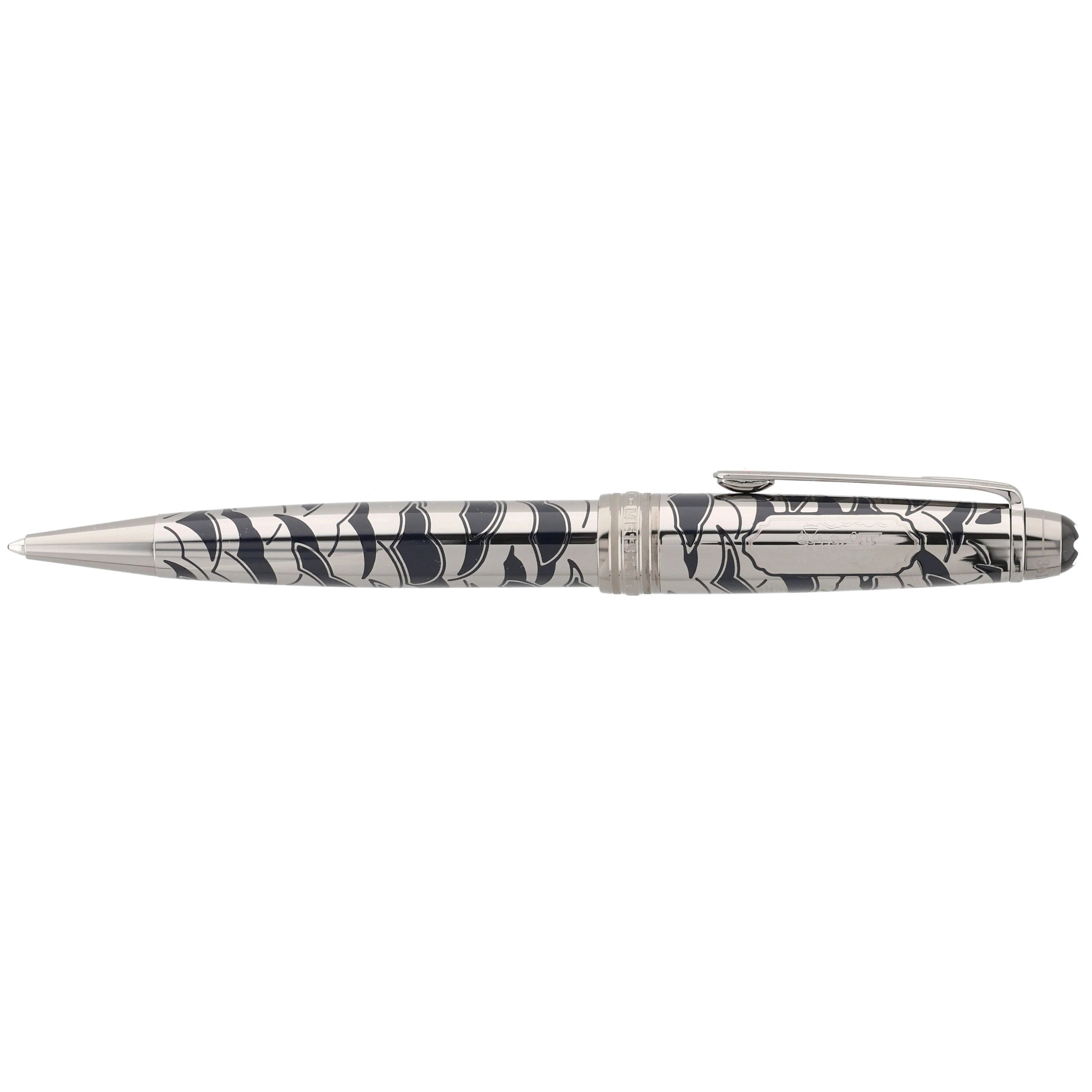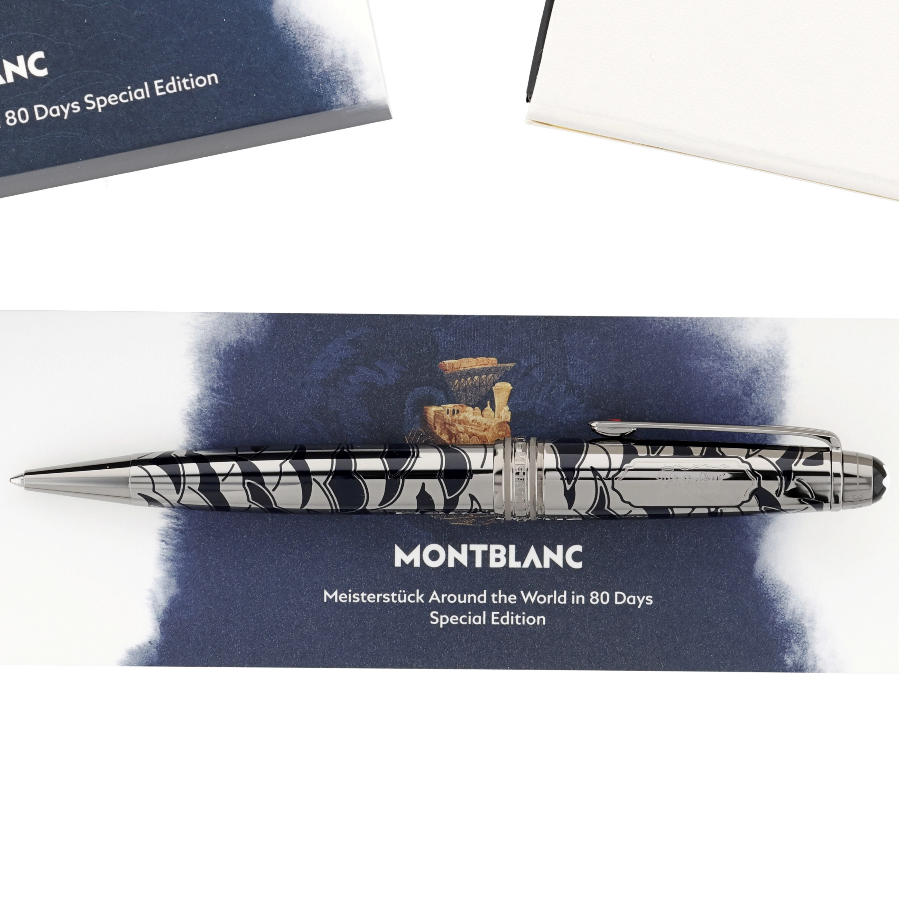 Das Schreibgerät überzeugt mit einem edlen Metallkorpus aus rutheniumbeschichtetem Edelstahl mit tiefblauer, strukturierter Lackoberfläche und feinem, maritim inspiriertem Muster. Der Clip ist mit einem rot lackierten Herz verziert, das die Verbindung zwischen Phileas Fogg und Prinzessin Aouda symbolisiert und thematisch zur Abenteuerreise passt. Fein ausgearbeitete Gravuren und weitere Designelemente, die an die letzte Etappe von Phileas Foggs Reise erinnern, verleihen dem Schreibgerät erzählerische Tiefe und elegante Dynamik, während platinierte Beschläge und das ikonische Montblanc‑Emblem das harmonische Design stilvoll abrunden.