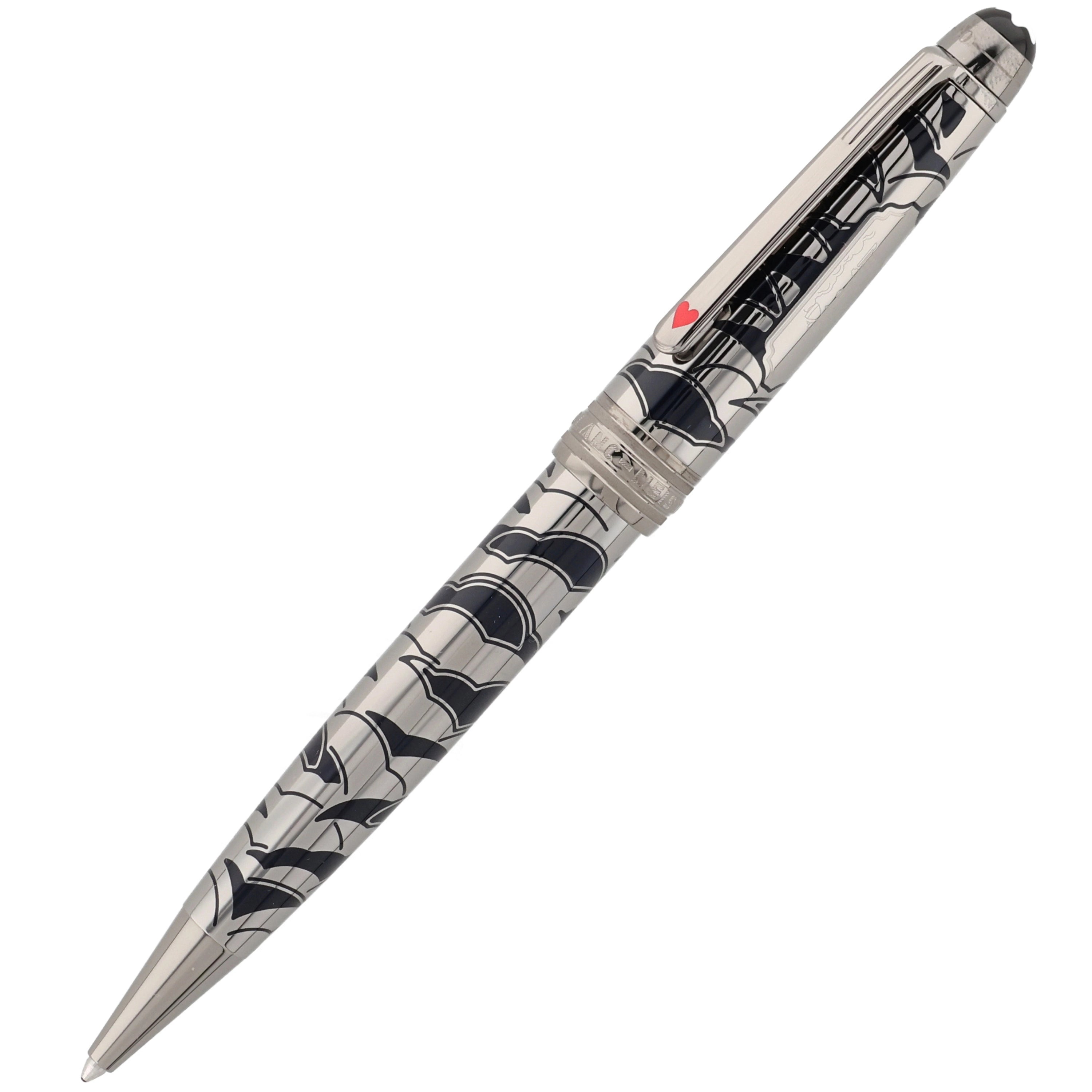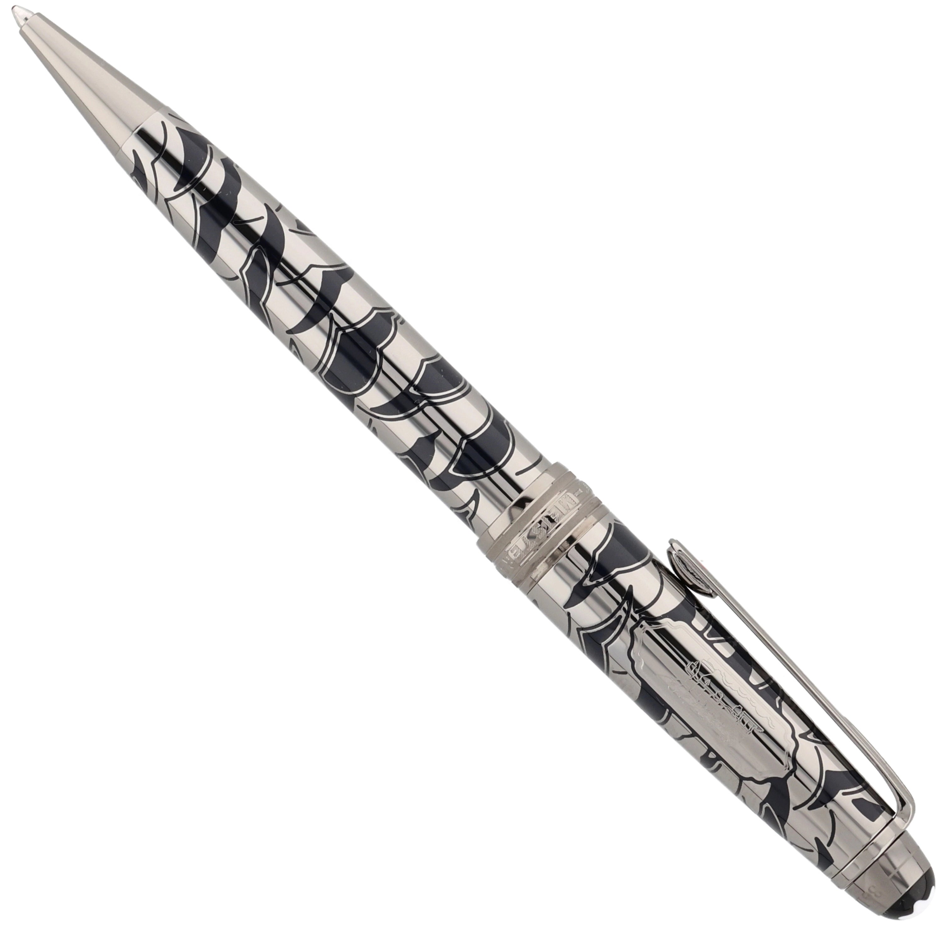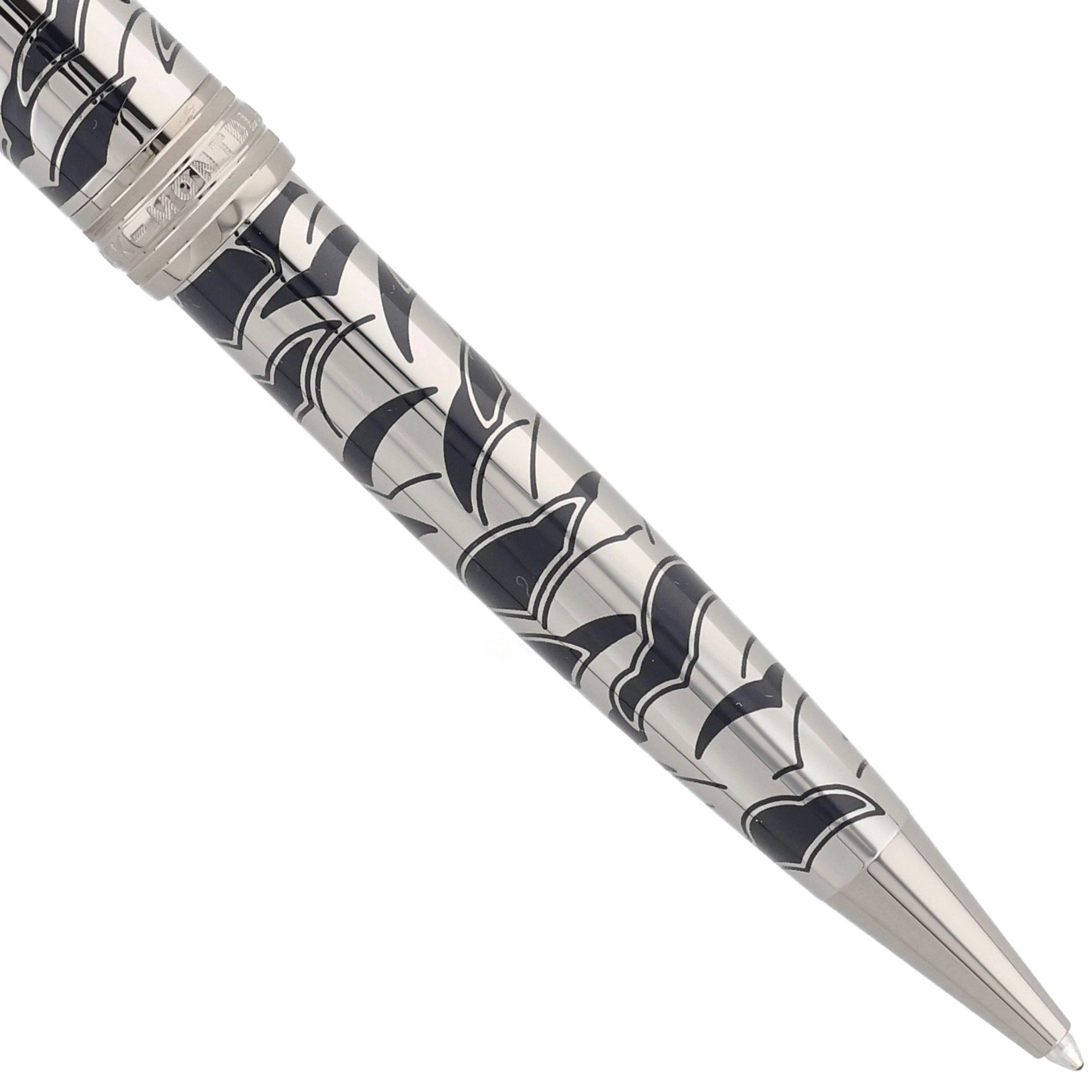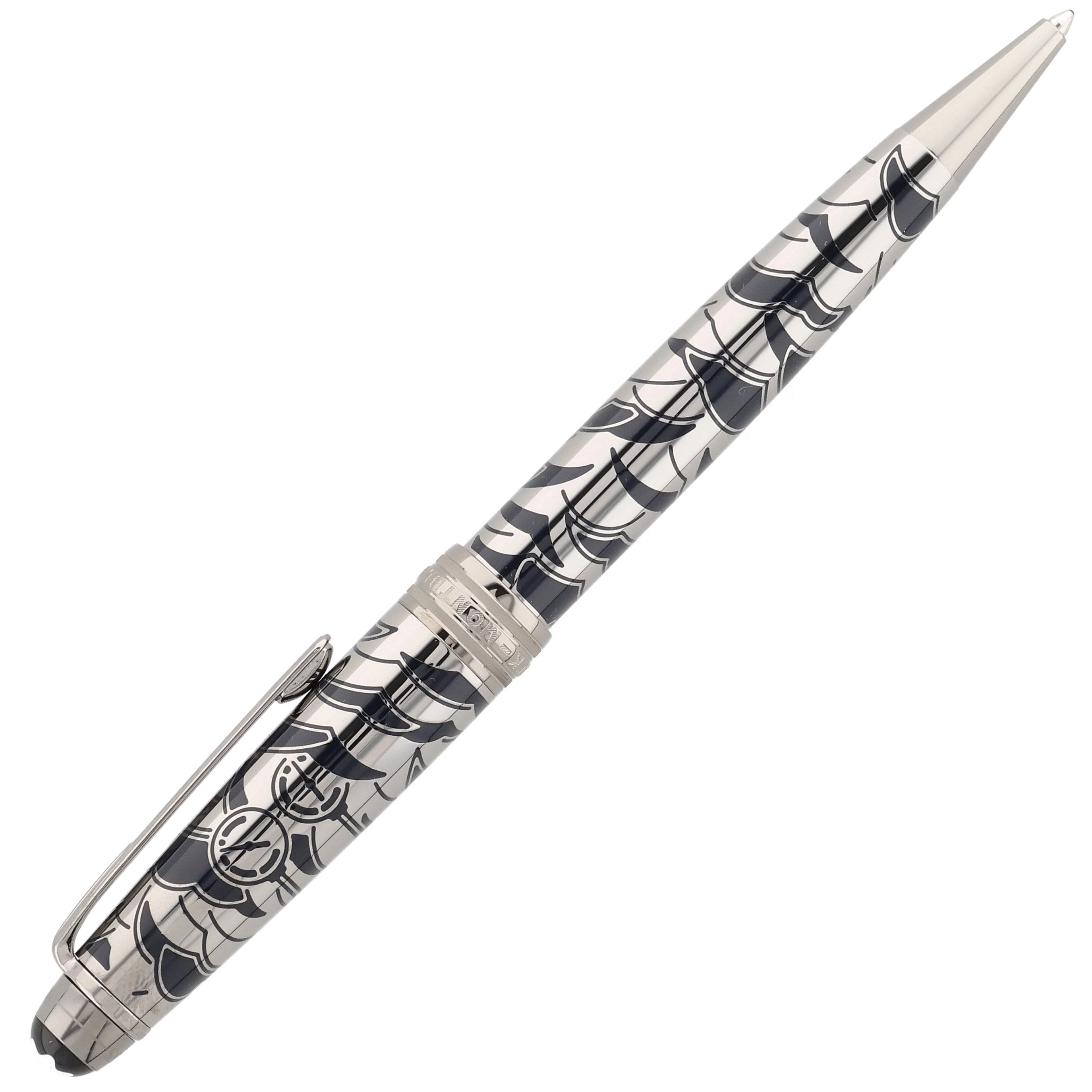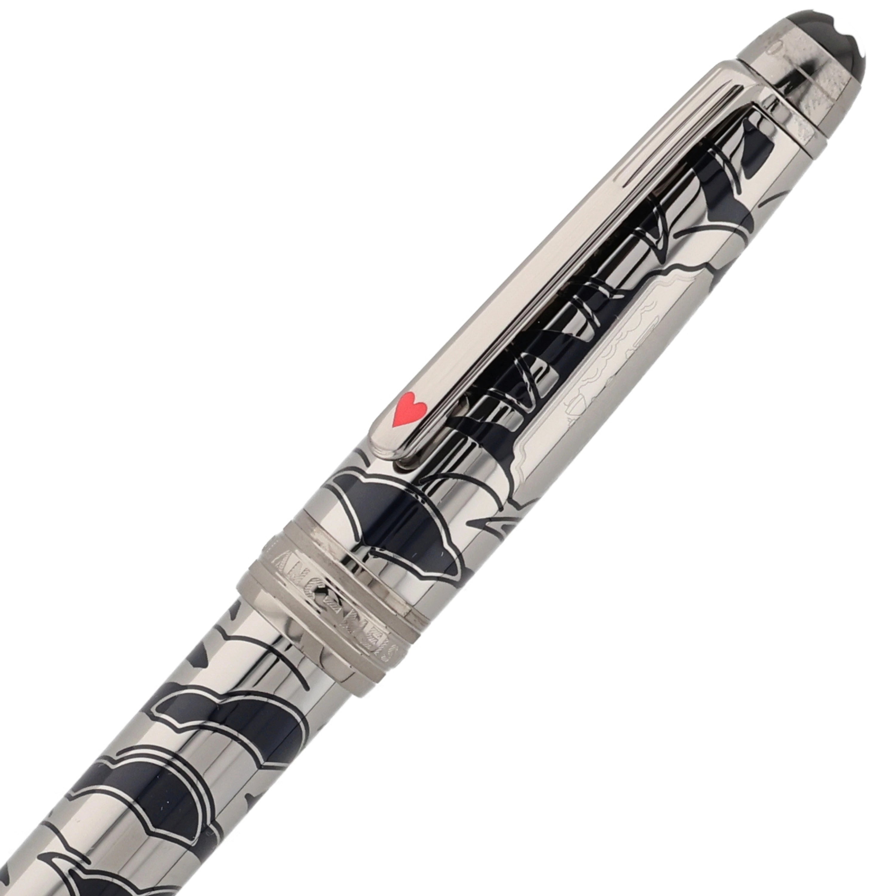 Das Schreibgerät überzeugt mit einem edlen Metallkorpus aus rutheniumbeschichtetem Edelstahl mit tiefblauer, strukturierter Lackoberfläche und feinem, maritim inspiriertem Muster. Der Clip ist mit einem rot lackierten Herz verziert, das die Verbindung zwischen Phileas Fogg und Prinzessin Aouda symbolisiert und thematisch zur Abenteuerreise passt. Fein ausgearbeitete Gravuren und weitere Designelemente, die an die letzte Etappe von Phileas Foggs Reise erinnern, verleihen dem Schreibgerät erzählerische Tiefe und elegante Dynamik, während platinierte Beschläge und das ikonische Montblanc‑Emblem das harmonische Design stilvoll abrunden.