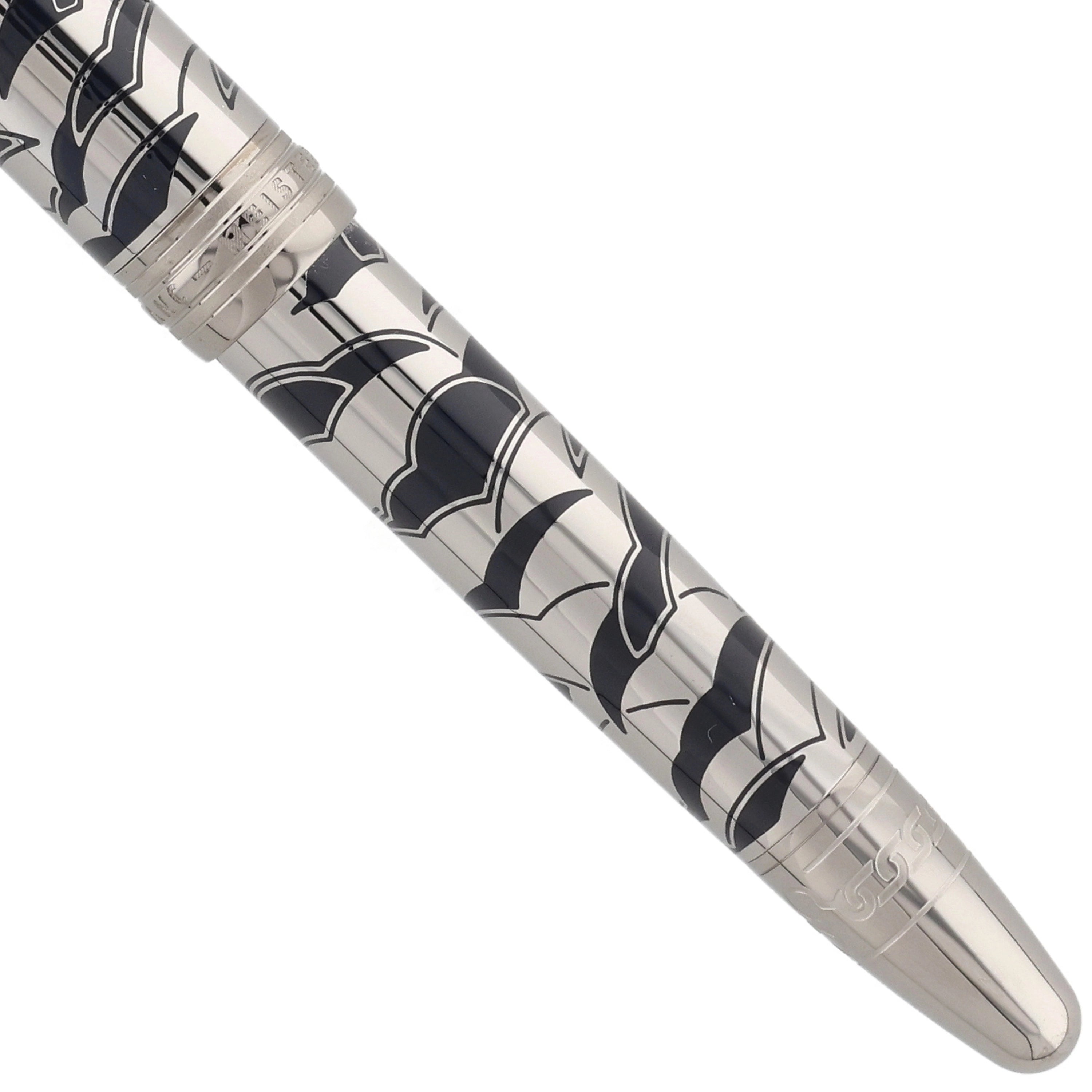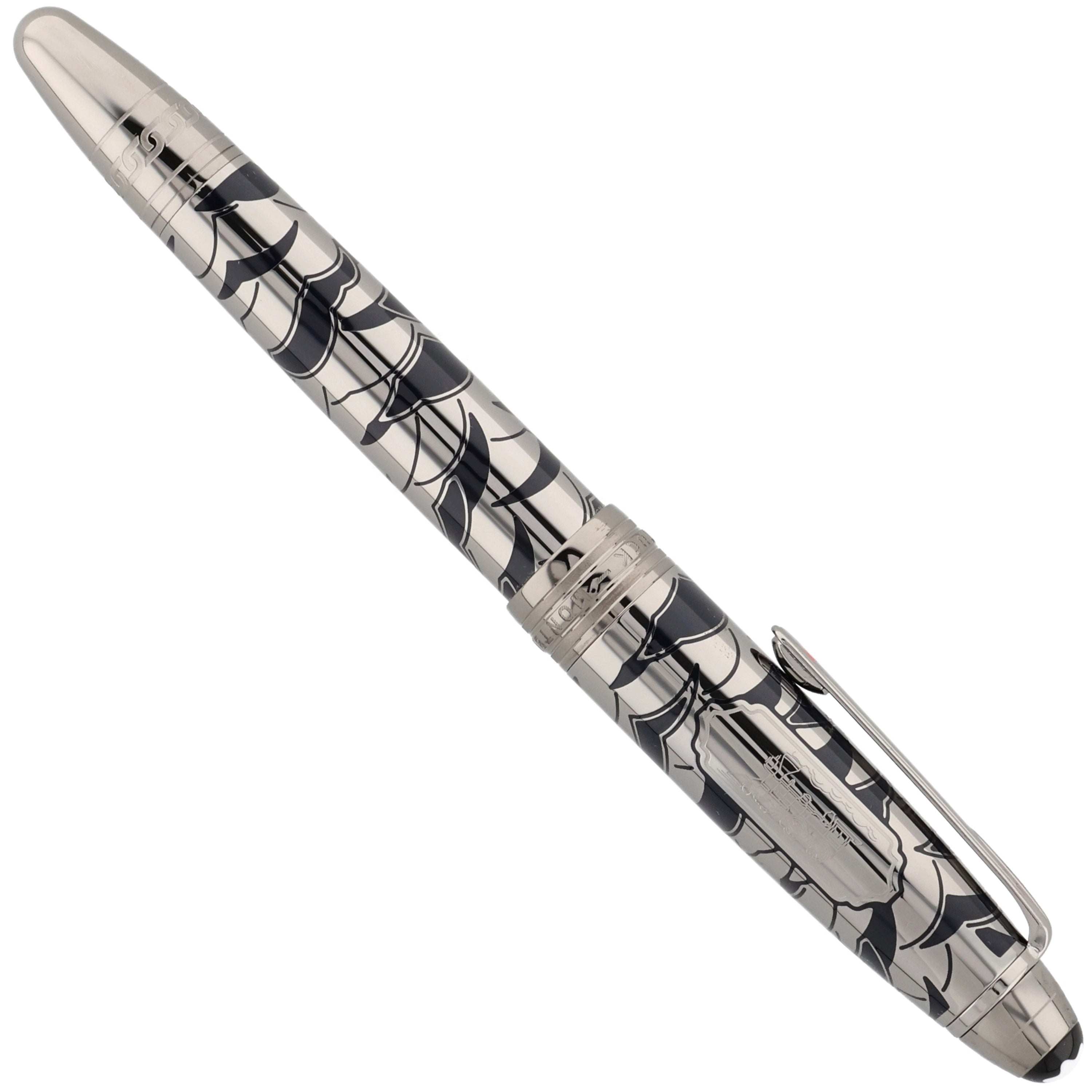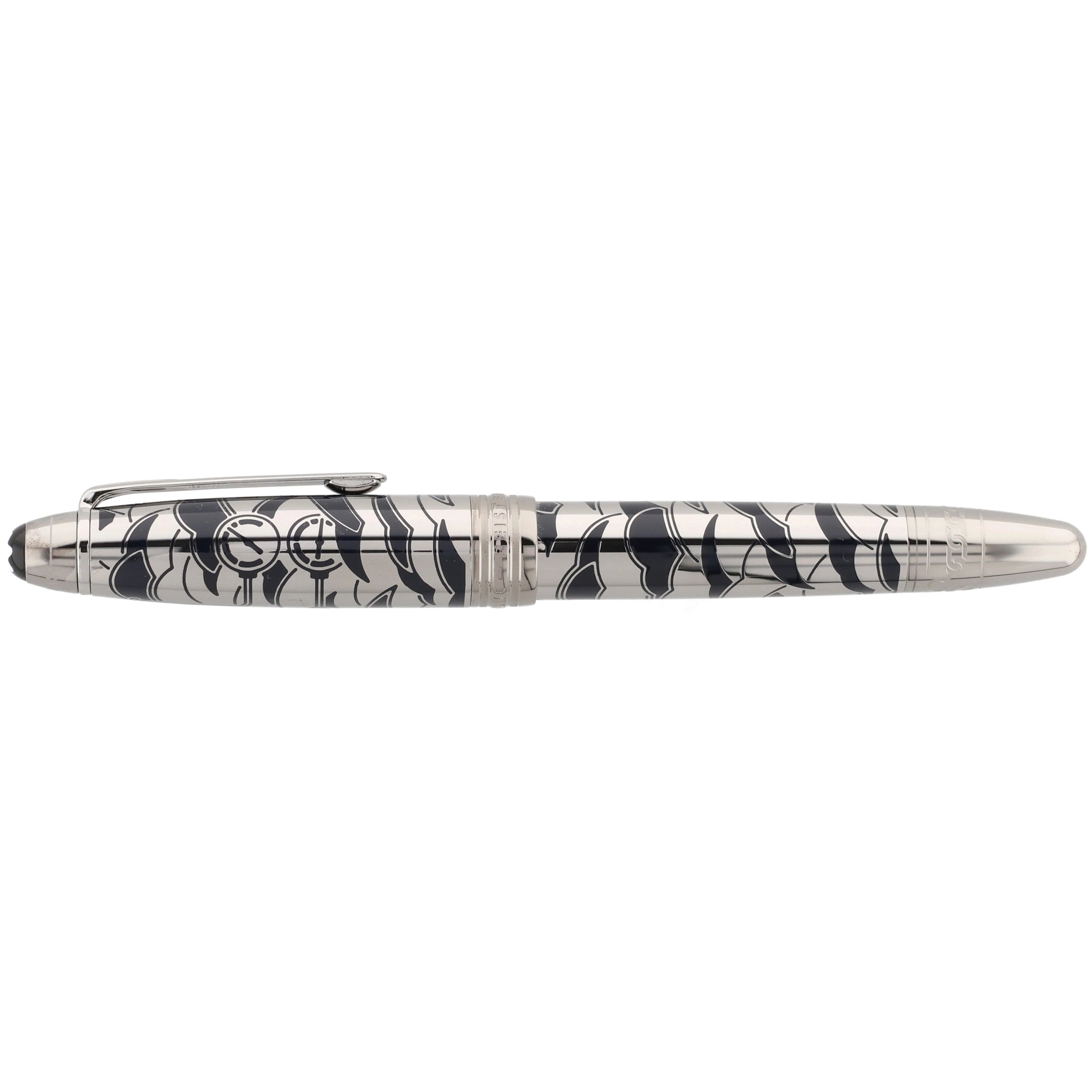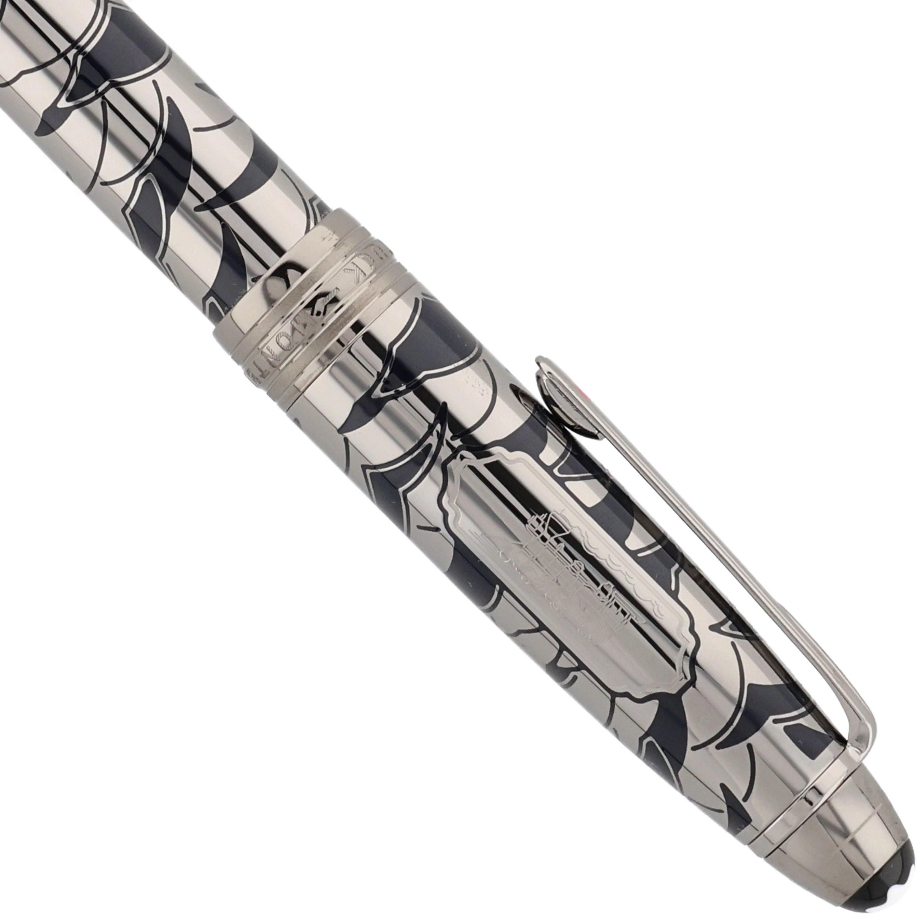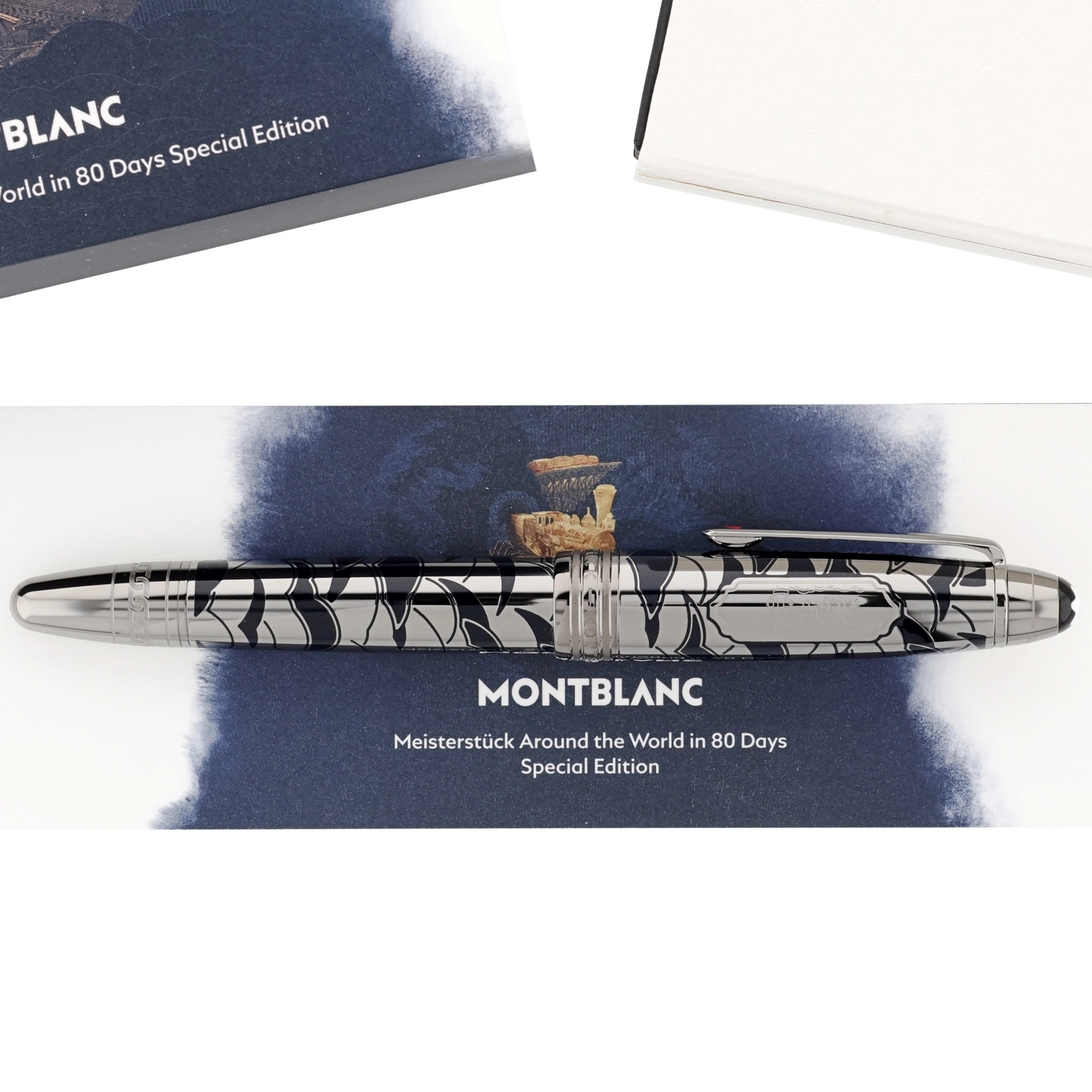 Das Schreibgerät überzeugt mit einem edlen Metallkorpus und einer Kappe aus rutheniumbeschichtetem Edelstahl mit tiefblauer, strukturierter Lackoberfläche und feinem, maritim inspiriertem Muster. Der Clip ist mit einem rot lackierten Herz verziert, das die Verbindung zwischen Phileas Fogg und Prinzessin Aouda symbolisiert und thematisch zur Abenteuerreise passt. Fein ausgearbeitete Gravuren und weitere Designelemente, die an die letzte Etappe von Phileas Foggs Reise erinnern, verleihen dem Schreibgerät erzählerische Tiefe und elegante Dynamik, während platinierte Beschläge und das ikonische Montblanc‑Emblem das harmonische Design stilvoll abrunden.