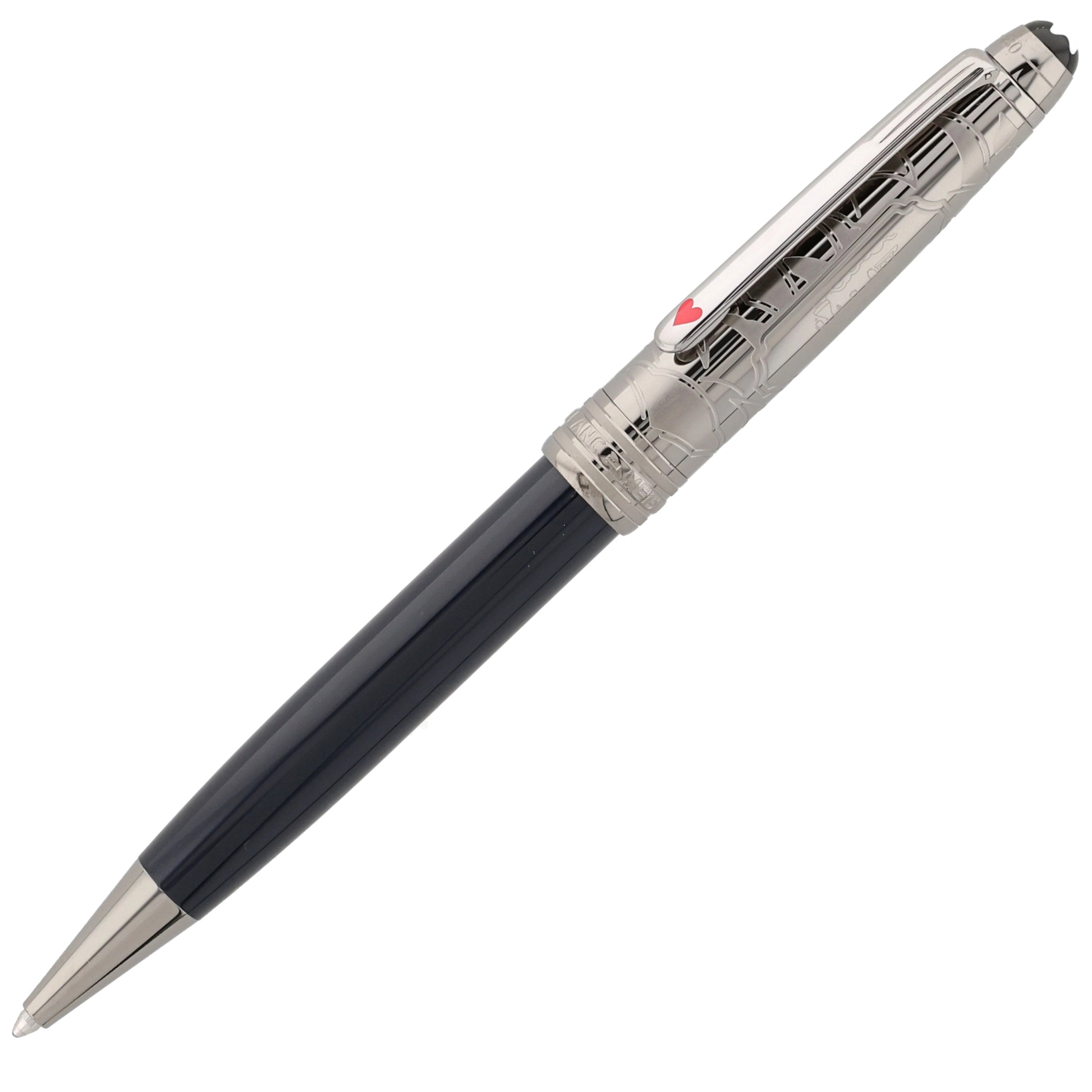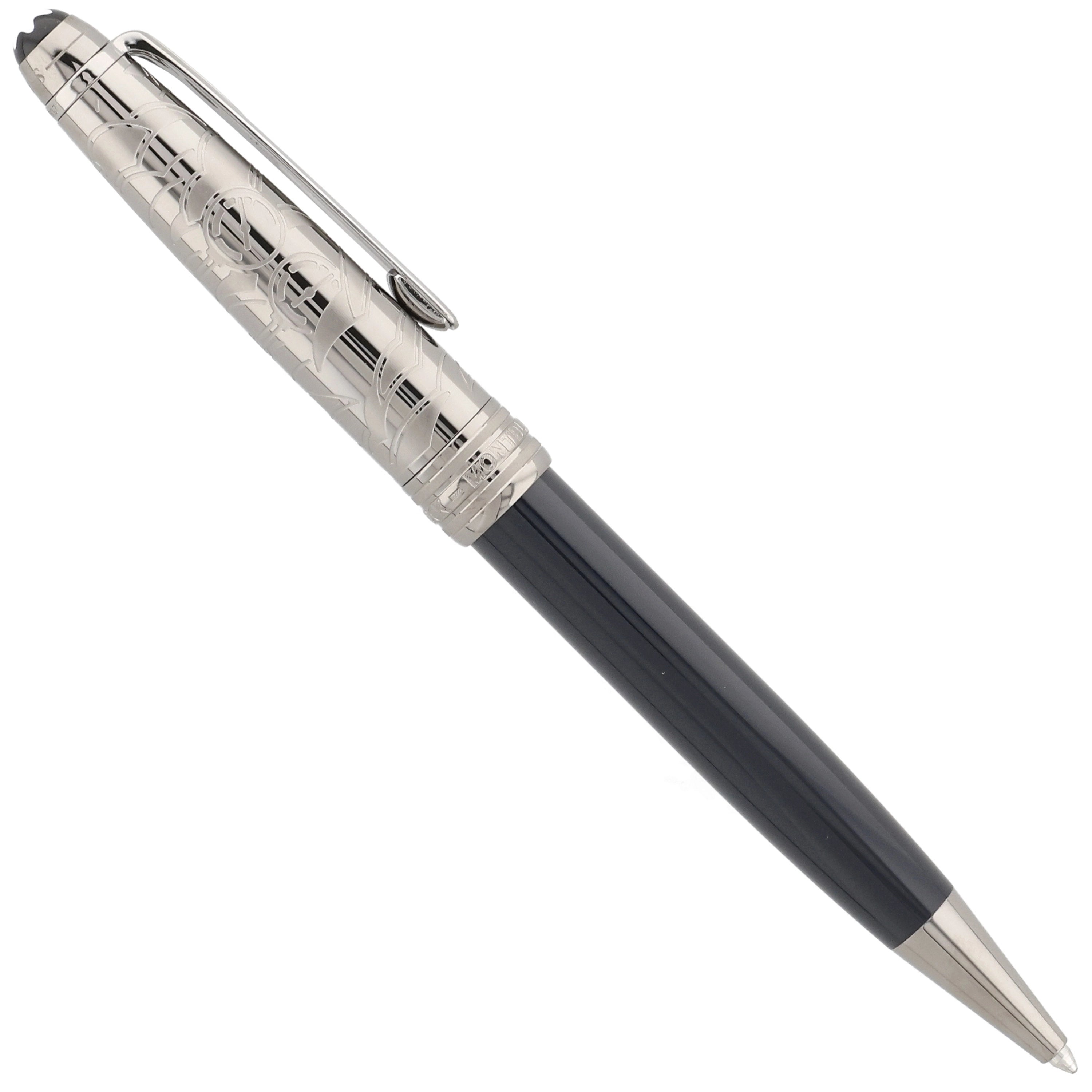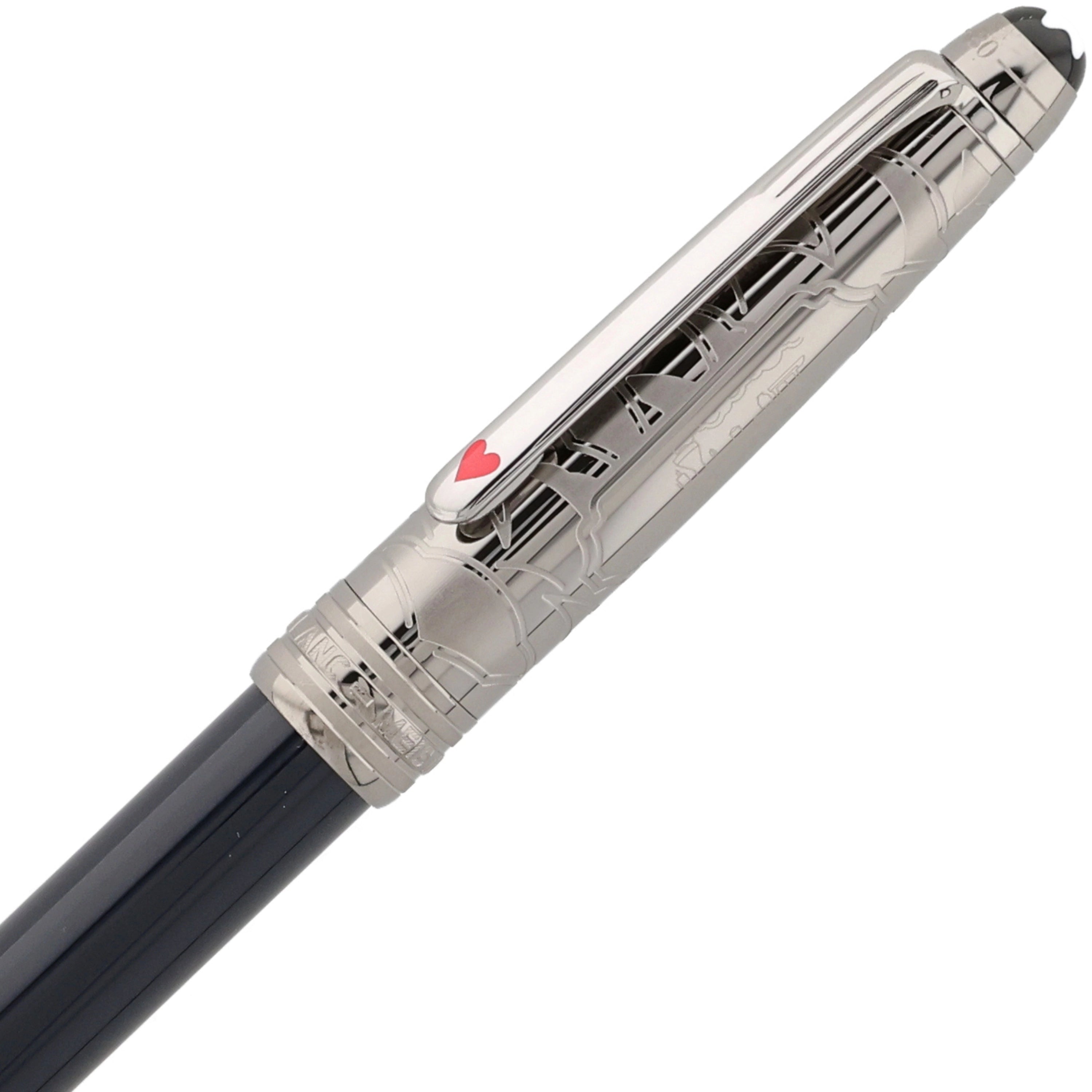 Dieses Schreibgerät vereint einen edlen Korpus aus tiefblauem Edelharz mit einer Kappe aus rutheniumbeschichtetem Edelstahl. Der Clip ist mit einem rot lackierten Herz versehen, das die Verbindung zwischen Phileas Fogg und Prinzessin Aouda symbolisiert. Fein ausgearbeitete Gravuren und weitere Designelemente, die an die letzte Etappe von Phileas Foggs Reise erinnern, verleihen dem Schreibgerät erzählerische Tiefe und elegante Dynamik, während platinierte Beschläge und das ikonische Montblanc-Emblem das harmonische Design stilvoll abrunden.