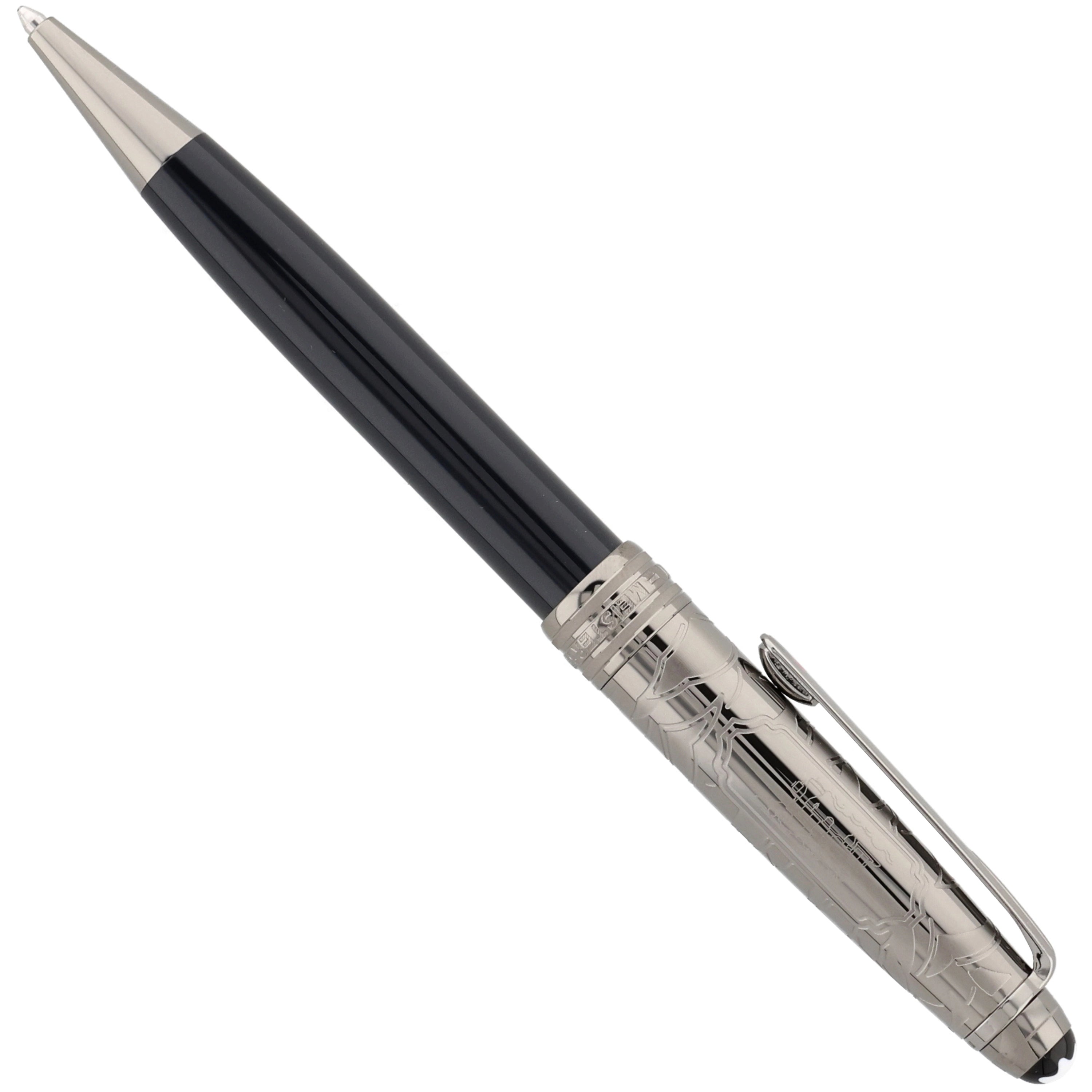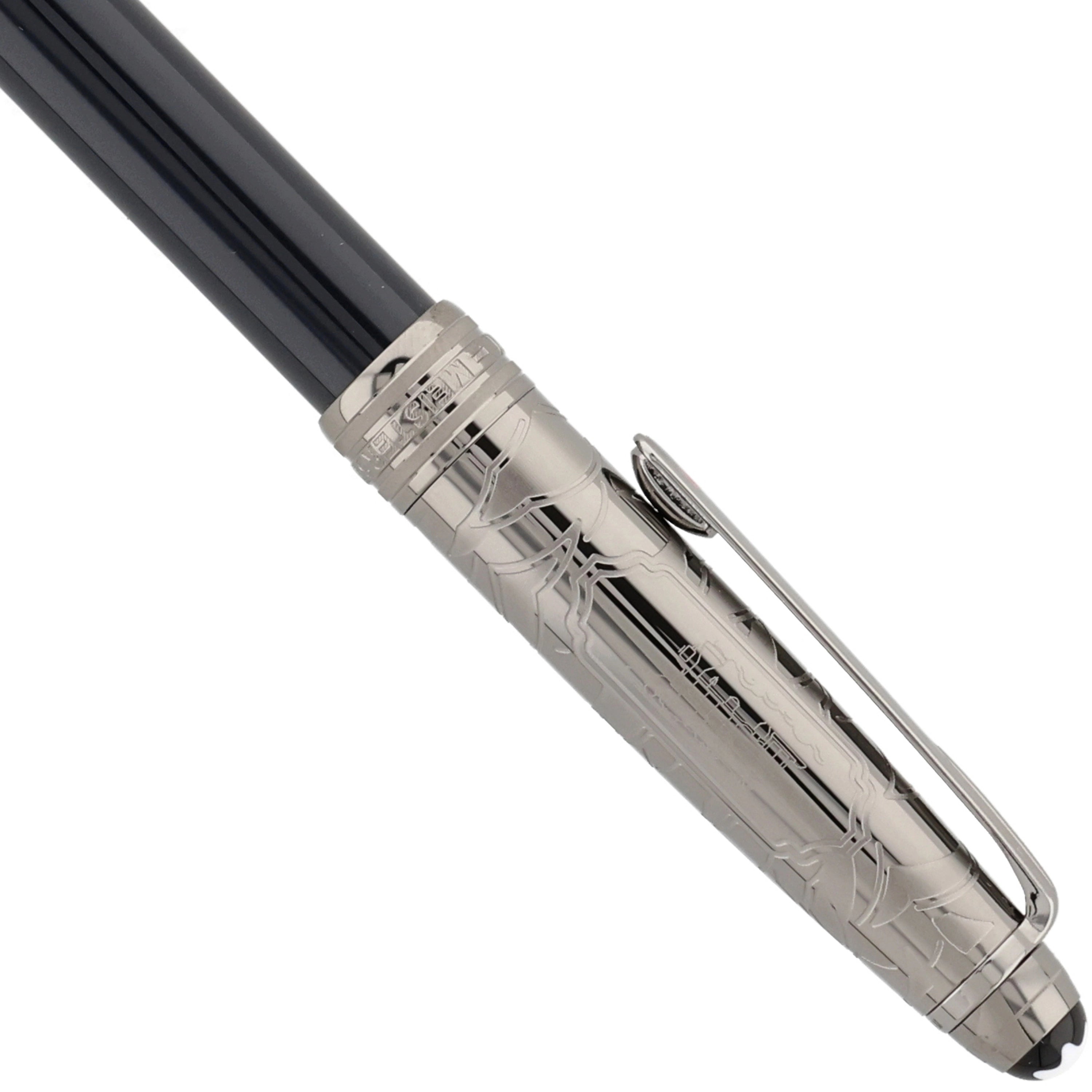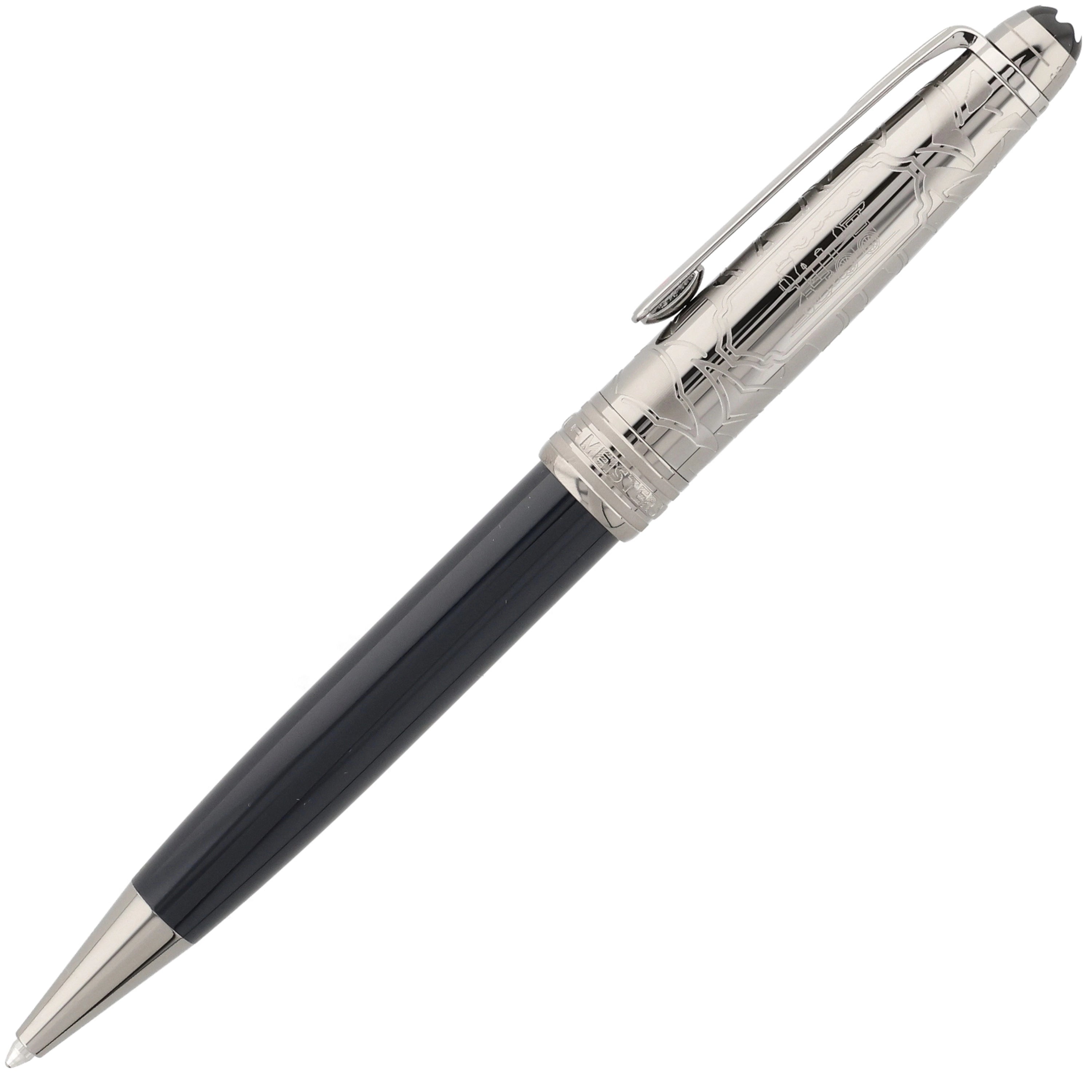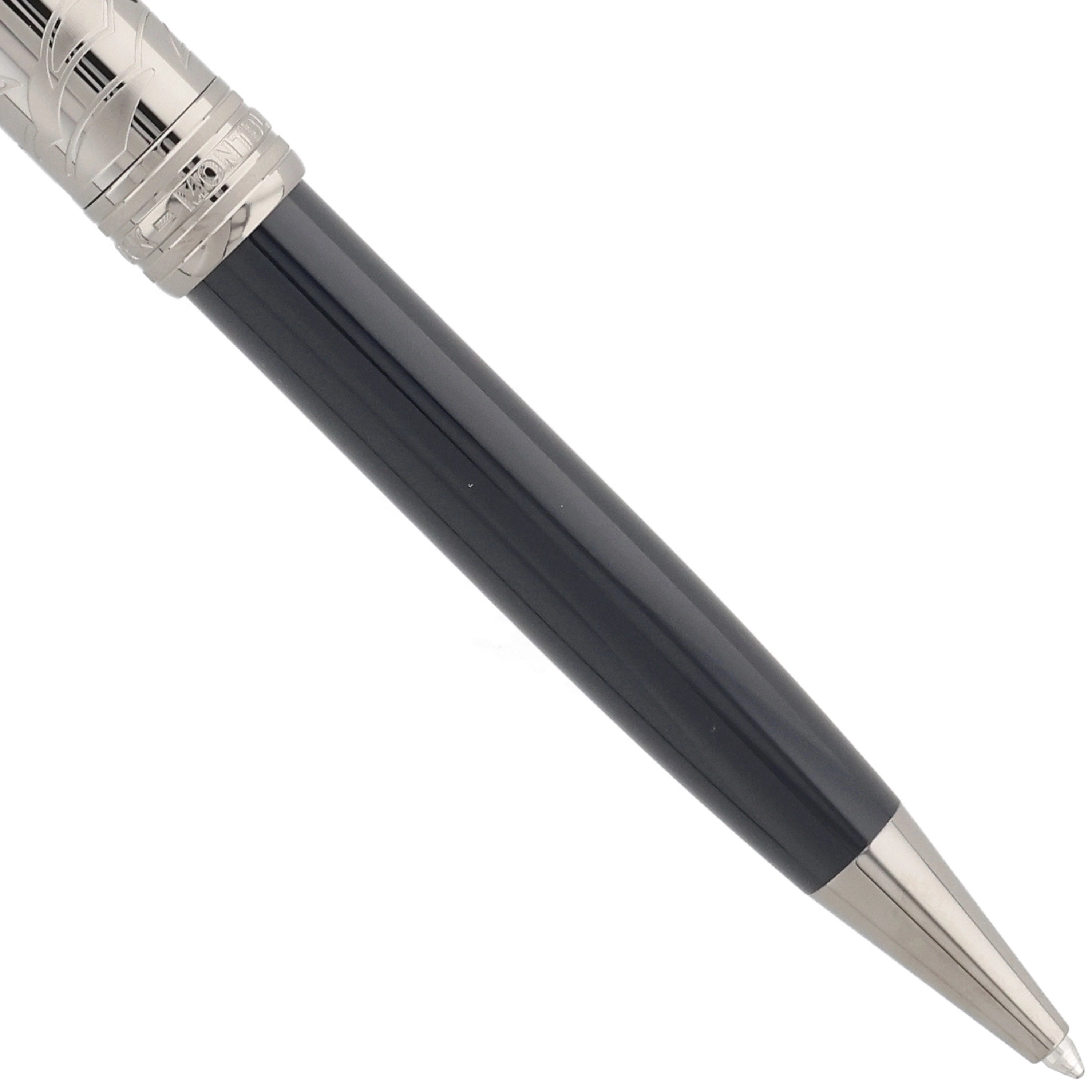 Dieses Schreibgerät vereint einen edlen Korpus aus tiefblauem Edelharz mit einer Kappe aus rutheniumbeschichtetem Edelstahl. Der Clip ist mit einem rot lackierten Herz versehen, das die Verbindung zwischen Phileas Fogg und Prinzessin Aouda symbolisiert. Fein ausgearbeitete Gravuren und weitere Designelemente, die an die letzte Etappe von Phileas Foggs Reise erinnern, verleihen dem Schreibgerät erzählerische Tiefe und elegante Dynamik, während platinierte Beschläge und das ikonische Montblanc-Emblem das harmonische Design stilvoll abrunden.