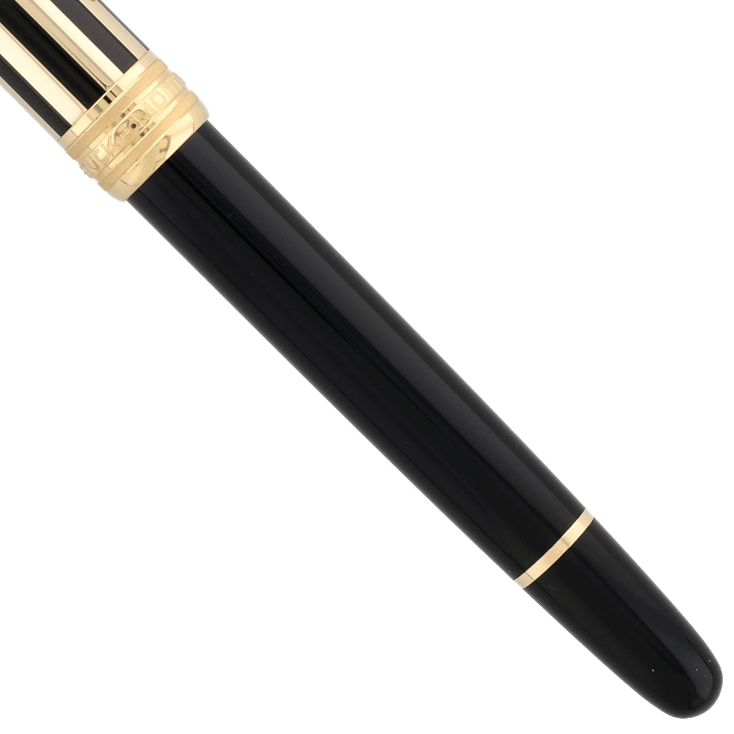 Der Korpus des Schreibgeräts ist aus tiefschwarzem Edelharz gefertigt und bildet einen eleganten Kontrast zur vergoldeten Kappe, die von feinen schwarzen Lackstreifen durchzogen wird. Die Details, darunter Clip und Beschläge, sind ebenfalls vergoldet und unterstreichen den hochwertigen Charakter. In der klassischen Silhouette der Meisterstück-Serie gestaltet, verbindet das Schreibgerät zeitlose Eleganz mit einer modernen Ausstrahlung.