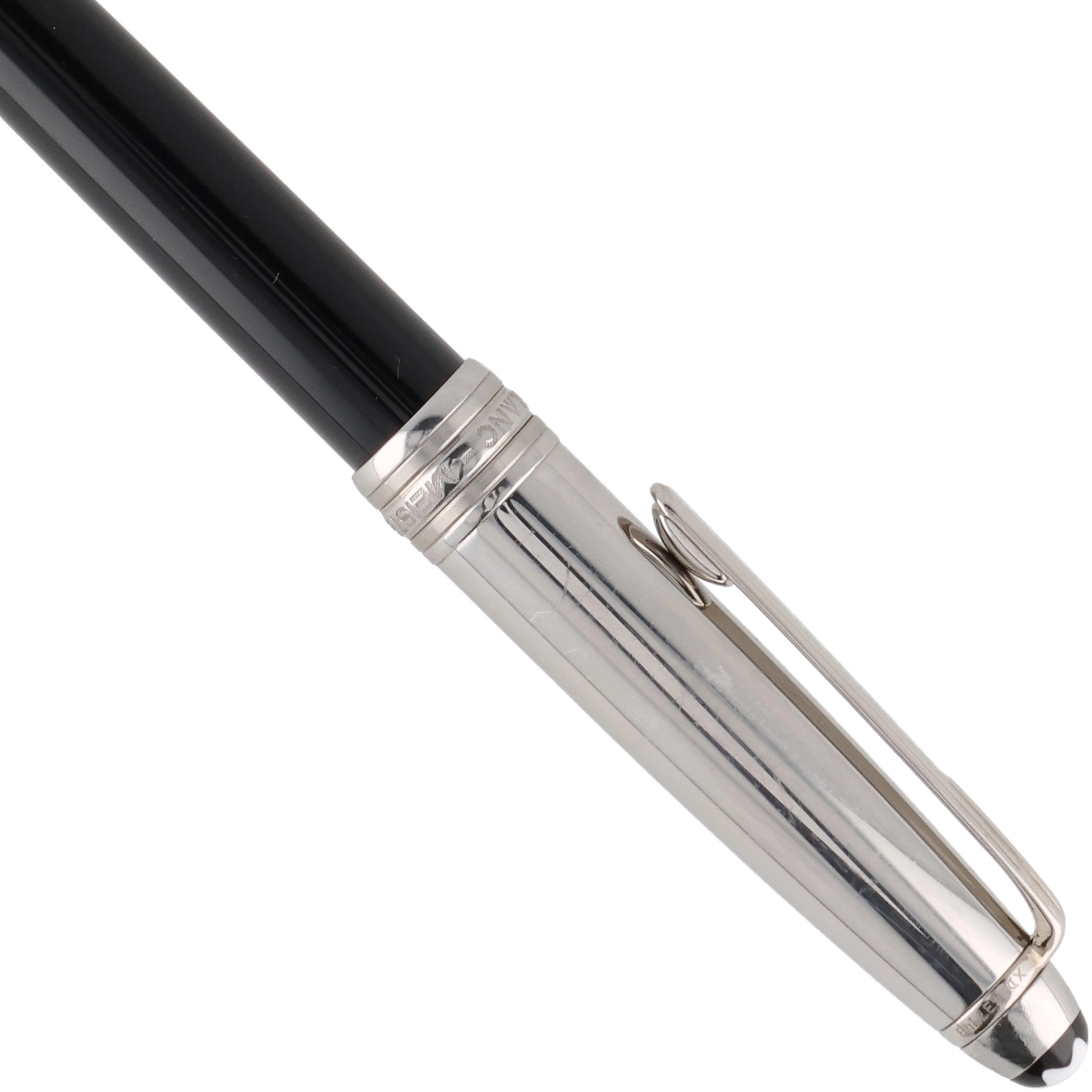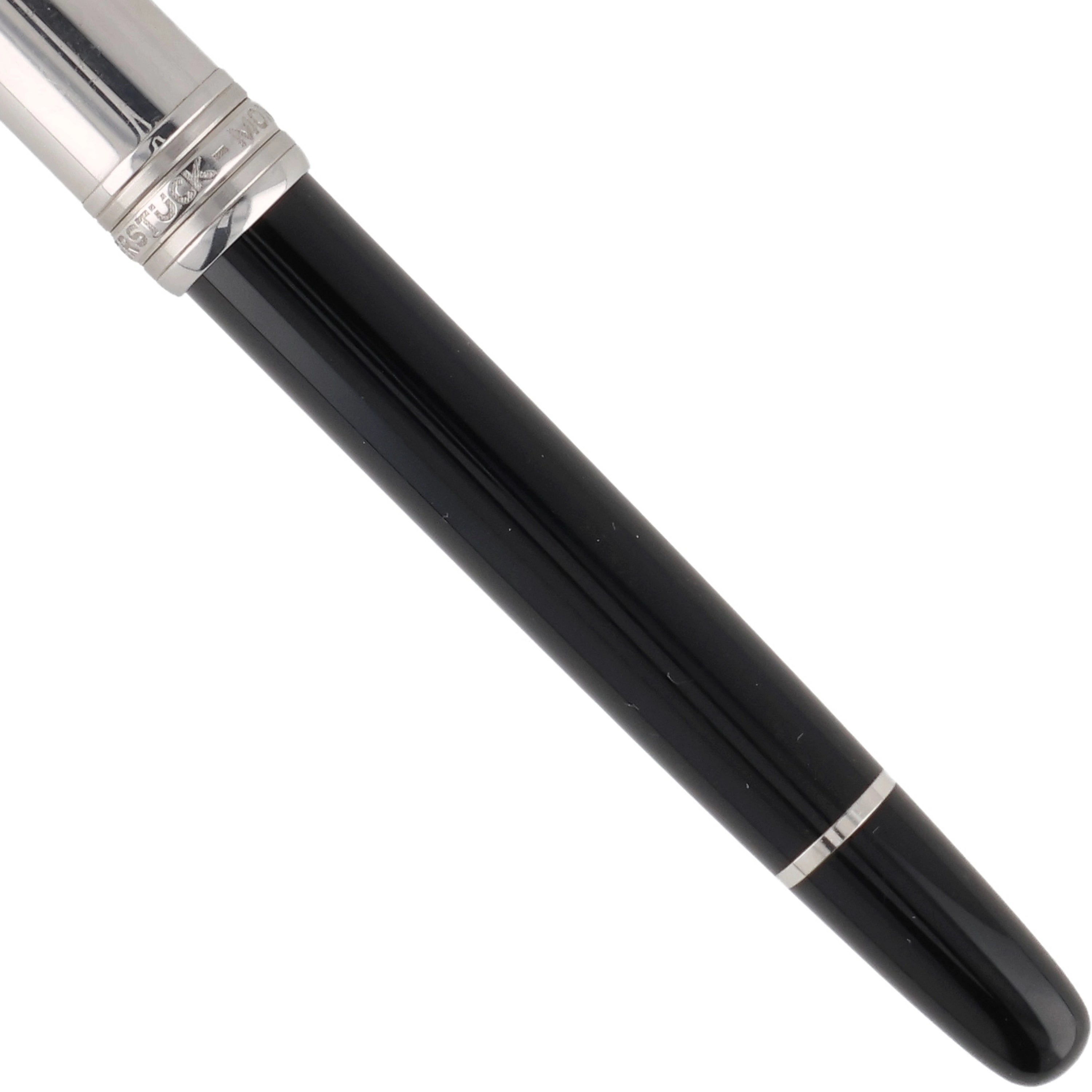 Der Korpus des Schreibgeräts wurde aus schwarzem Edelharz gefertigt. Die Kappe aus Stainless Steel stellt das Highlight dar und verleiht dem ikonischen, zeitlosen Stil der Meisterstück-Serie eine moderne Note. Die platinierten Details, darunter der Clip und die Beschläge, fügen sich nahtlos in das Gesamtbild ein und runden das Gesamtbild des Schreibgeräts stimmig ab.