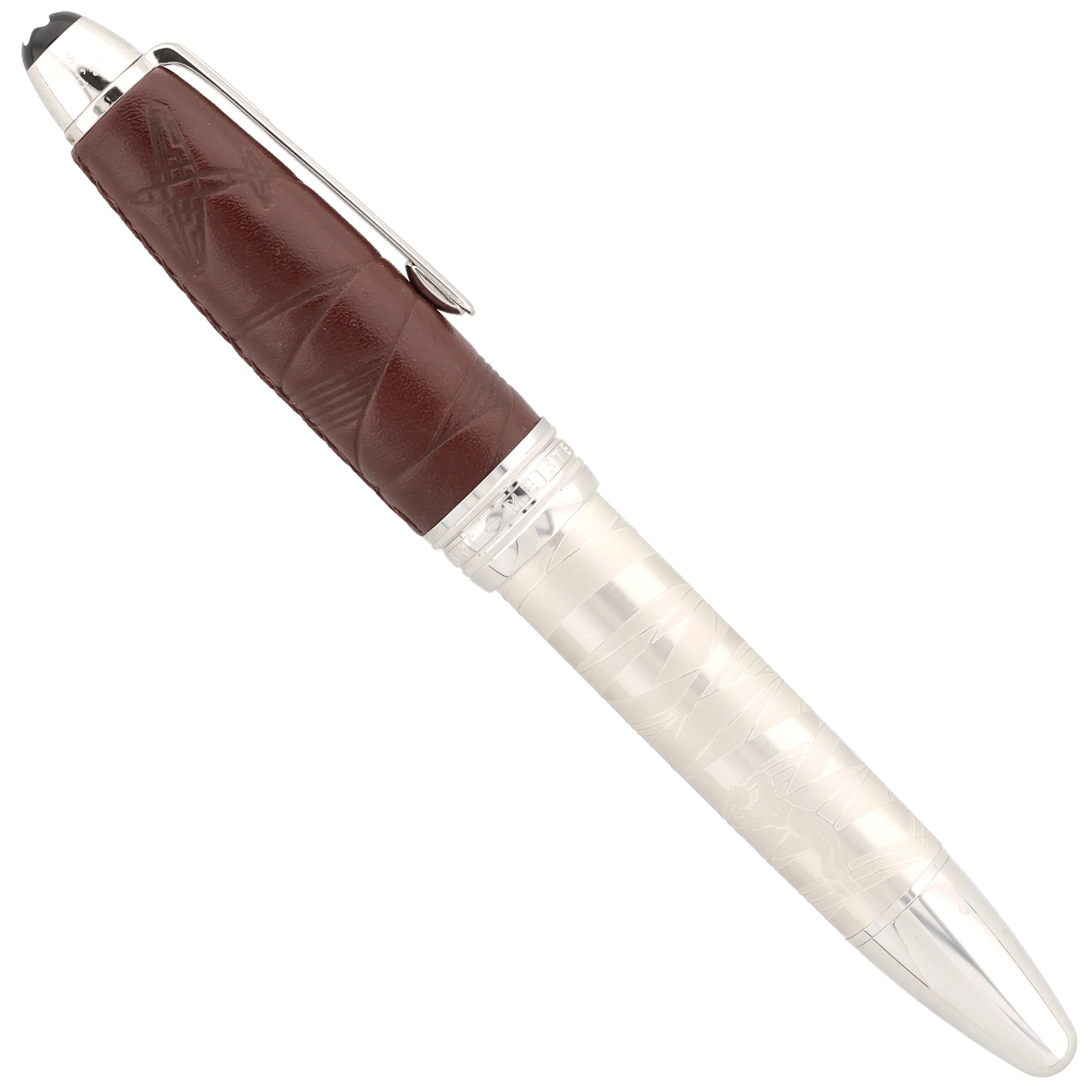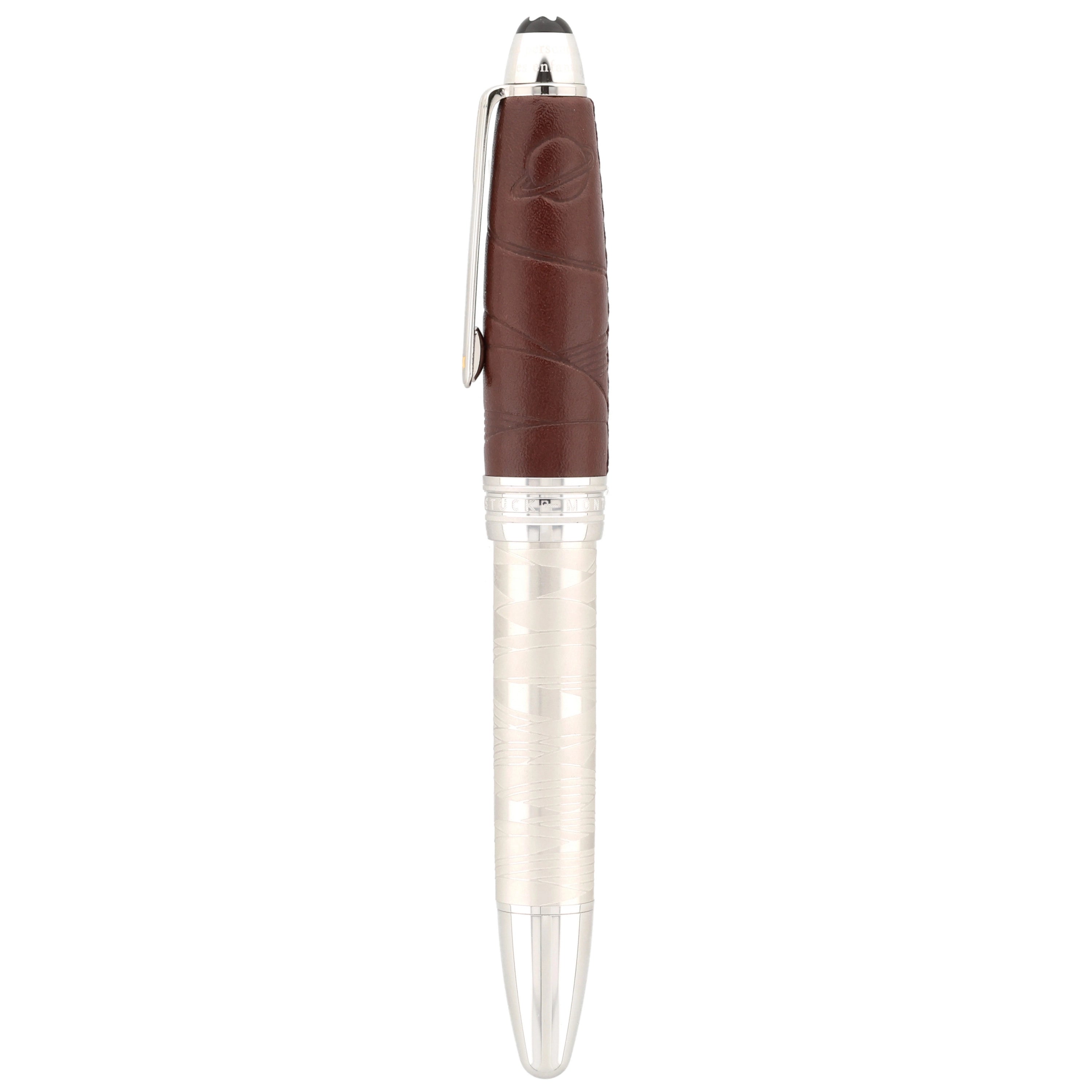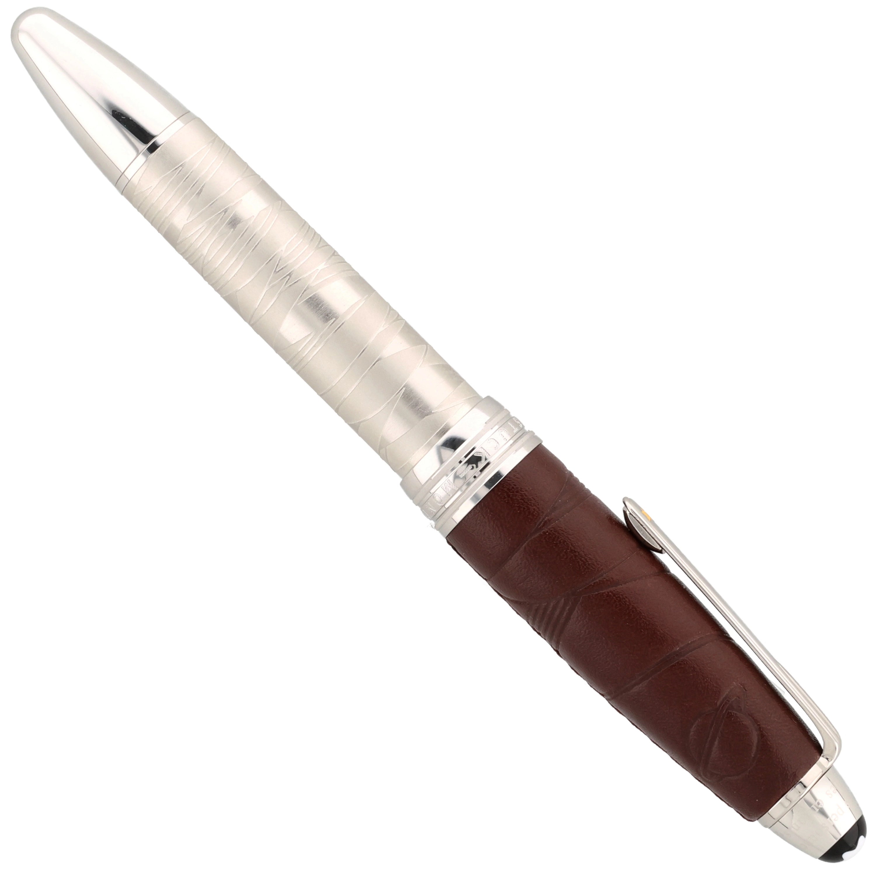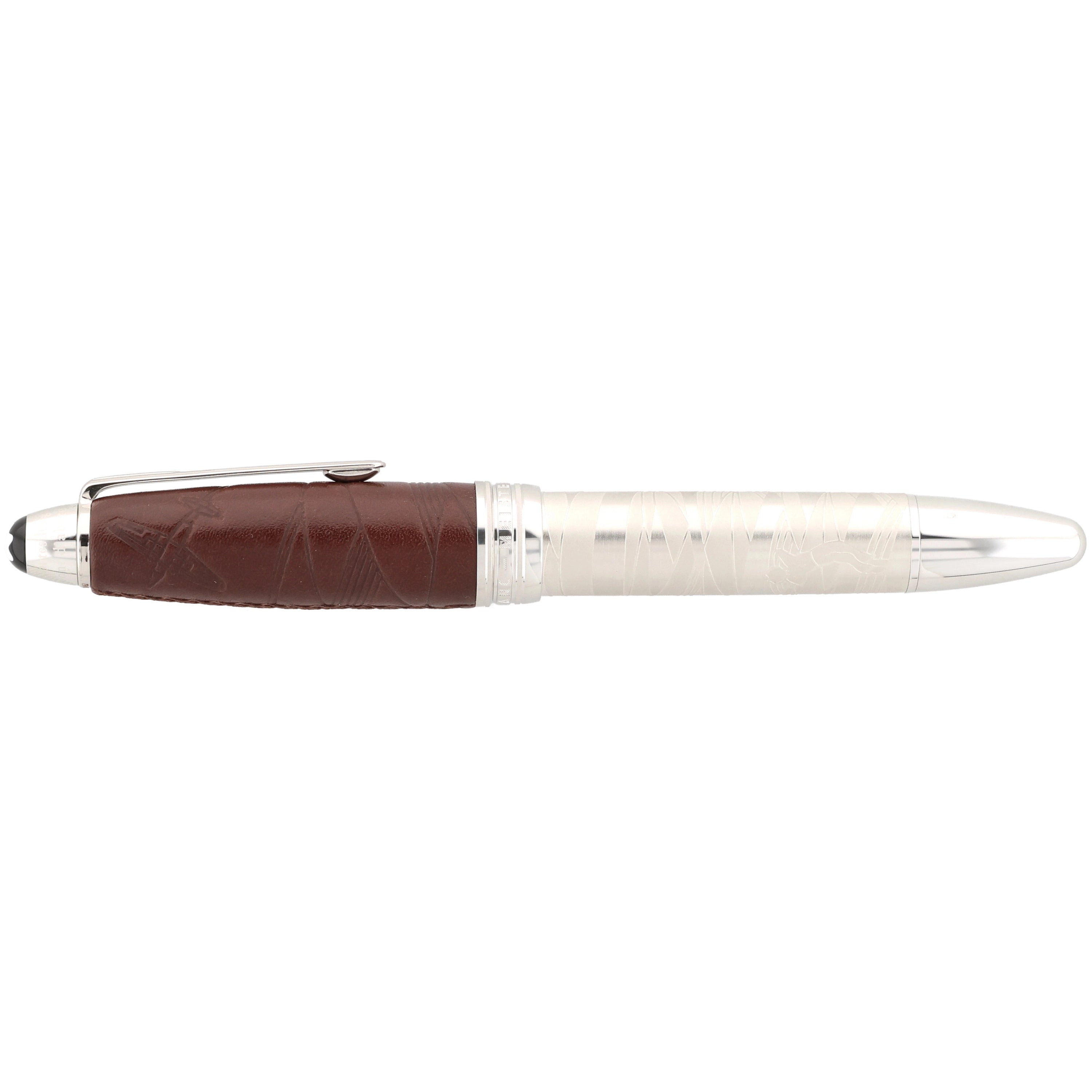 Der Korpus des Schreibgeräts wurde aus platinertem Edelstahl gefertigt. Die mit feinem Leder überzogene Kappe verleiht dem eleganten Design eine besondere Note. Kunstvolle Gravuren und Einarbeitungen im Leder greifen die Geschichte des kleinen Prinzen auf und machen das Design einzigartig. Platinierte Details, wie der Clip und die Beschläge, runden das Gesamtbild harmonisch ab.