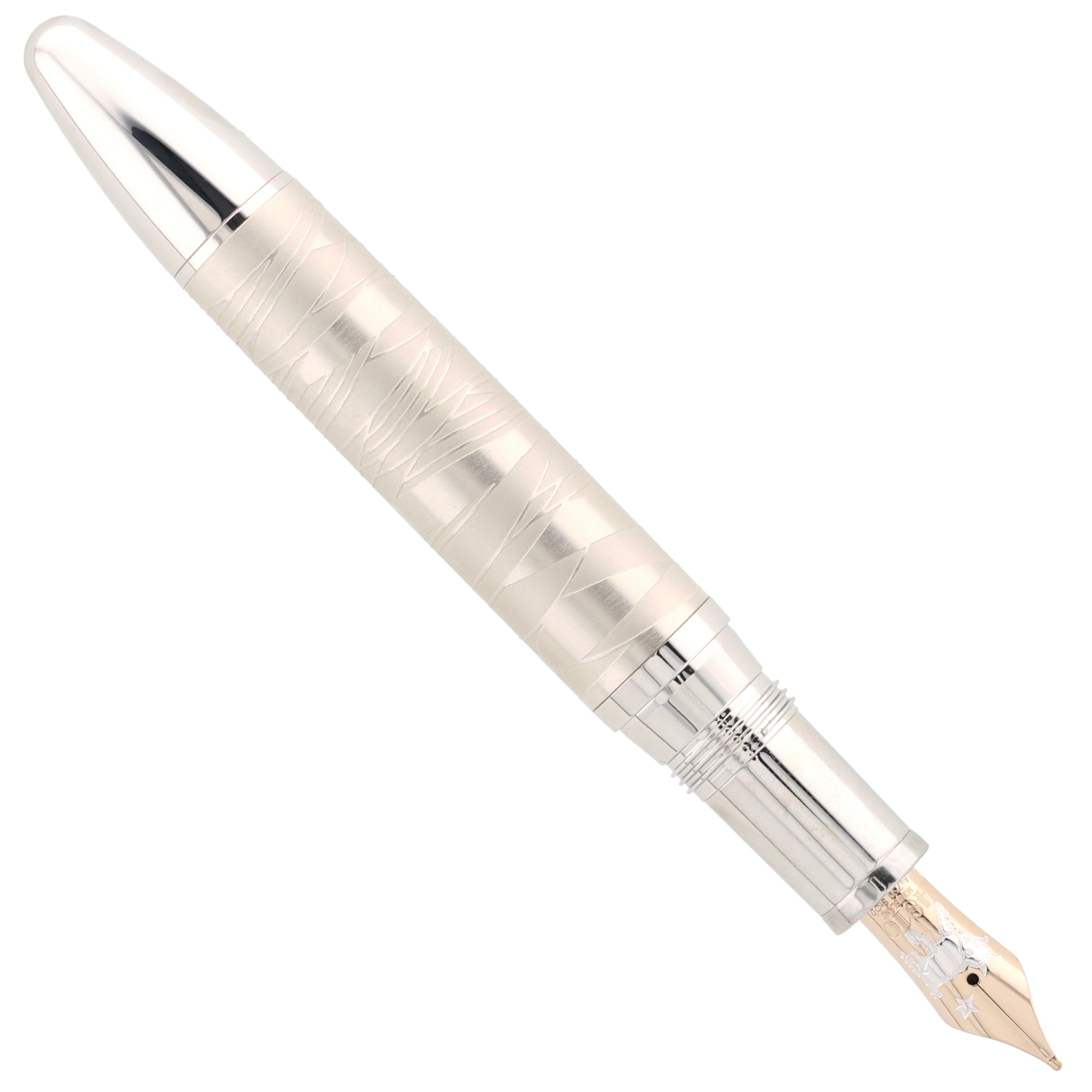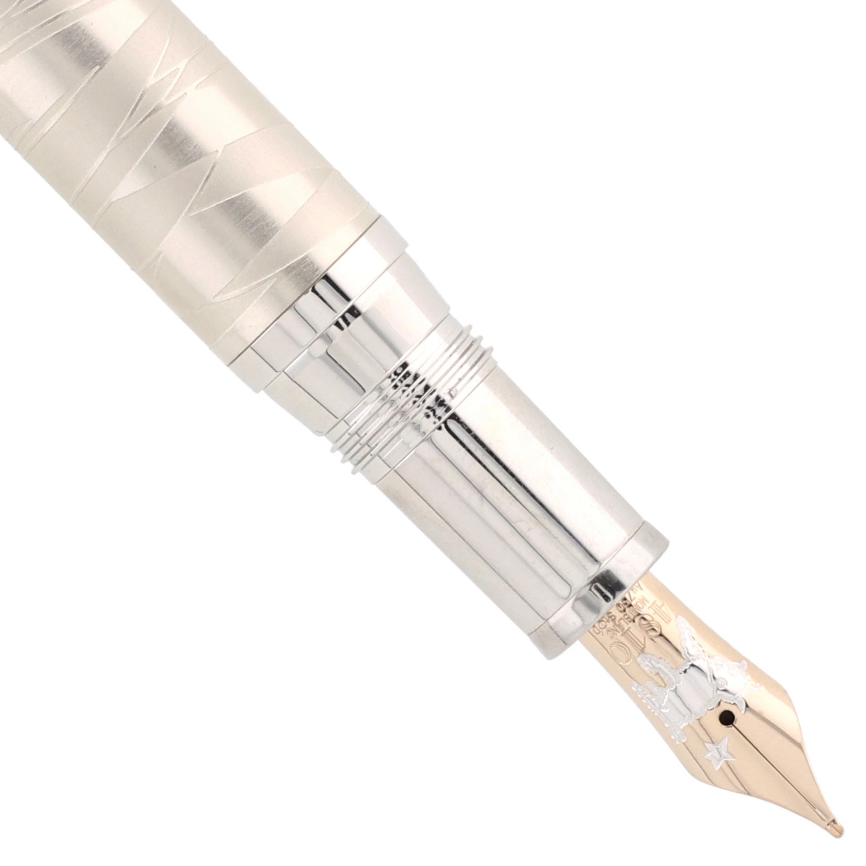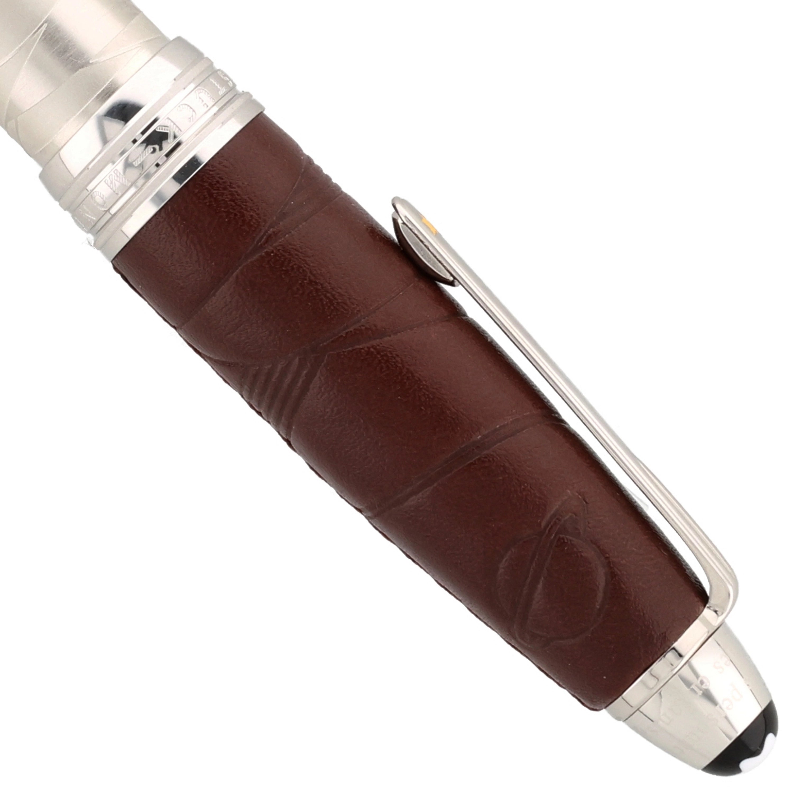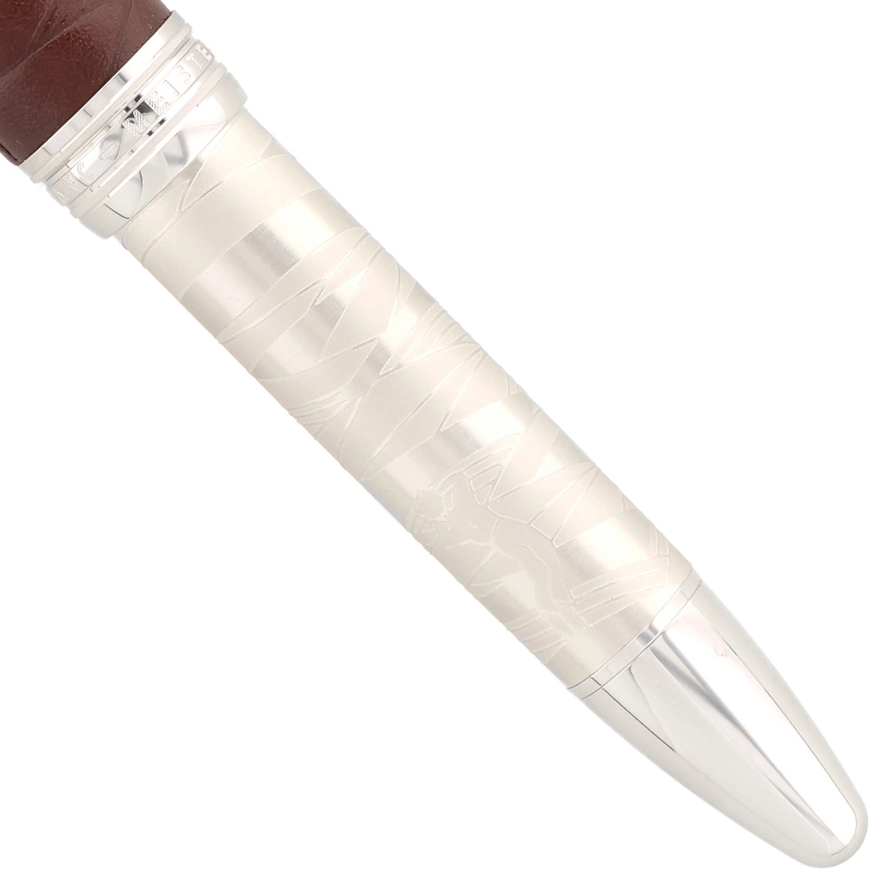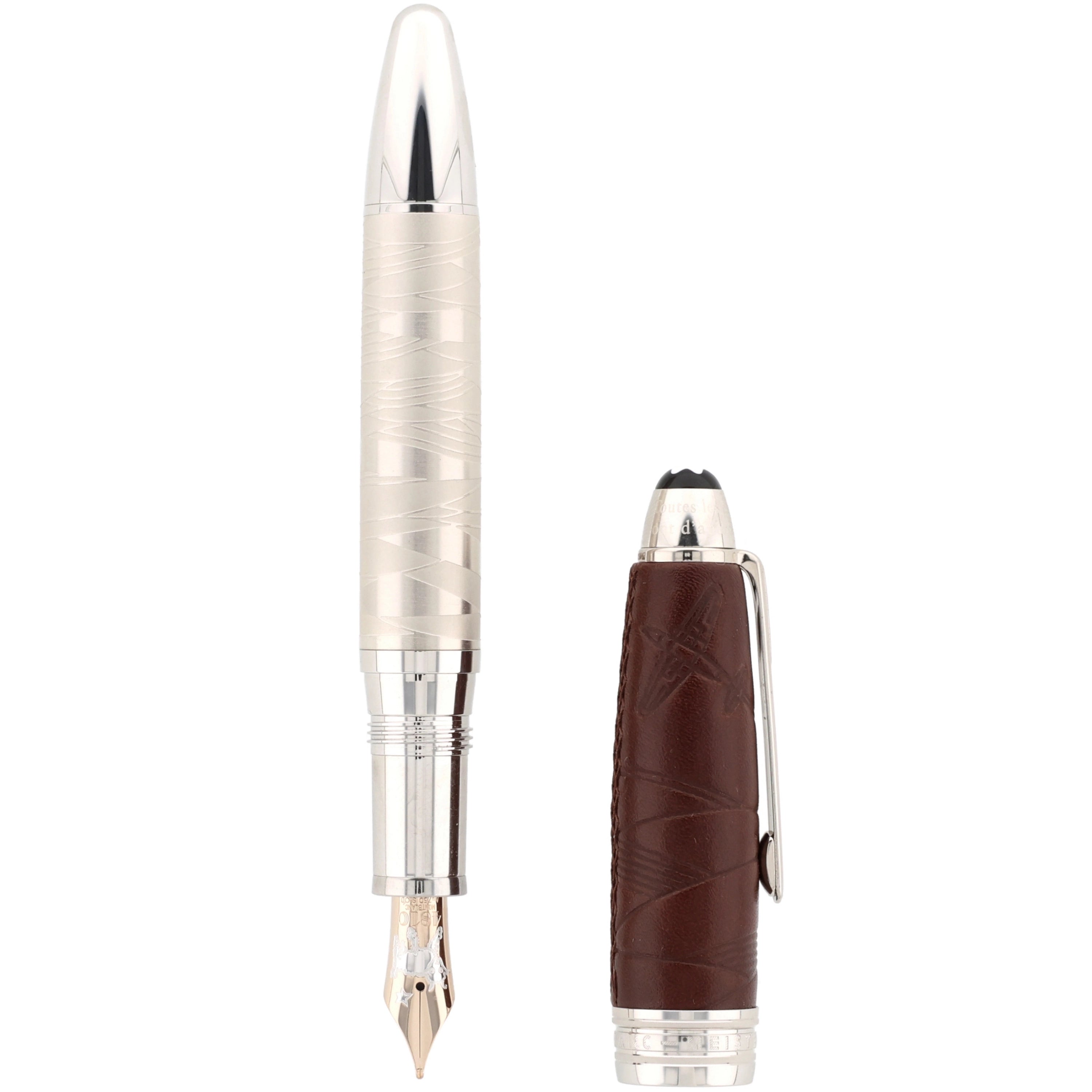 Der Korpus des Schreibgeräts wurde aus platinertem Edelstahl gefertigt. Die mit feinem Leder überzogene Kappe verleiht dem eleganten Design eine besondere Note. Kunstvolle Gravuren und Einarbeitungen im Leder greifen die Geschichte des kleinen Prinzen auf und machen das Design einzigartig. Platinierte Details, wie der Clip und die Beschläge, runden das Gesamtbild harmonisch ab.