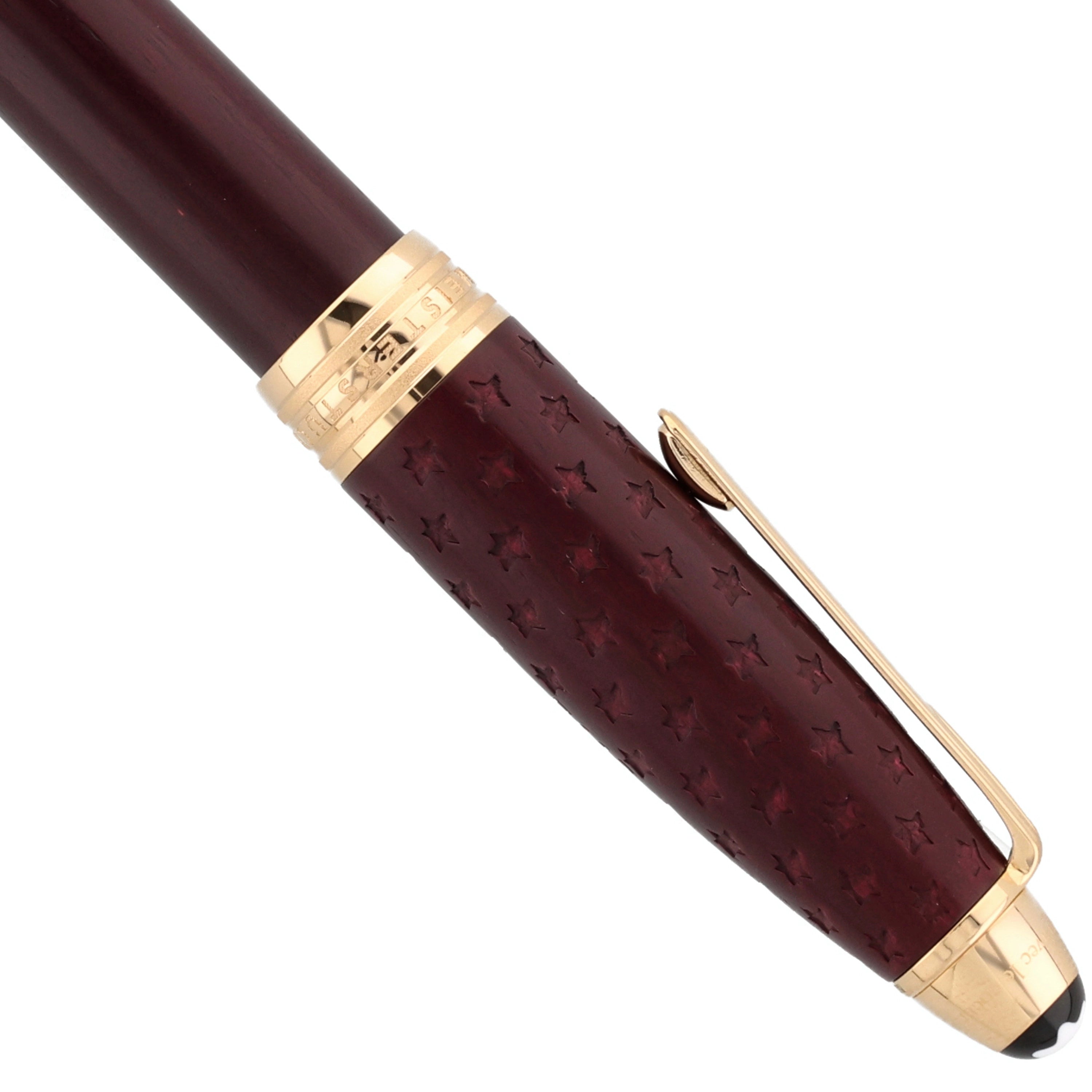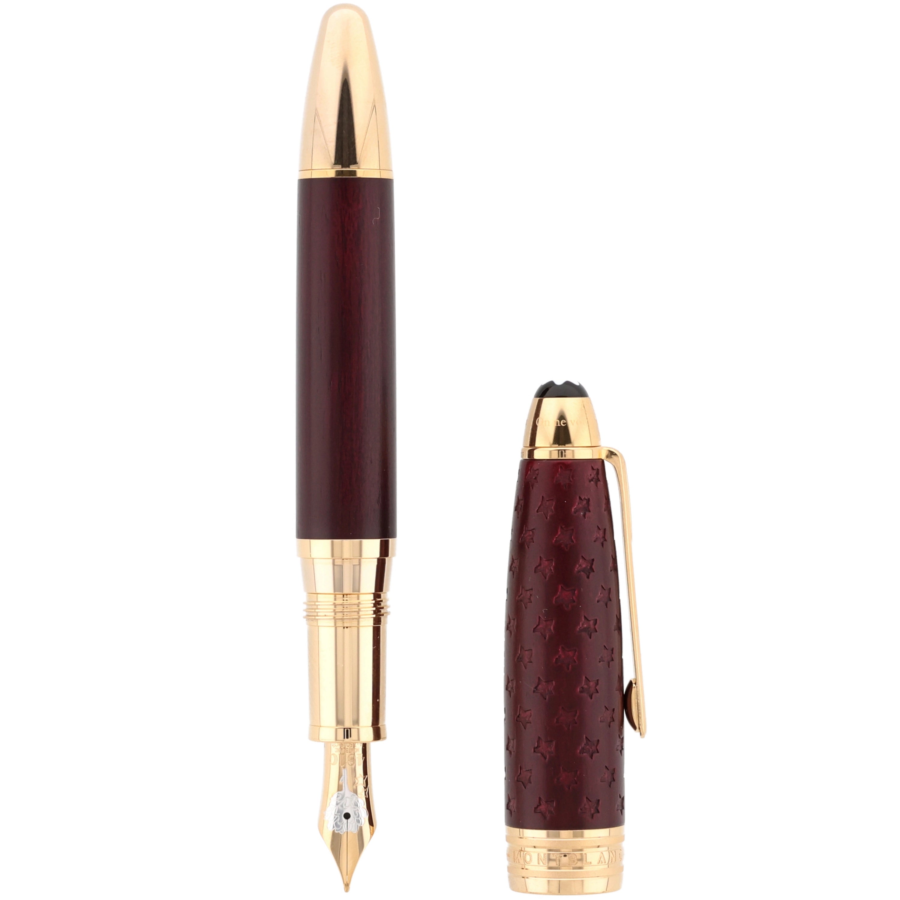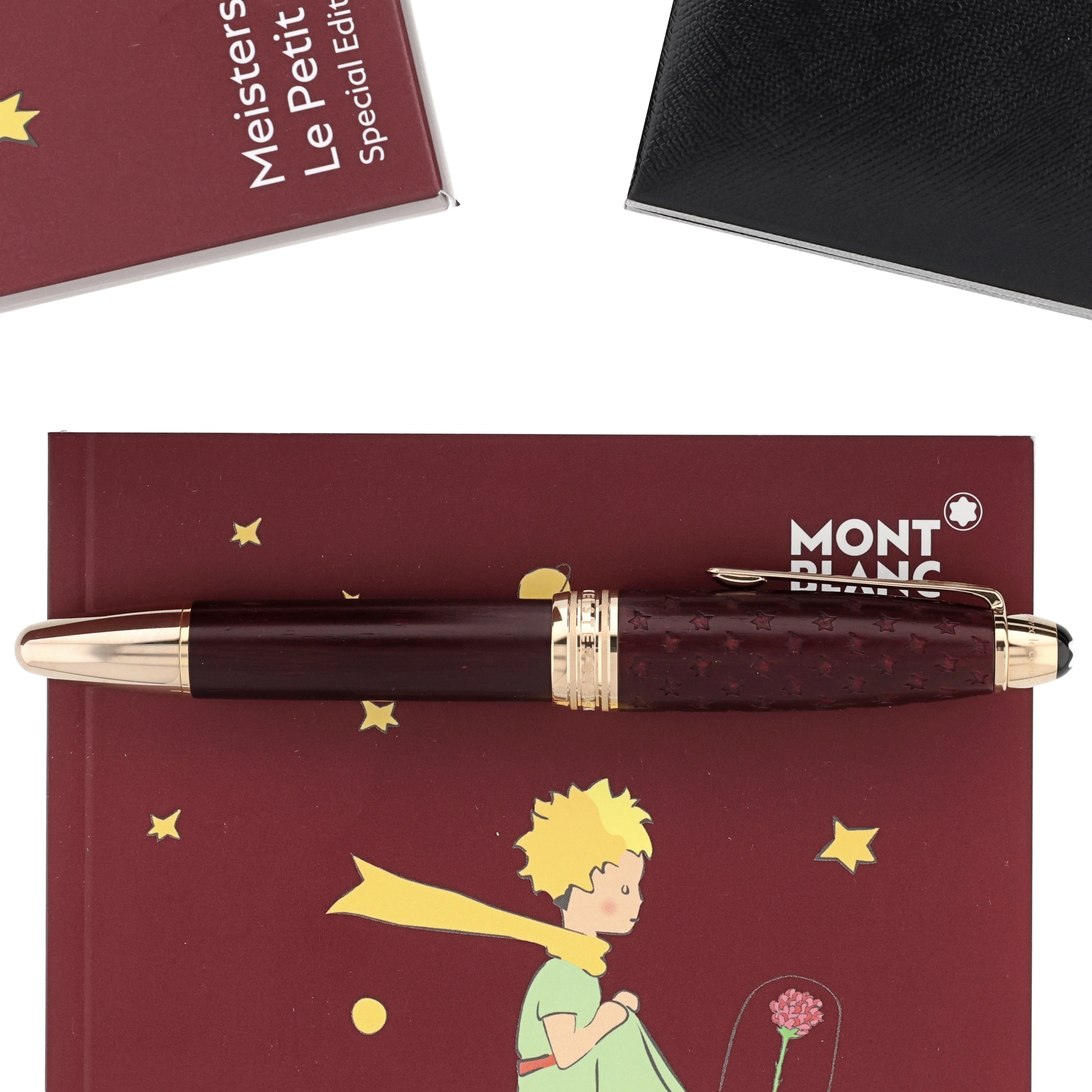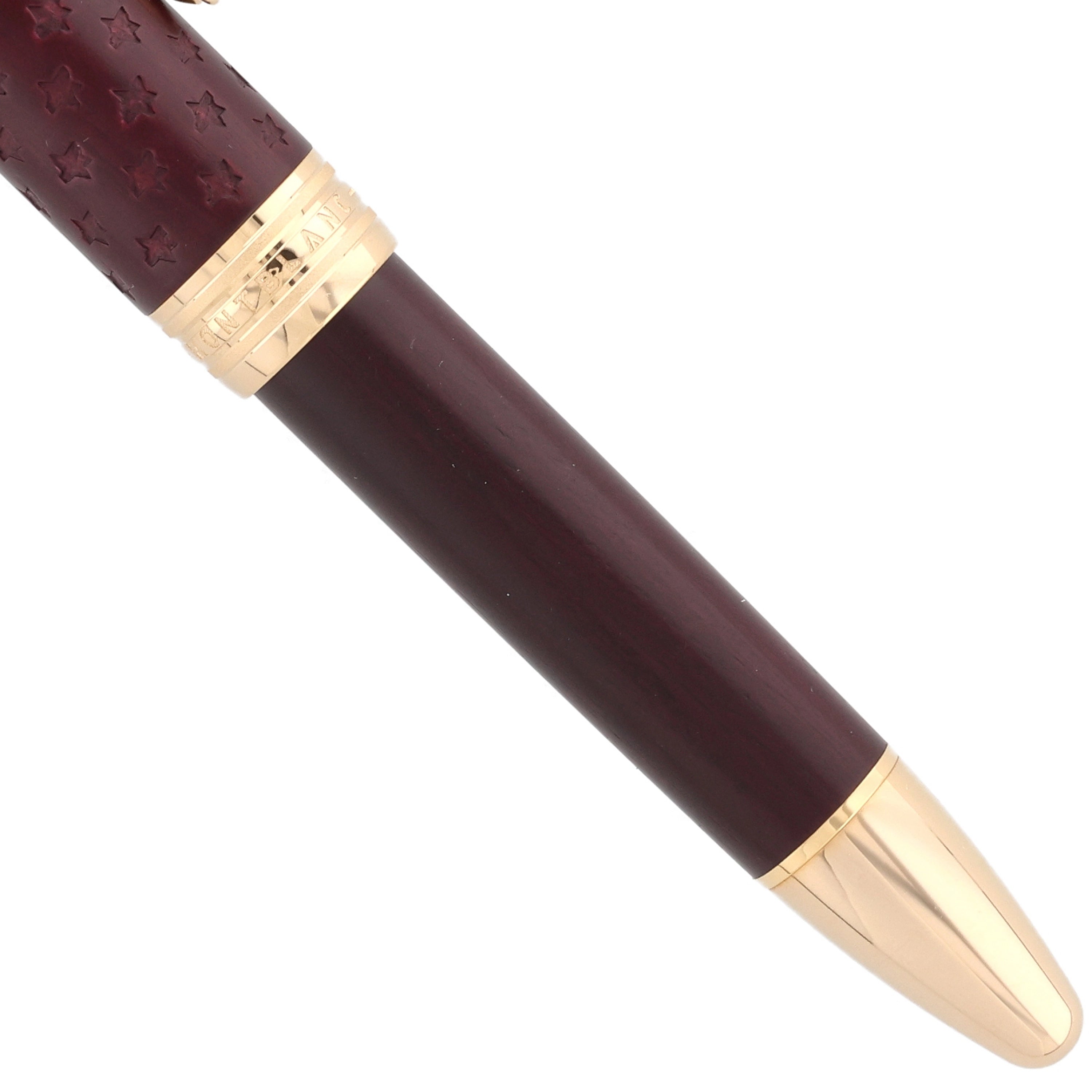 Gefertigt aus fein verarbeitetem Holz, das anschließend in einem tiefen Burgundton lackiert wurde, präsentiert sich dieses Schreibgerät als außergewöhnliche Interpretation des Meisterstücks. In das Holz sind kunstvoll filigrane Motive – insbesondere Sterne – eingearbeitet, die dem Schreibgerät eine besondere Tiefe und Struktur verleihen. Vergoldete Beschläge setzen edle Akzente und unterstreichen den luxuriösen Charakter des Designs. Ein lackierter Stern am Clip sowie die Gravuren am Kappenkopf greifen zusätzlich Symboliken aus Antoine de Saint-Exupérys Meisterwerk „Der kleine Prinz“ auf und machen dieses Schreibgerät zu einer stilvollen Hommage an die poetische Welt der berühmten Erzählung.