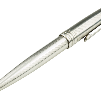 Dieses Schreibgerät fasziniert durch seine edle Fertigung aus massivem 925er Sterling-Silber. Die platinierten Details, darunter der Clip und die Beschläge, setzen luxuriöse Akzente. Ein besonderes optisches und haptisches Highlight bildet die kunstvolle Faden-Guilloche, deren filigranes Muster die Oberfläche veredelt und dem Schreiber einen unverwechselbaren Charakter verleiht. Dieses Meisterwerk vereint zeitlose Ästhetik und exquisite Handwerkskunst auf beeindruckende Weise.