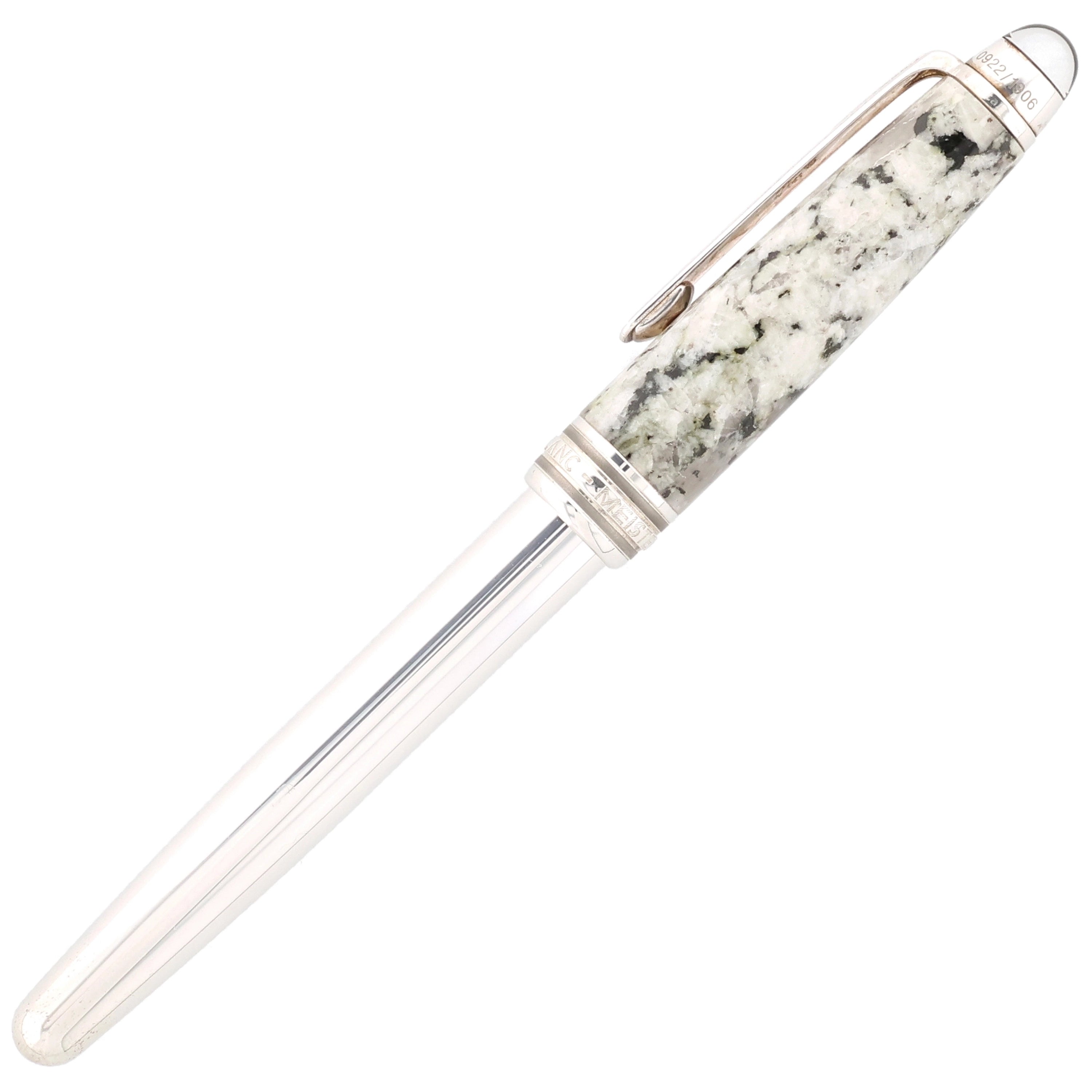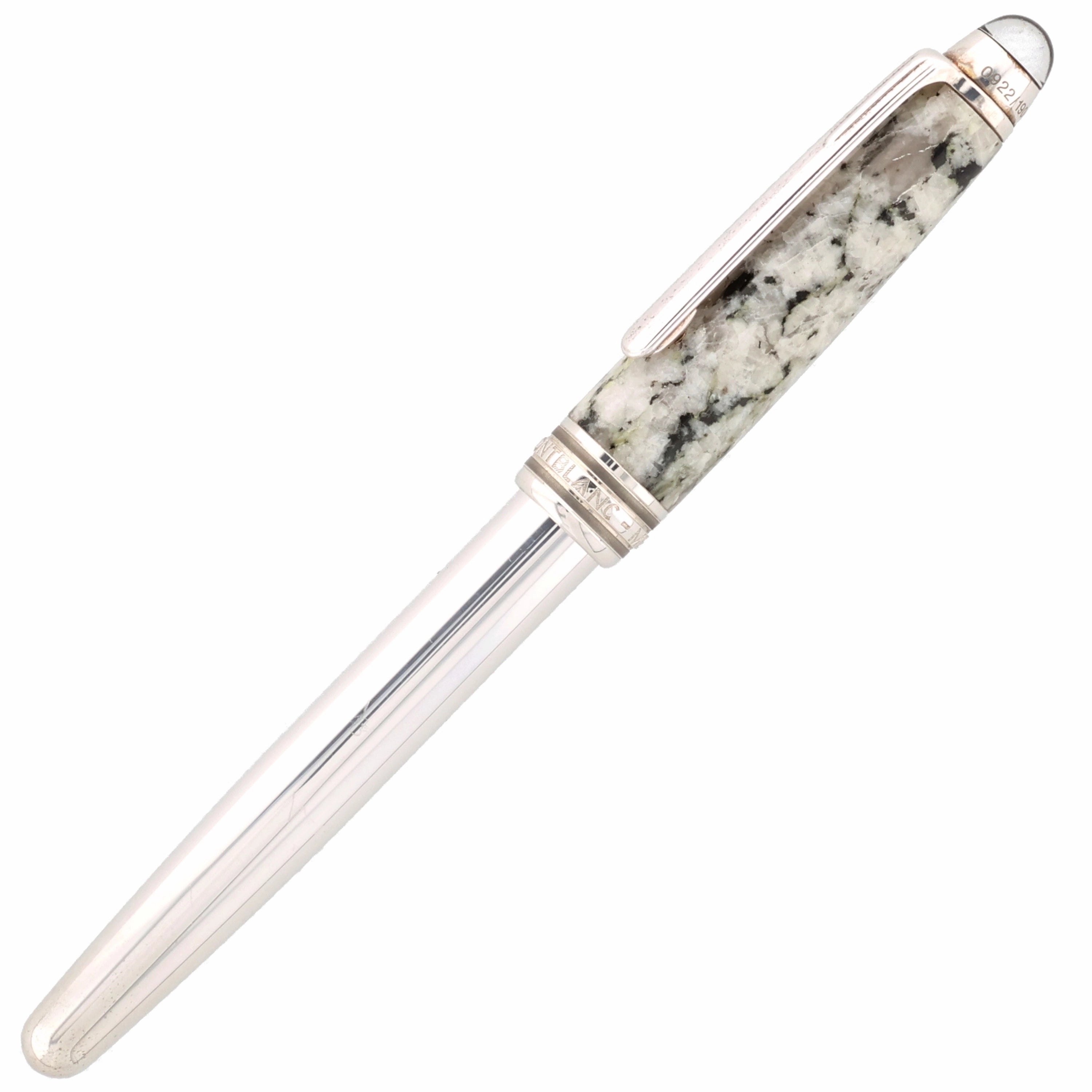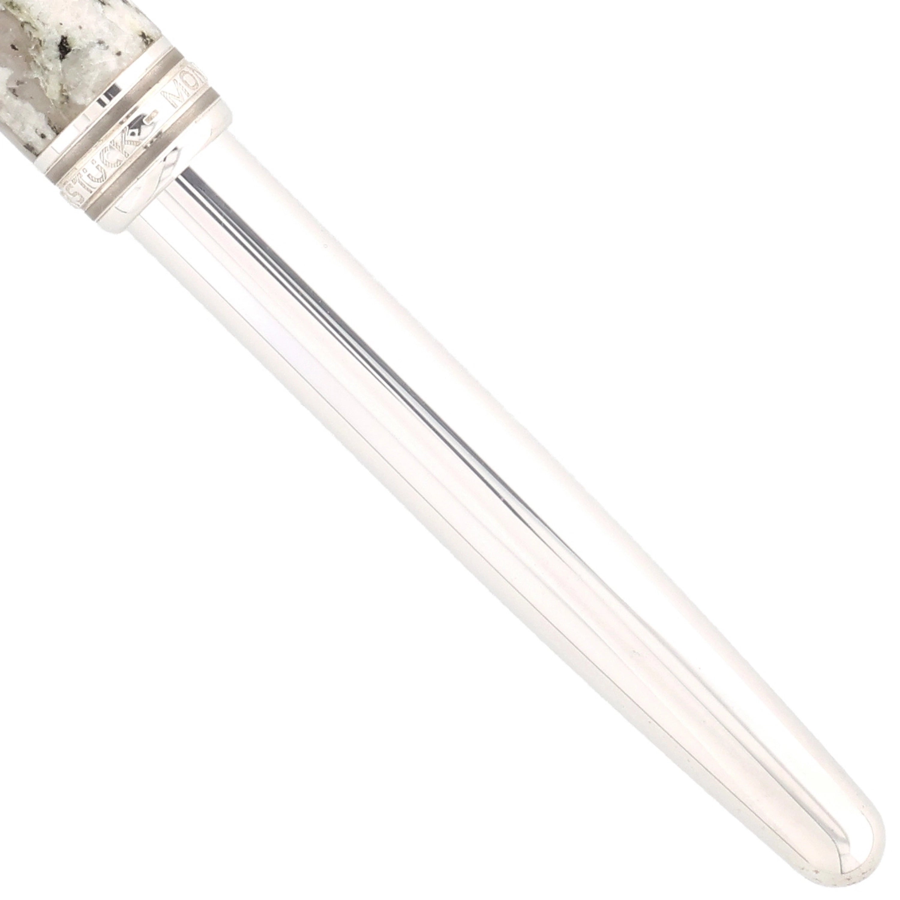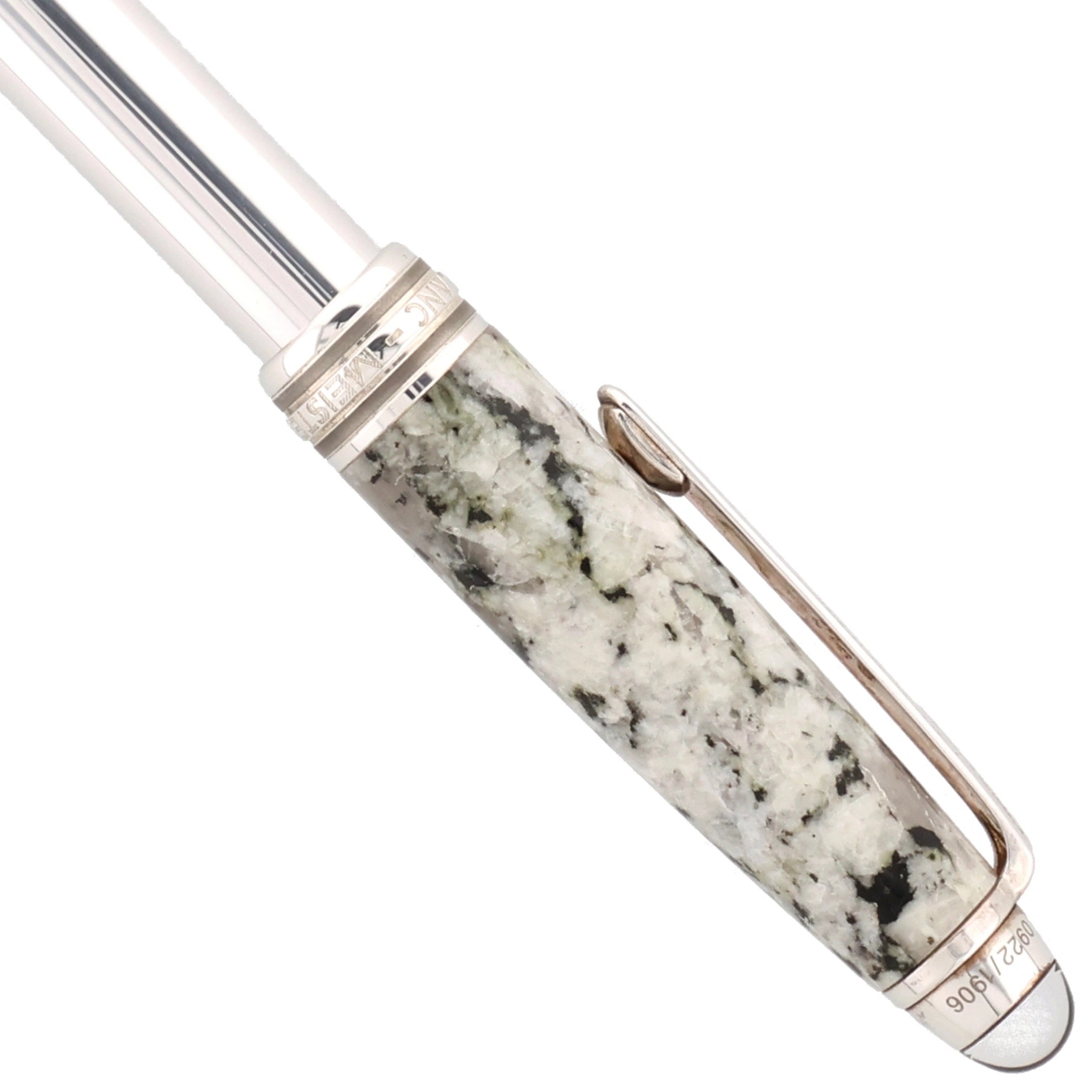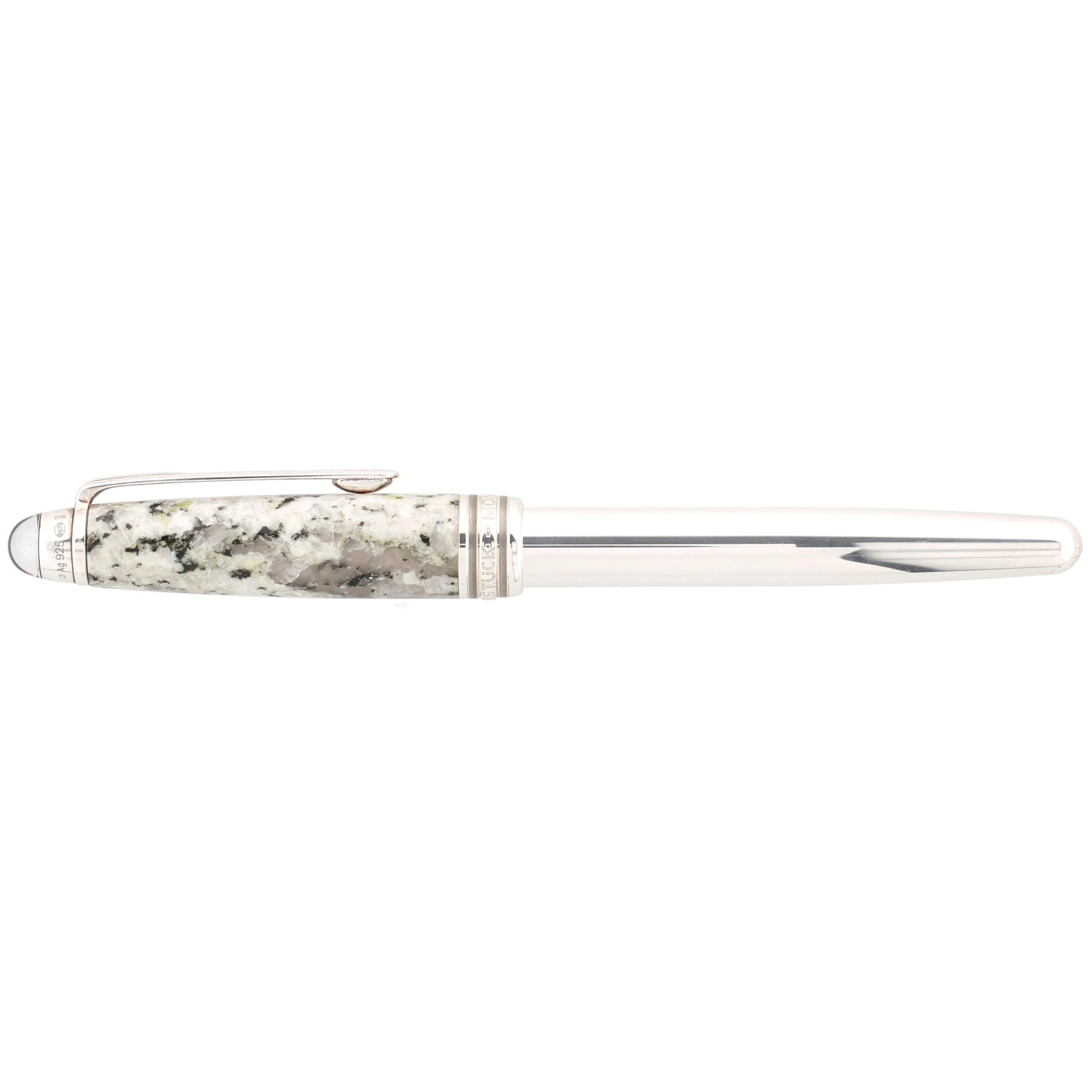 Der Korpus des Schreibgeräts wurde aus 925er Sterling Silber gefertigt. Die Kappe aus Granit bildet das zentrale Highlight und verleiht dem Schreibgerät eine markante, charaktervolle Note. Platiniert ausgeführte Details, darunter die Beschläge, fügen sich stimmig in das Gesamtbild ein und unterstreichen die klare Linie des Designs. Abgerundet wird das Erscheinungsbild durch den ,,Montblanc-Stern'' im Kappenkopf, der hier dreidimensional aus einem Diamanten gearbeitet ist.