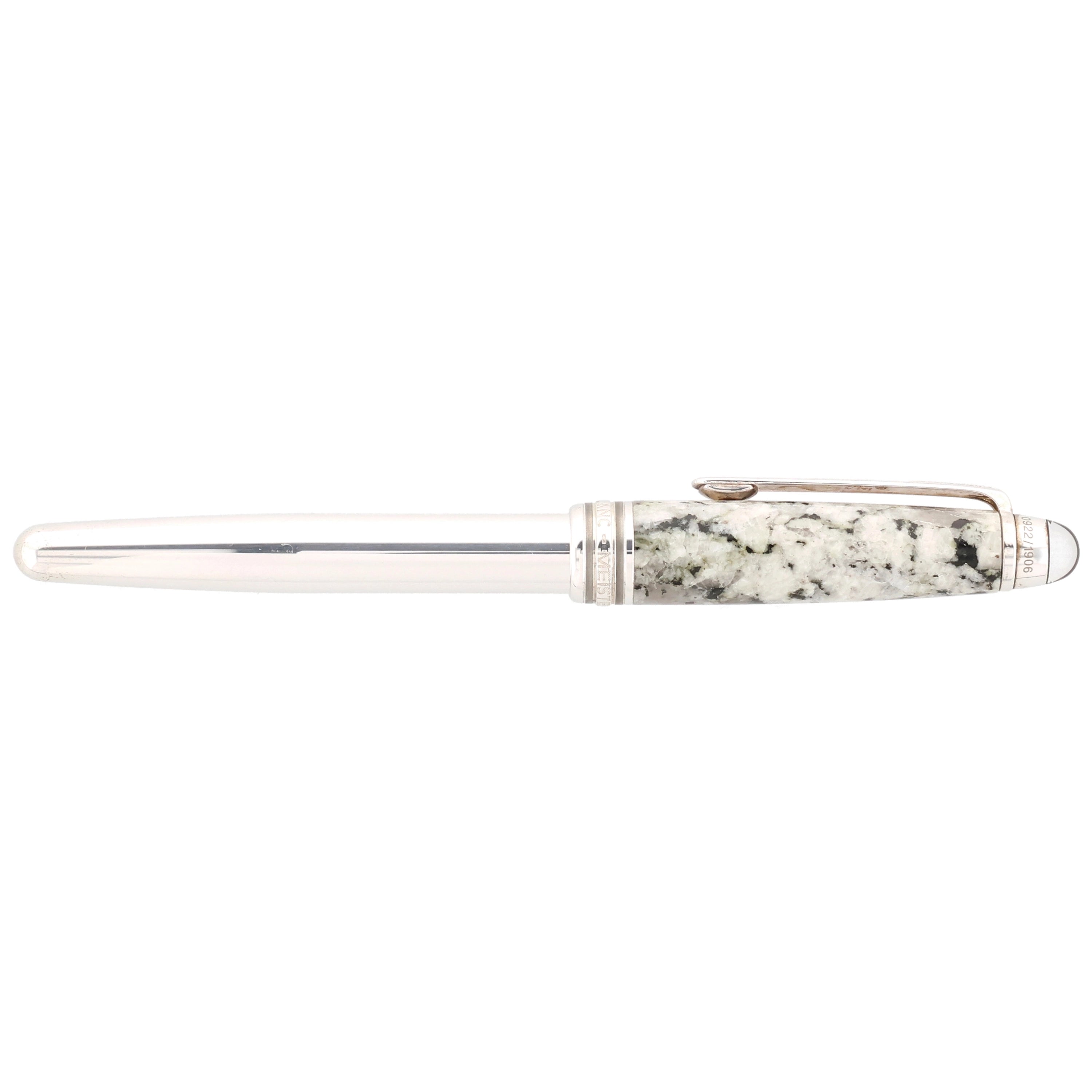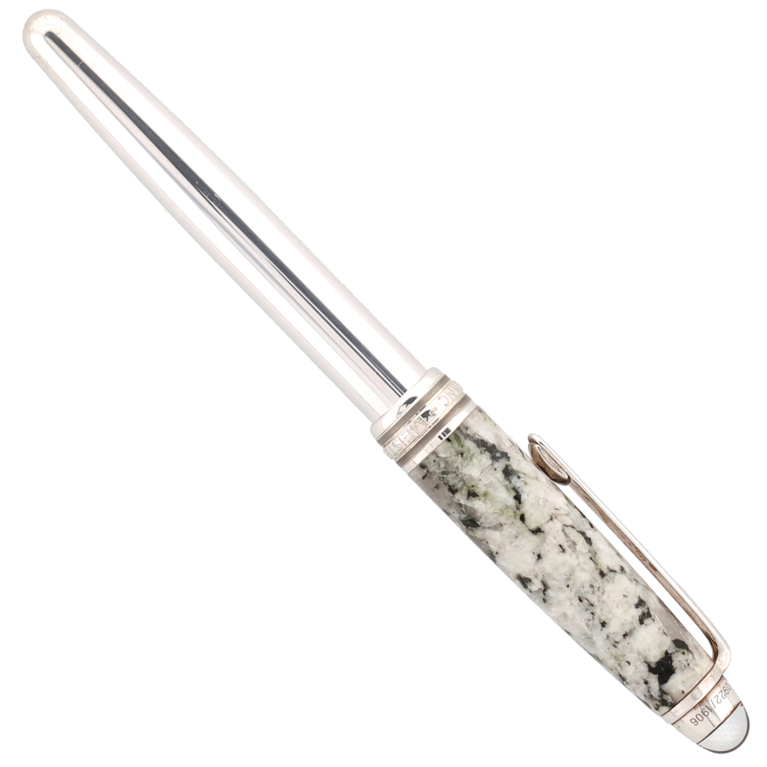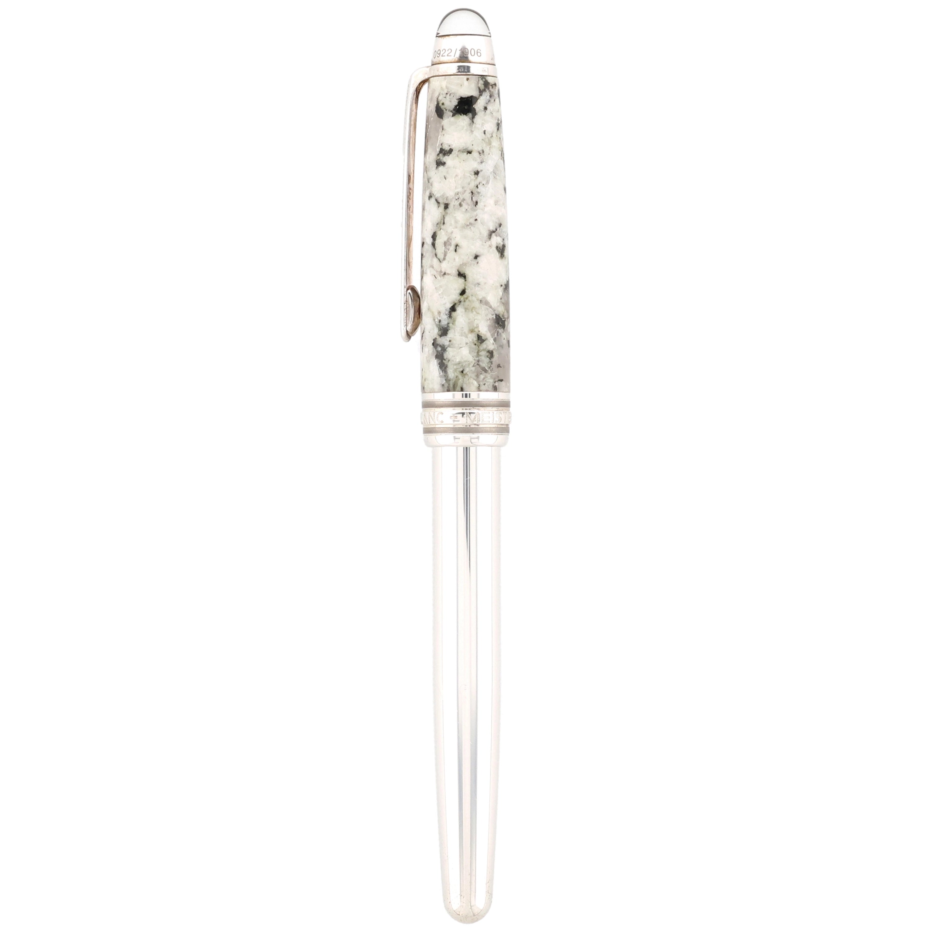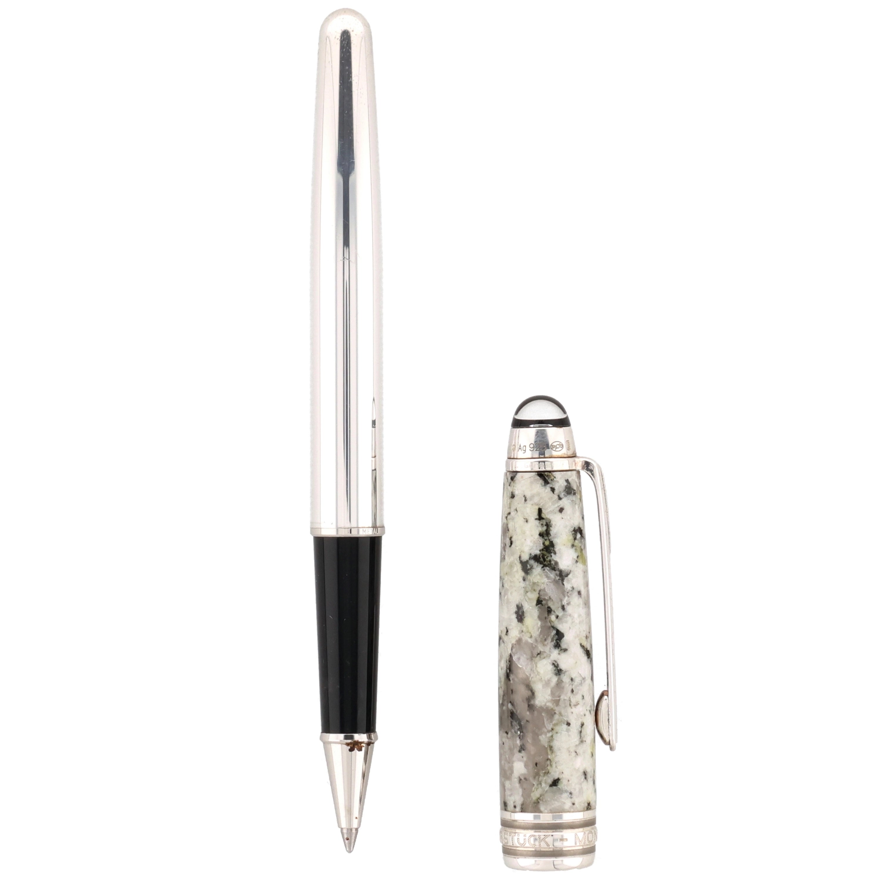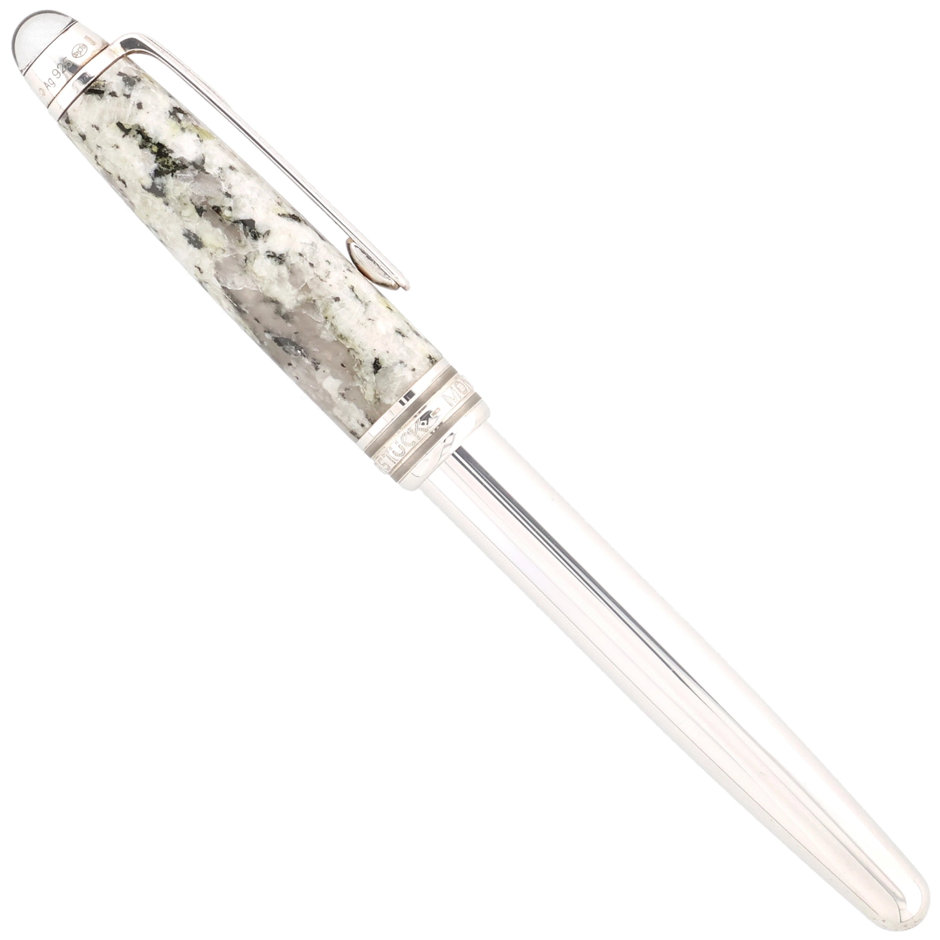 Der Korpus des Schreibgeräts wurde aus 925er Sterling Silber gefertigt. Die Kappe aus Granit bildet das zentrale Highlight und verleiht dem Schreibgerät eine markante, charaktervolle Note. Platiniert ausgeführte Details, darunter die Beschläge, fügen sich stimmig in das Gesamtbild ein und unterstreichen die klare Linie des Designs. Abgerundet wird das Erscheinungsbild durch den ,,Montblanc-Stern'' im Kappenkopf, der hier dreidimensional aus einem Diamanten gearbeitet ist.