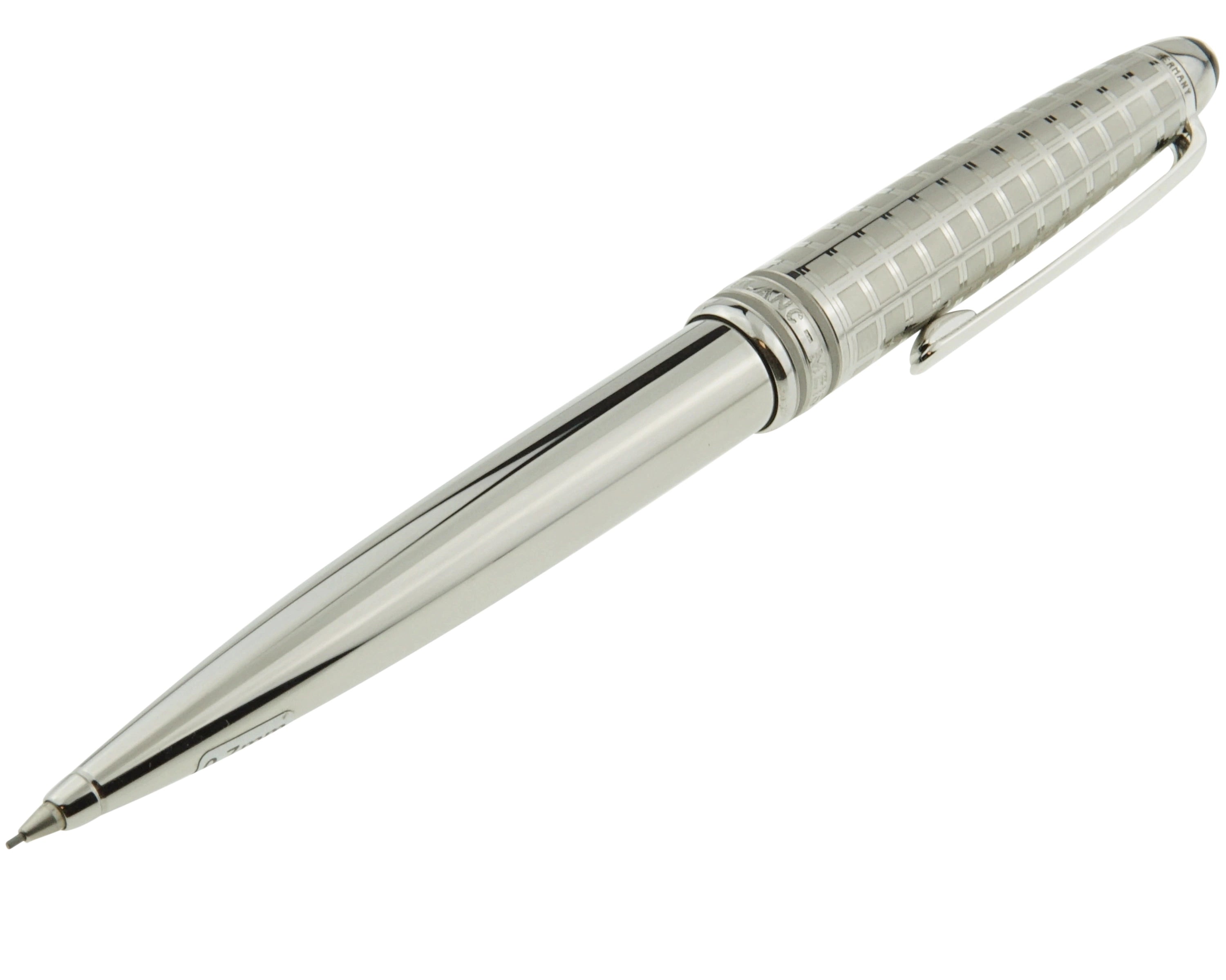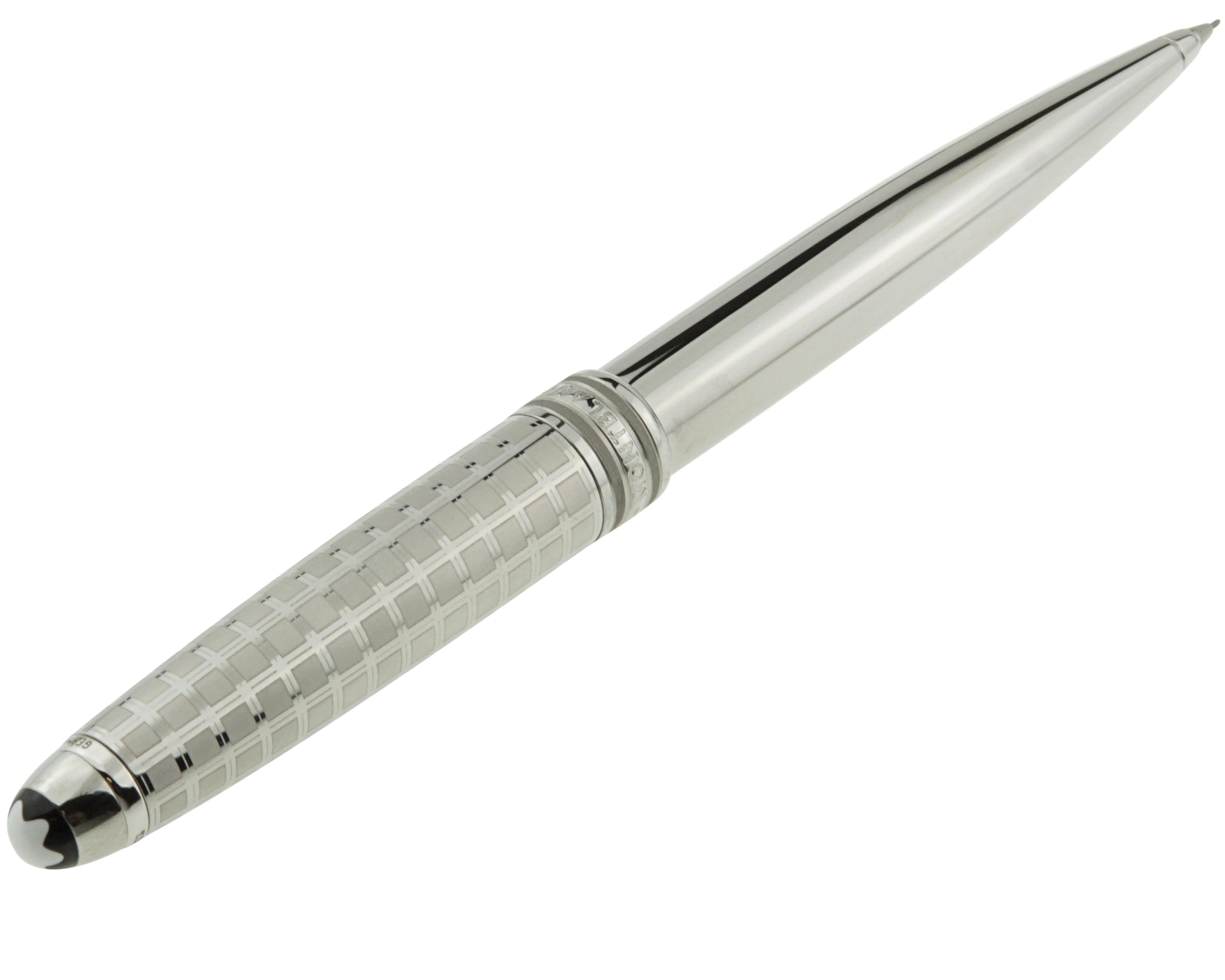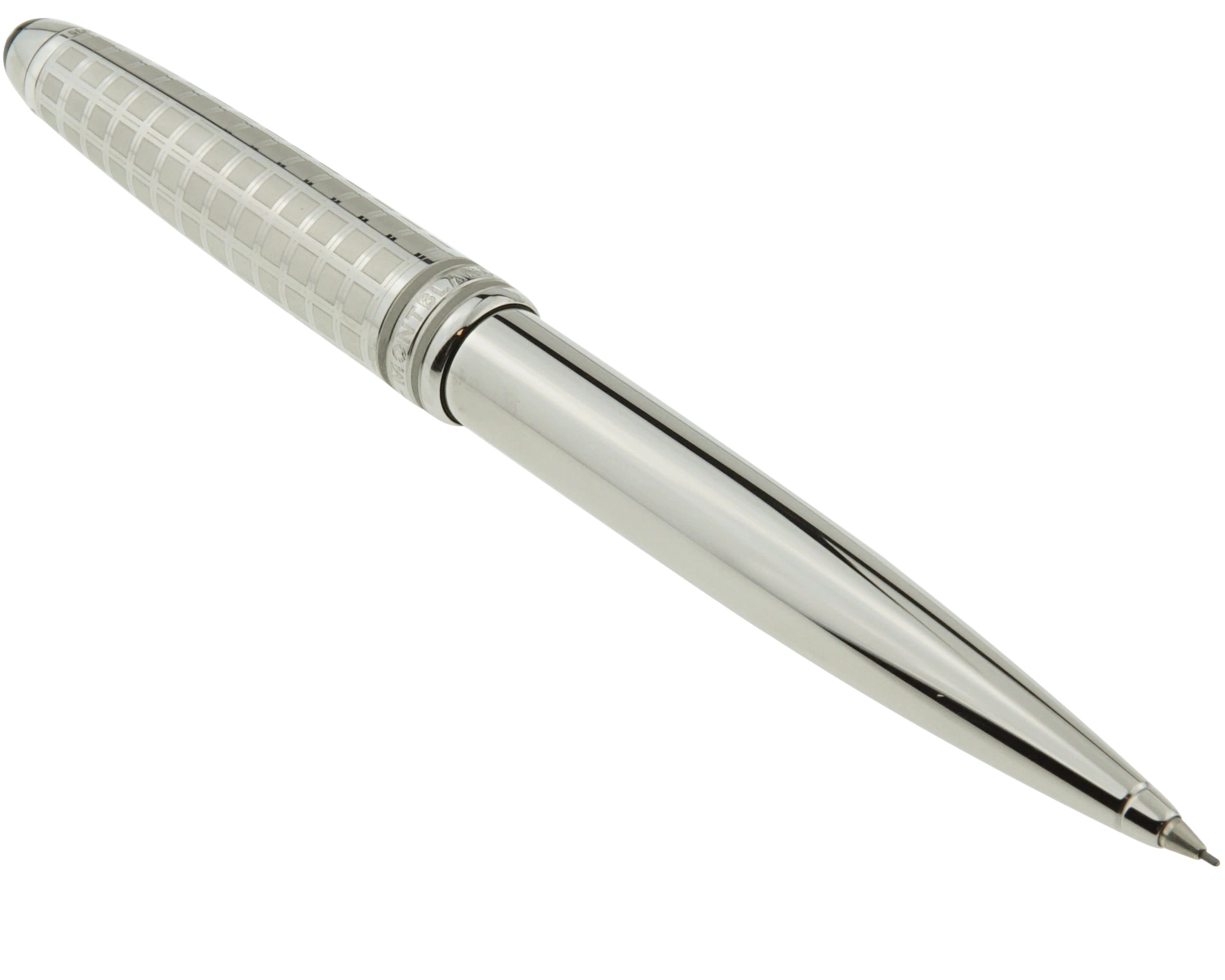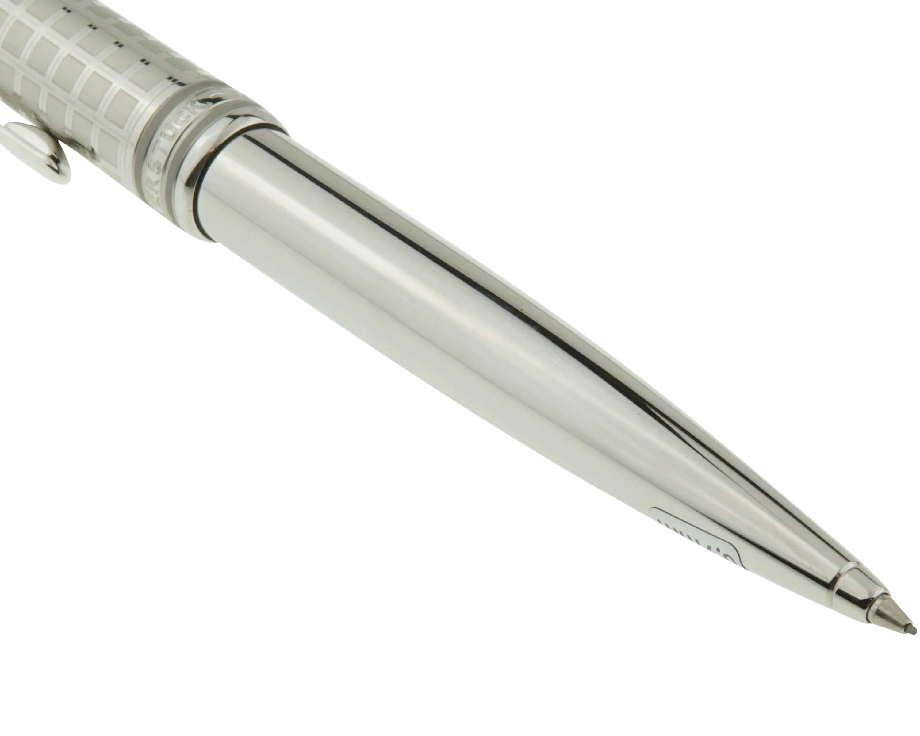 Dieses Schreibgerät beeindruckt durch seine edle Verarbeitung aus massivem Edelstahl. Die hochglanzpolierte Oberfläche verleiht ihm eine markante Ausstrahlung, während die platinierten Details wie Clip und Beschläge luxuriöse Akzente setzen. Besonderes Highlight ist die Kappe, die mit einem fein lasergravierten Karomuster veredelt wurde und dem Schreibgerät eine raffinierte, unverwechselbare Note verleiht.