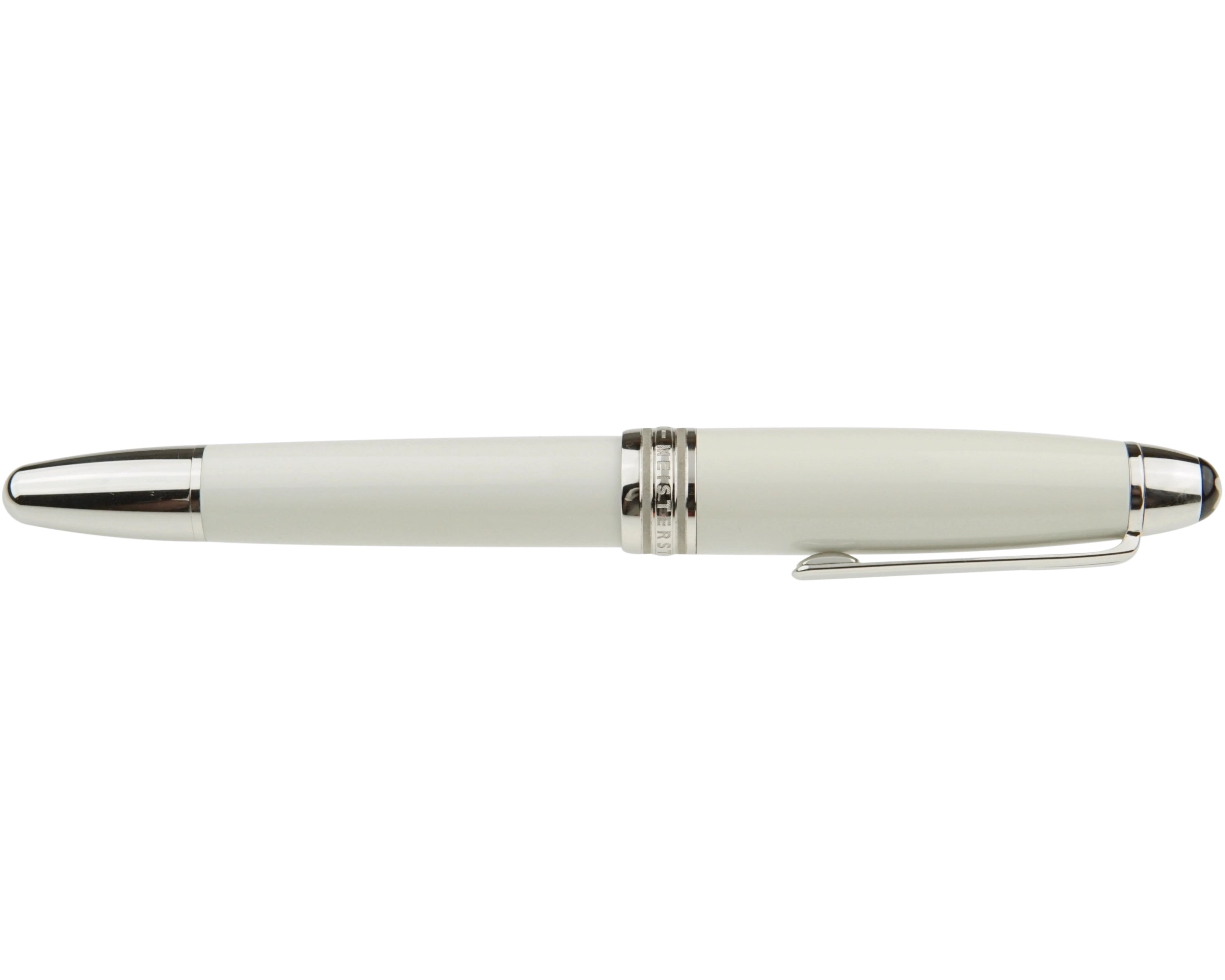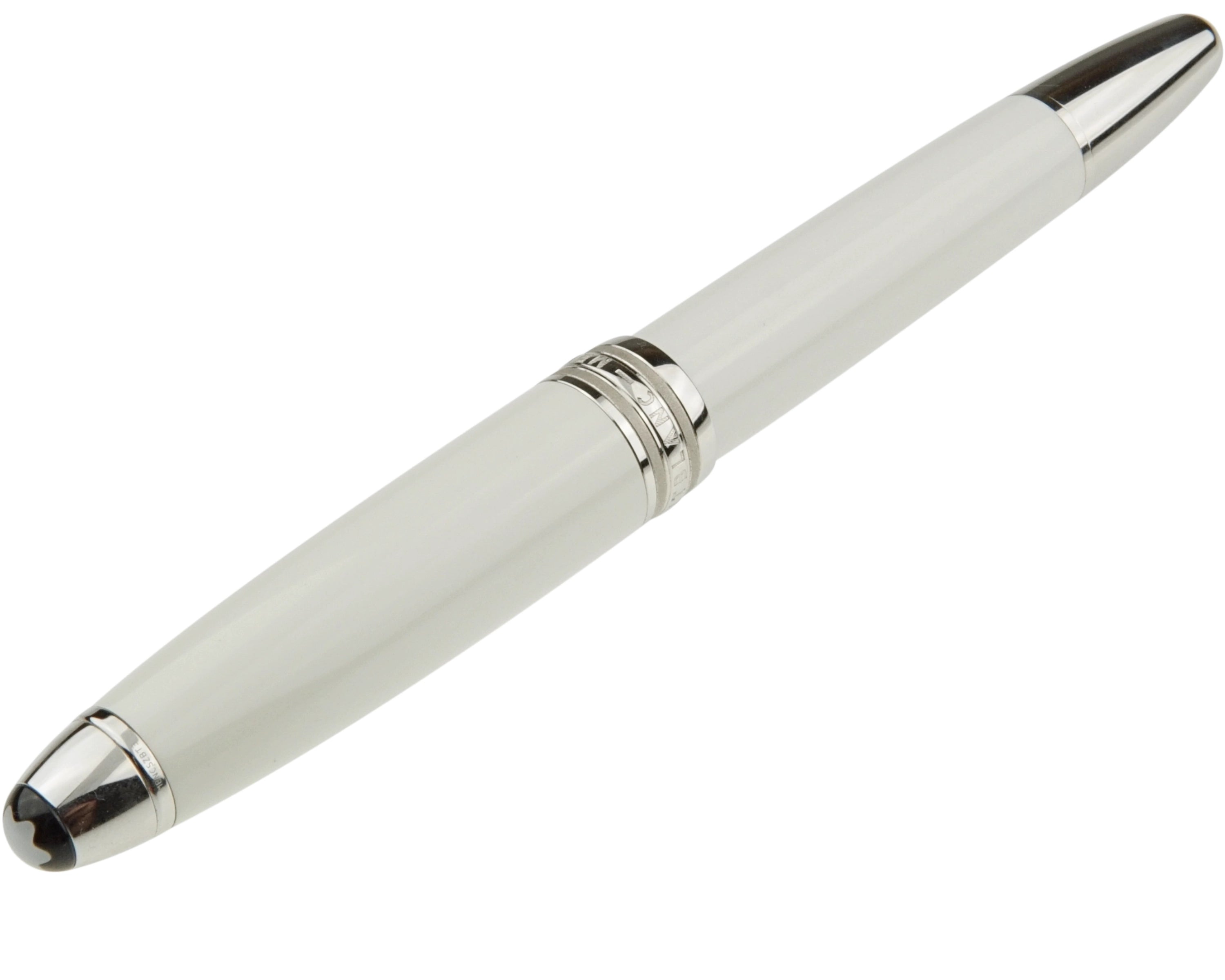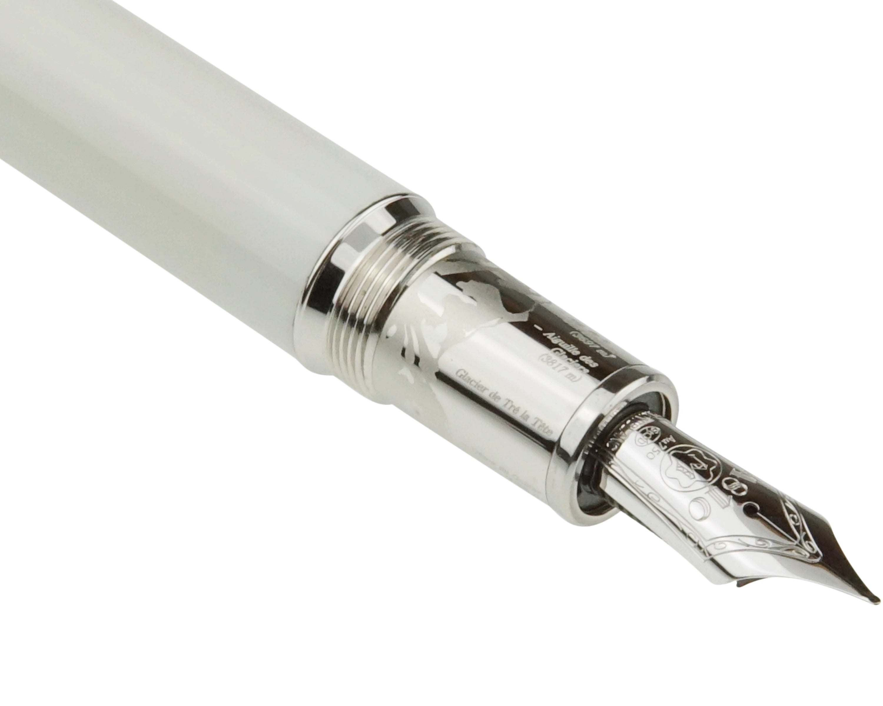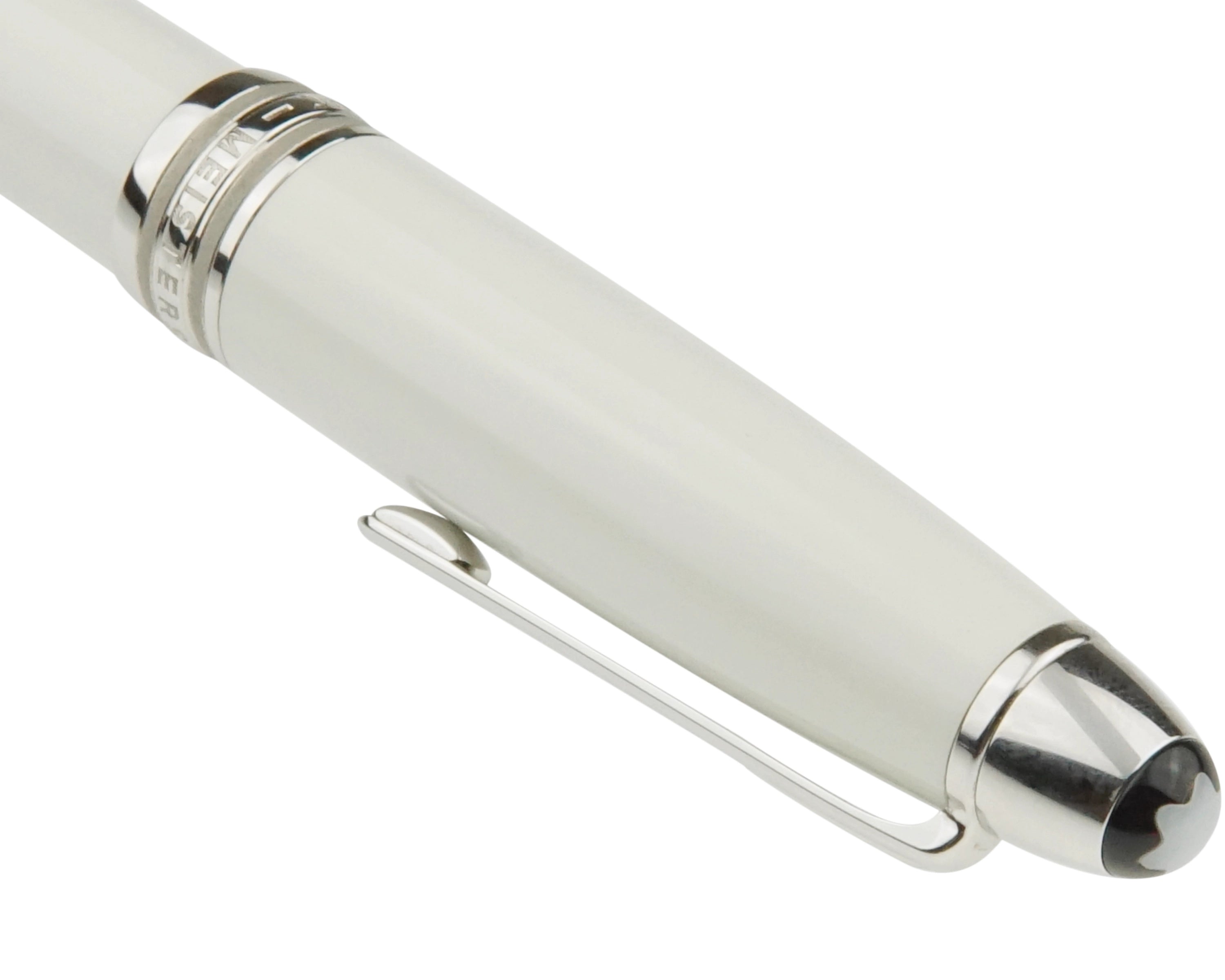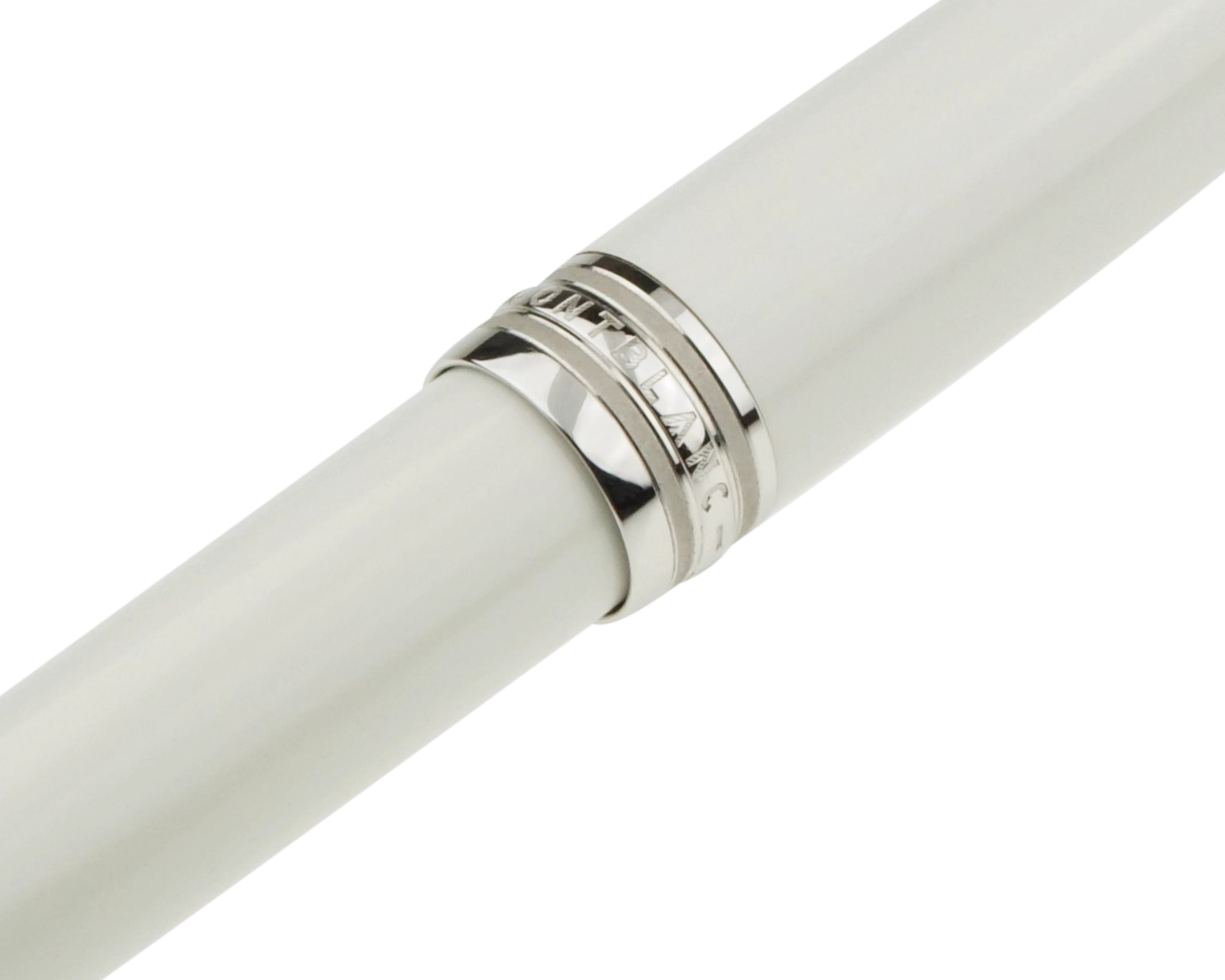 Dieses Schreibgerät wurde aus hochwertigem Messing gefertigt und mit weißem Lack überzogen. Die platinierten Details, darunter der Clip und die Beschläge, setzen edle Akzente. Besondere Highlights sind der aus Perlmutt gefertigte ,,Montblanc-Stern'' im Kappenkopf sowie die Gravur des Mont Blanc Gebirges auf dem Griffstück des Schreibgeräts, die das Design harmonisch abrunden.