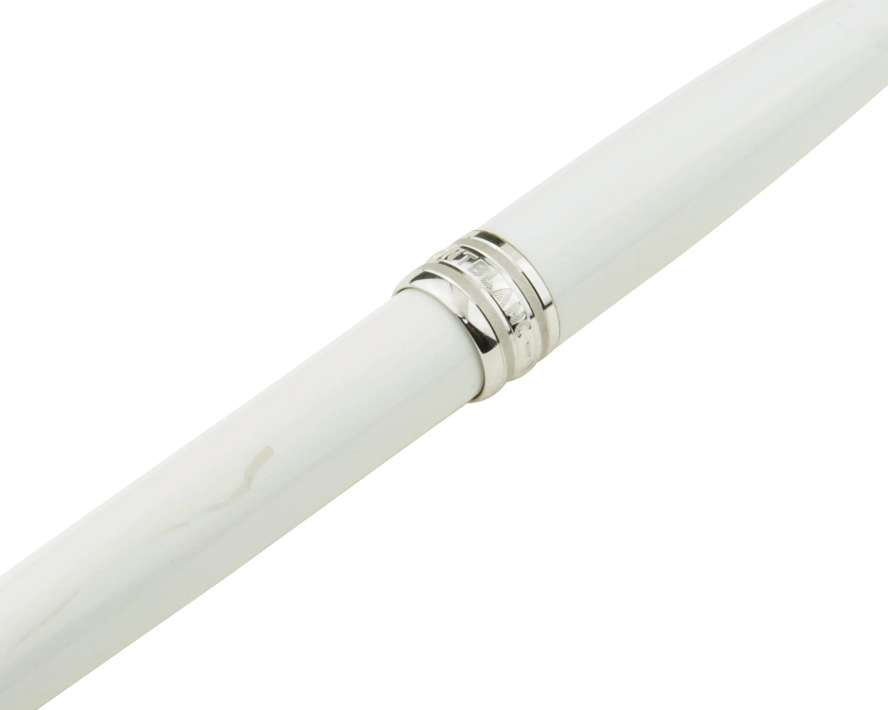 Dieses Schreibgerät wurde aus hochwertigem Messing gefertigt und mit weißem Lack überzogen. Die platinierten Details, darunter der Clip und die Beschläge, setzen edle Akzente. Besondere Highlights sind der aus Perlmutt gefertigte ,,Montblanc-Stern'' im Kappenkopf sowie die Gravur des Mont Blanc Gebirges auf der Spitze des Schreibgeräts, die das Design harmonisch abrunden.