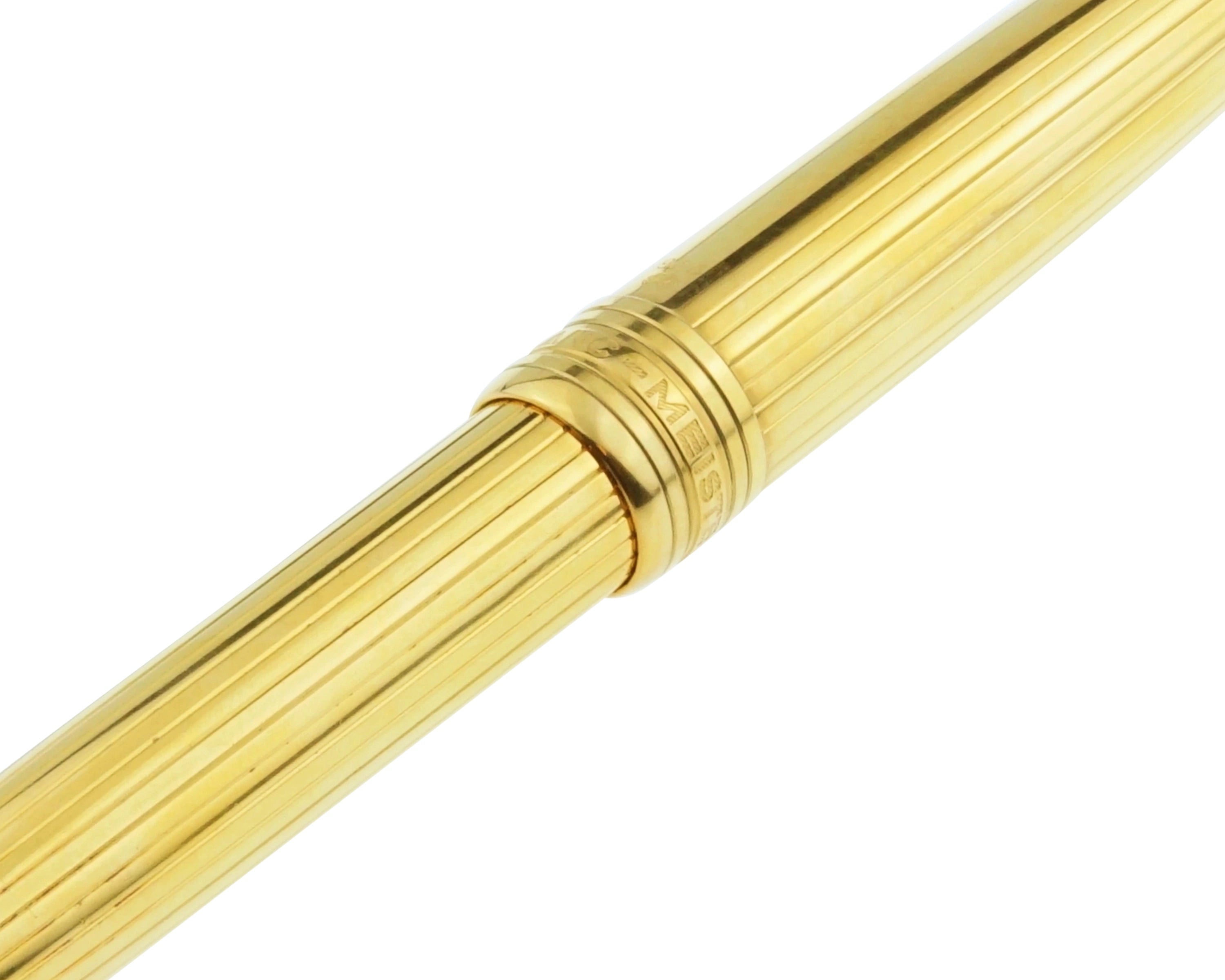 Das Schreibgerät wurde Vermeil vergoldet, das heißt die Grundlage von der Kappe und dem Korpus stellt 925er Sterling Silber dar, welches anschließend vergoldet wurde. Die ebenfalls vergoldeten Details, darunter der Clip und die Beschläge, setzen luxuriöse Akzente. Ein besonderes optisches und haptisches Highlight bildet die edle Faden-Guilloche, deren filigranes Muster die Oberfläche des Schreibgeräts ziert.