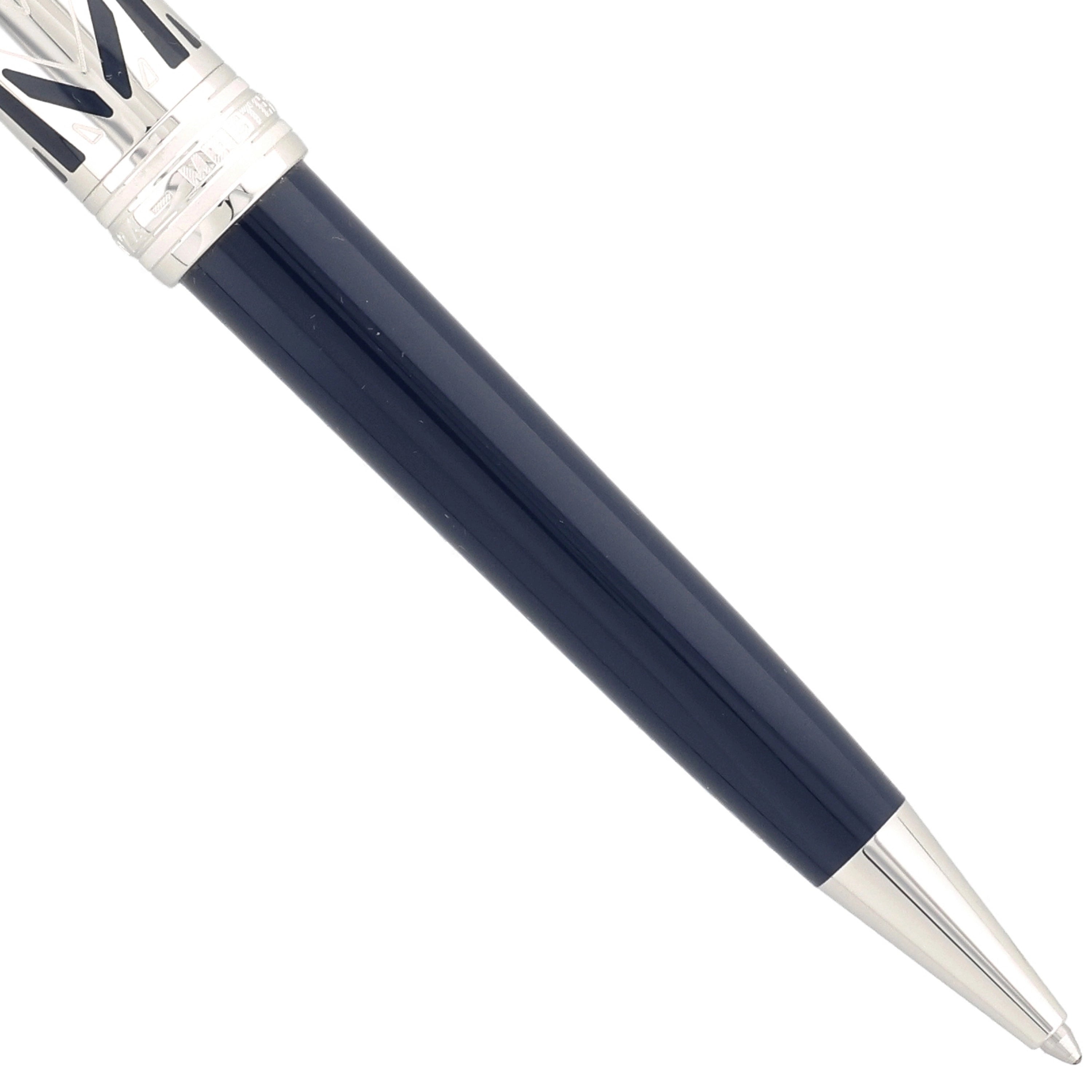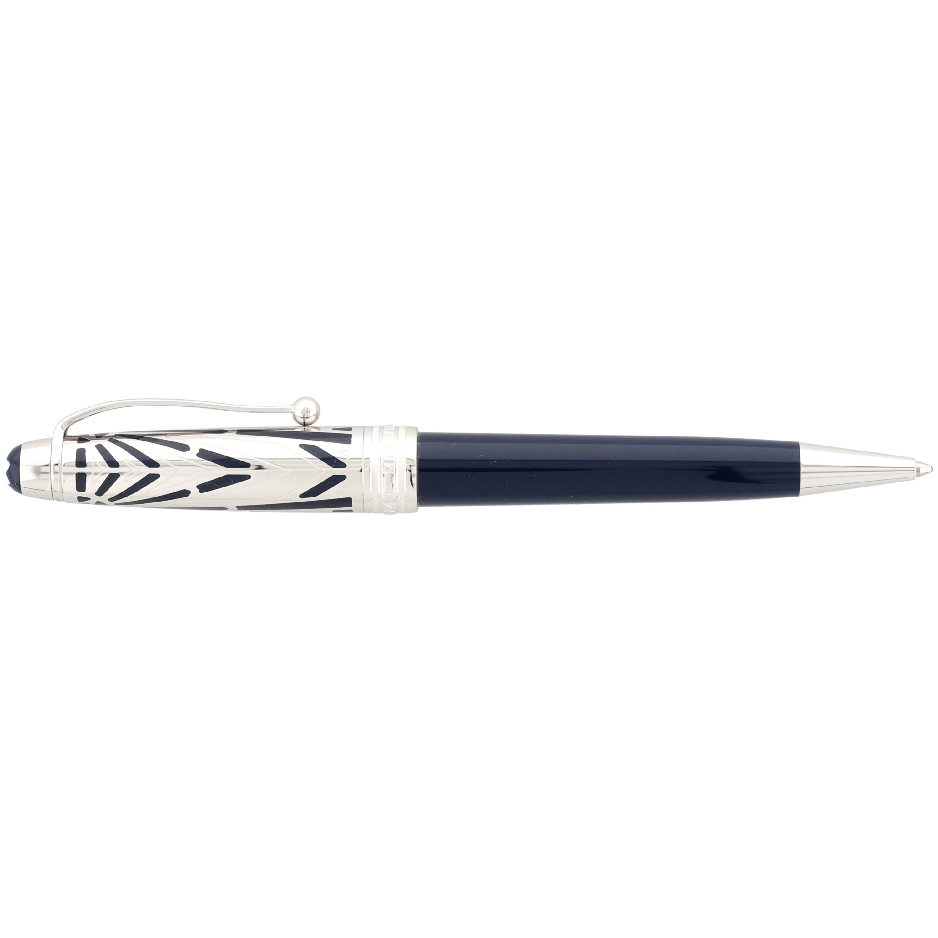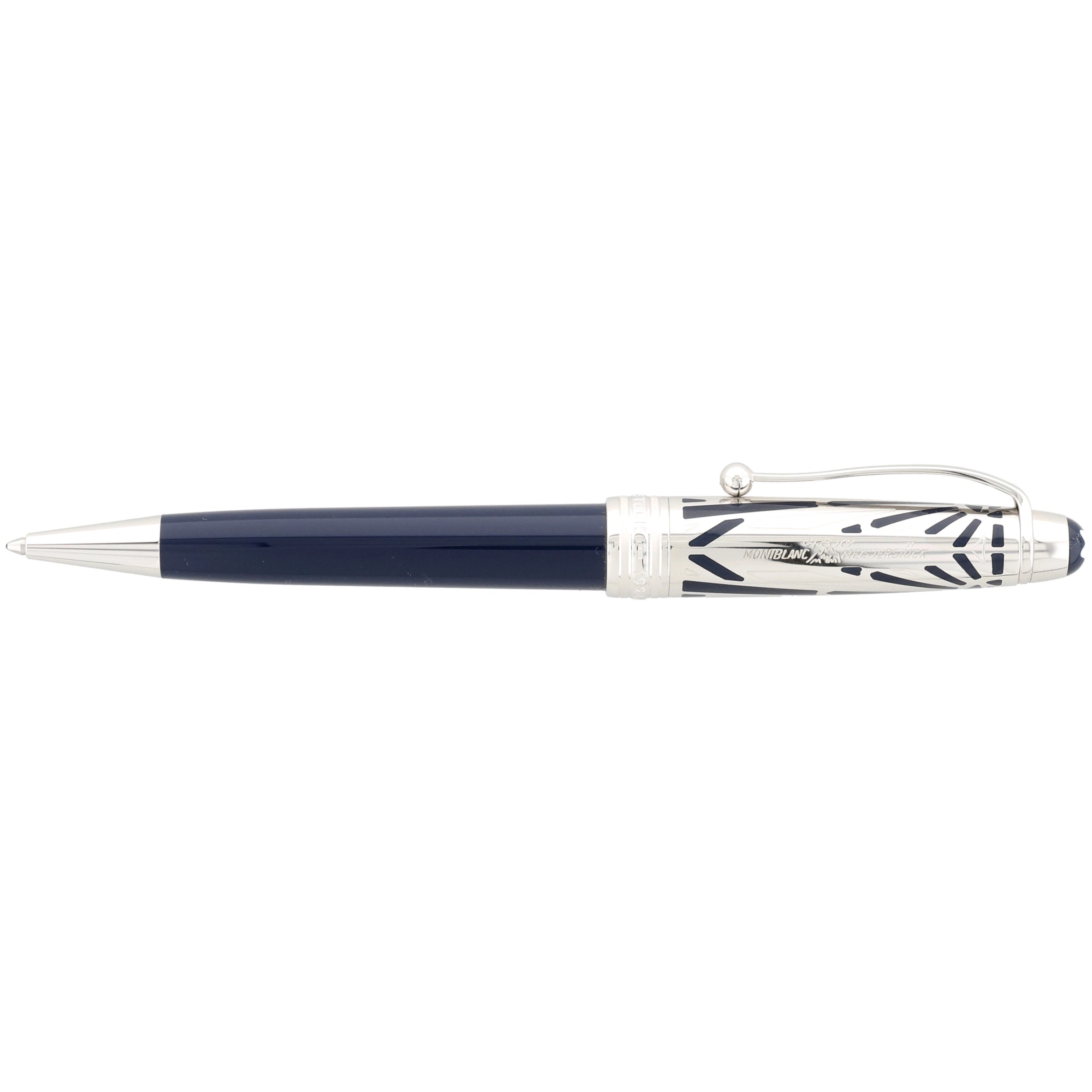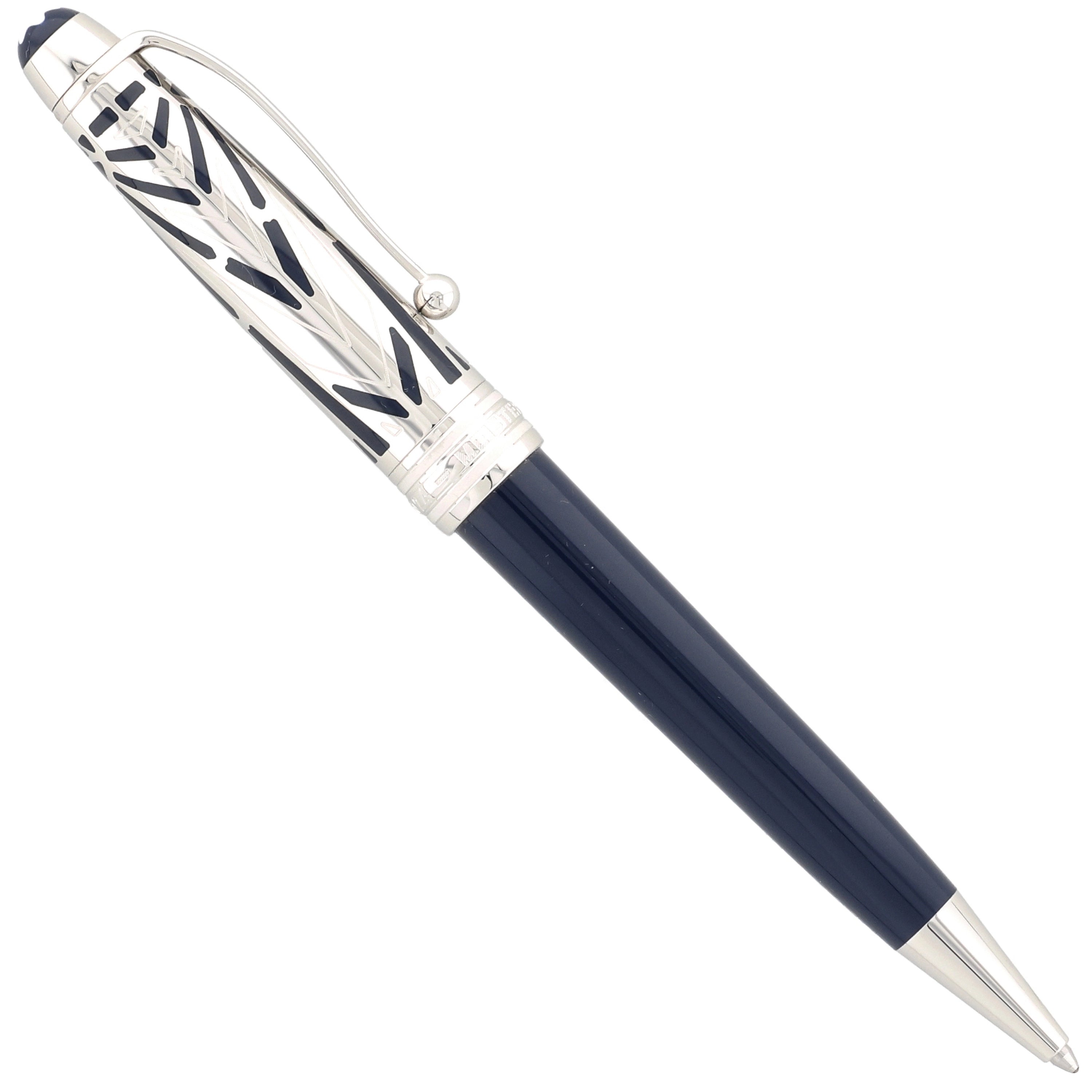 Der Korpus des Schreibgeräts ist aus tiefblauem Edelharz gefertigt. Die Kappe ist platiniert und mit blauen Lackintarsien veredelt, deren Musterung auf ein historisches, bisher nie realisiertes Design aus den Archiven von Montblanc zurückgeht. Der platinierte Clip, inspiriert von frühen Meisterstück-Kreationen, strahlt nostalgischen Charme aus. Ein besonderes Detail bildet der Kappenring mit der Gravur „Meisterstück - 1924 - 2024“, eine Hommage an das hundertjährige Jubiläum der legendären Meisterstück-Serie.