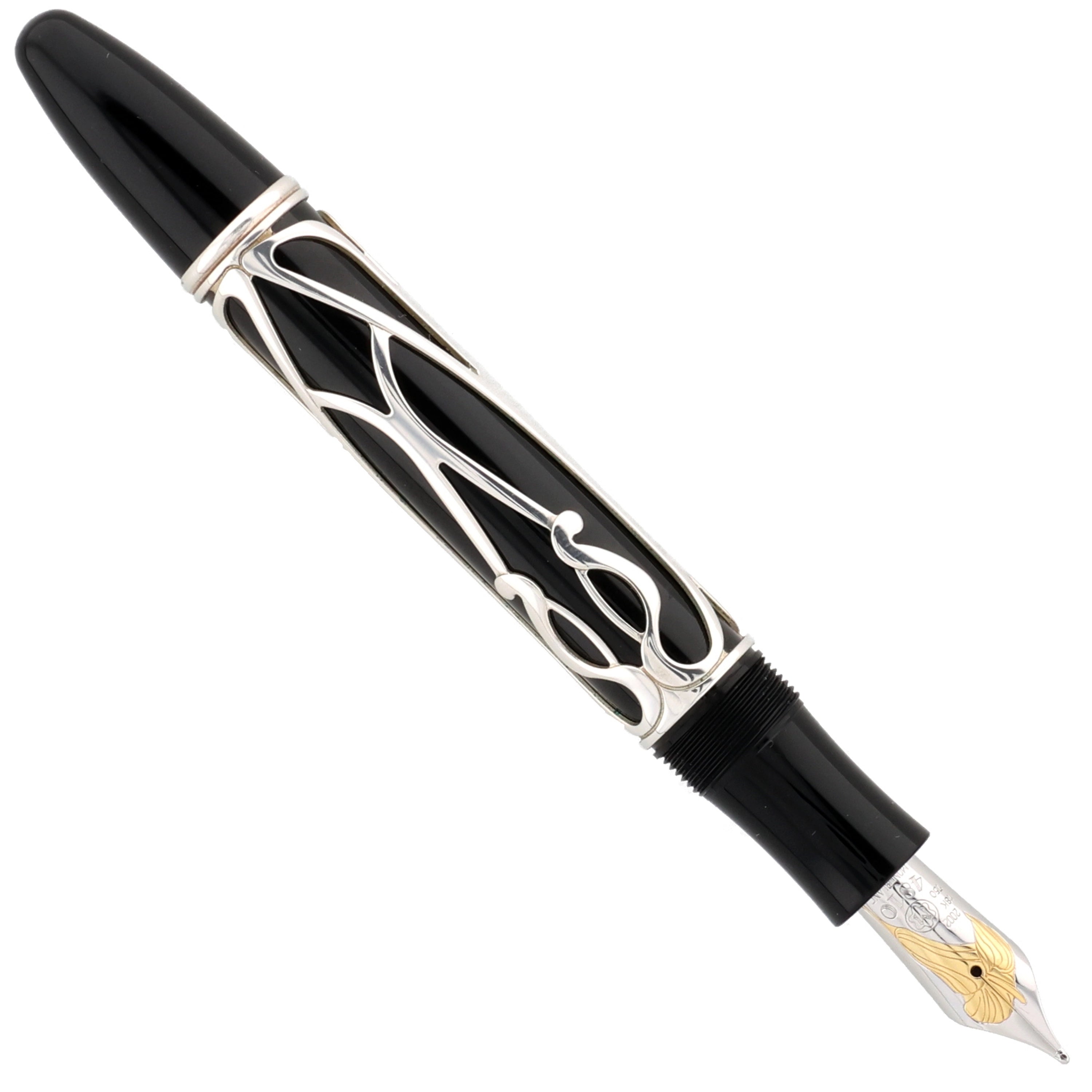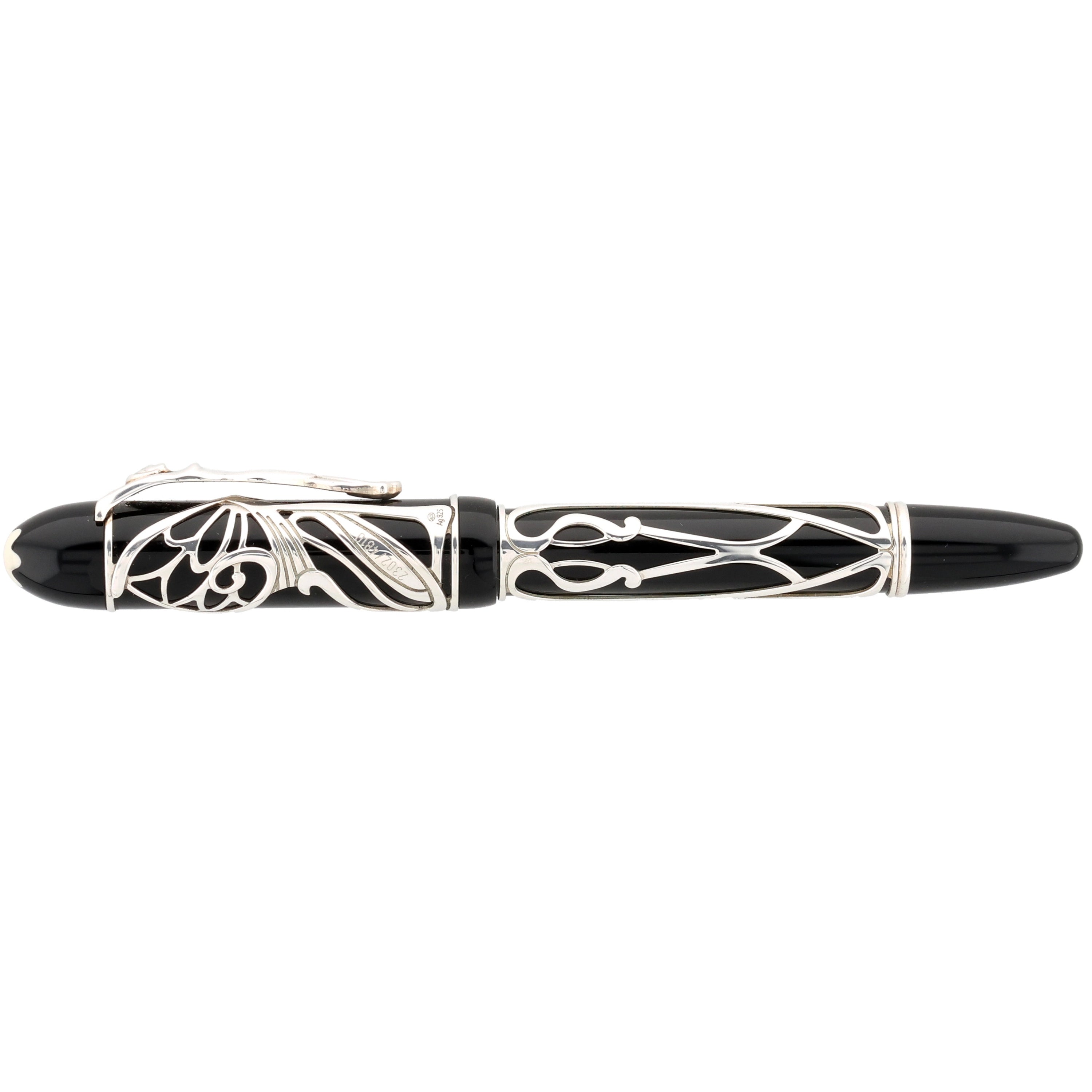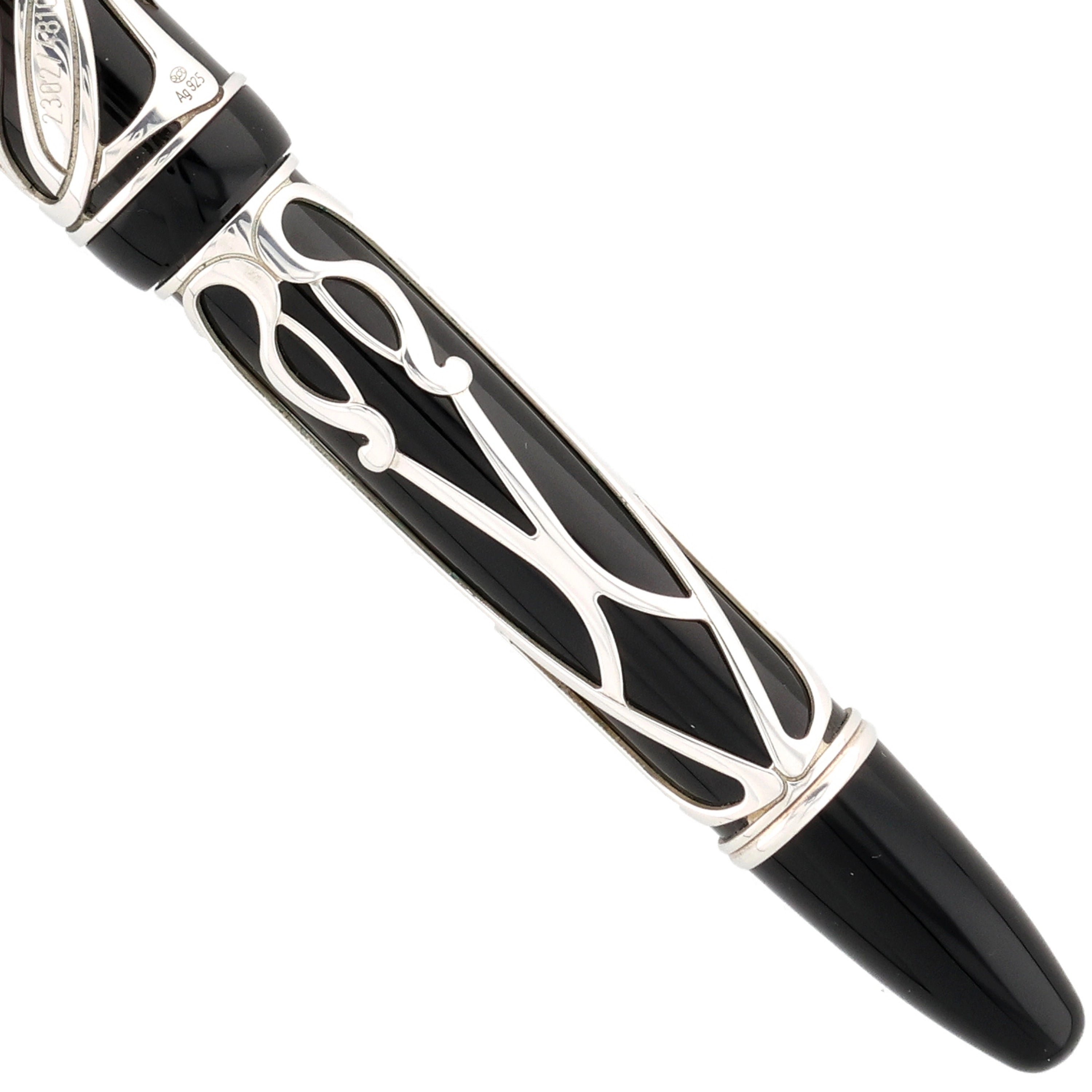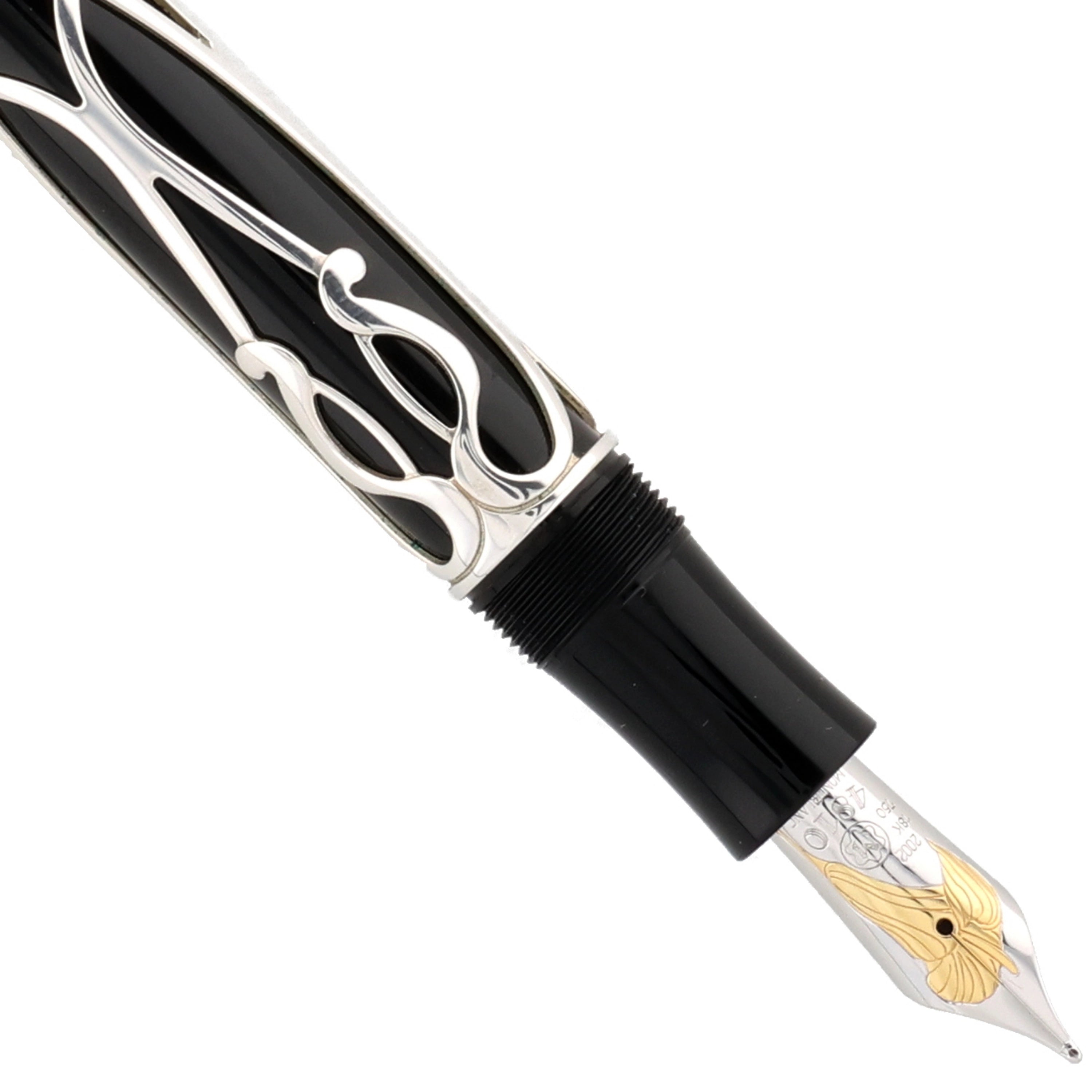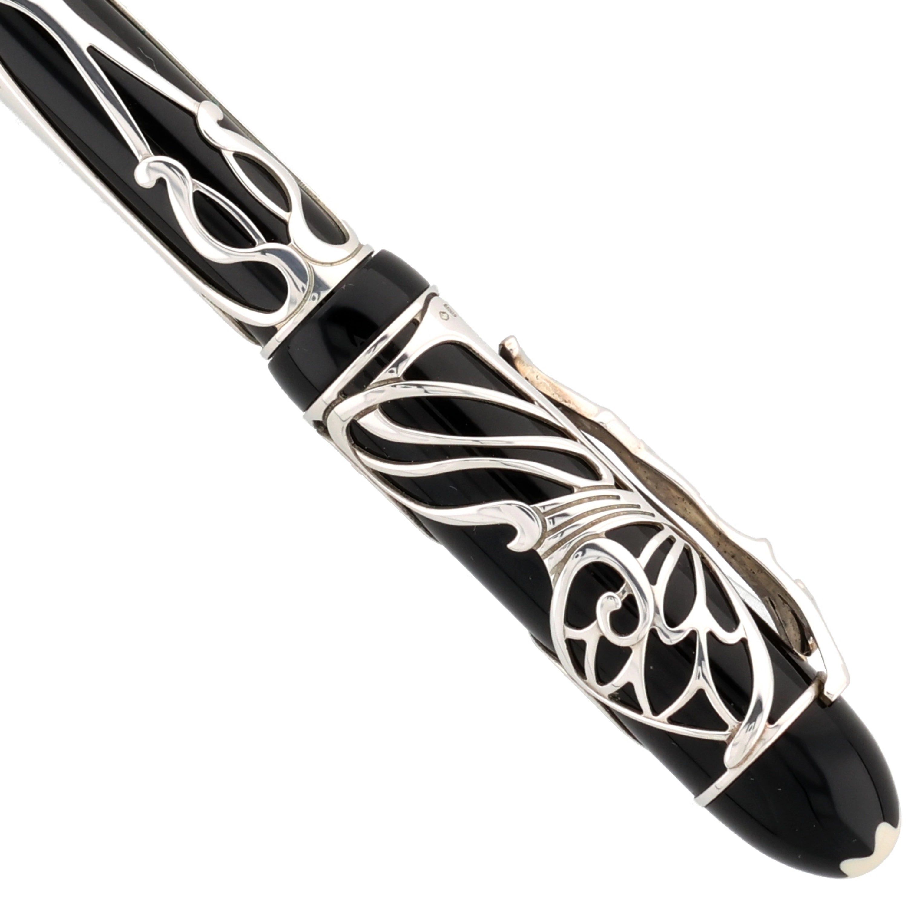 Dieses Schreibgerät besteht aus tiefschwarzem, hochwertigem Edelharz und ist kunstvoll mit einem tollen Overlay aus Sterling-Silber (925er Silber) versehen. Die filigran ausgearbeiteten Ornamente spiegeln die Ästhetik des Jugendstils wider, den Andrew Carnegie besonders förderte. Der Clip zeigt eine elegante weibliche Figur mit ausgebreiteten Flügeln, die sich harmonisch um die Kappe legt und einen ausdrucksstarken, dynamischen Kontrast zum schwarzen Edelharz bildet.