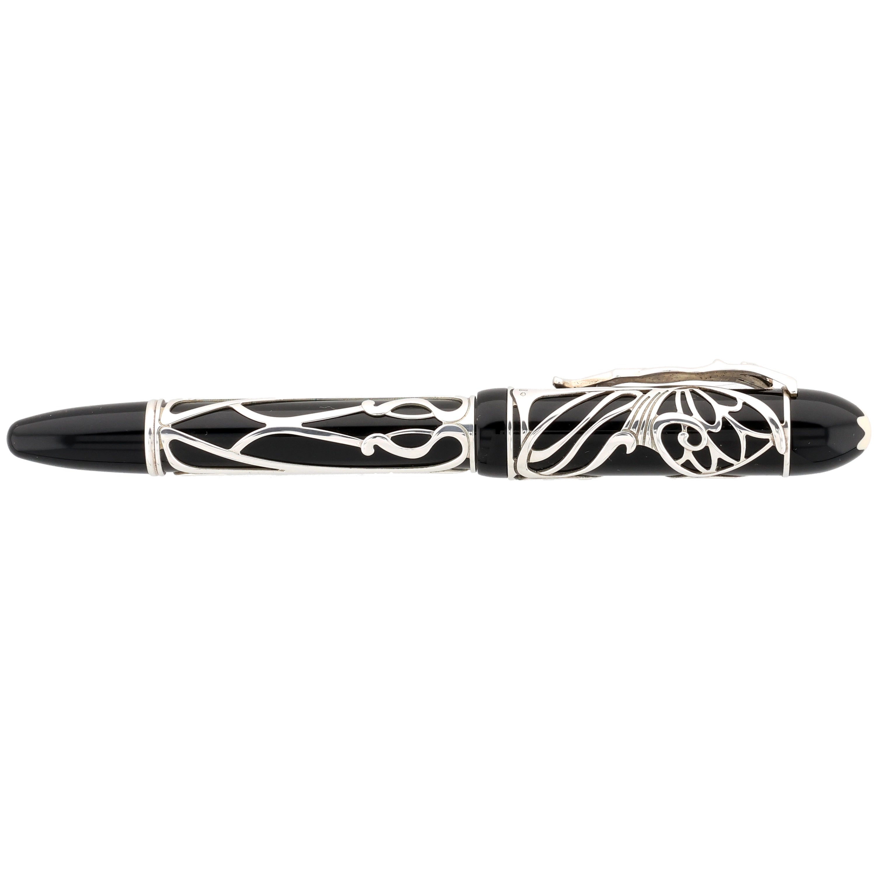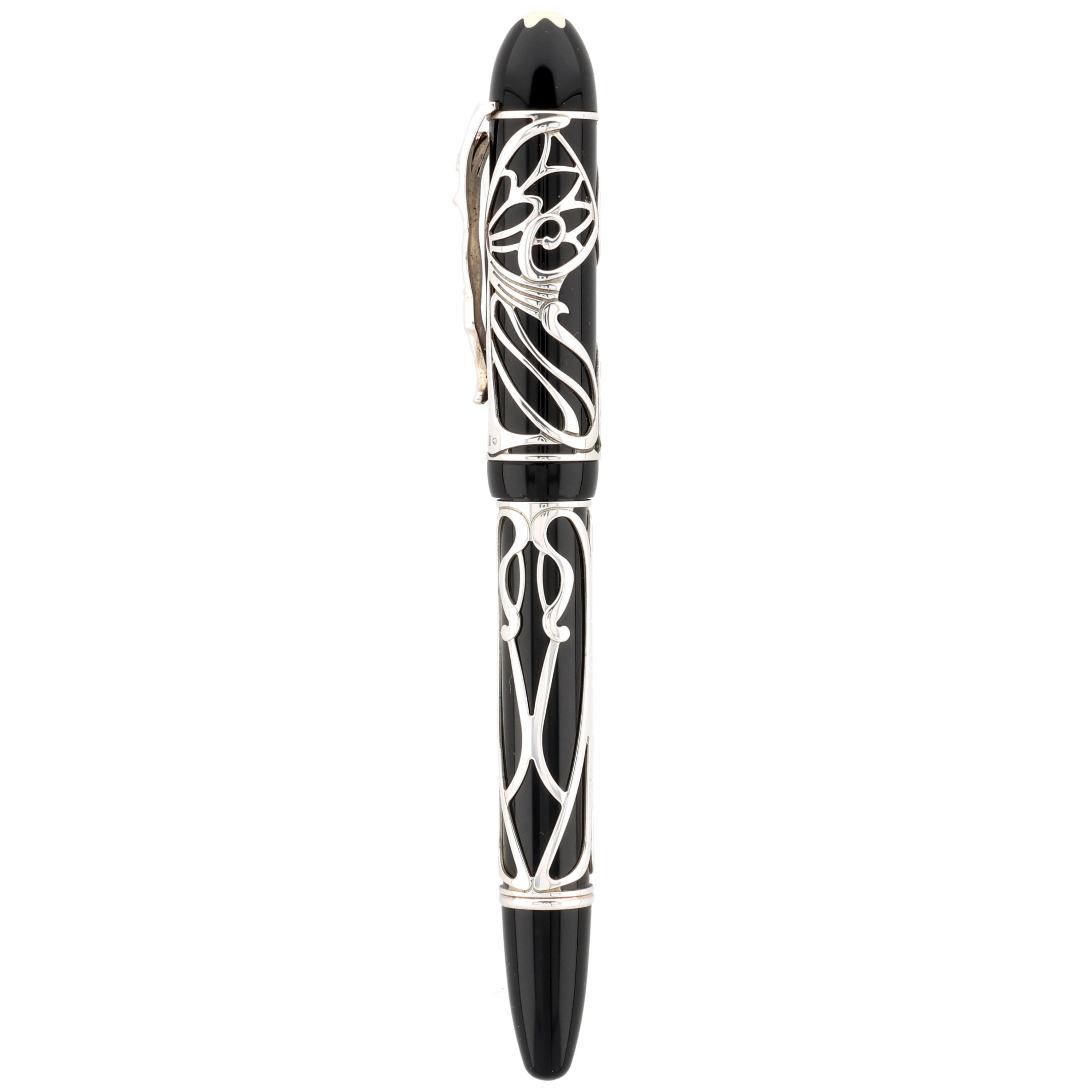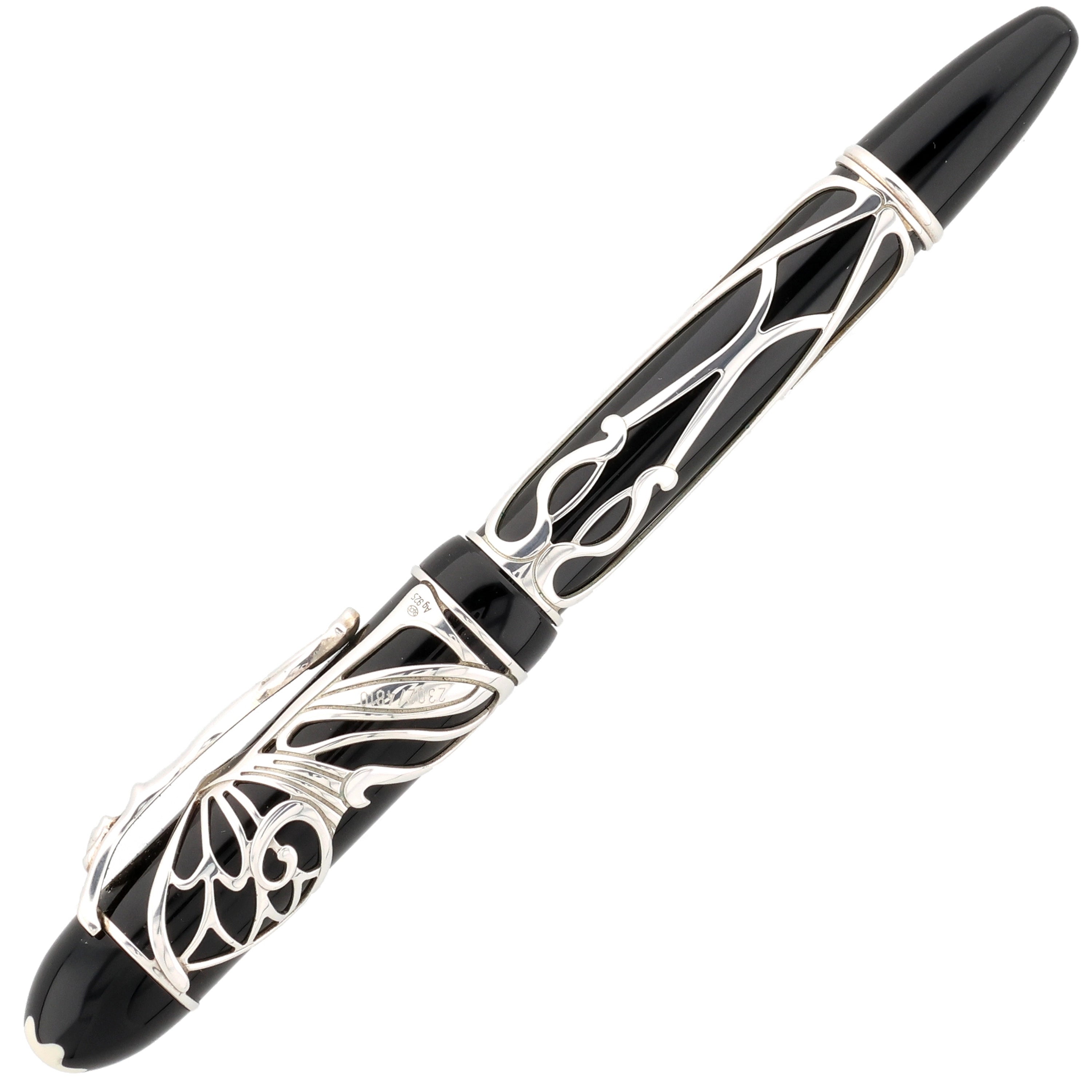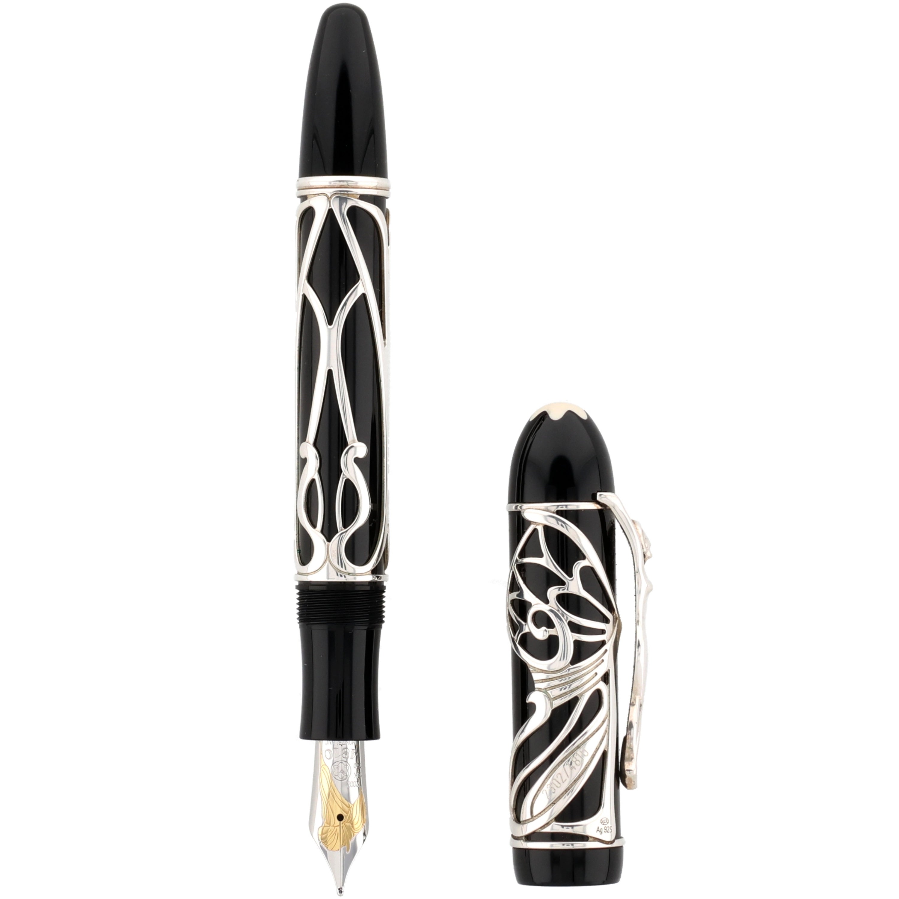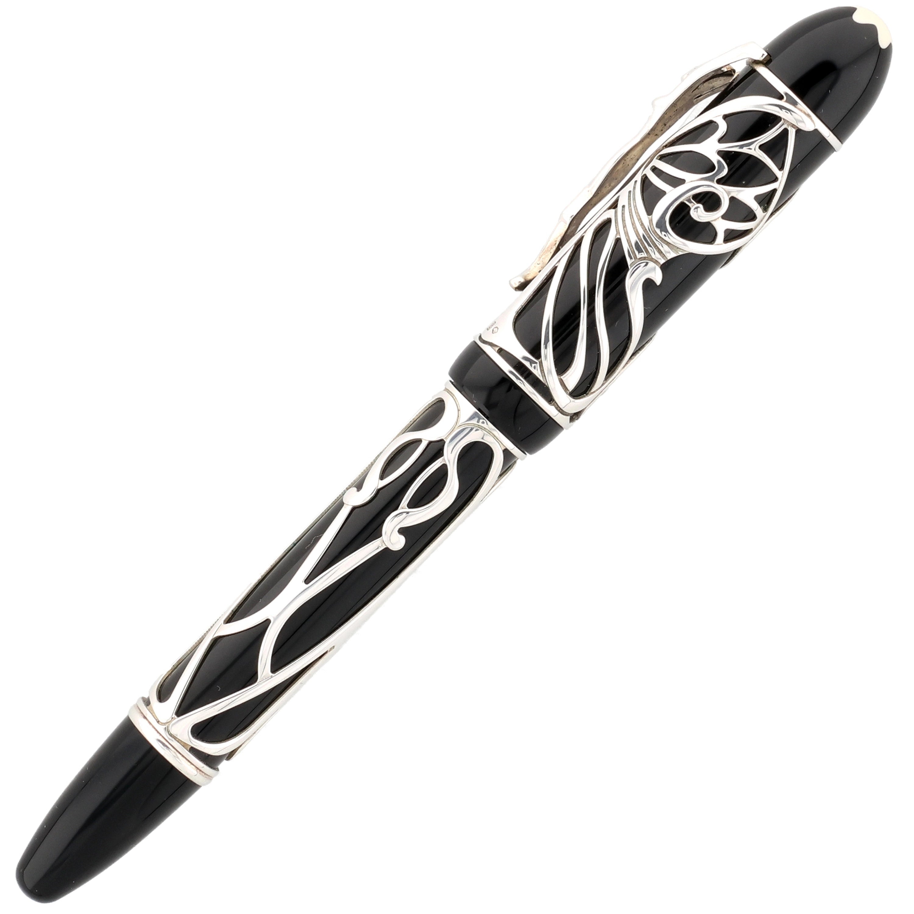 Dieses Schreibgerät besteht aus tiefschwarzem, hochwertigem Edelharz und ist kunstvoll mit einem tollen Overlay aus Sterling-Silber (925er Silber) versehen. Die filigran ausgearbeiteten Ornamente spiegeln die Ästhetik des Jugendstils wider, den Andrew Carnegie besonders förderte. Der Clip zeigt eine elegante weibliche Figur mit ausgebreiteten Flügeln, die sich harmonisch um die Kappe legt und einen ausdrucksstarken, dynamischen Kontrast zum schwarzen Edelharz bildet.
