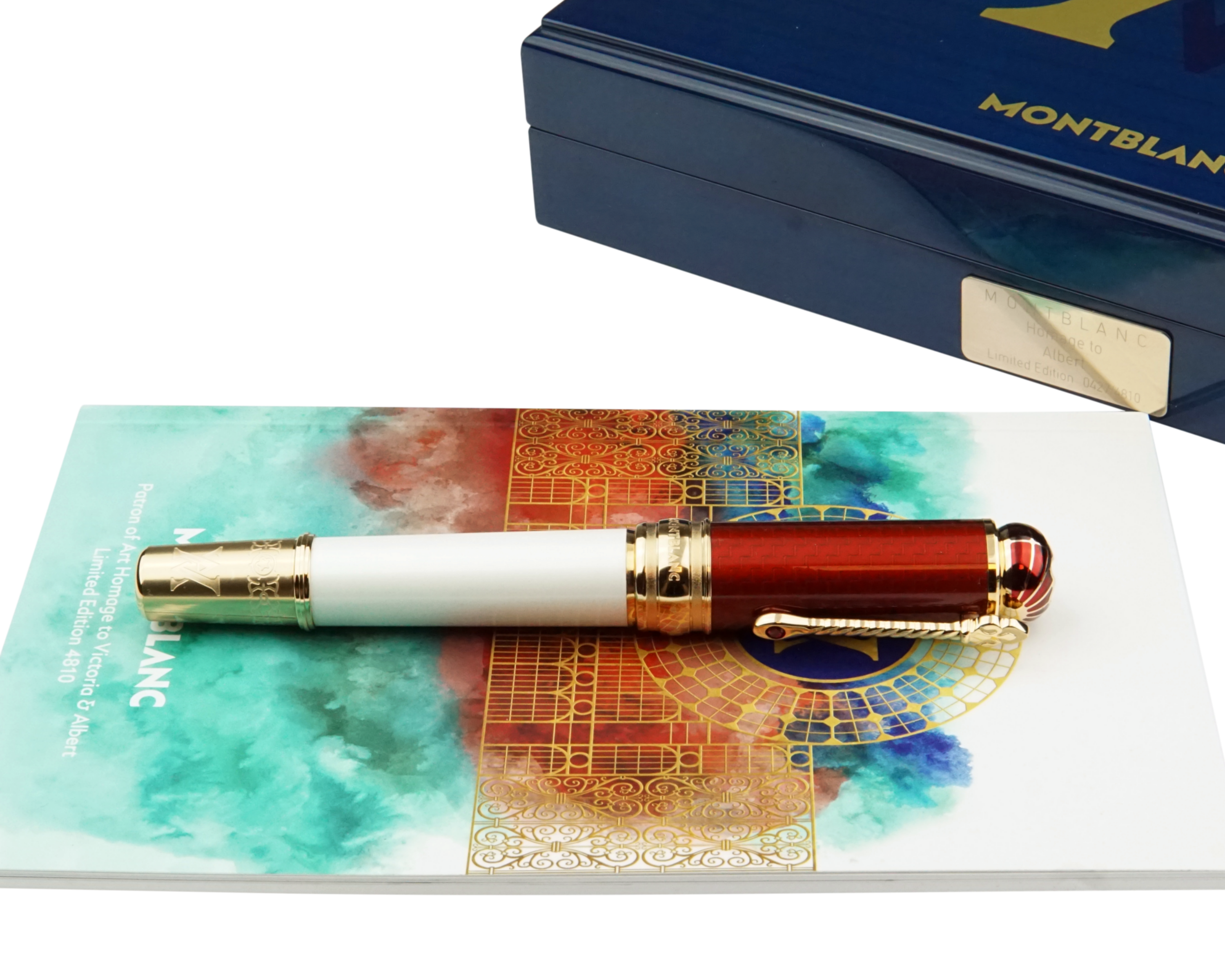 Dieser Schreiber vereint elegante Farbgebung mit kunstvollen Details. Der Korpus ist mit weißem, die Kappe mit bordeauxrotem Lack veredelt. Vergoldete Elemente, wie das End- und Griffstück, setzen luxuriöse Akzente. Der ebenfalls vergoldete Clip, inspiriert vom Zepter seiner Ehefrau Victoria, wird von einem roten synthetischen Stein geziert. Der Kappenkopf greift die Architektur des Crystal Palace auf, während die Feder eine filigrane Prägung des sächsischen Wappens trägt.