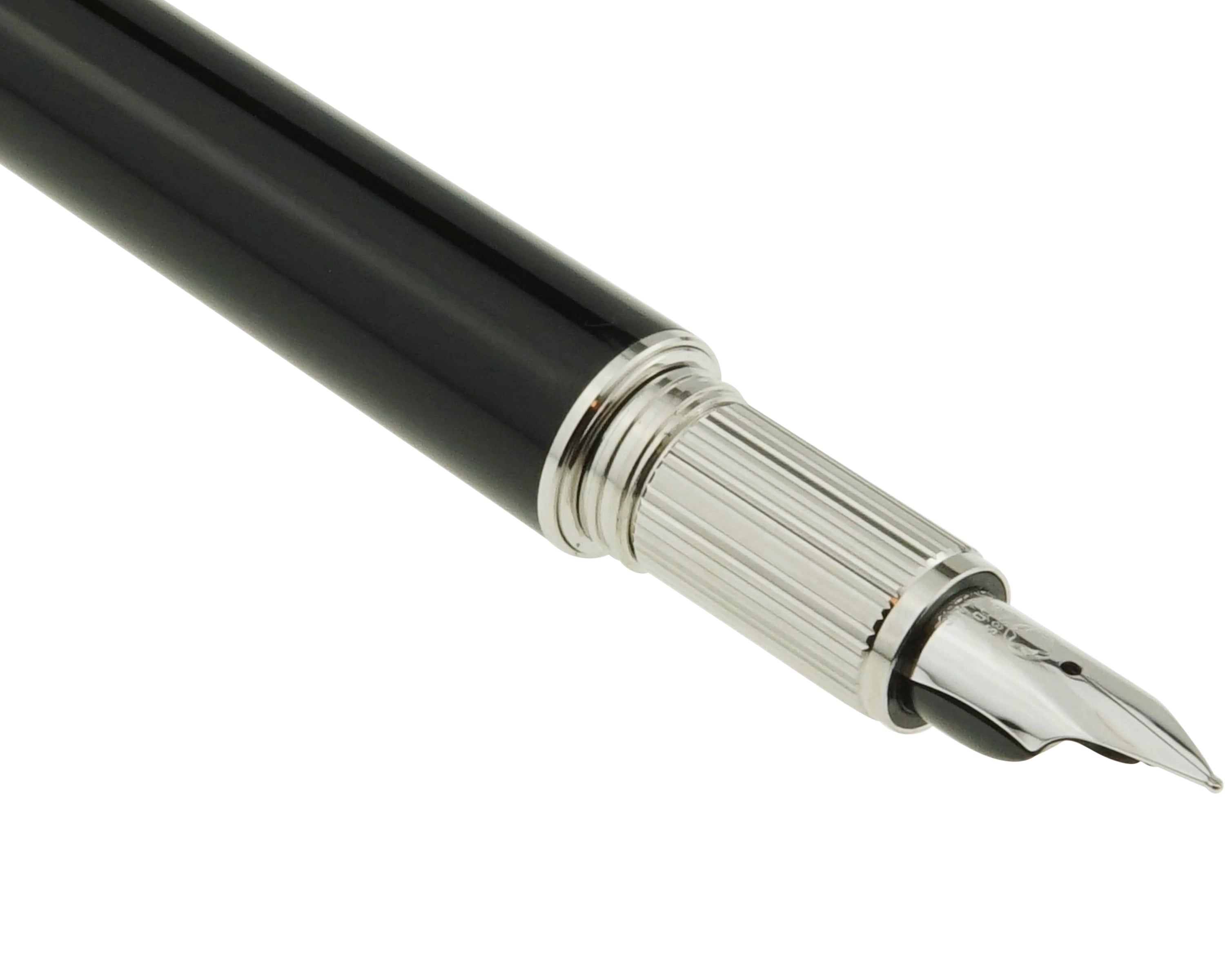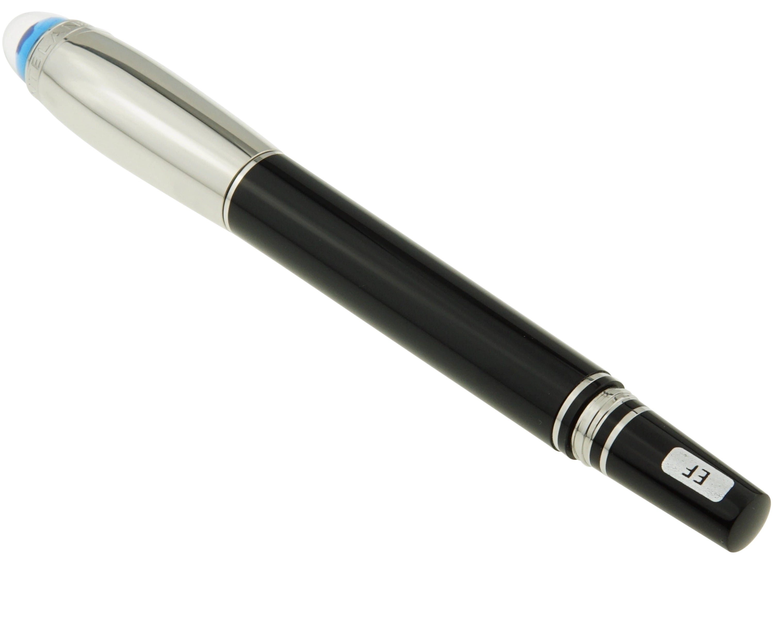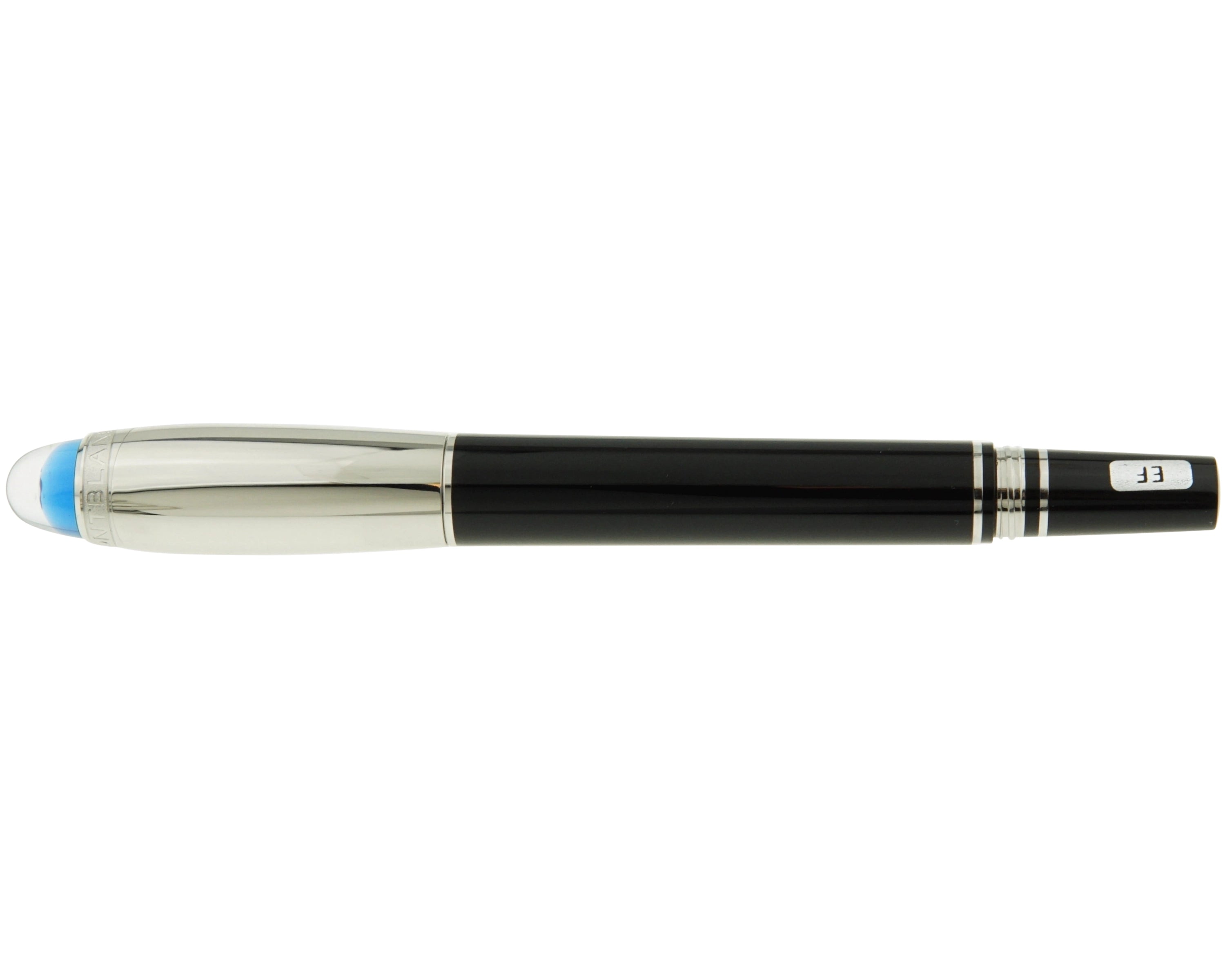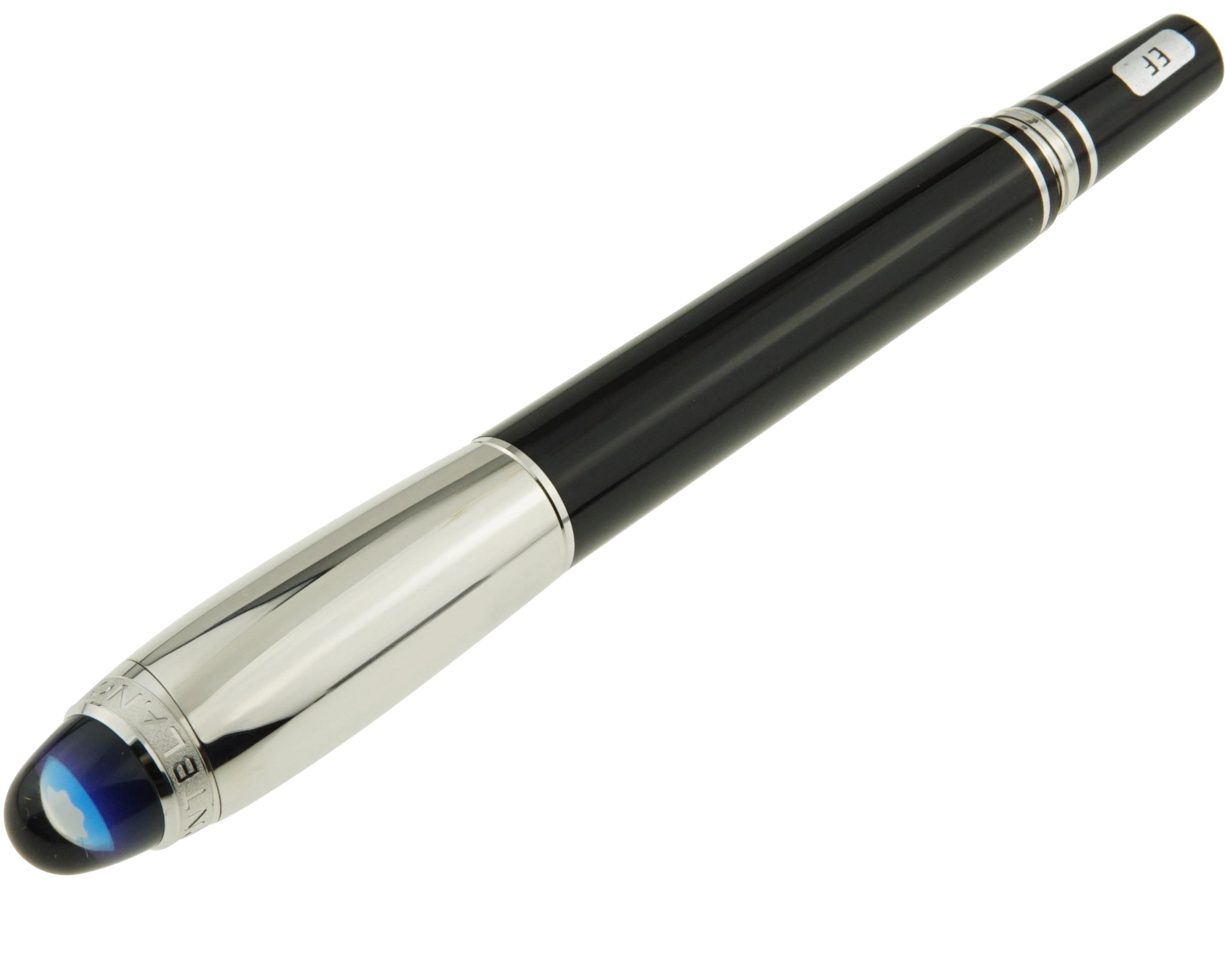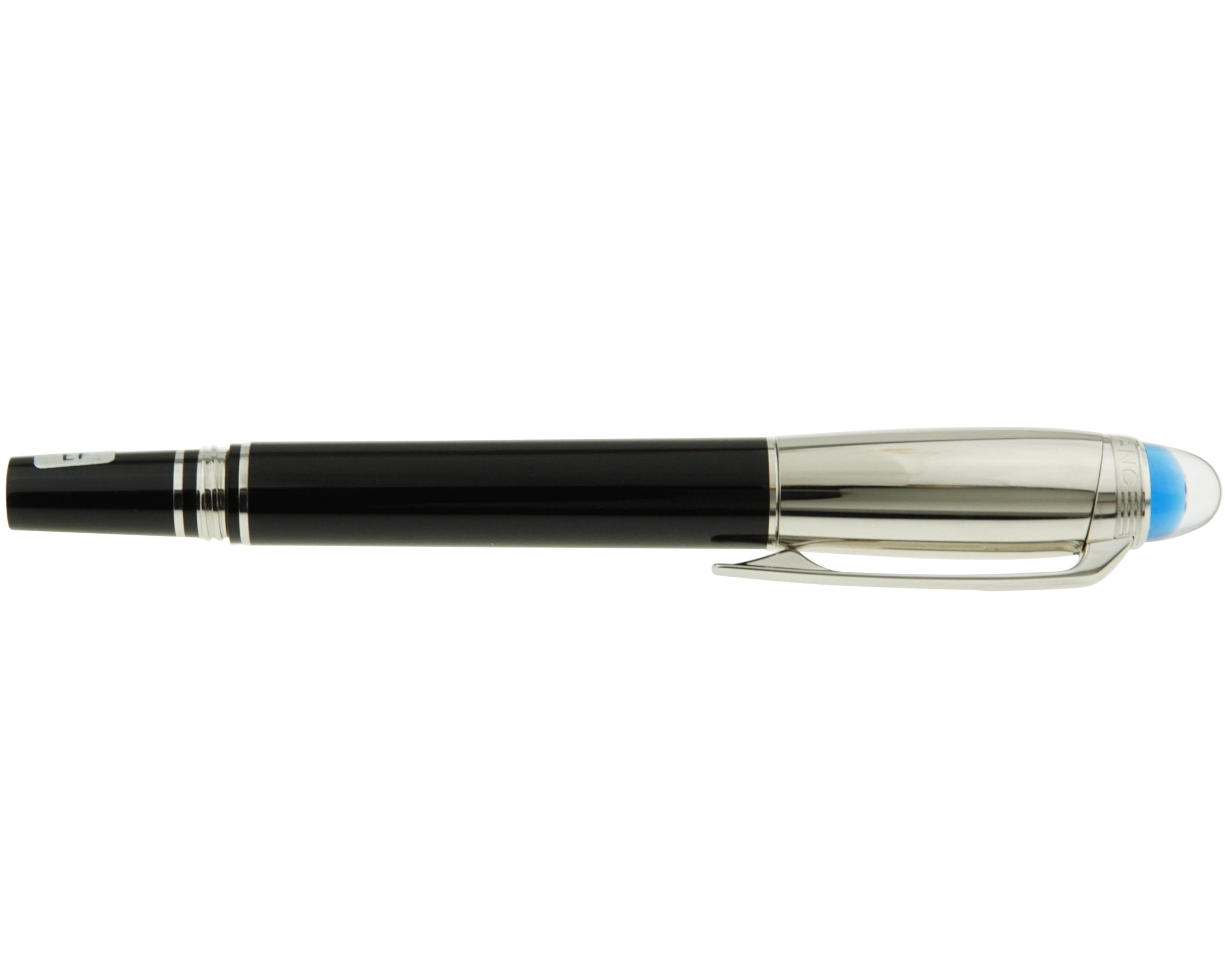 Gefertigt aus schwarzem Edelharz, bildet der Korpus die perfekte Basis für die platinierte Edelstahlkappe. Die Details, darunter das Griffstück und der Clip, sind ebenfalls mit einer eleganten Platinum-Beschichtung versehen. Ein besonderes Highlight bildet der schwebende ,,Montblanc-Stern'' auf einer blau durchscheinenden Kuppel, das dem Schreibgerät eine unverwechselbare, moderne Note verleiht.
