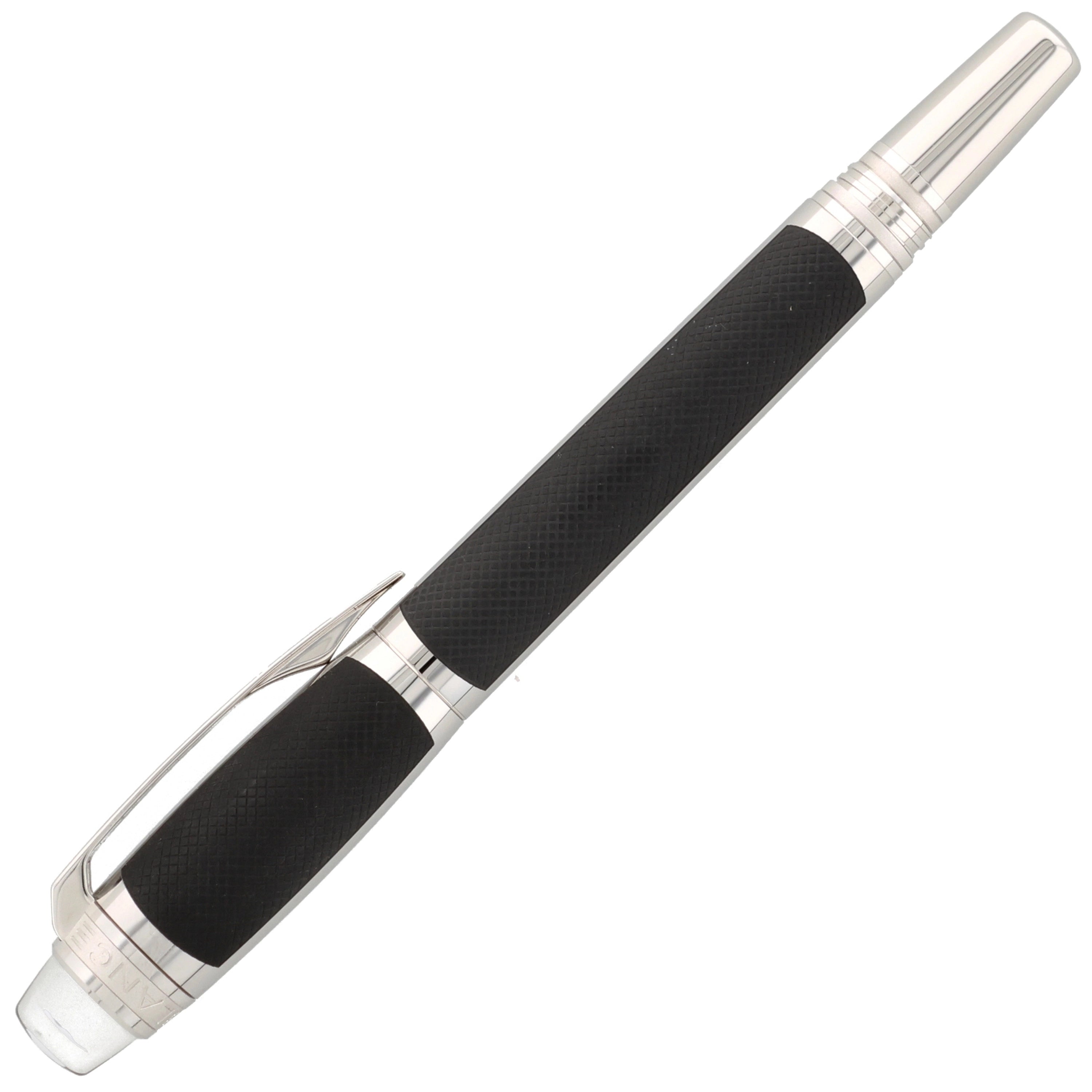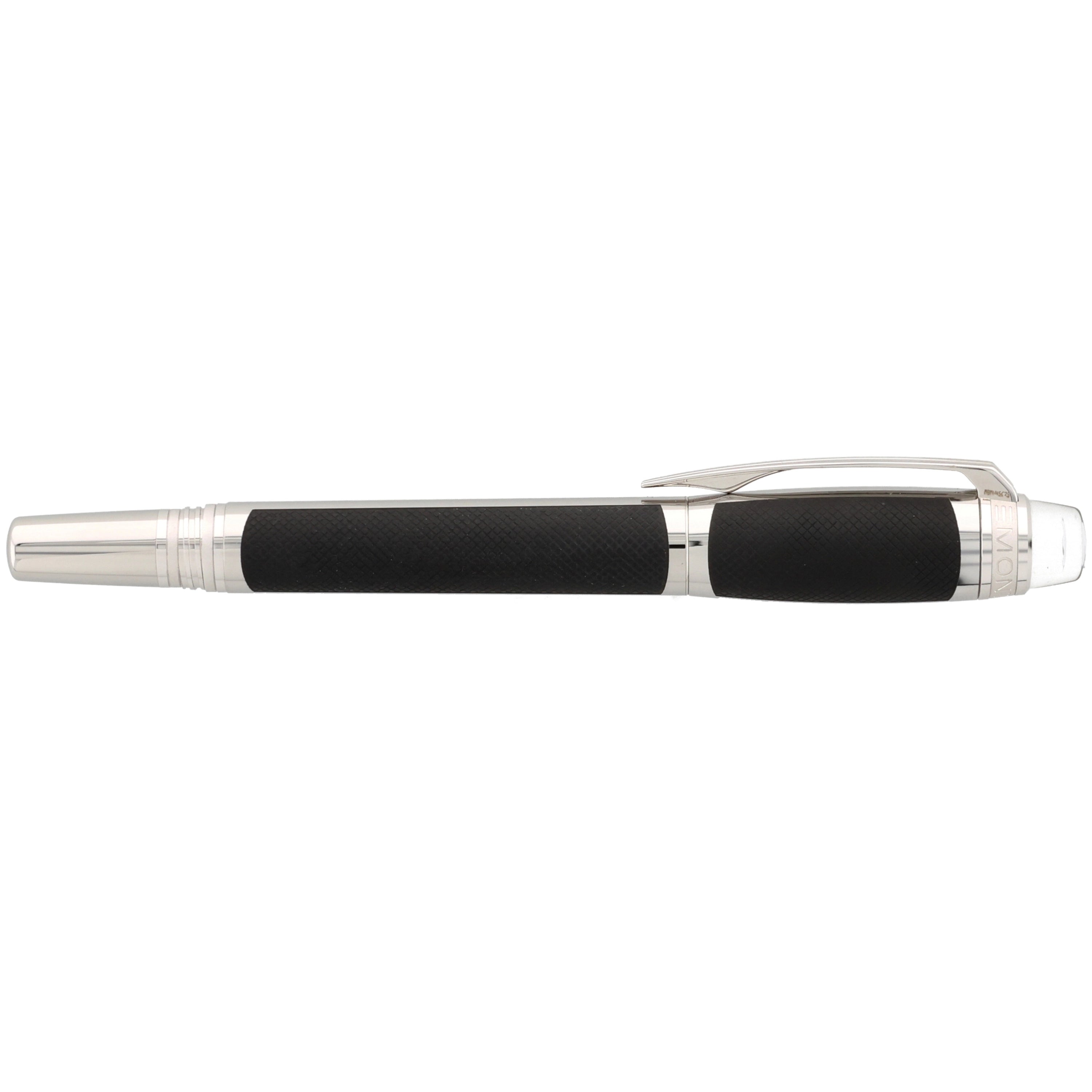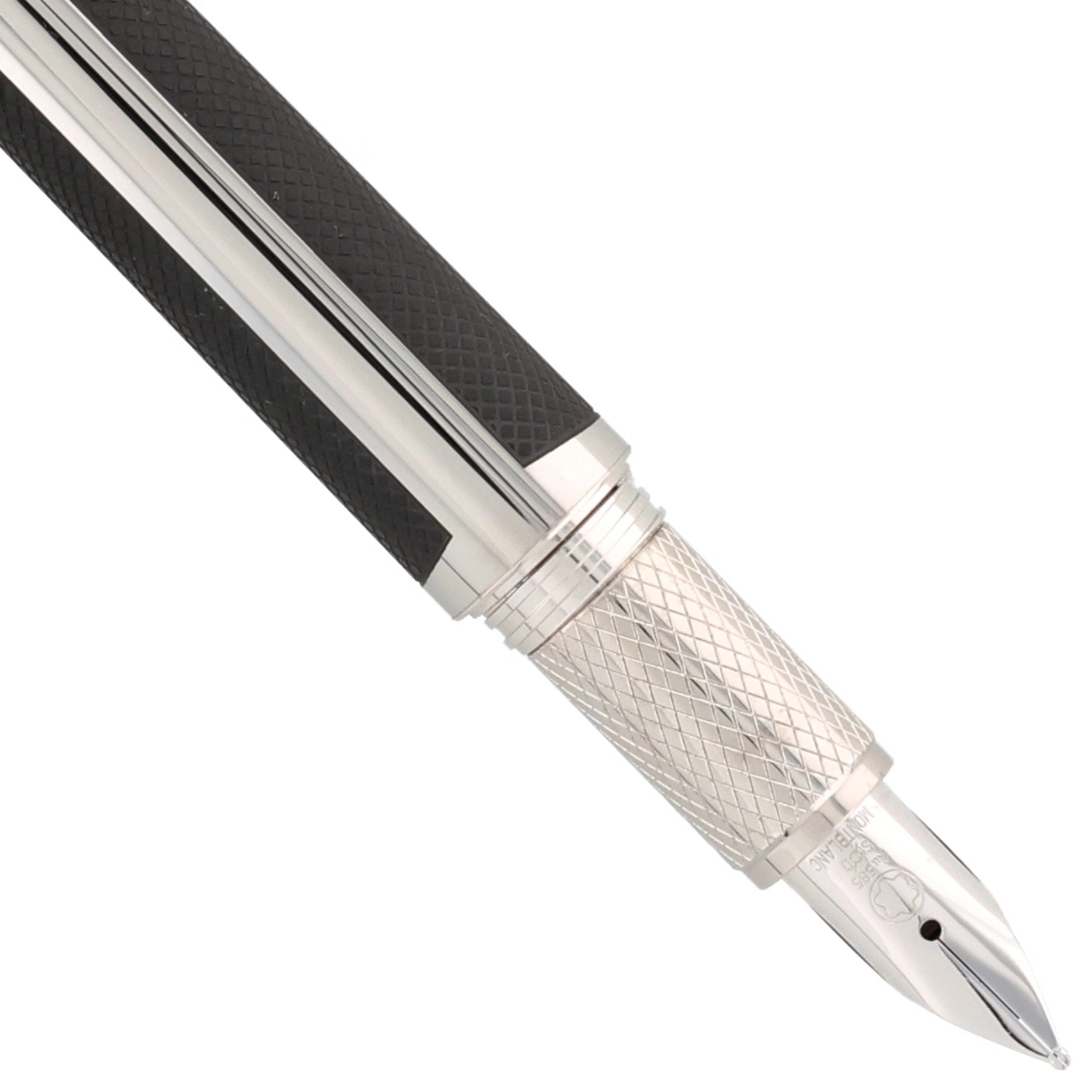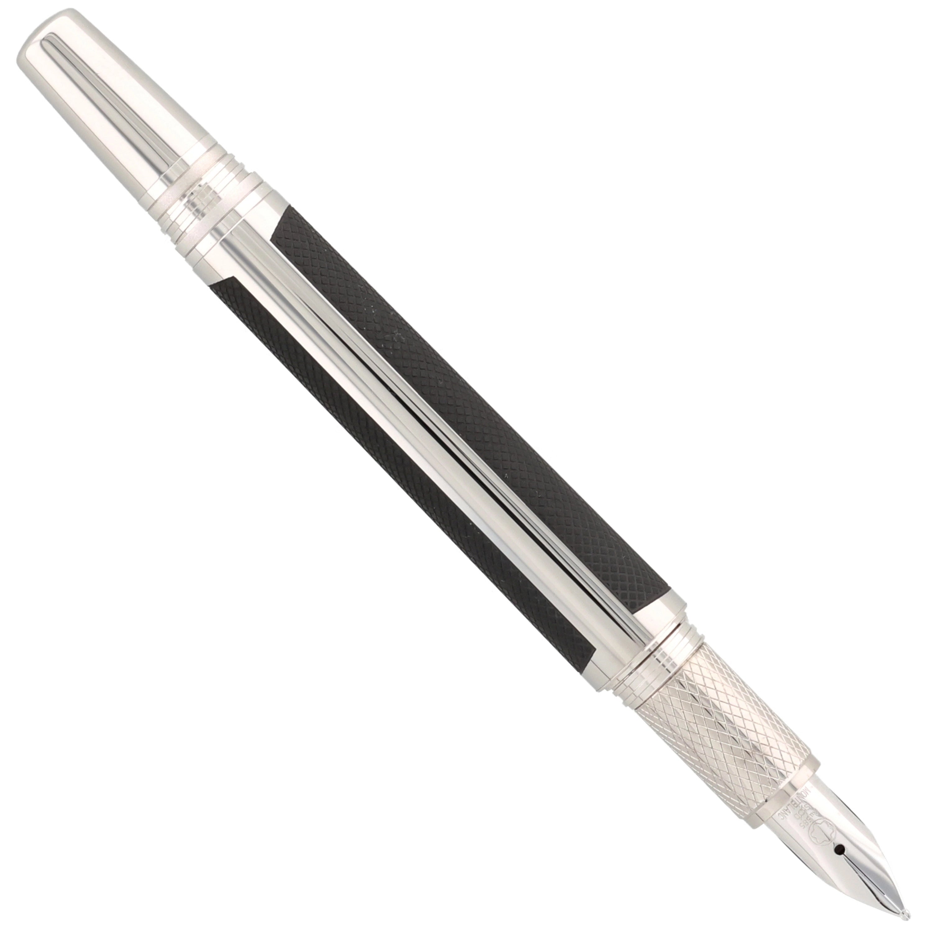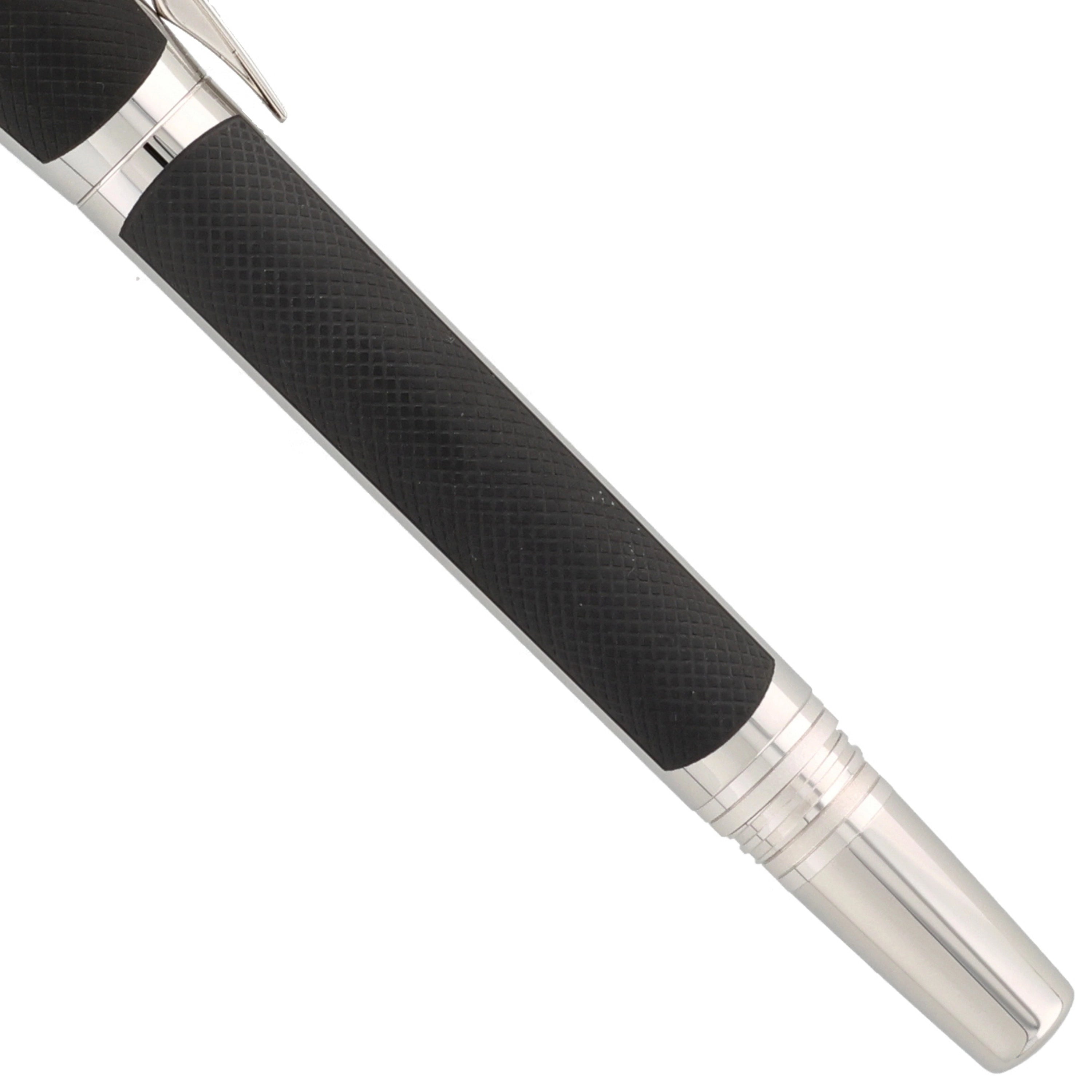 Der aus Edelstahl gefertigte Schreiber besticht durch seine moderne Gestaltung. Kappe und Korpus sind teilweise mit einer grauen PVD-Beschichtung versehen, in die ein haptisch ansprechendes Muster eingearbeitet wurde. Die platinierten Details, darunter Clip und Beschläge, setzen elegante Akzente und runden das Design harmonisch ab. Ein weiteres Highlight ist das Griffstück, das mit einem präzisen Rautenmuster veredelt wurde und für eine angenehme Haptik sorgt.