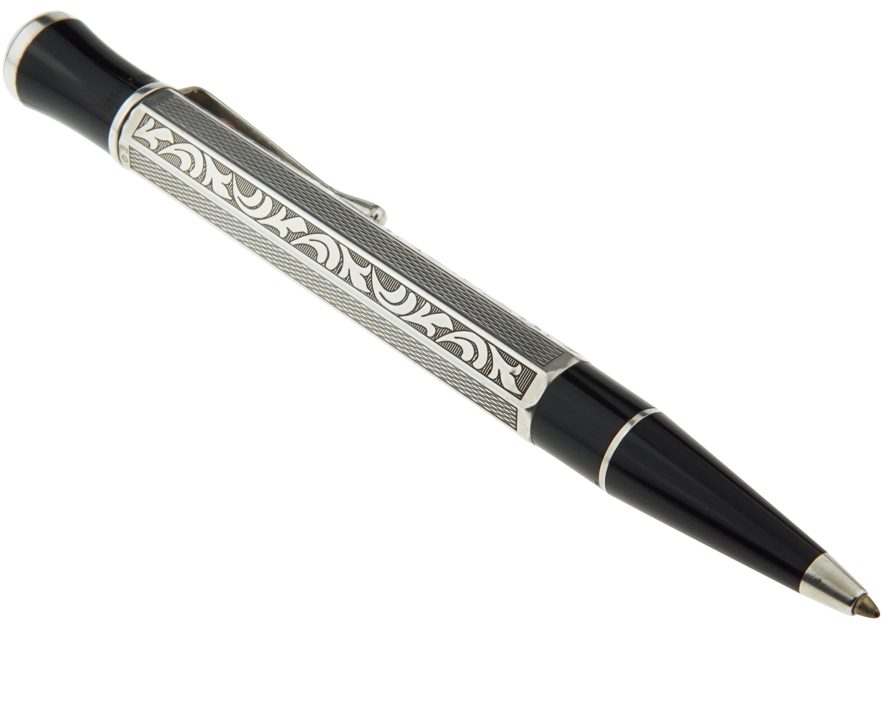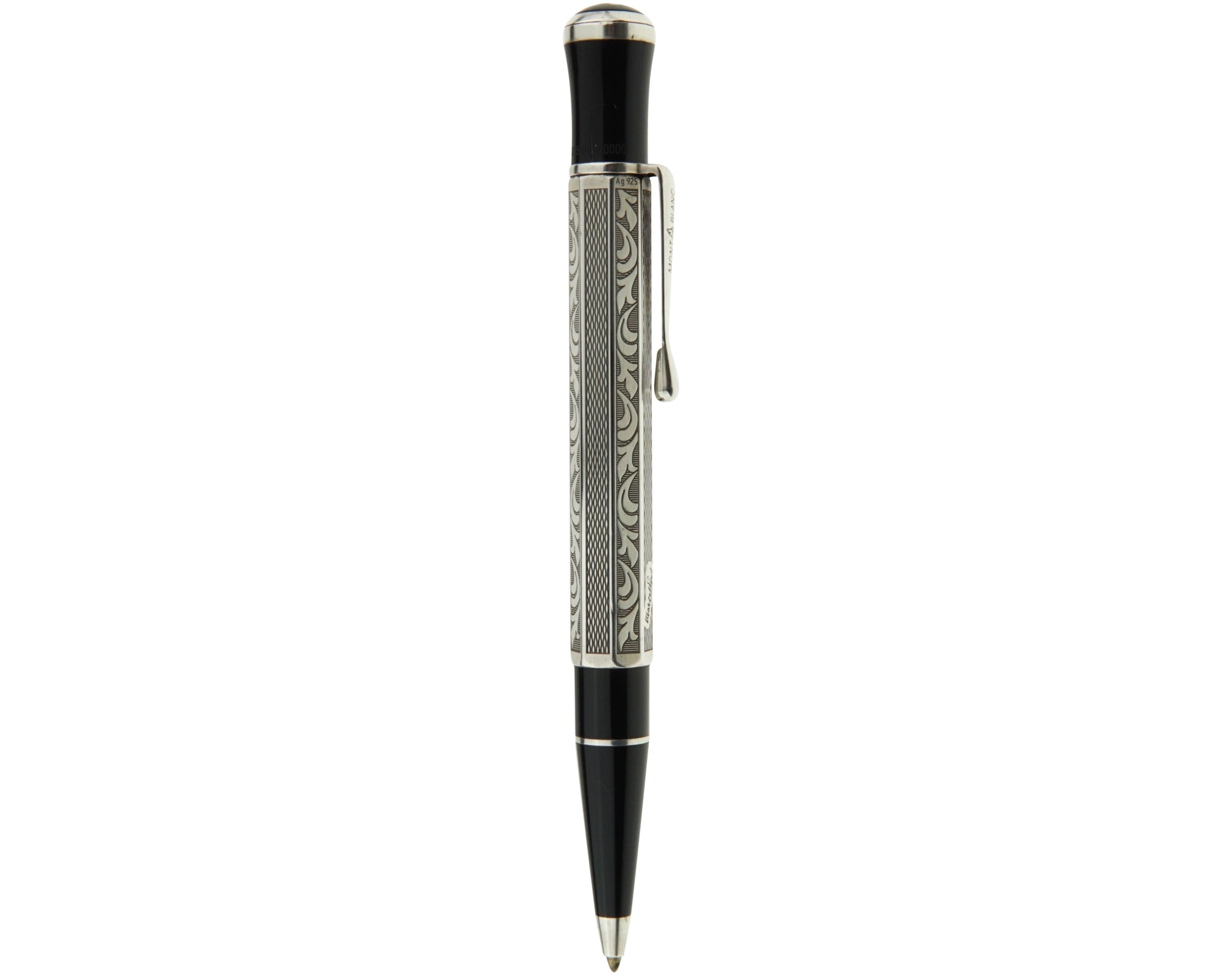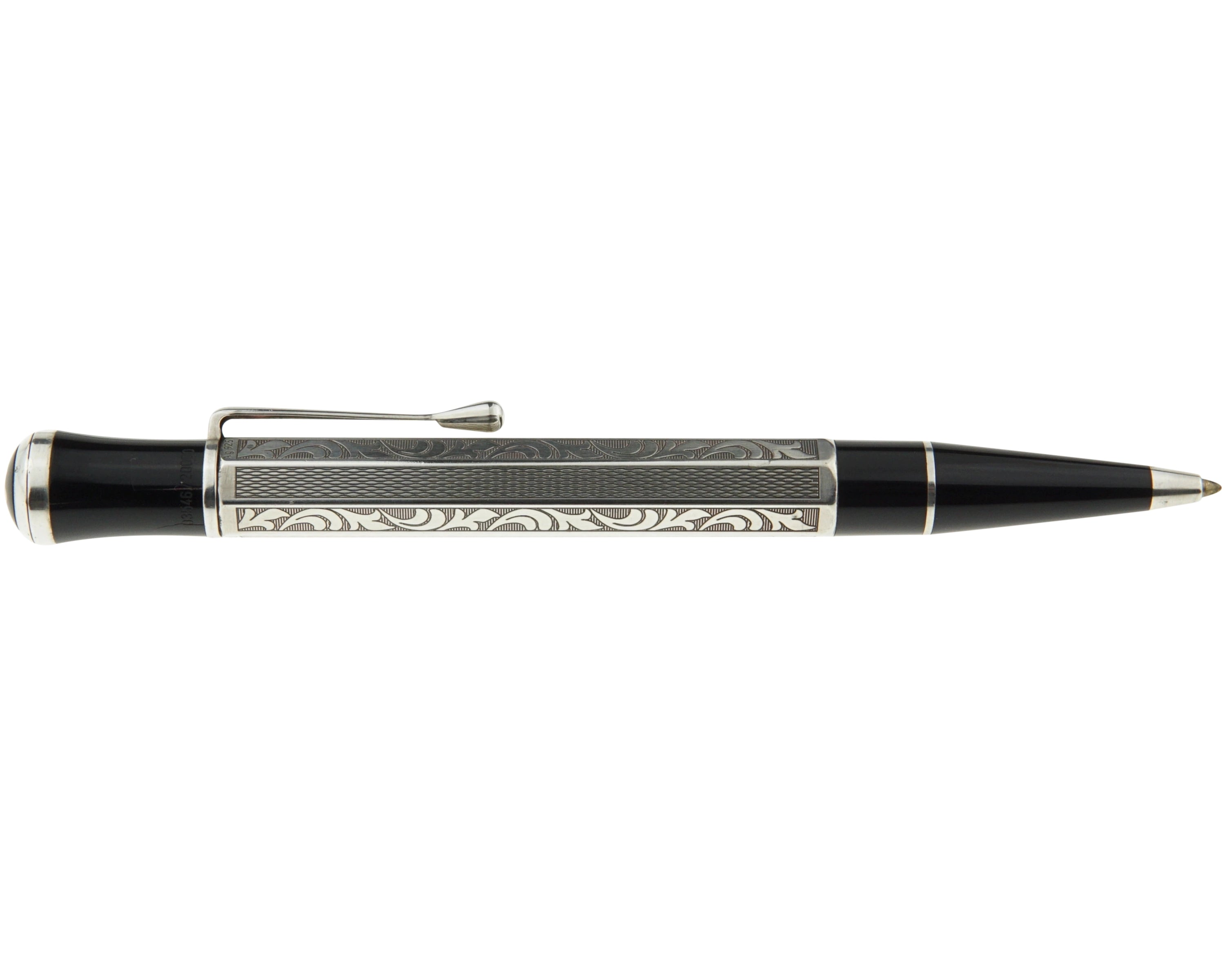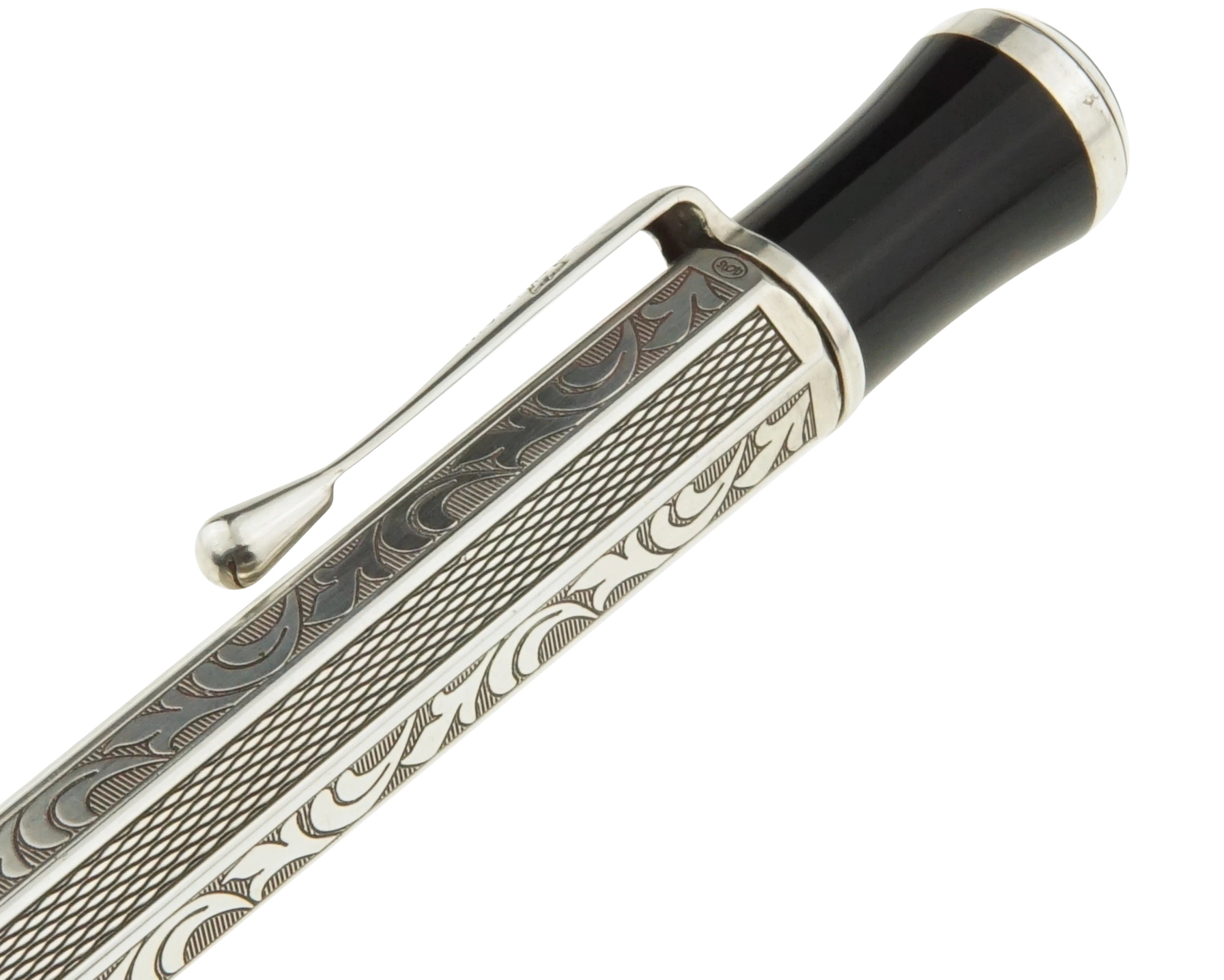 Der Korpus aus massivem 925er Sterlingsilber ist in acht Segmente unterteilt und kunstvoll mit feinen Gravuren verziert. Passend dazu sind auch die Details – von den präzise gearbeiteten Beschlägen bis hin zum formschönen Clip – aus 925er Sterlingsilber gefertigt. Das Griffstück und der Kappenkopf bestehen aus hochwertigem Edelharz und setzen mit ihrem tiefen Glanz einen tollen Kontrast zum silbernen Korpus.
