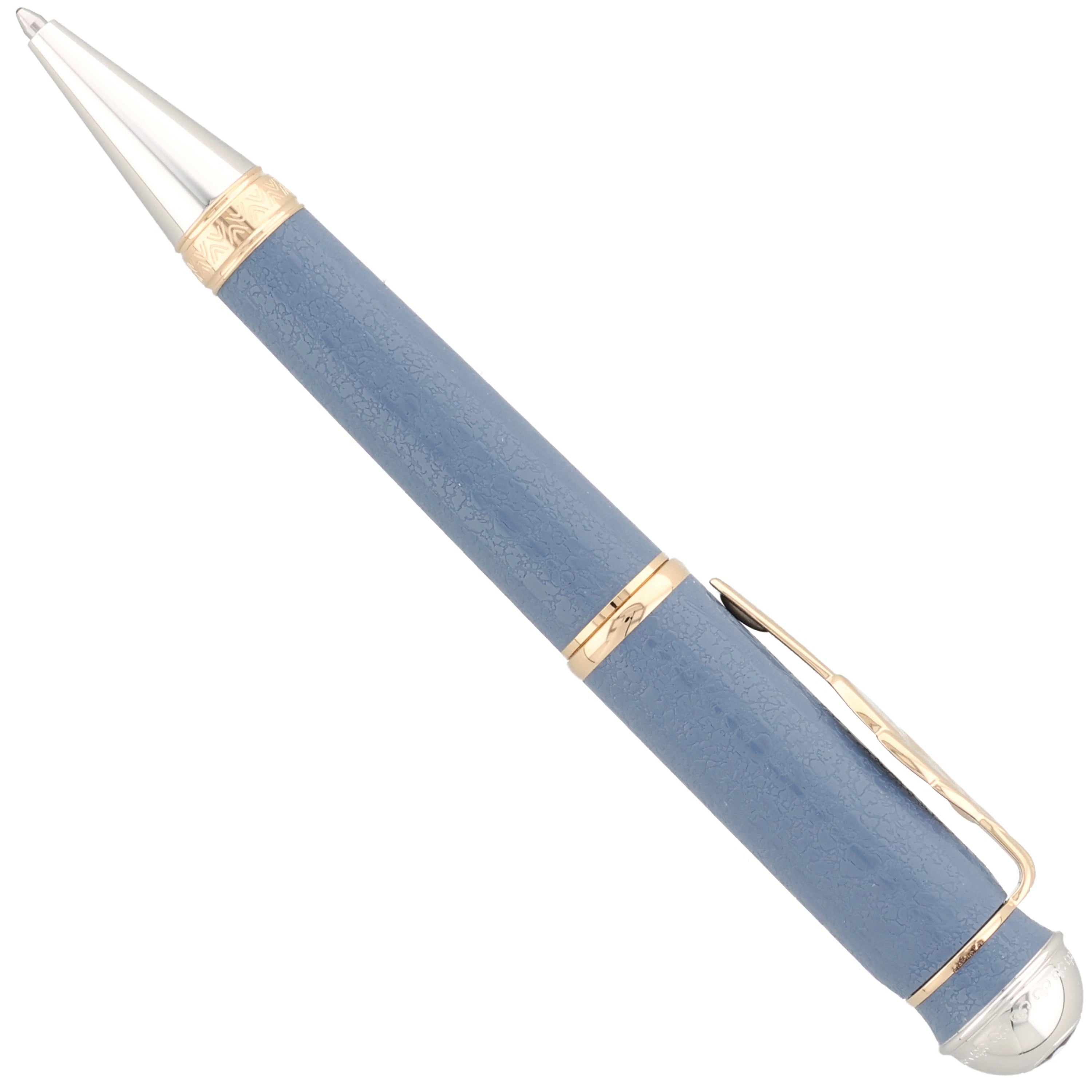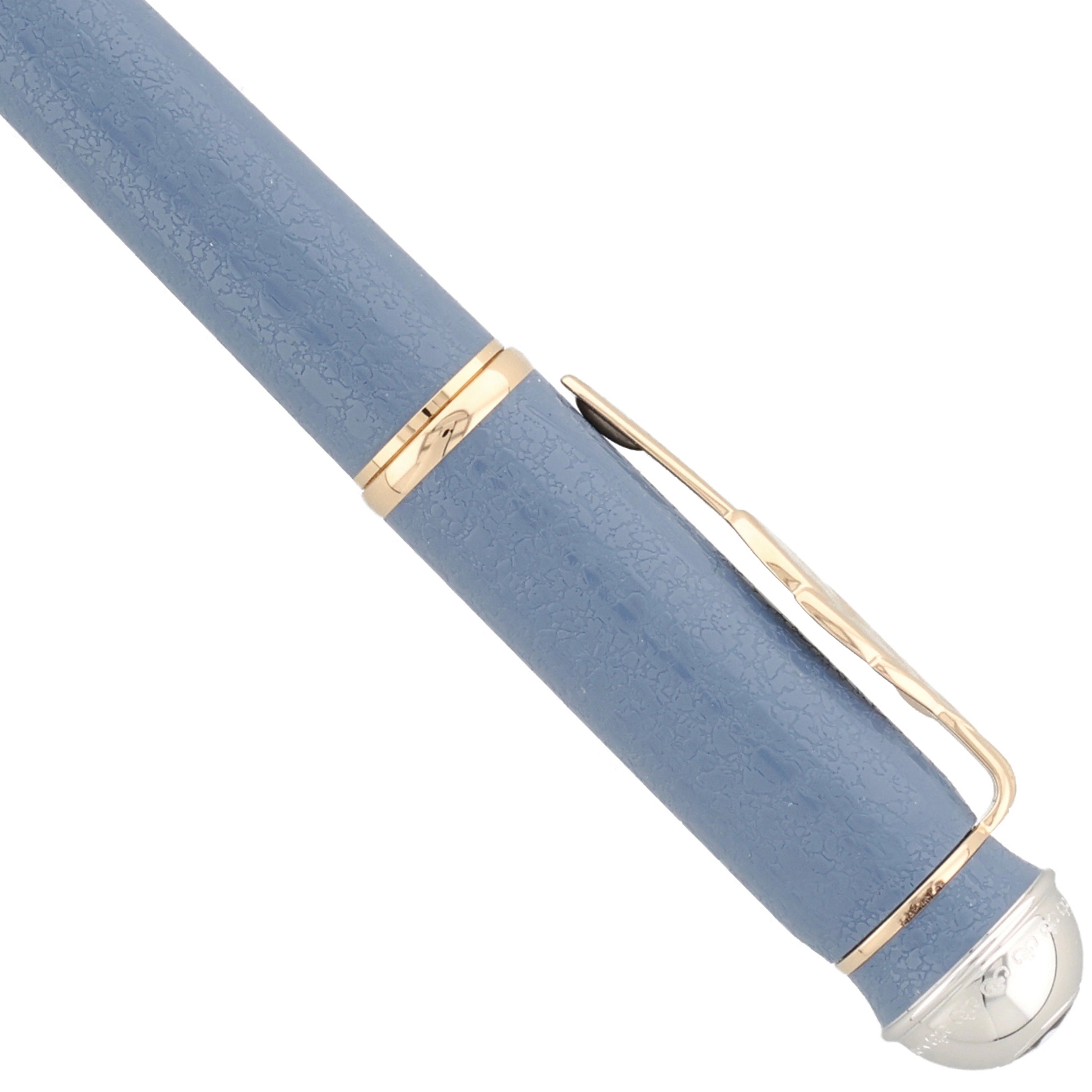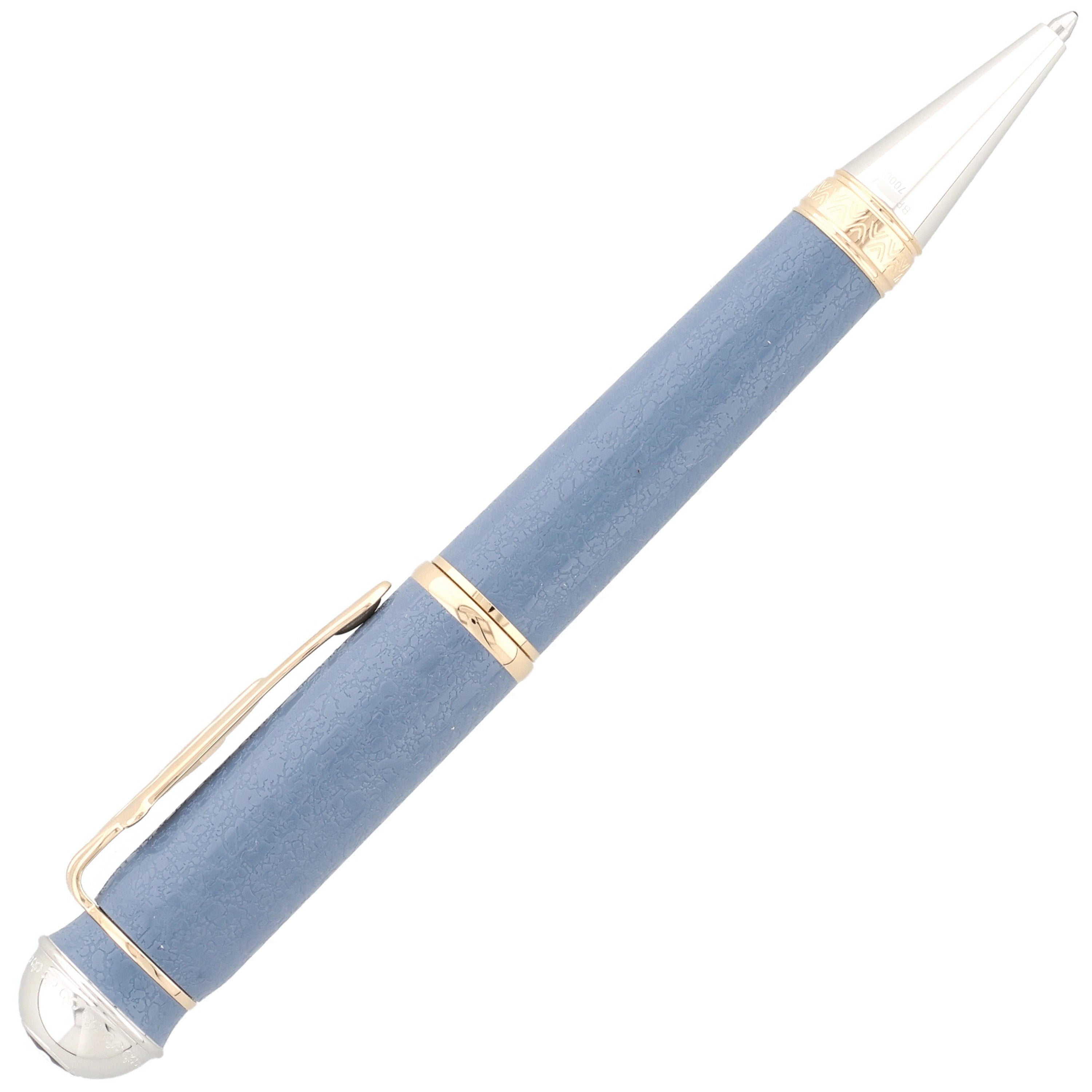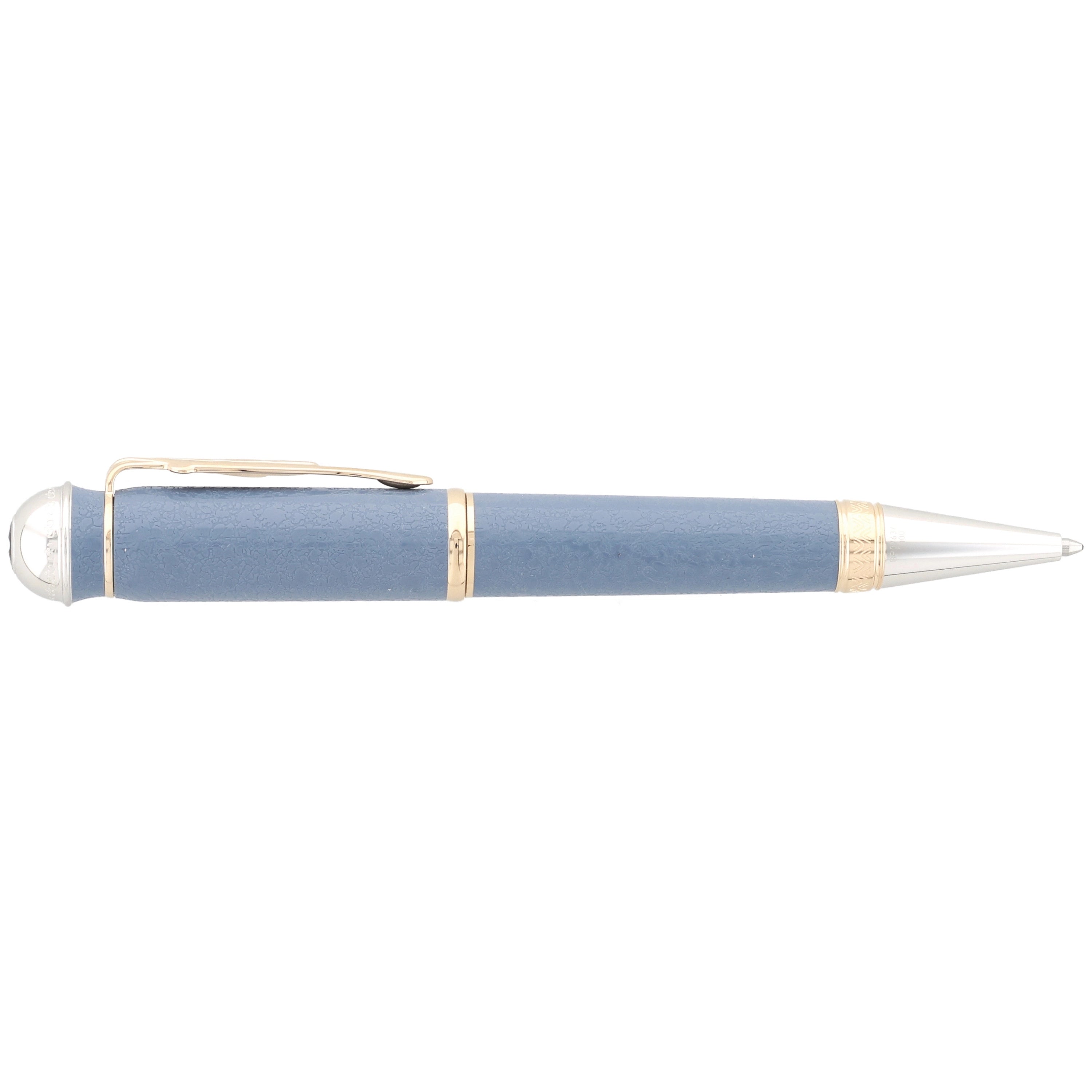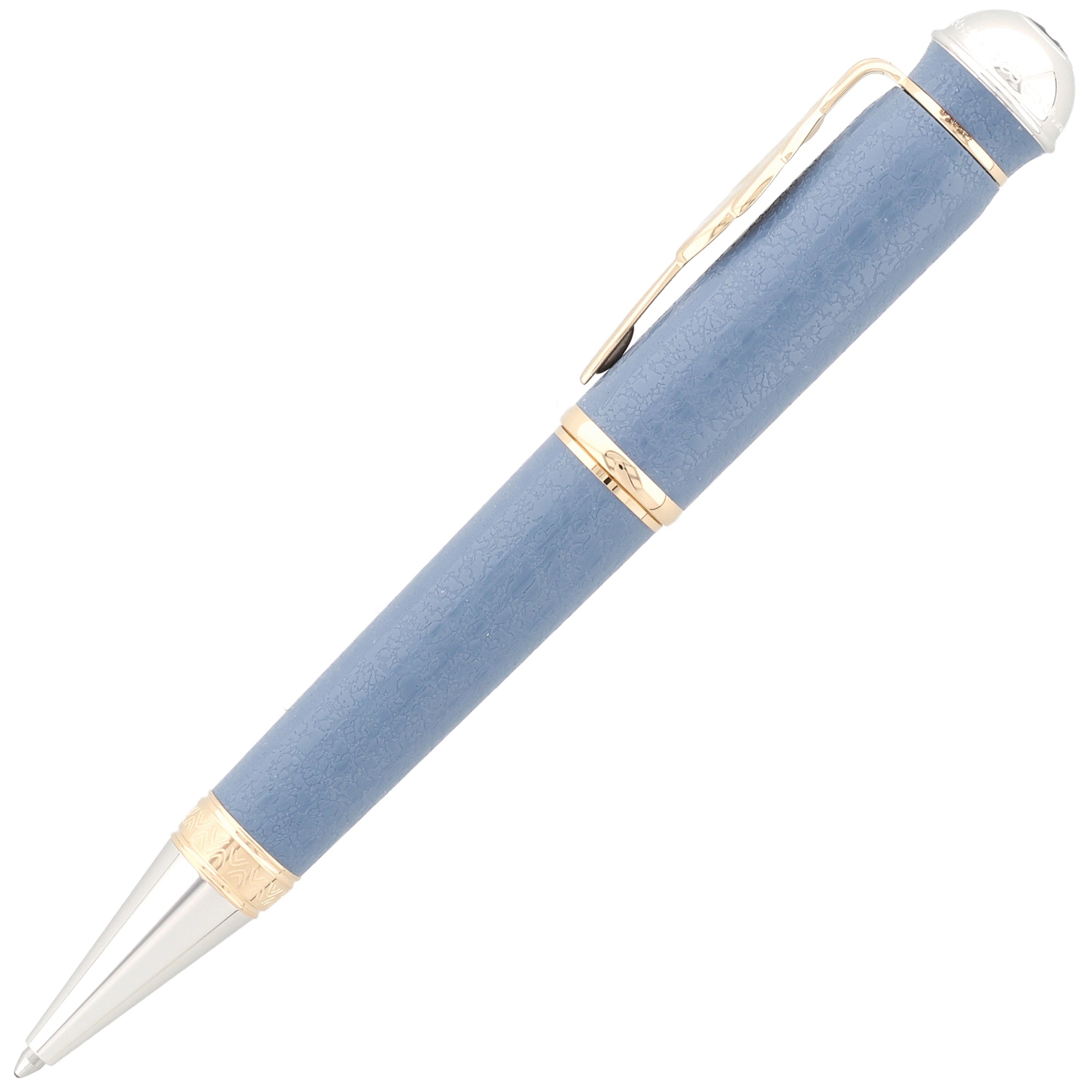 Der Kugelschreiber besteht aus hochwertigem blauem Edelharz, dessen Farbton und feine Struktur an die Tapete im Juno-Zimmer von Johann Wolfgang von Goethes Weimarer Wohnhaus angelehnt sind und so einen direkten Bezug zu seinem kreativen Arbeitsumfeld herstellen. Die Kombination aus vergoldeten und platinbeschichteten Beschlägen verleiht dem Schreibgerät eine edle, klassische Eleganz, während der Clip in Form eines Blattes Goethes naturwissenschaftliche Studien zur Pflanzenmorphologie würdigt. Dezente Gravurelemente erinnern an historische Illustrationen aus frühen Ausgaben seiner Werke und unterstreichen den literarischen Bezug des Designs.
