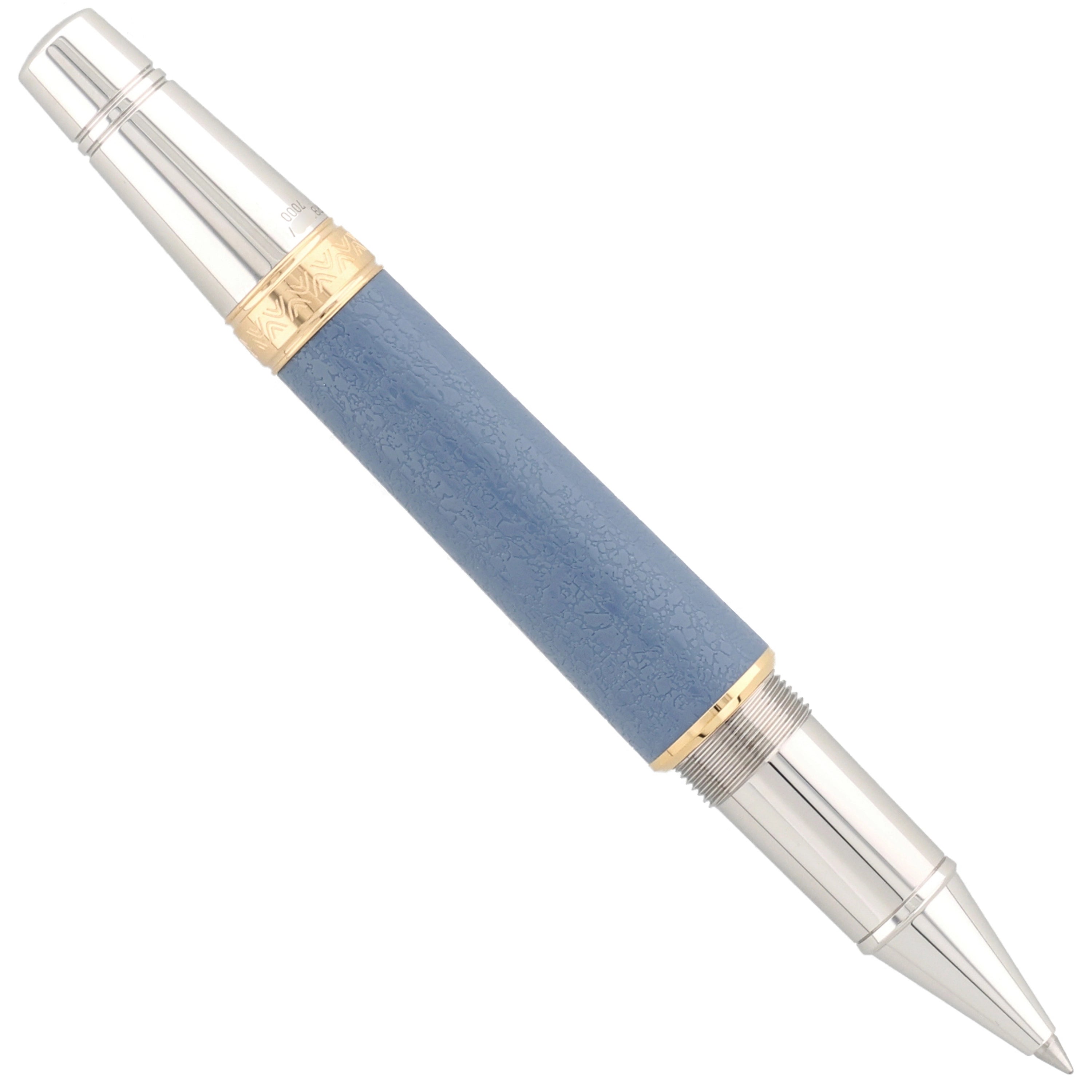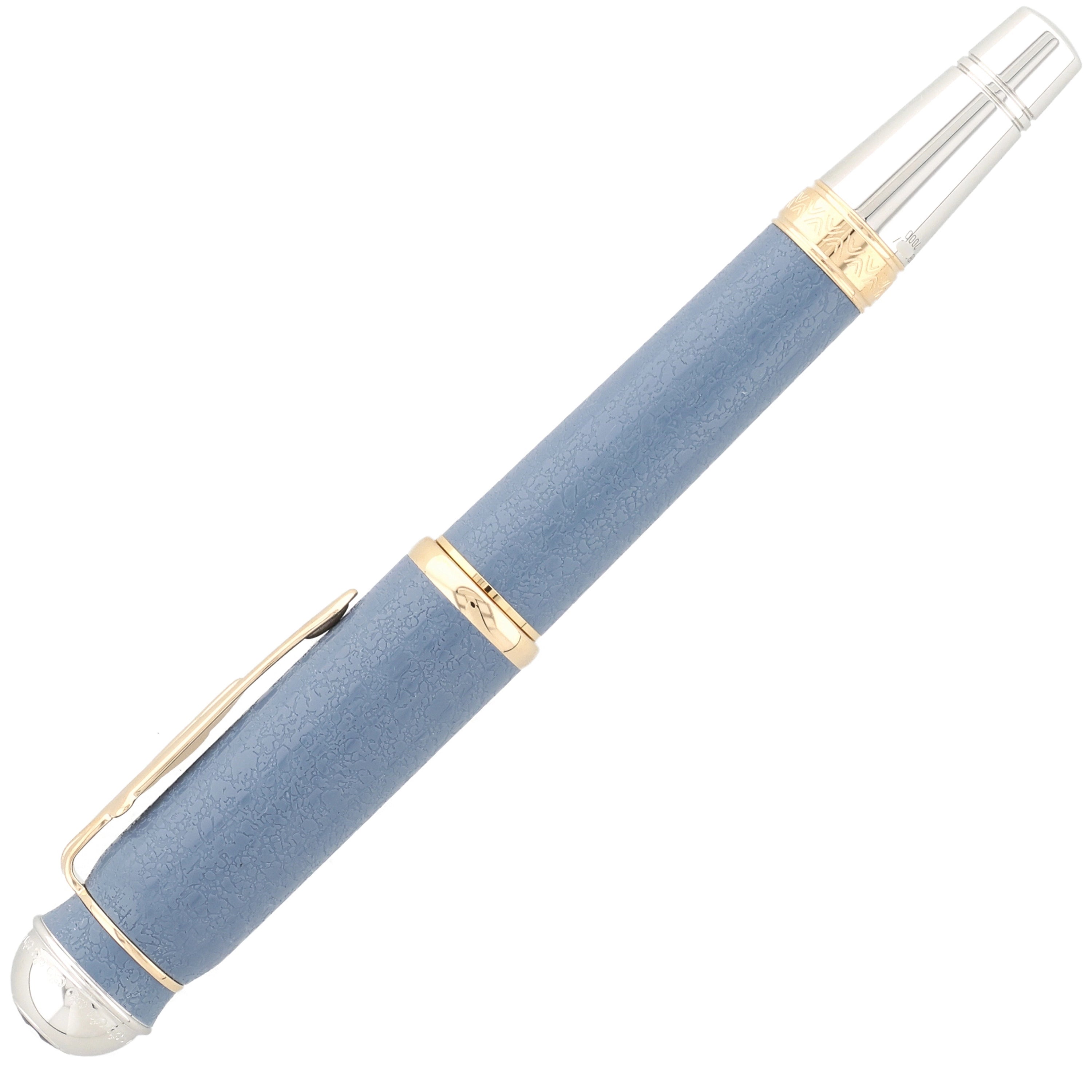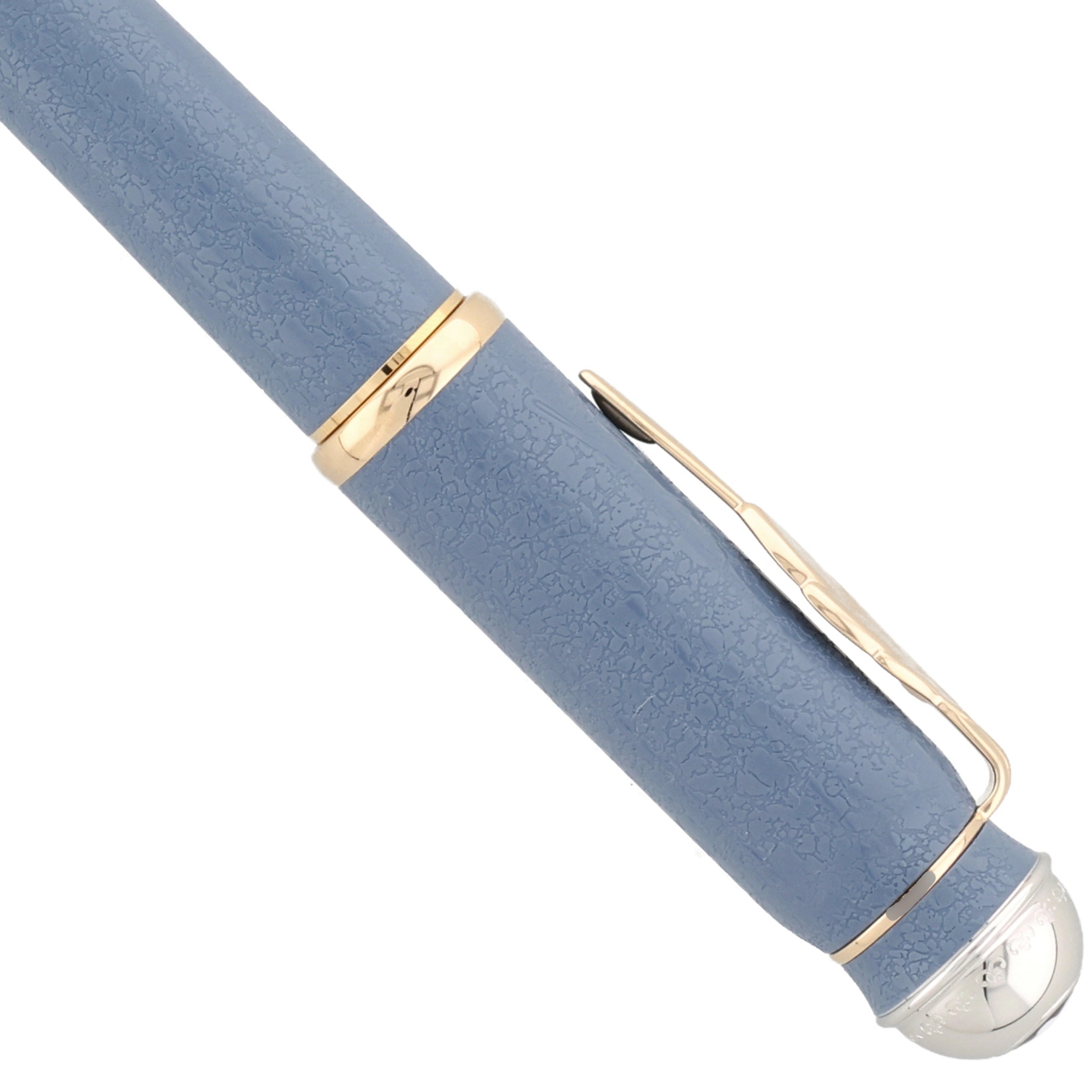 Das Schreibgerät besteht aus hochwertigem blauem Edelharz, dessen Farbton und feine Struktur an die Tapete im Juno-Zimmer von Johann Wolfgang von Goethes Weimarer Wohnhaus angelehnt sind und so einen direkten Bezug zu seinem kreativen Arbeitsumfeld herstellen. Die Kombination aus vergoldeten und platinbeschichteten Beschlägen verleiht dem Schreibgerät eine edle, klassische Eleganz, während der Clip in Form eines Blattes Goethes naturwissenschaftliche Studien zur Pflanzenmorphologie würdigt. Dezente Gravurelemente erinnern an historische Illustrationen aus frühen Ausgaben seiner Werke und unterstreichen den literarischen Bezug des Designs.