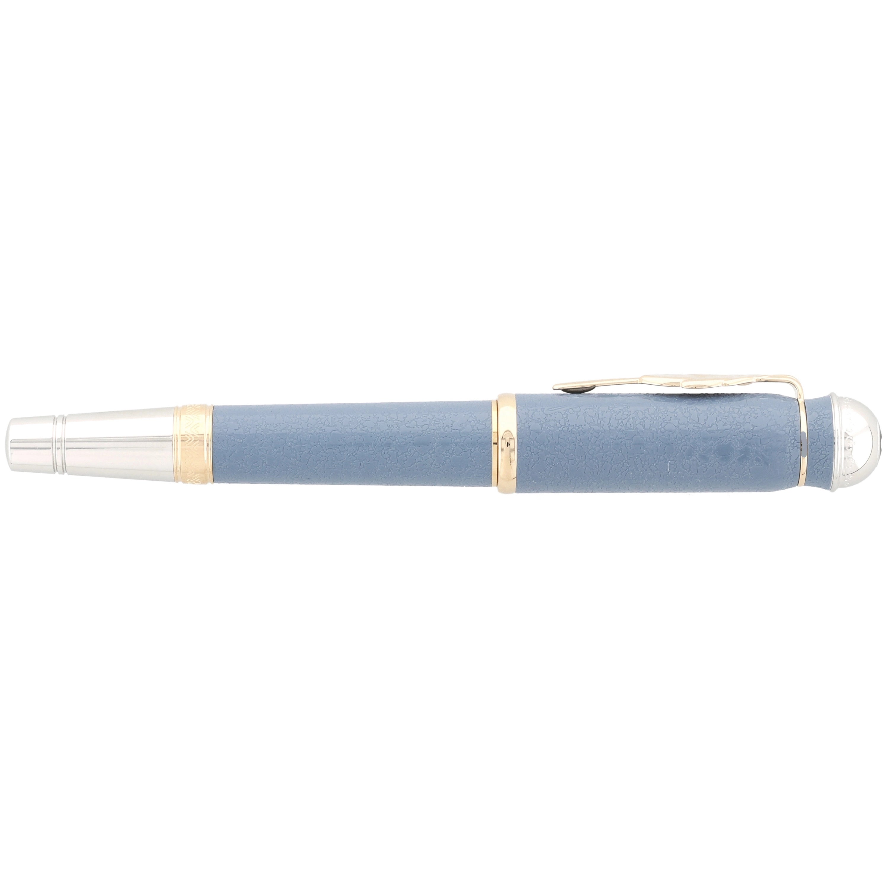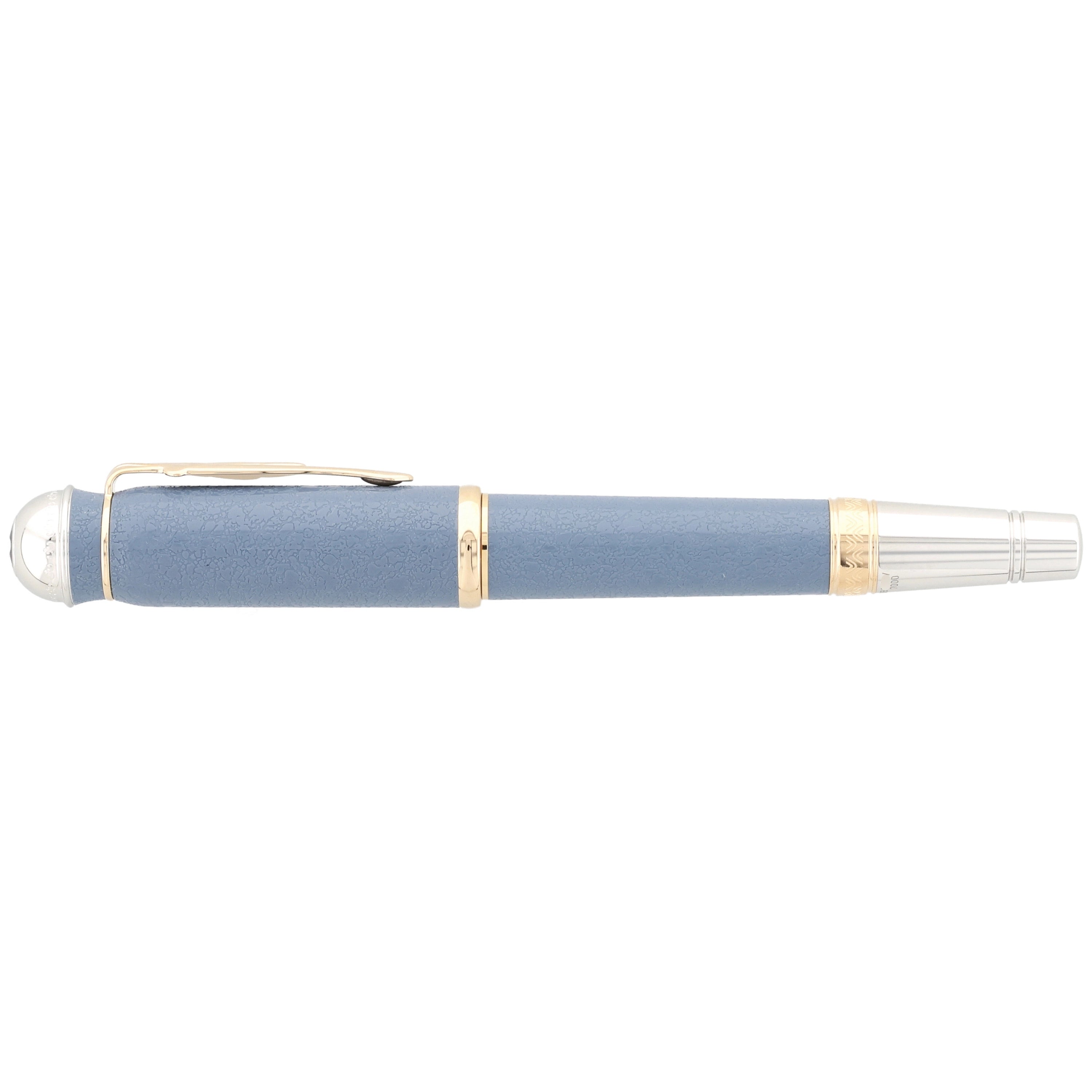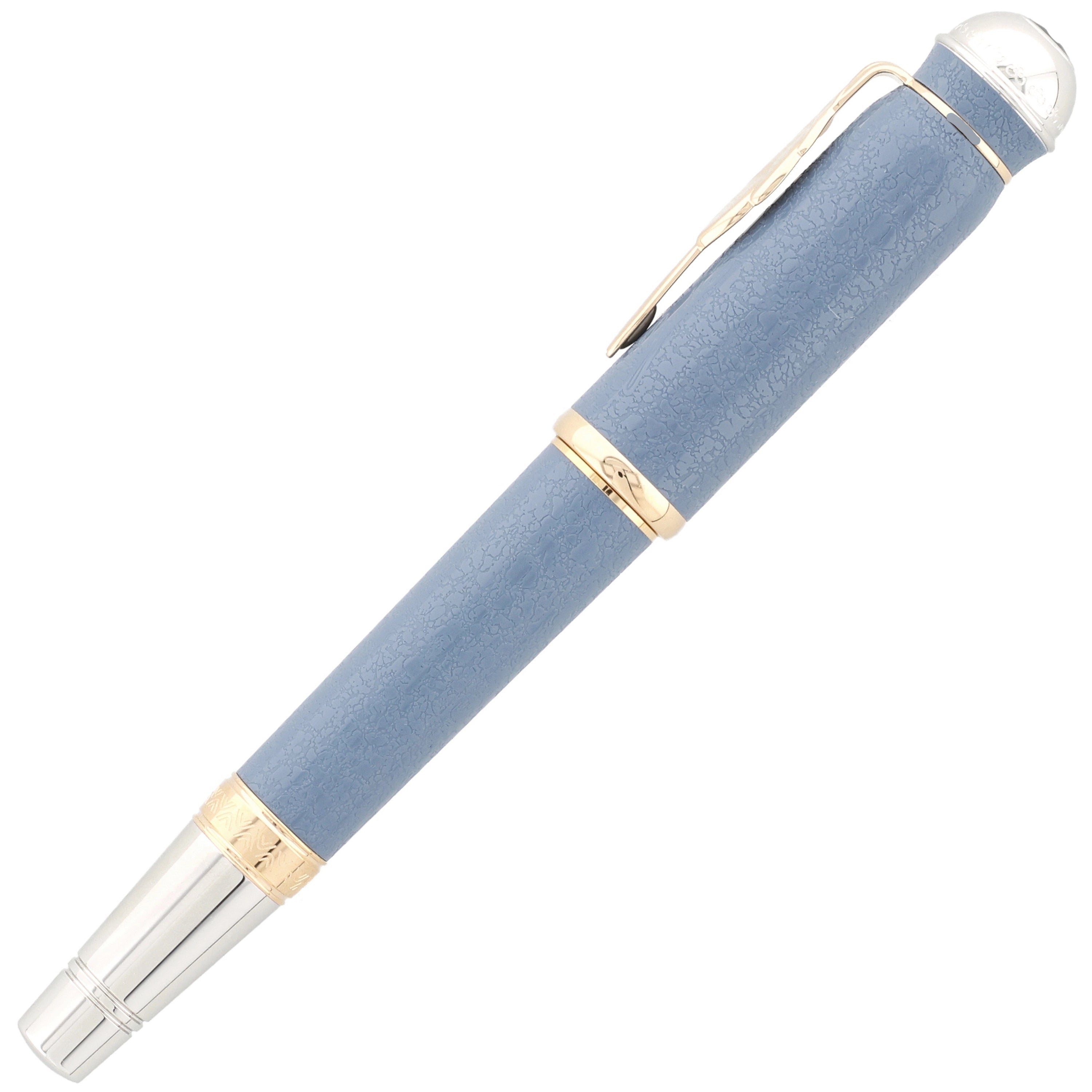 Das Schreibgerät besteht aus hochwertigem blauem Edelharz, dessen Farbton und feine Struktur an die Tapete im Juno-Zimmer von Johann Wolfgang von Goethes Weimarer Wohnhaus angelehnt sind und so einen direkten Bezug zu seinem kreativen Arbeitsumfeld herstellen. Die Kombination aus vergoldeten und platinbeschichteten Beschlägen verleiht dem Schreibgerät eine edle, klassische Eleganz, während der Clip in Form eines Blattes Goethes naturwissenschaftliche Studien zur Pflanzenmorphologie würdigt. Dezente Gravurelemente erinnern an historische Illustrationen aus frühen Ausgaben seiner Werke und unterstreichen den literarischen Bezug des Designs.