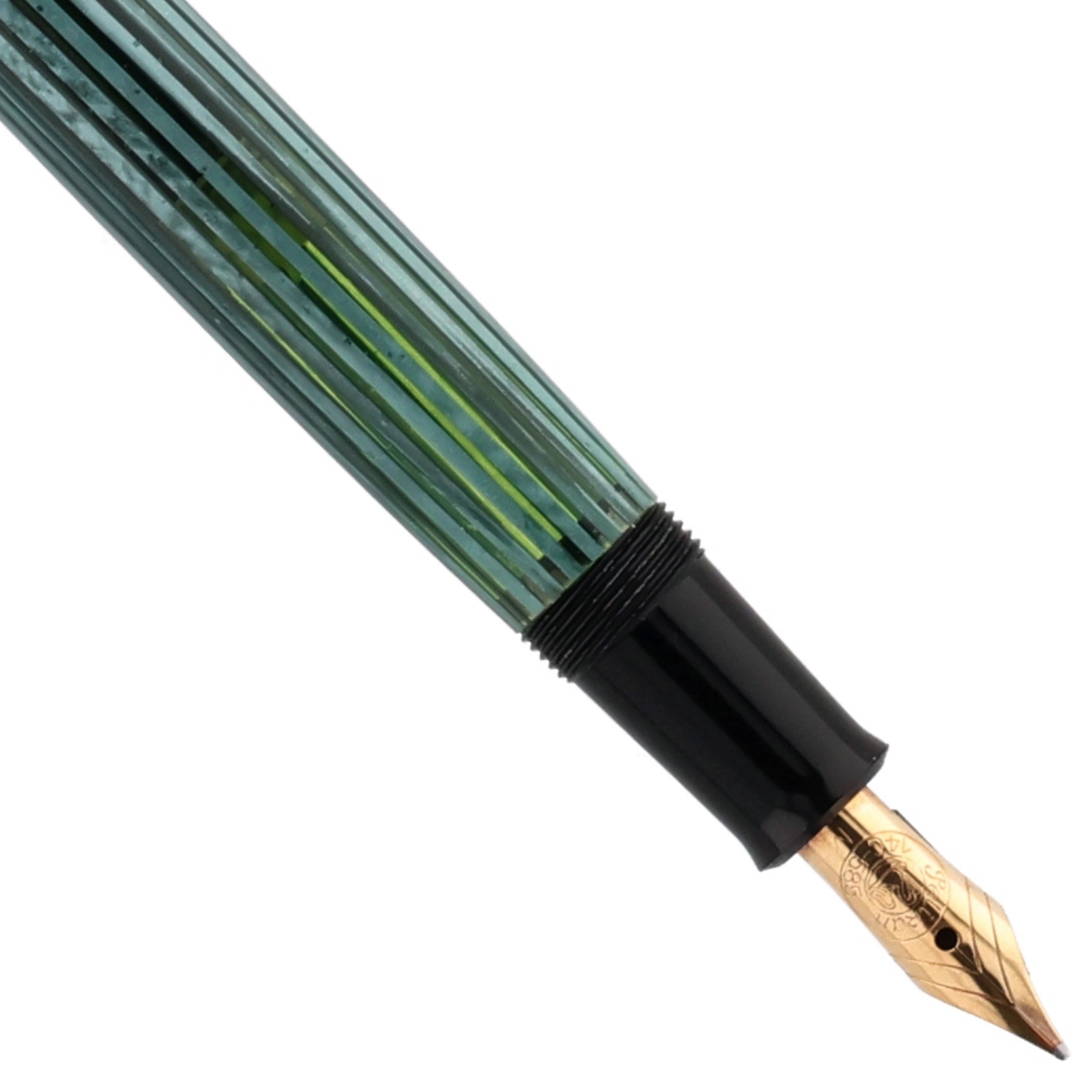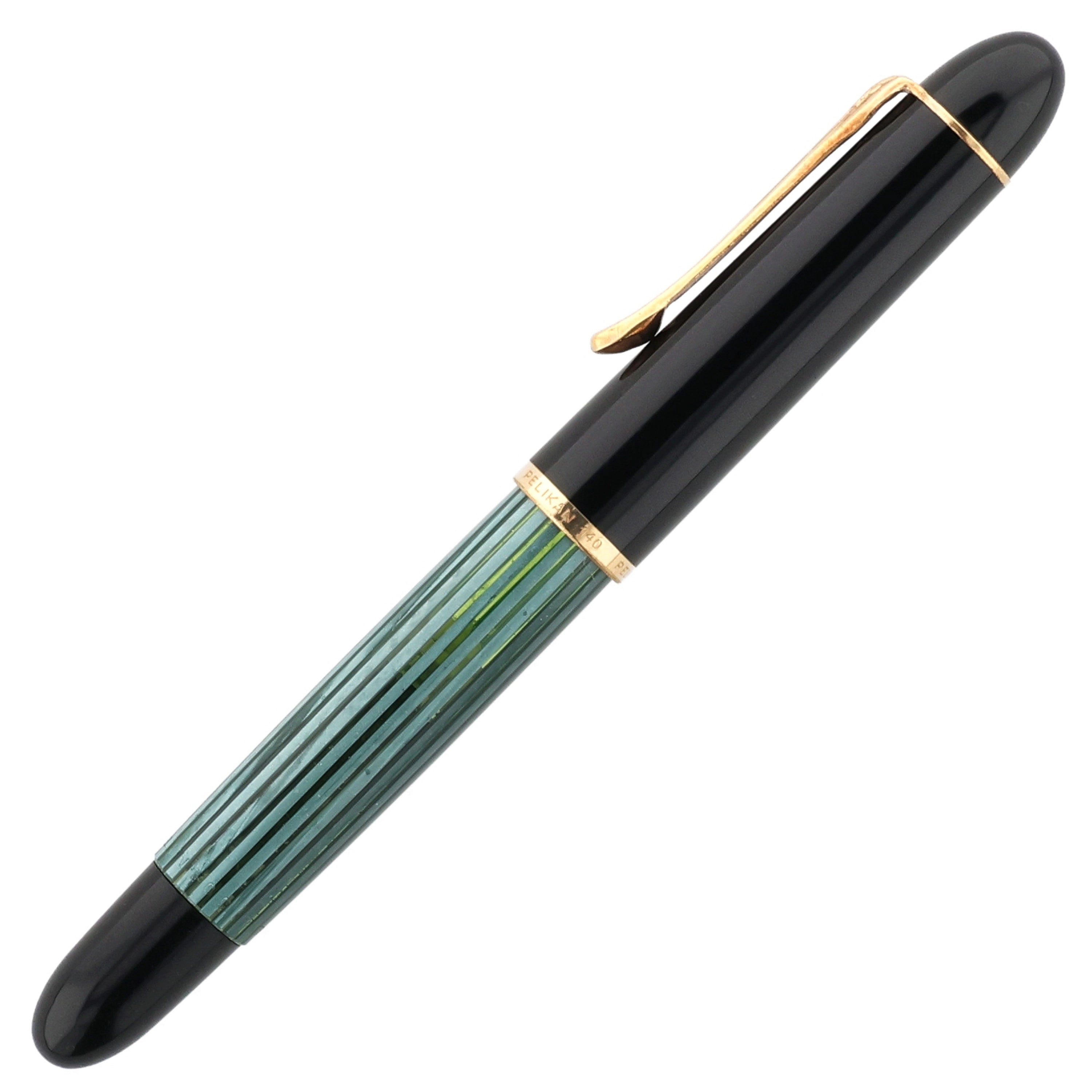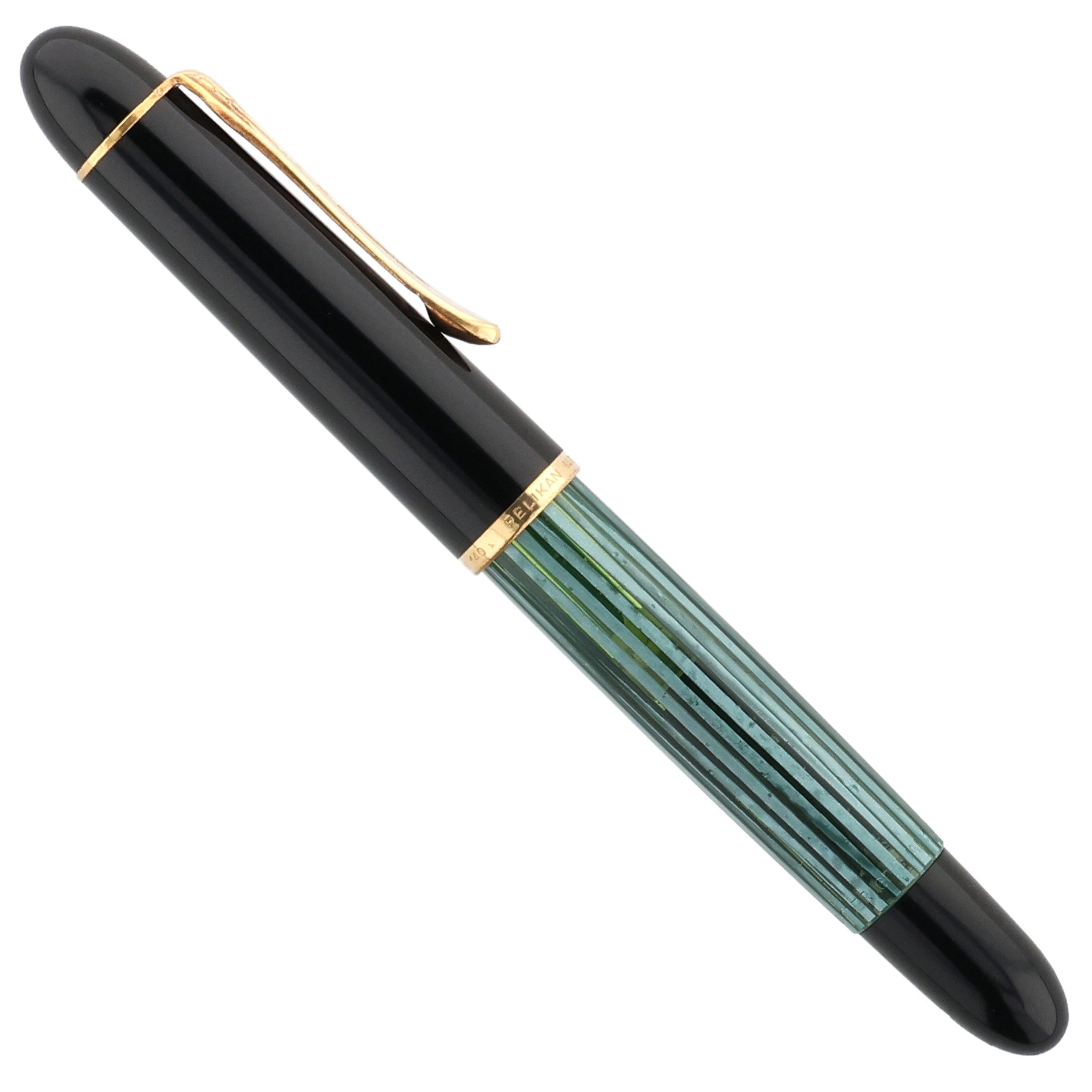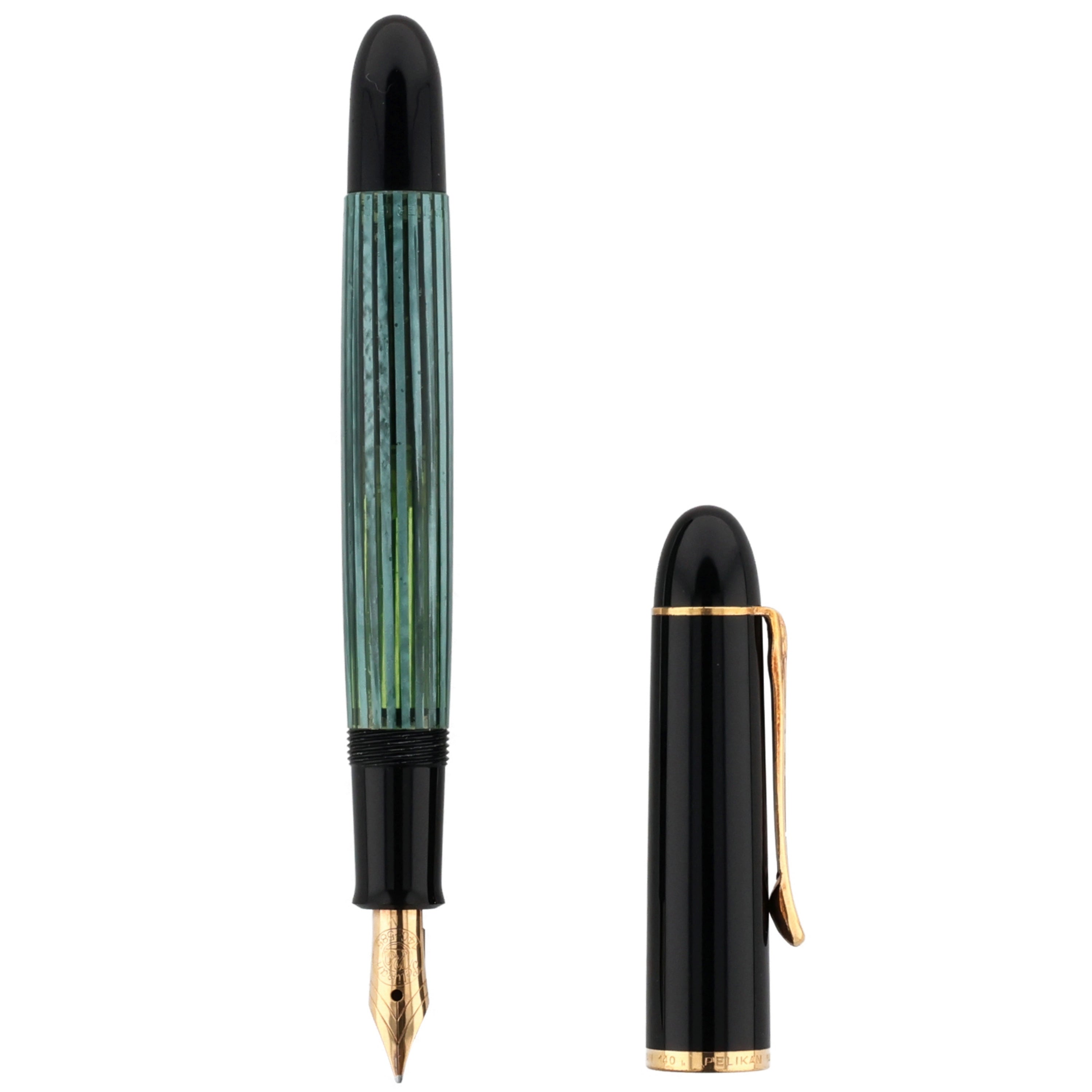 Der Pelikan 140 besticht durch sein klassisches, grün gestreiftes Gehäuse aus hochwertigem Edelharz, das sowohl robust als auch elegant wirkt. Die Federn waren wahlweise aus Stahl oder 14-Karat-Gold gefertigt, meist mit dem Pelikan-Logo graviert, und in verschiedenen Härtegraden erhältlich. Das zeitlose Design vereint stilvolle Ästhetik mit langlebiger Qualität und macht den Füllfederhalter zu einem echten Klassiker.