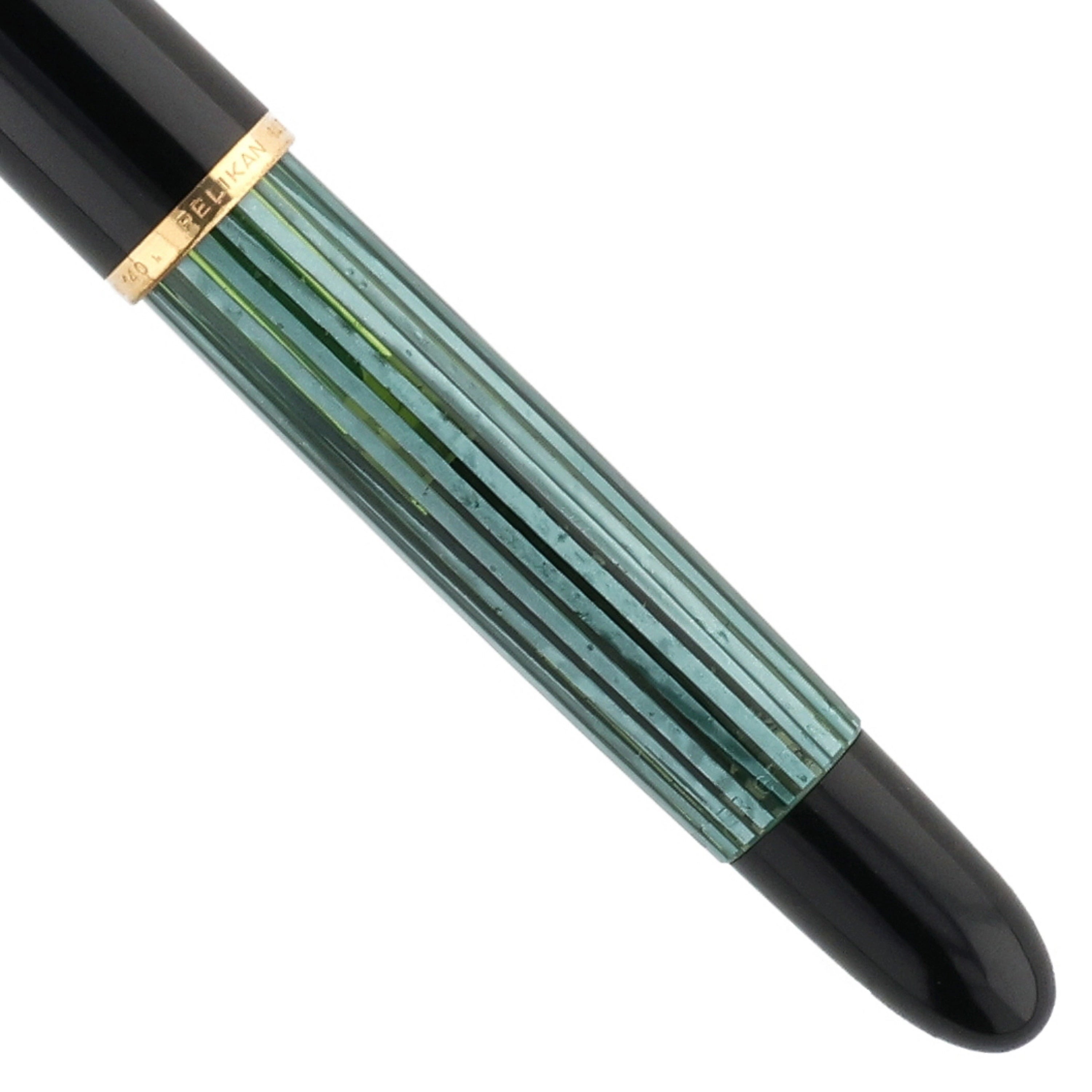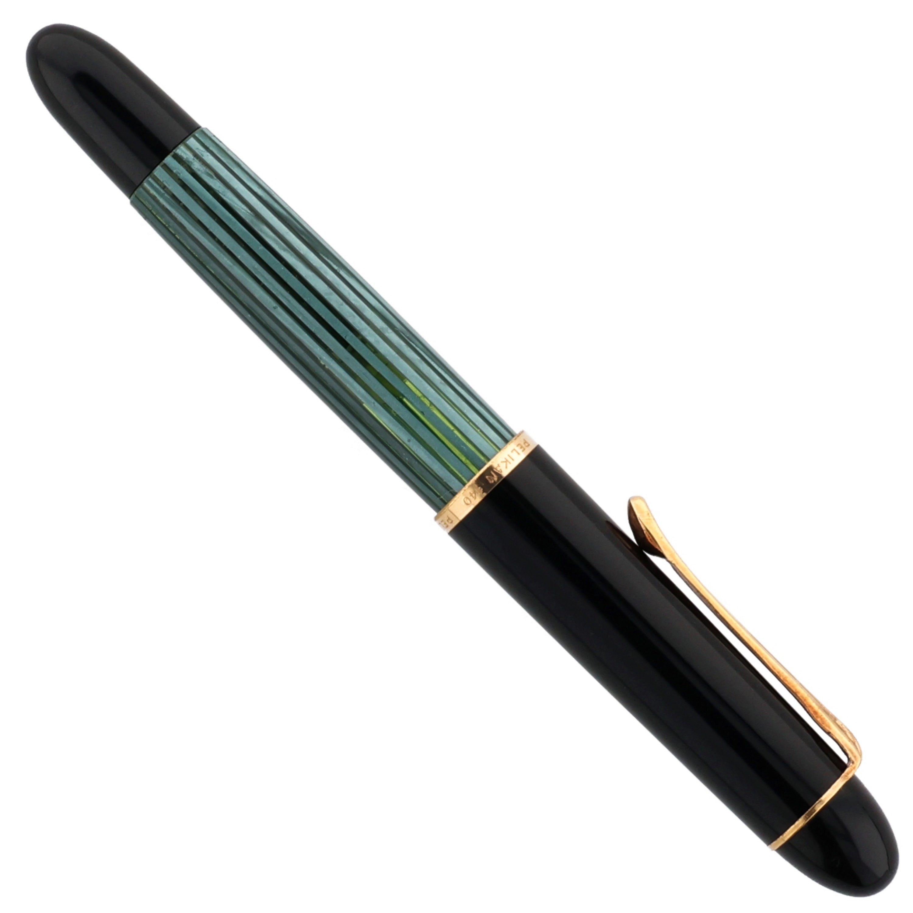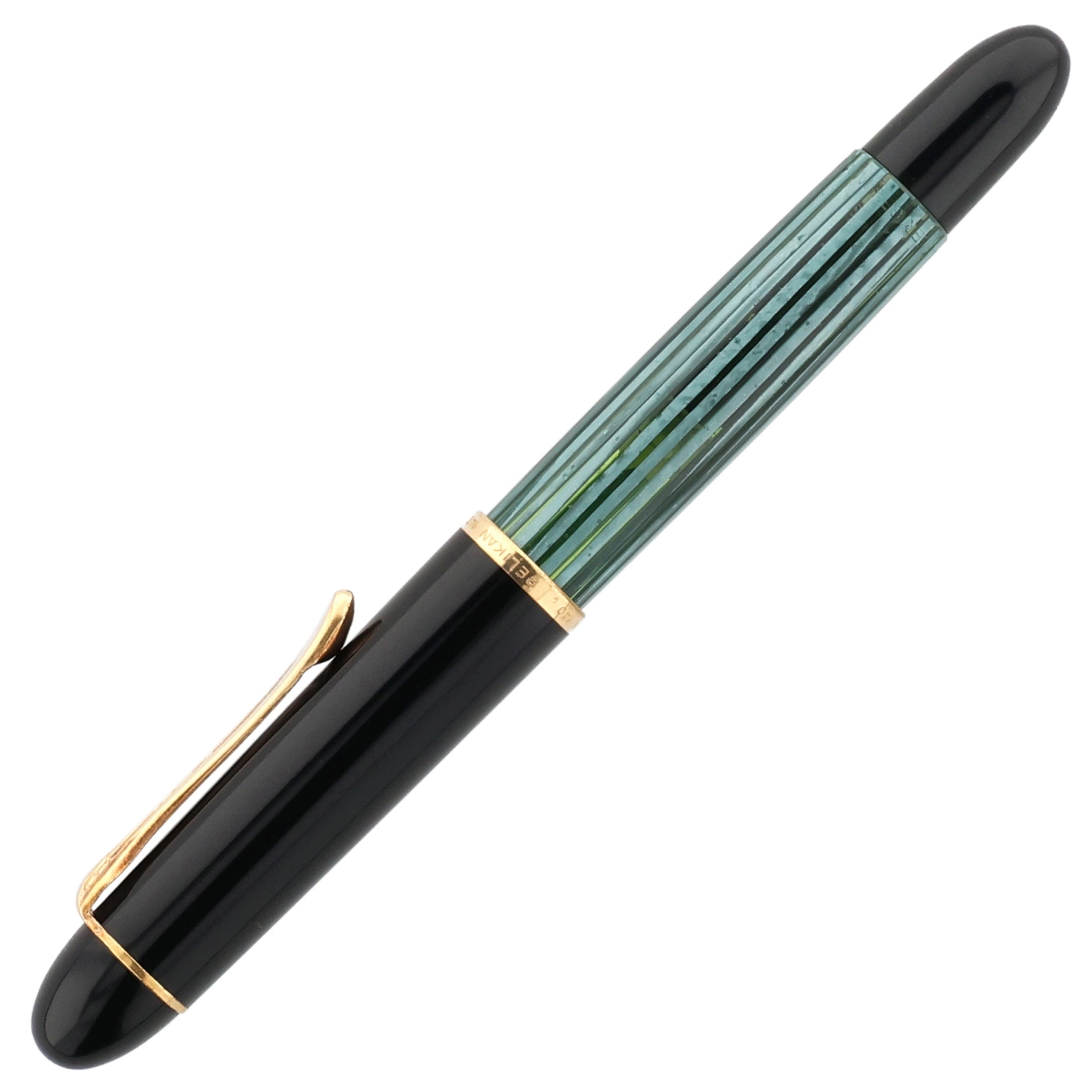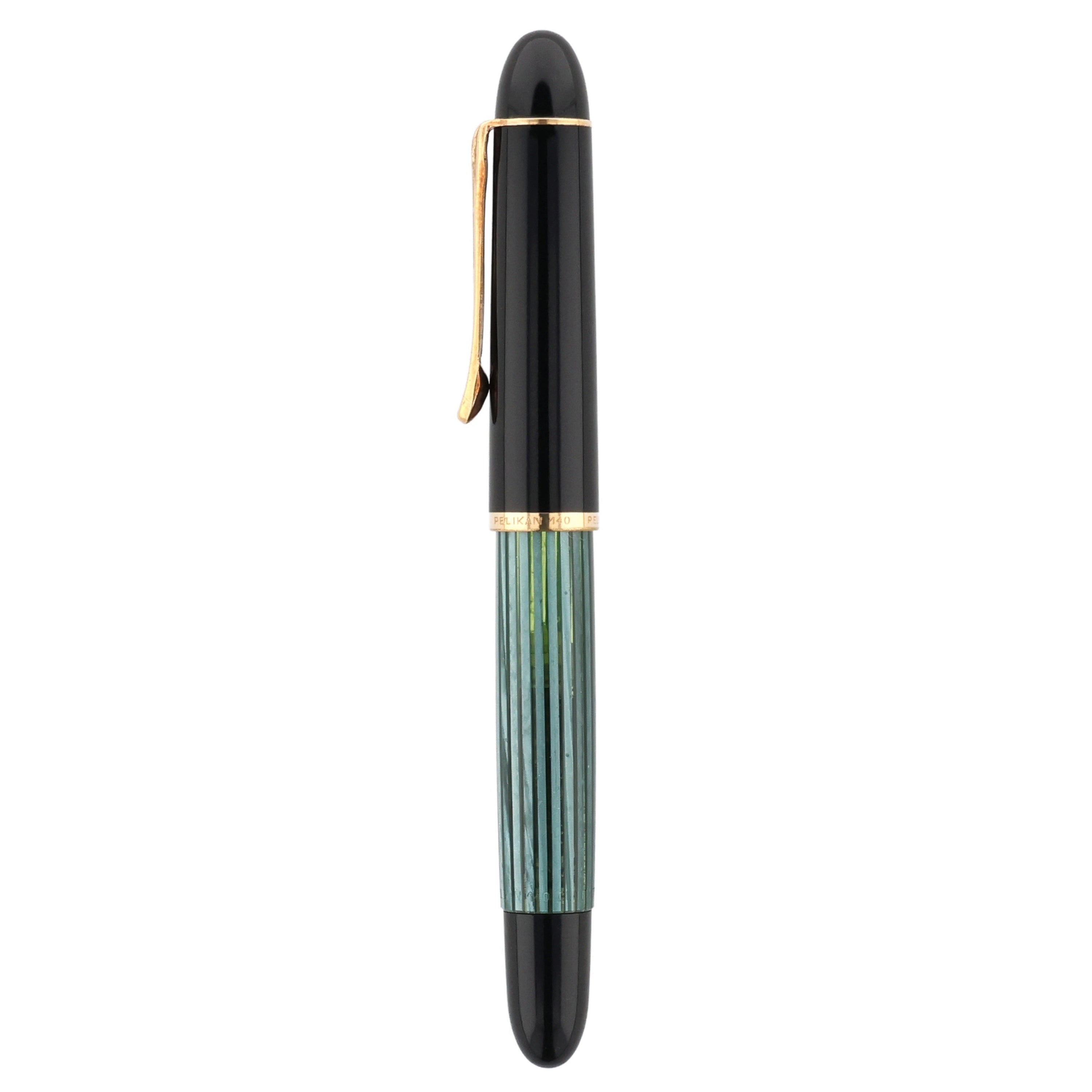 Der Pelikan 140 besticht durch sein klassisches, grün gestreiftes Gehäuse aus hochwertigem Edelharz, das sowohl robust als auch elegant wirkt. Die Federn waren wahlweise aus Stahl oder 14-Karat-Gold gefertigt, meist mit dem Pelikan-Logo graviert, und in verschiedenen Härtegraden erhältlich. Das zeitlose Design vereint stilvolle Ästhetik mit langlebiger Qualität und macht den Füllfederhalter zu einem echten Klassiker.
