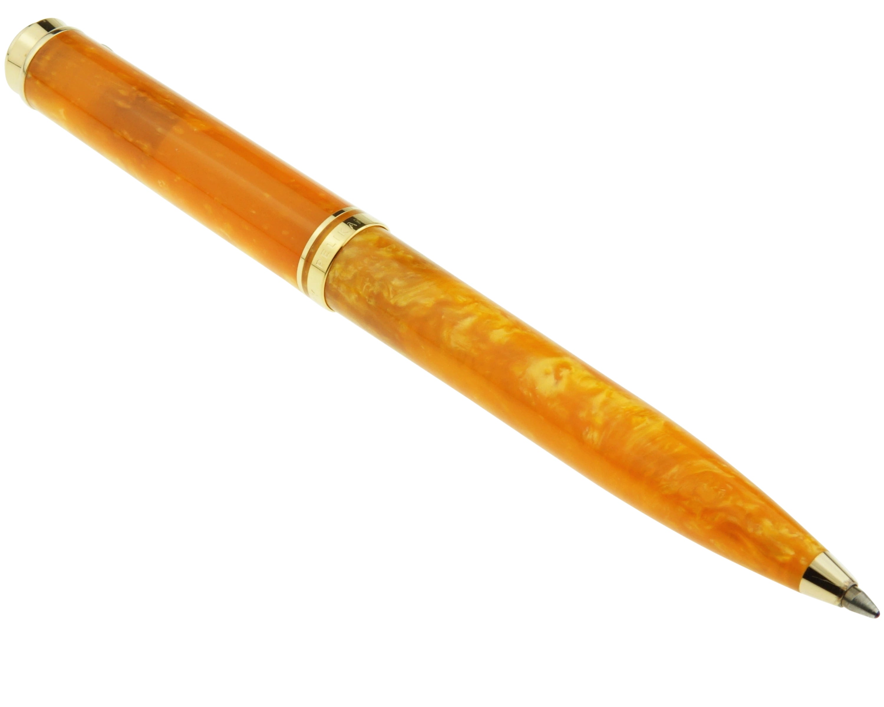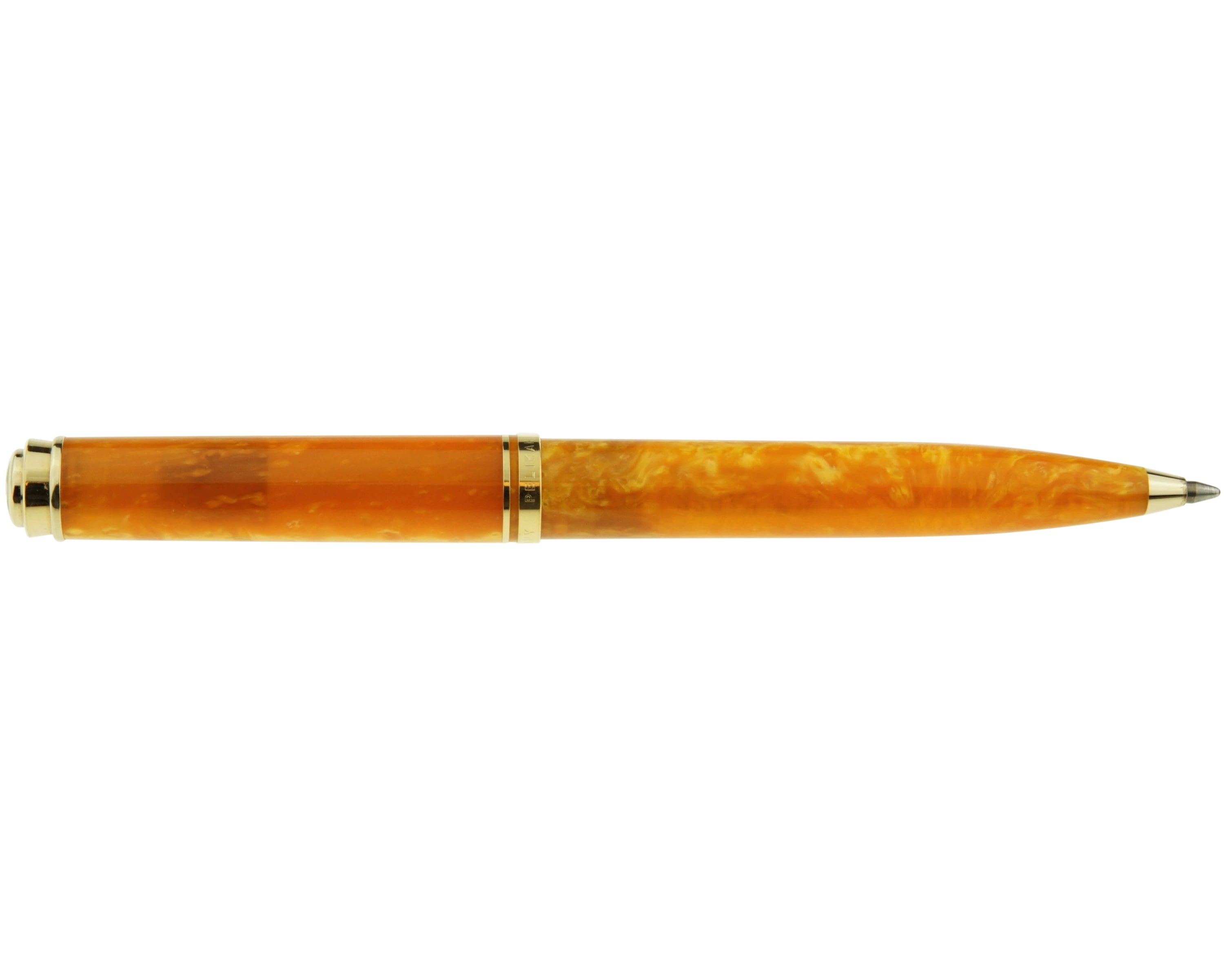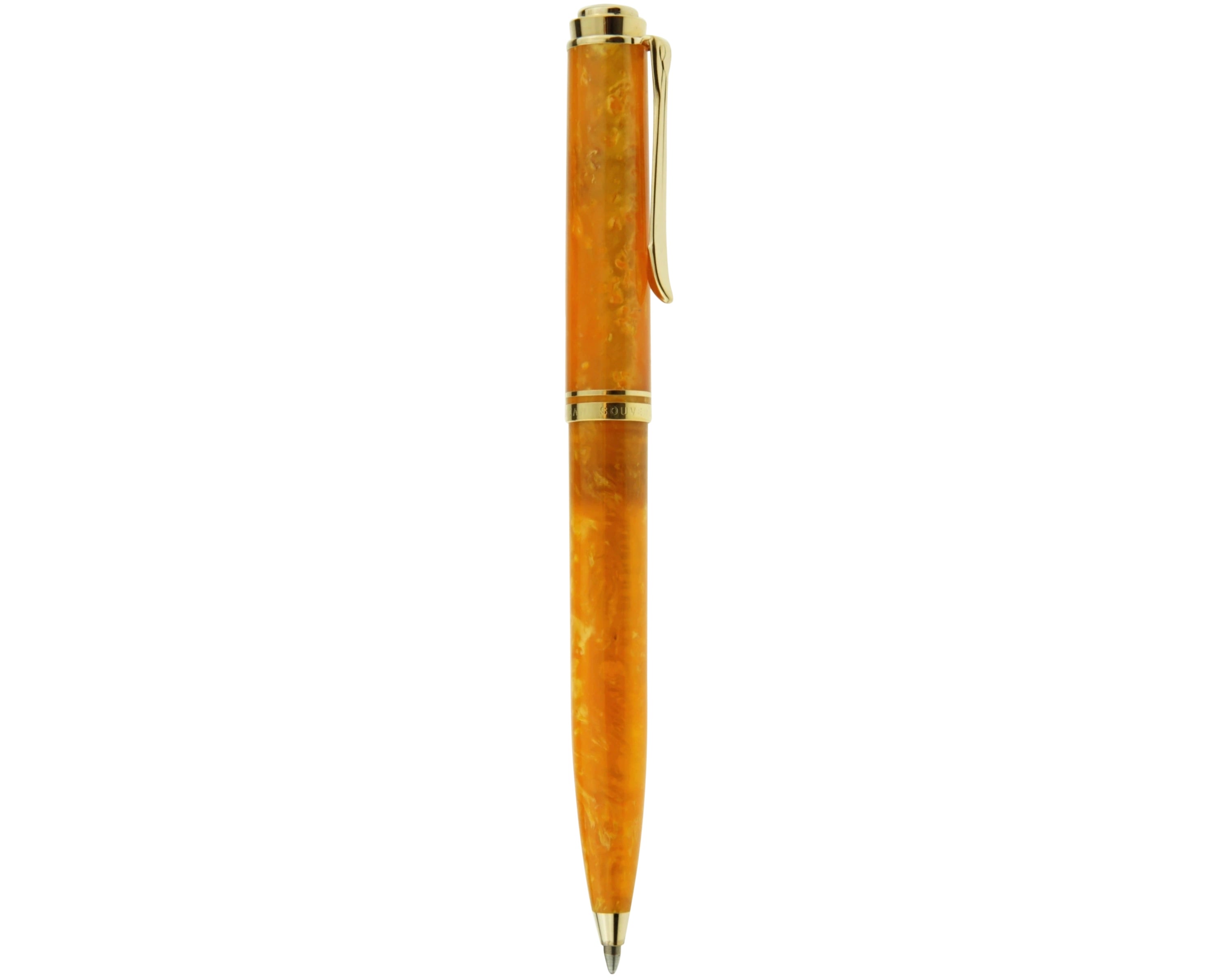 Die Serie K600 in leuchtendem Orange weist die typischen Pelikan-Merkmale auf: Der Korpus besteht aus hochwertigem Harz, das gedreht und anschließend hochglanzpoliert wird. Die unterschiedlichen Muster machen jedes Stück einzigartig. Clip und Ringe sind mit 24 Karat Gold beschichtet.